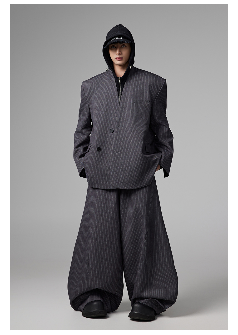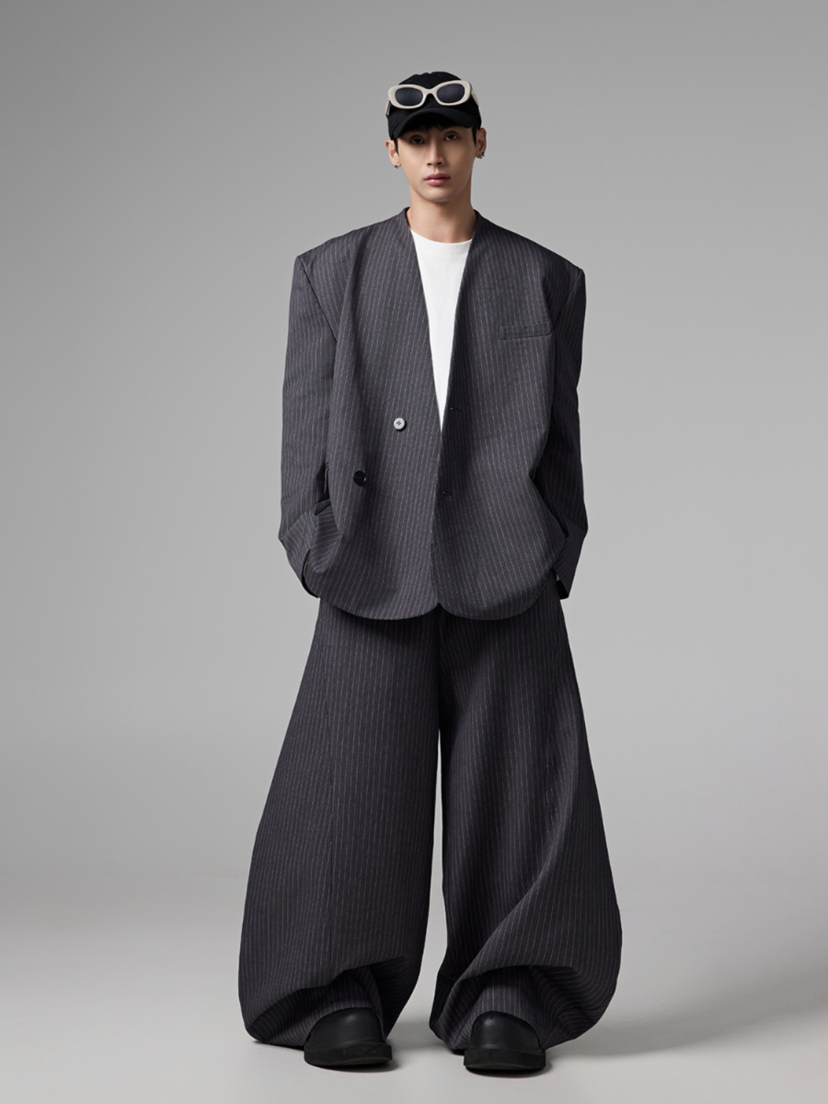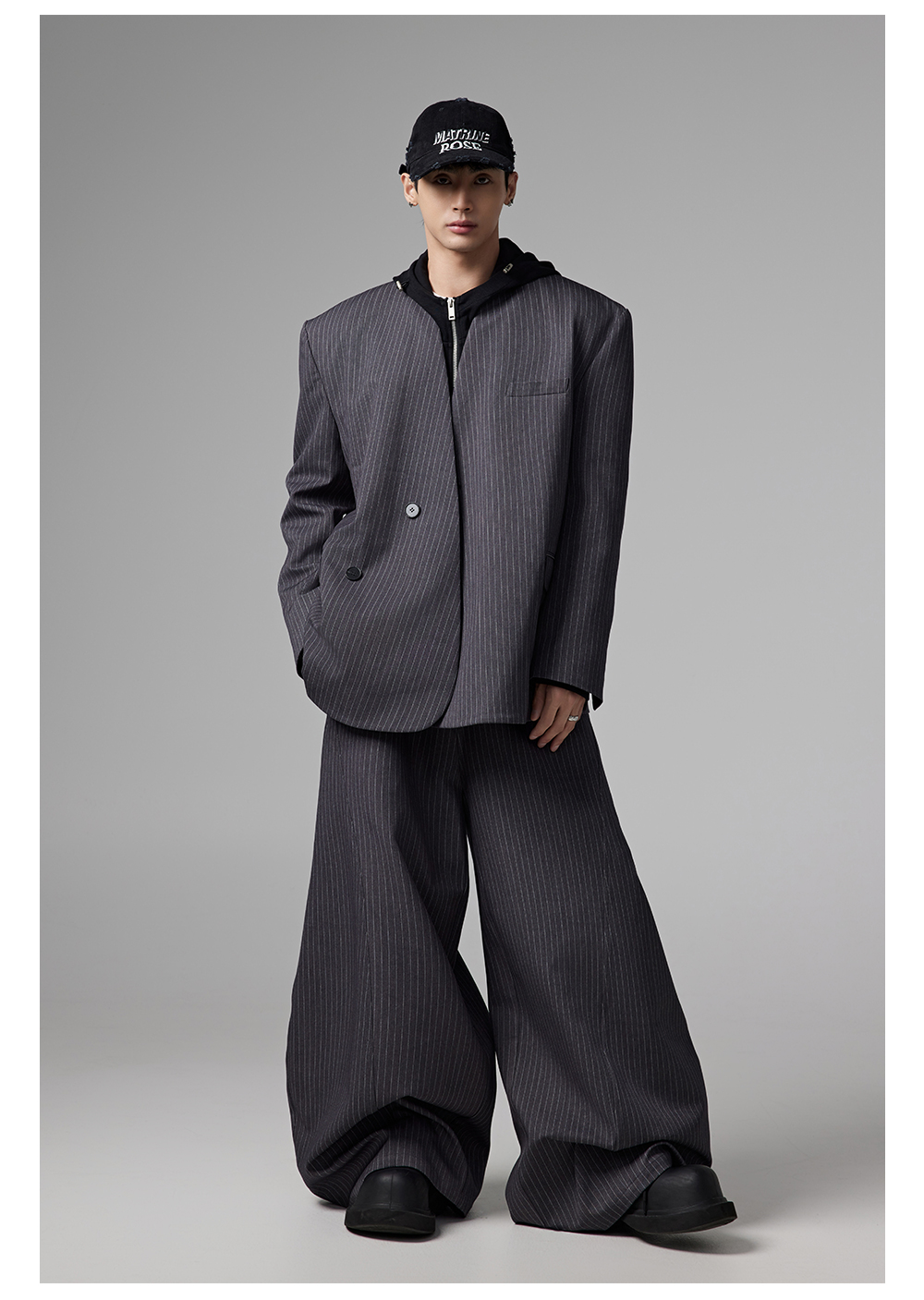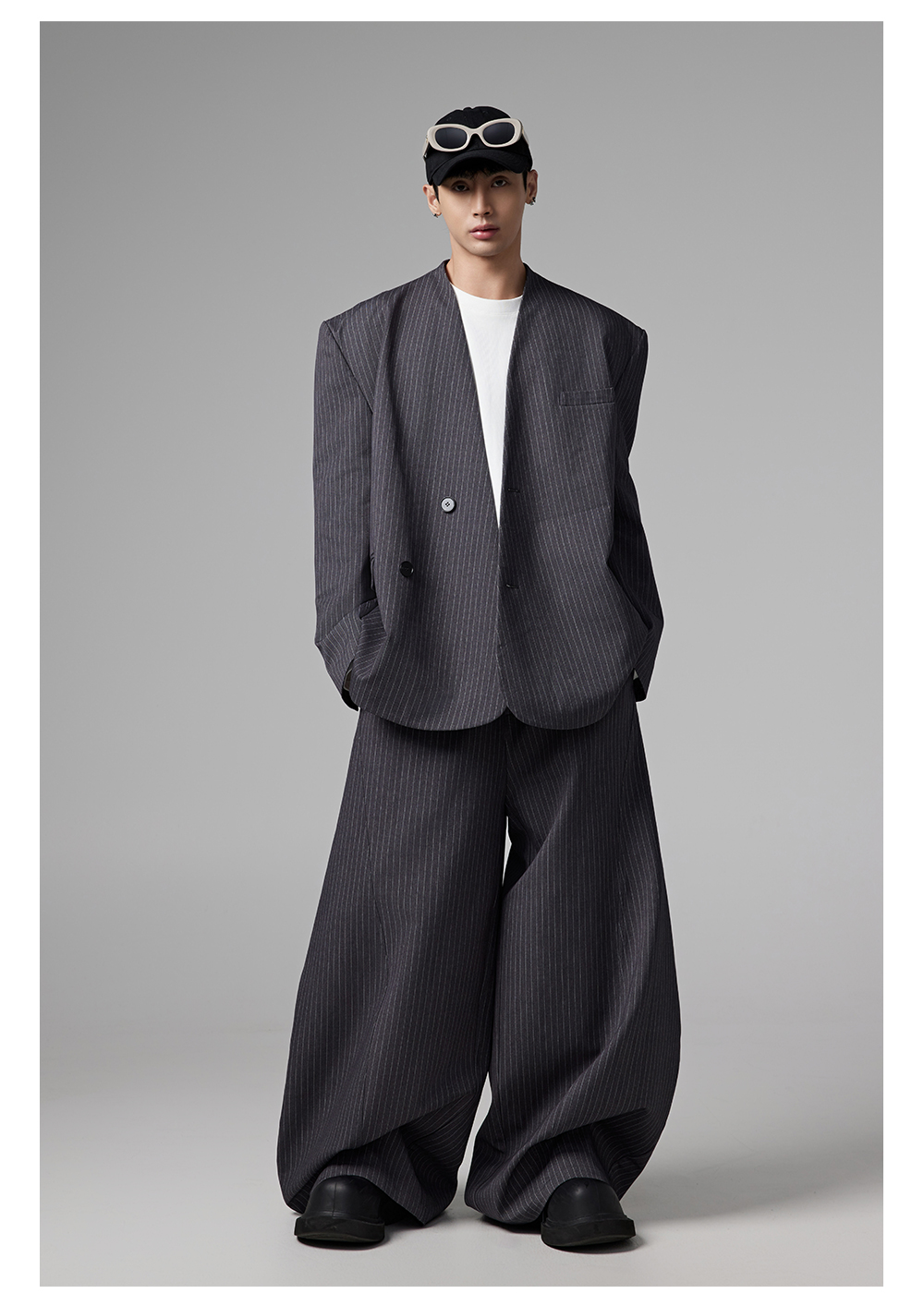 Collarless Stripe Oversize Tailored Jacket & Trousers Setup WN13299