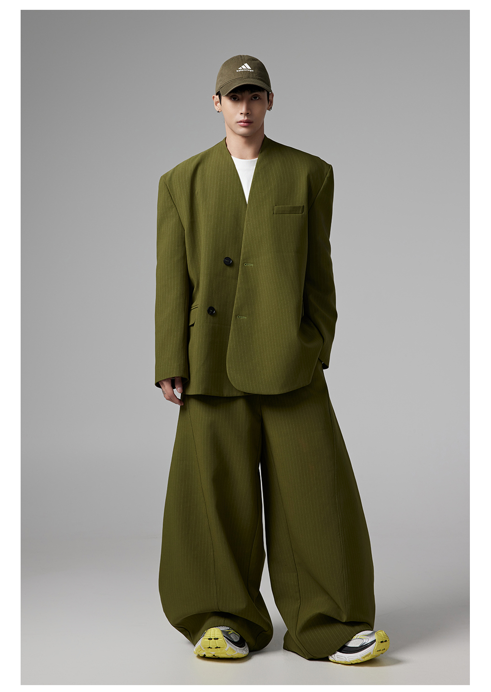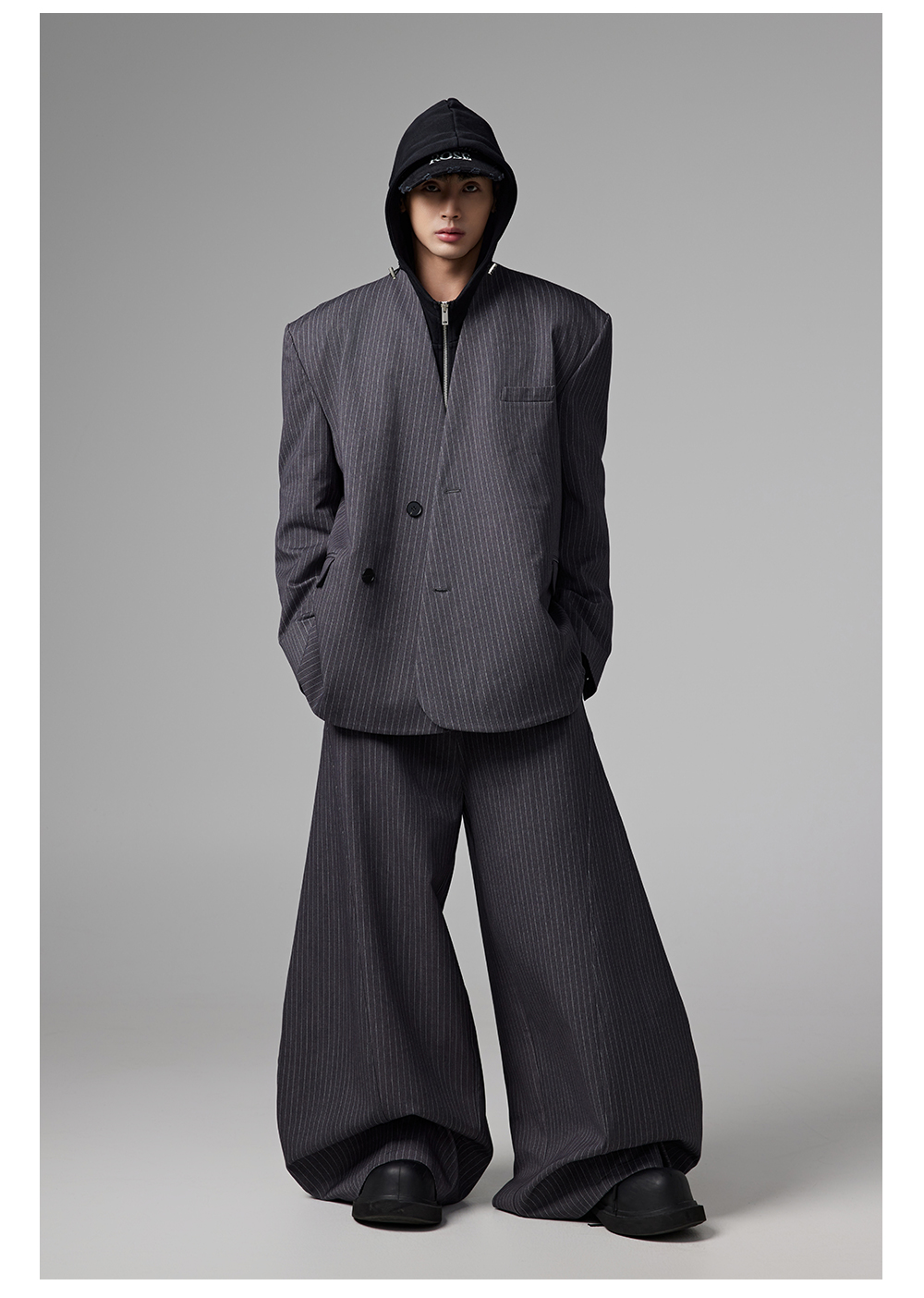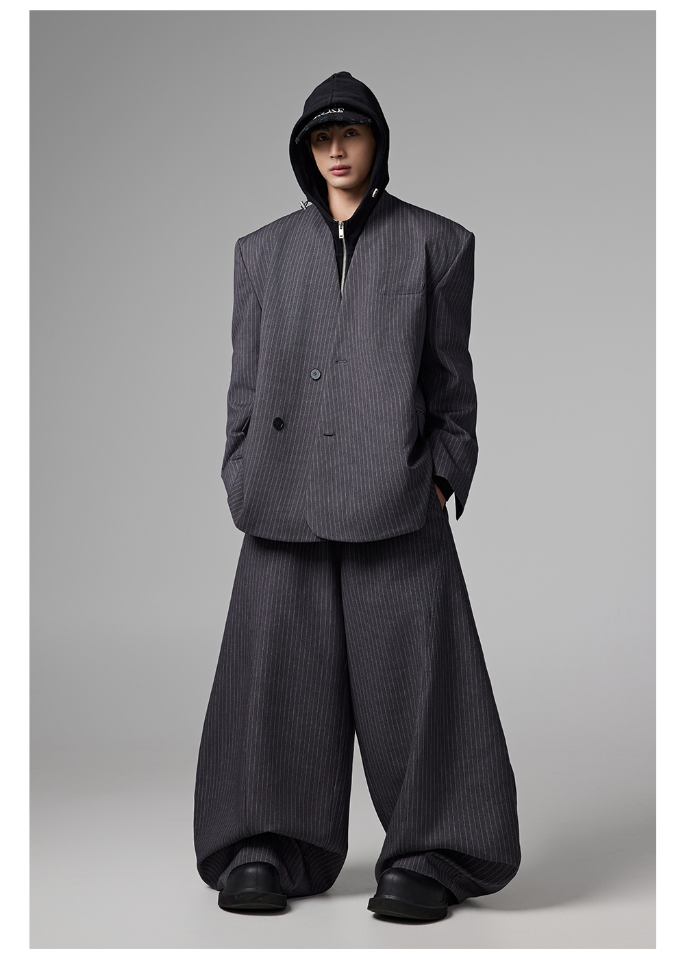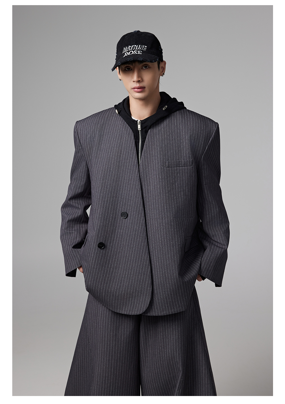 Collarless Stripe Oversize Tailored Jacket & Trousers Setup WN13299