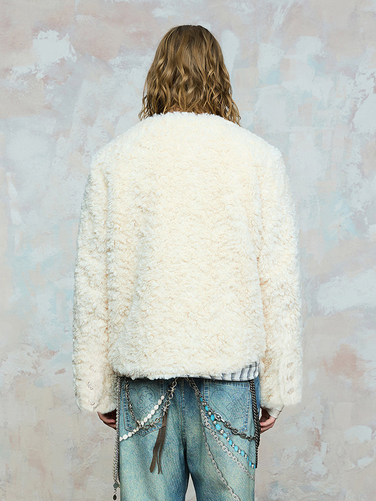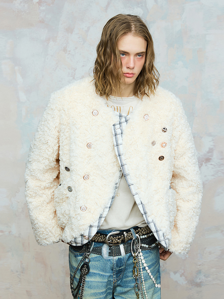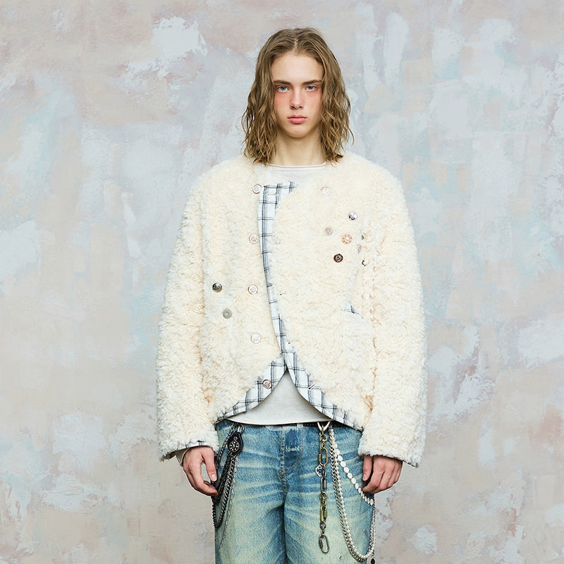 Tweed Plaid Lining Patchwork Fleece Decorated Button Jacket WN17839
