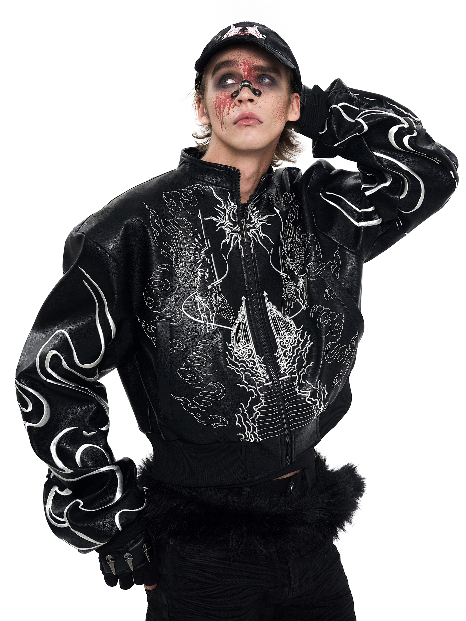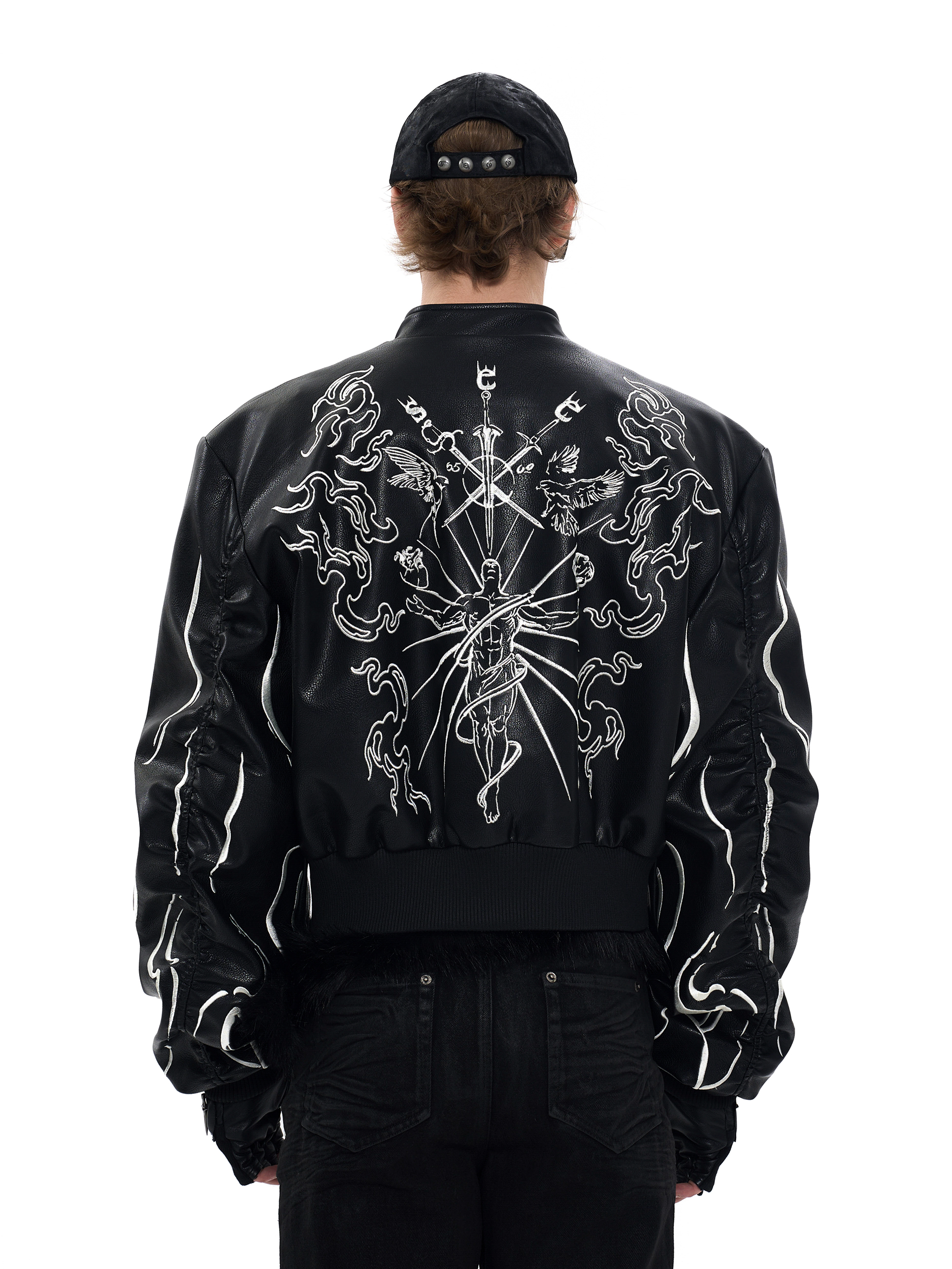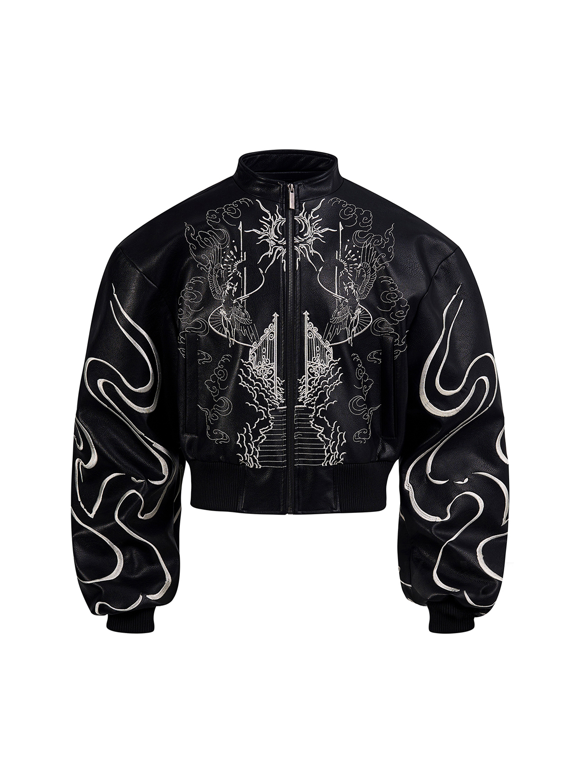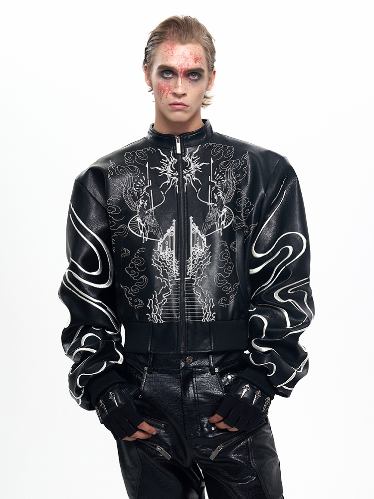 Back Embroidery Stand Neck PU Leather Jacket WN20375
