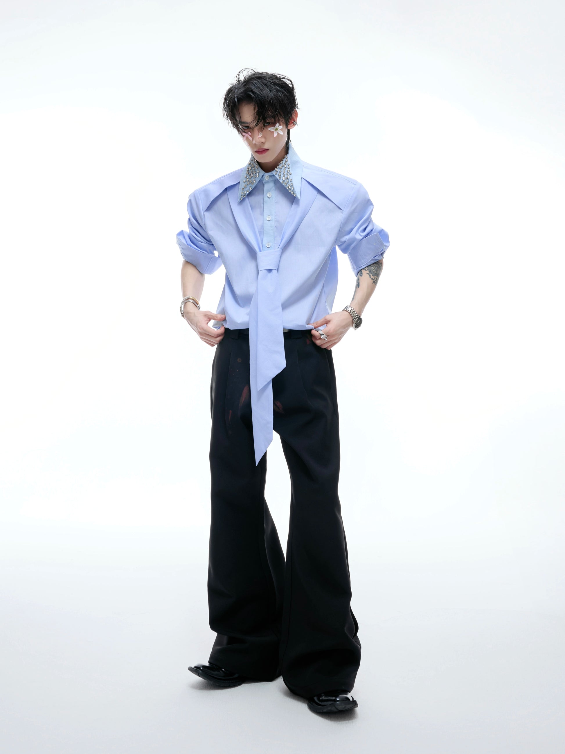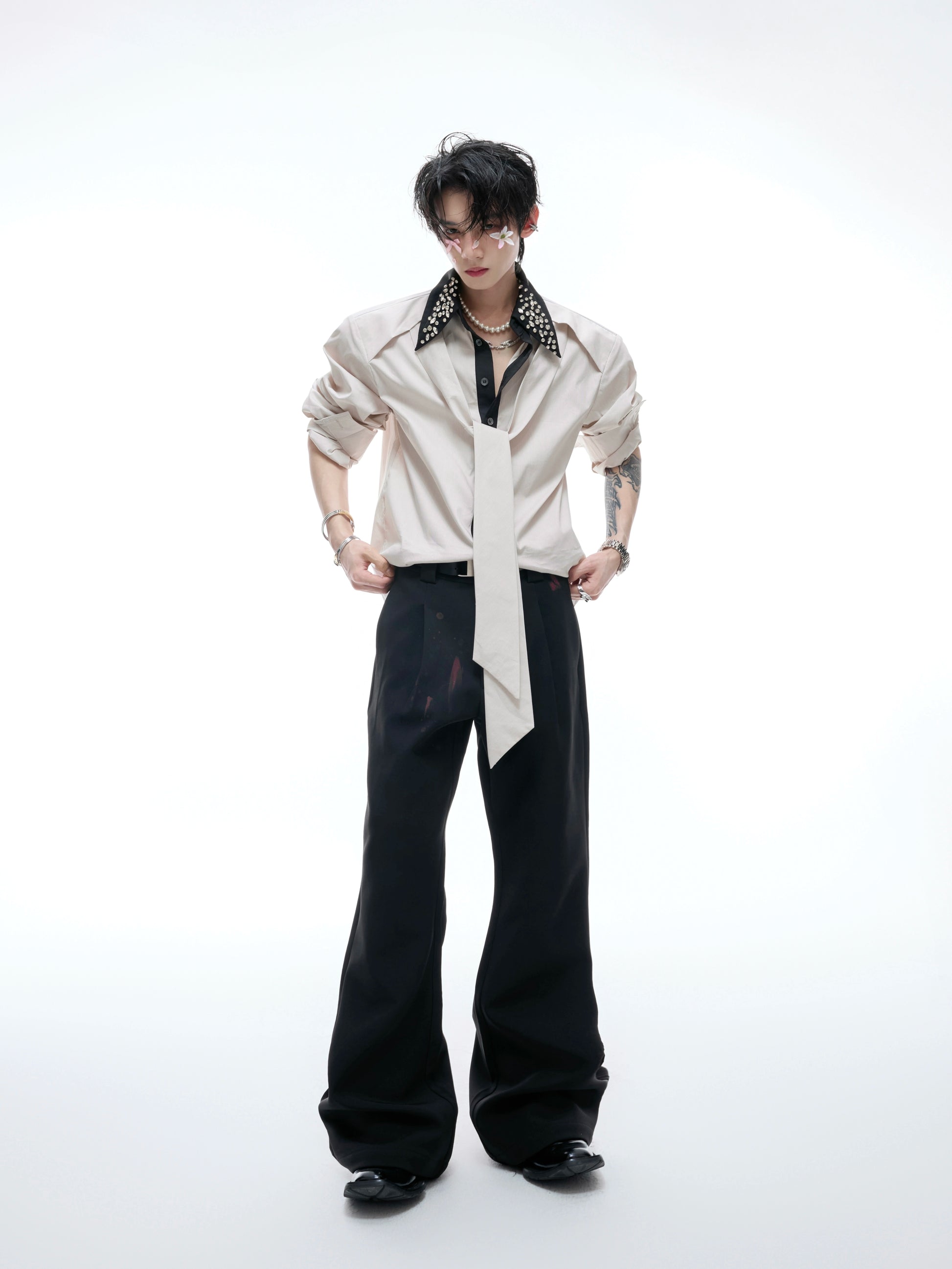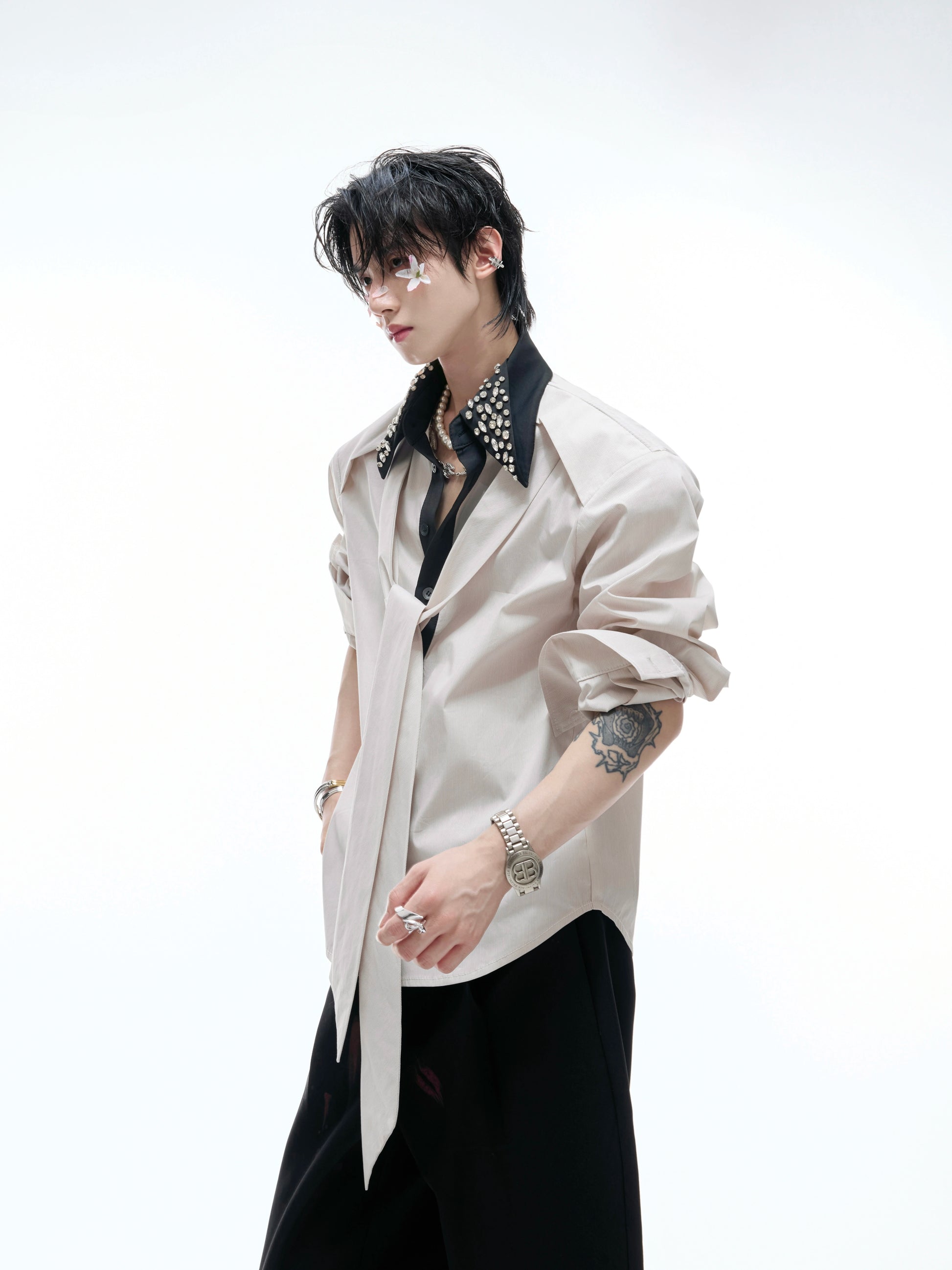 Rhinestone Neckline Ribbon Colorblock Long Sleeve Shirt WN20532
