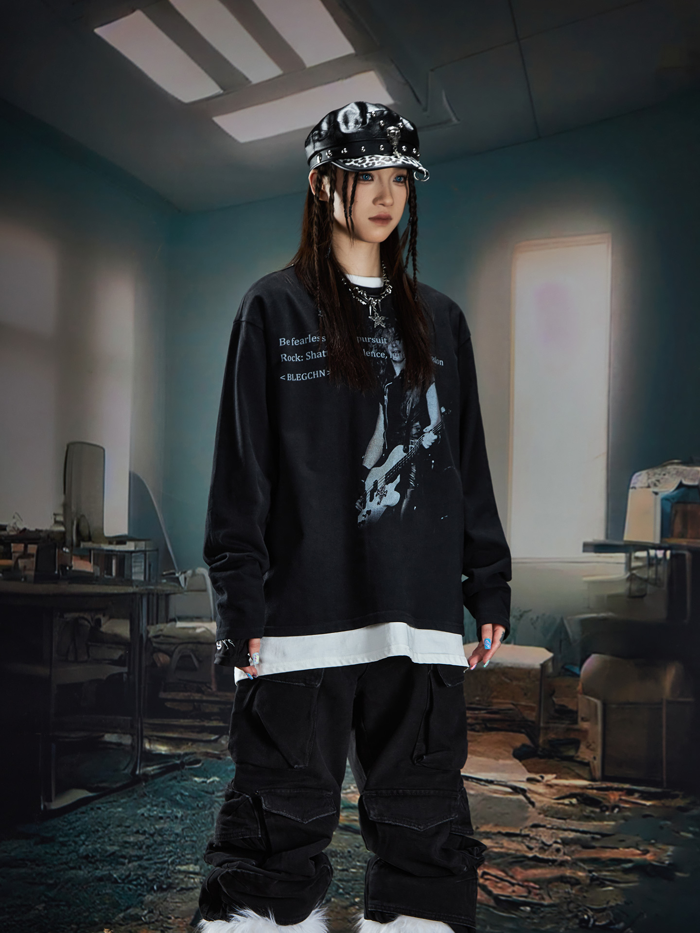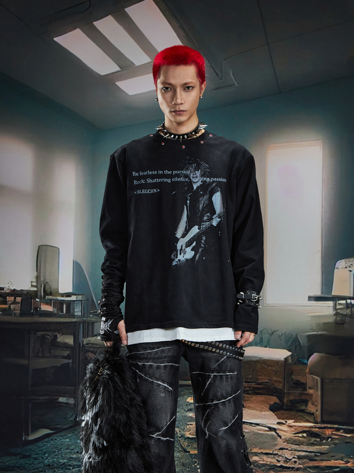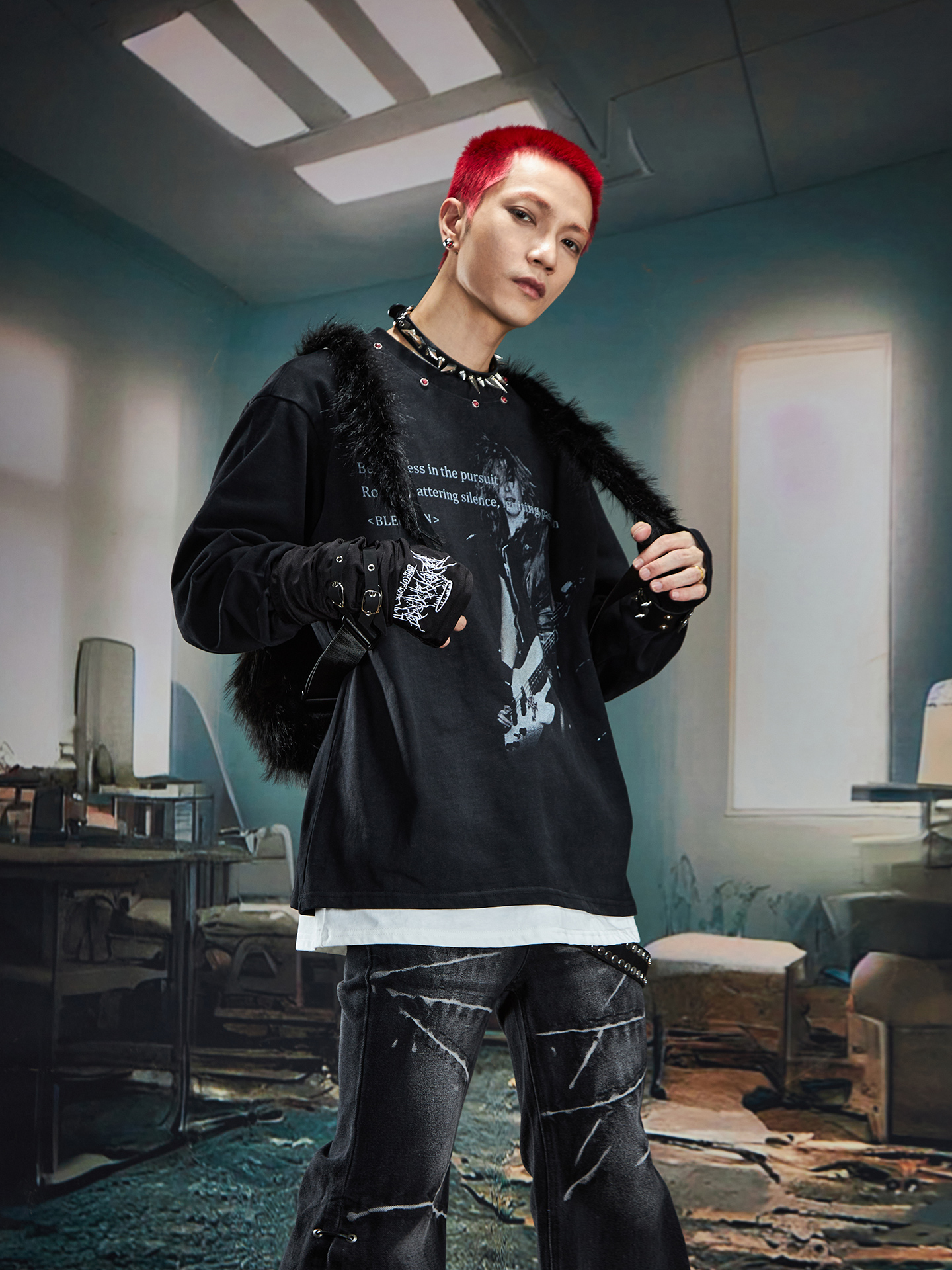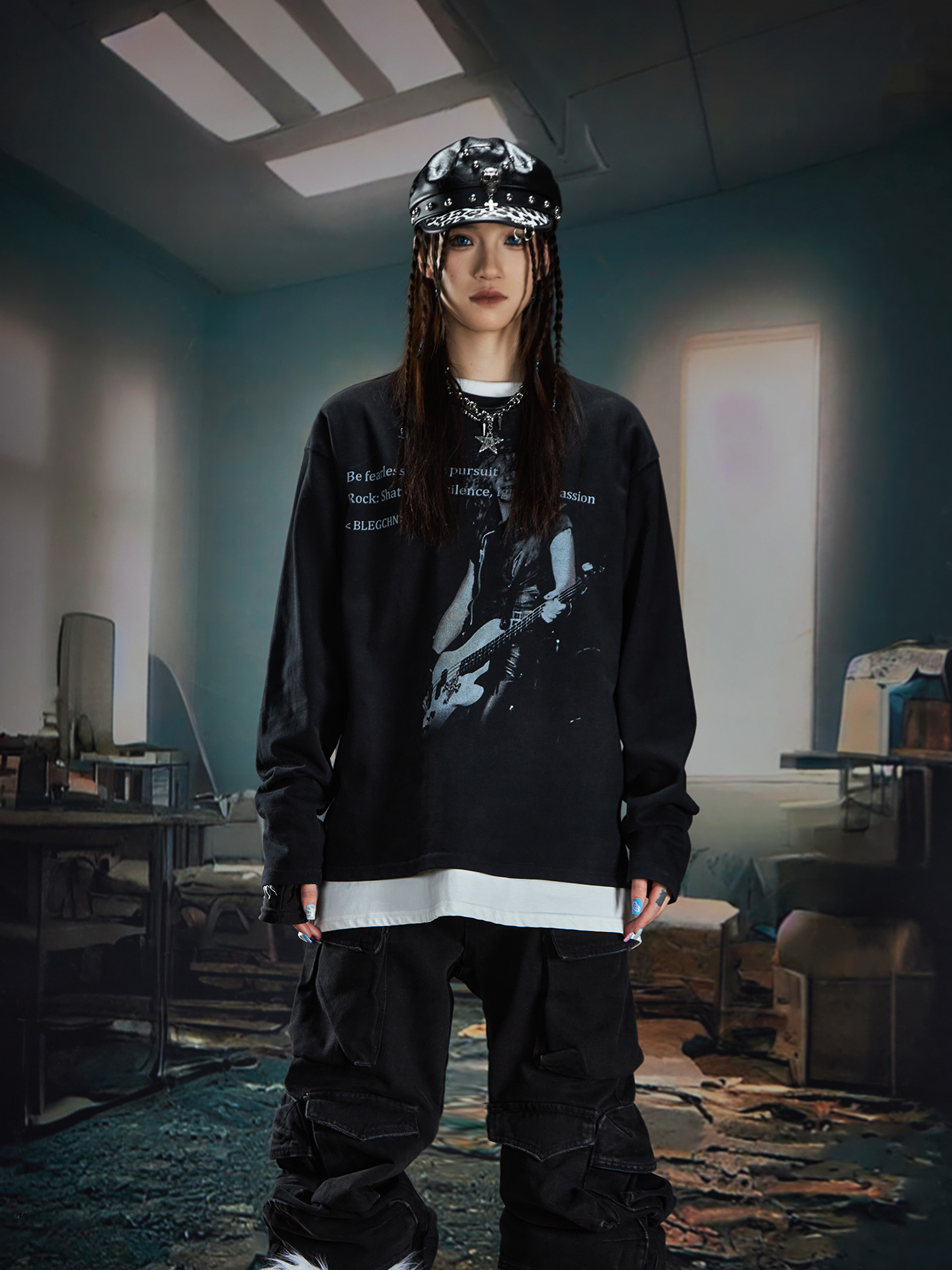 Washed Digital Portrait Slogan Print Stud Long Sleeve T-Shirt WN20559