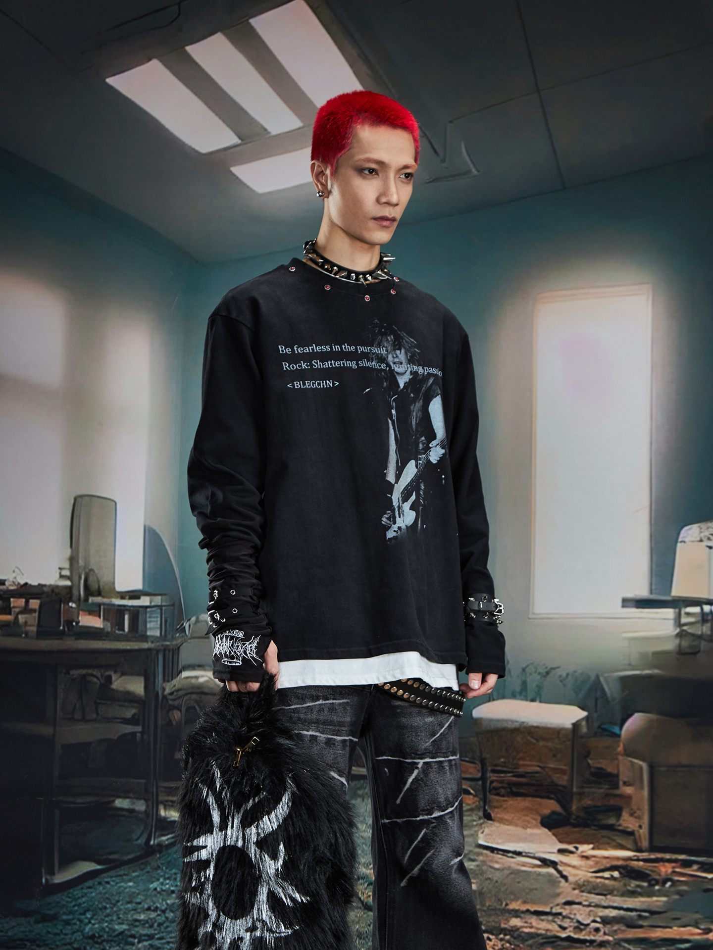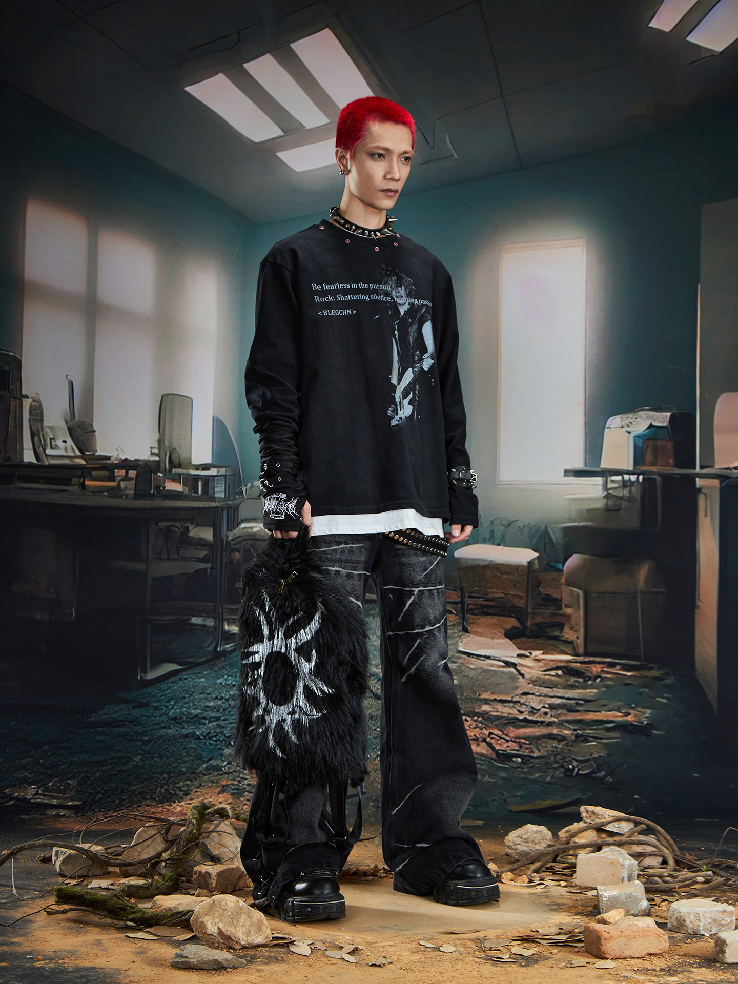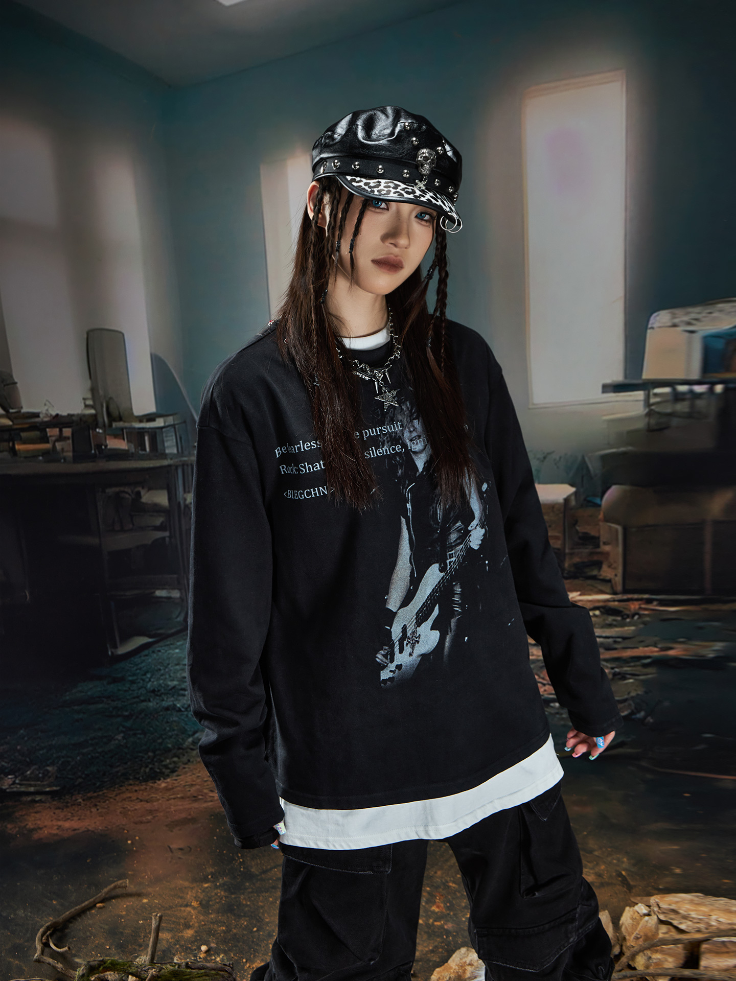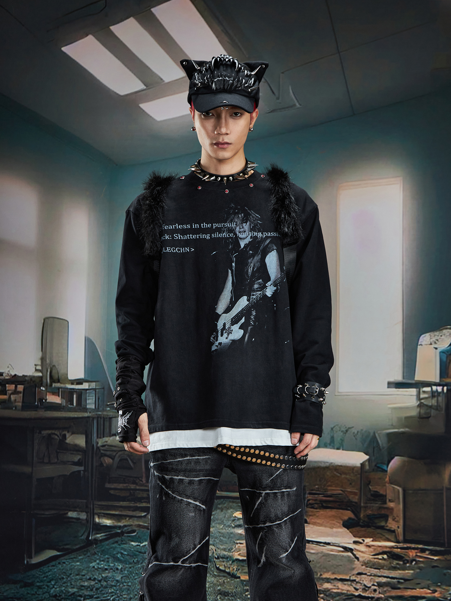 Washed Digital Portrait Slogan Print Stud Long Sleeve T-Shirt WN20559