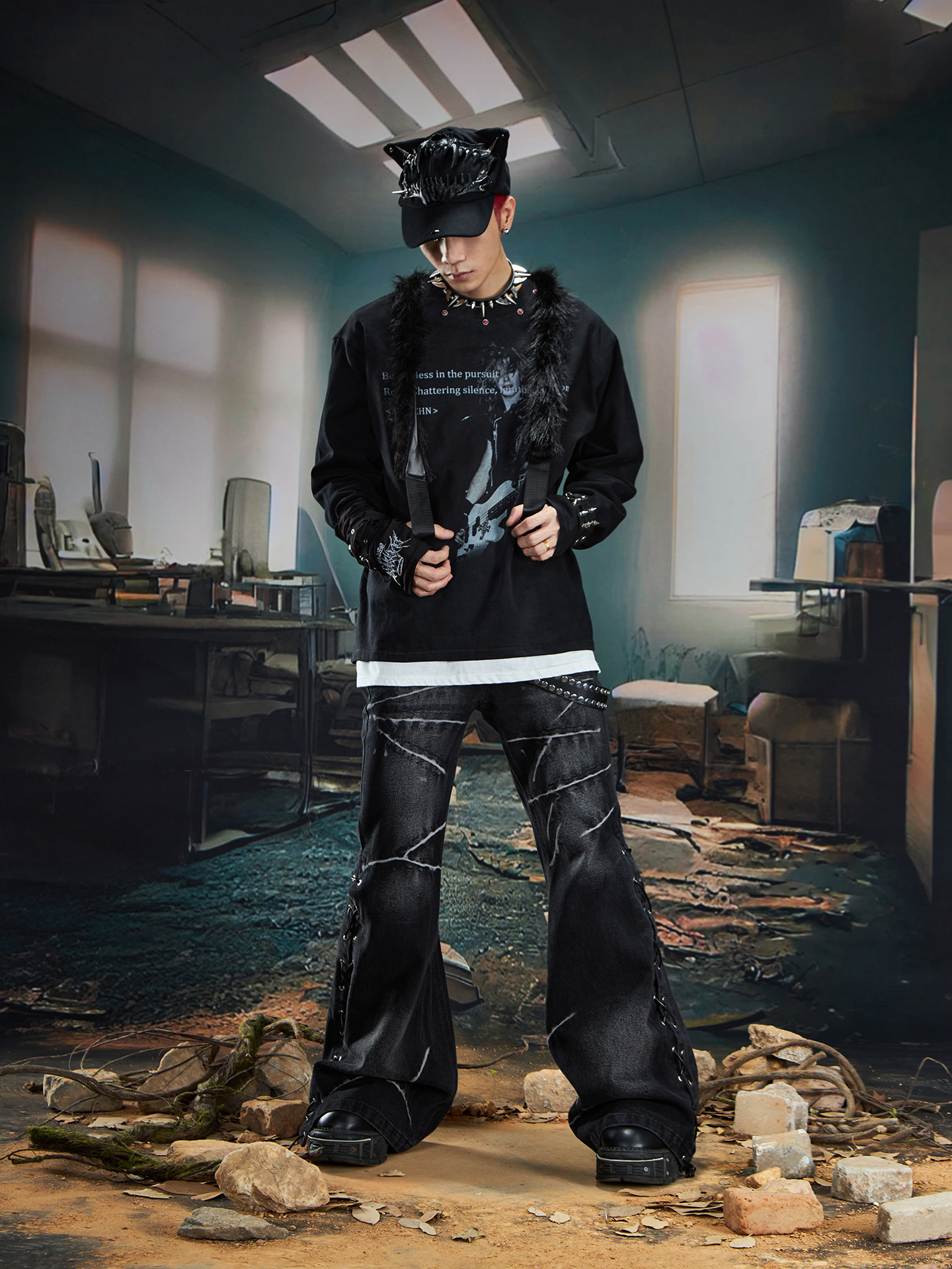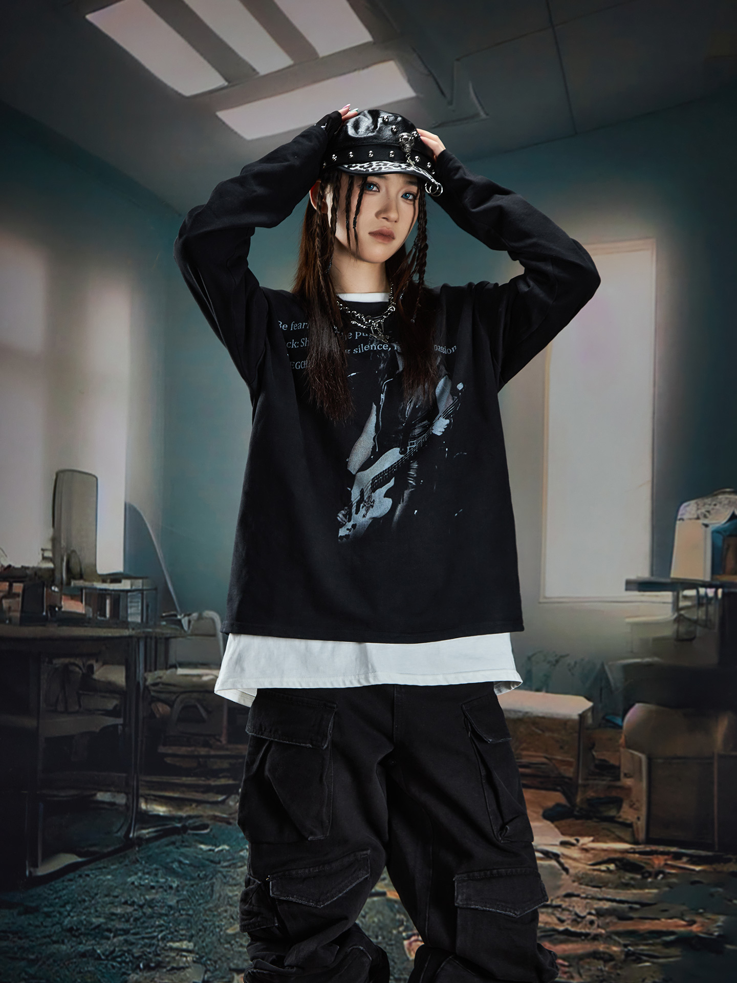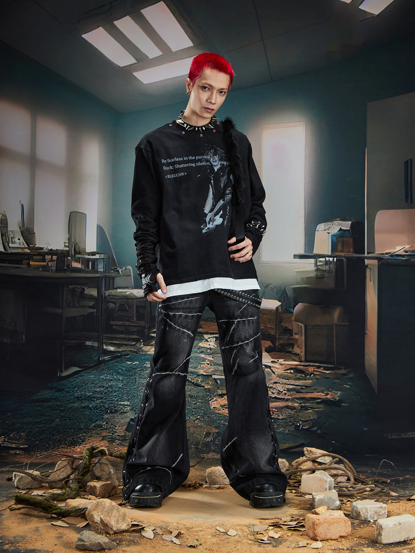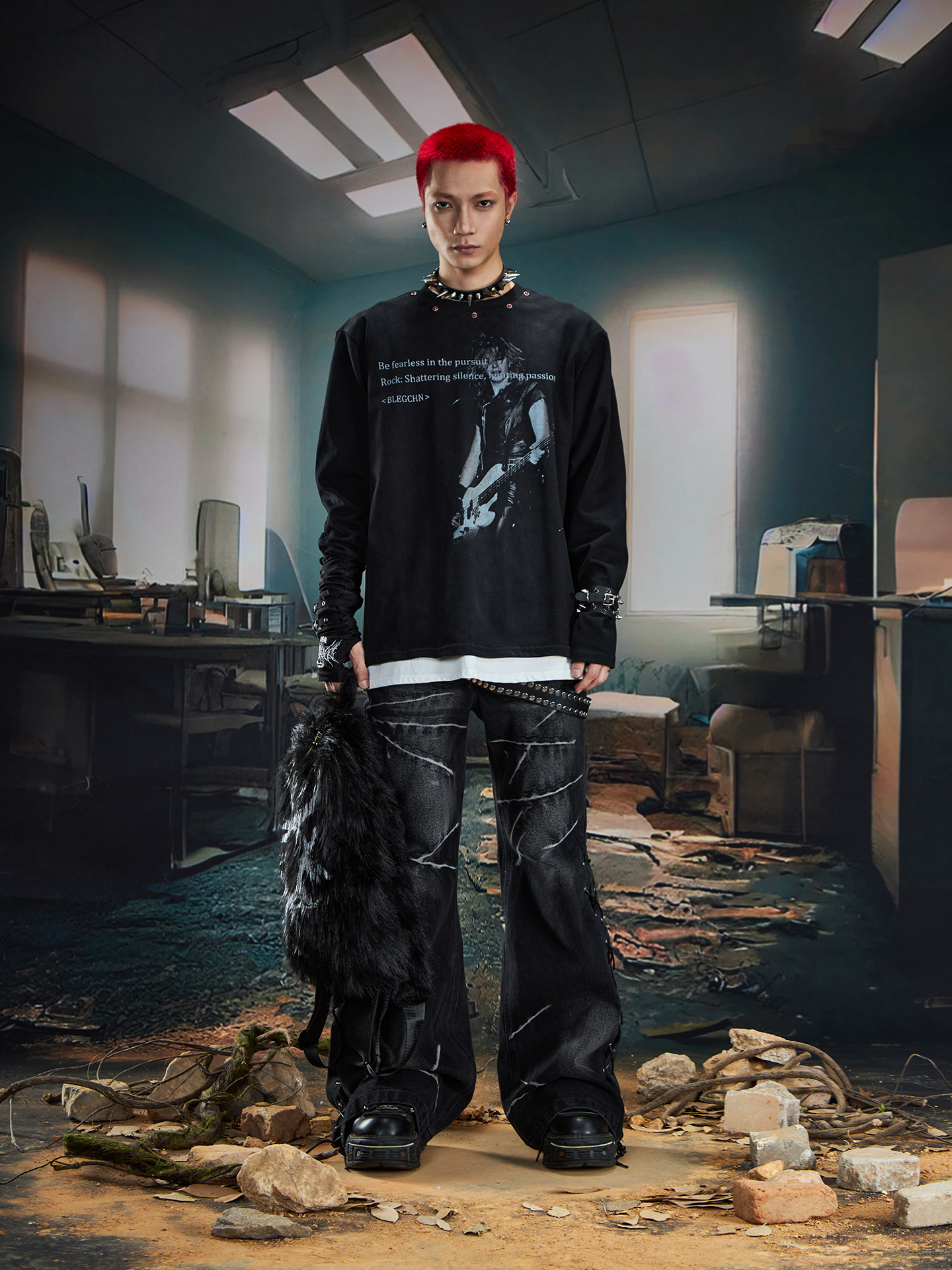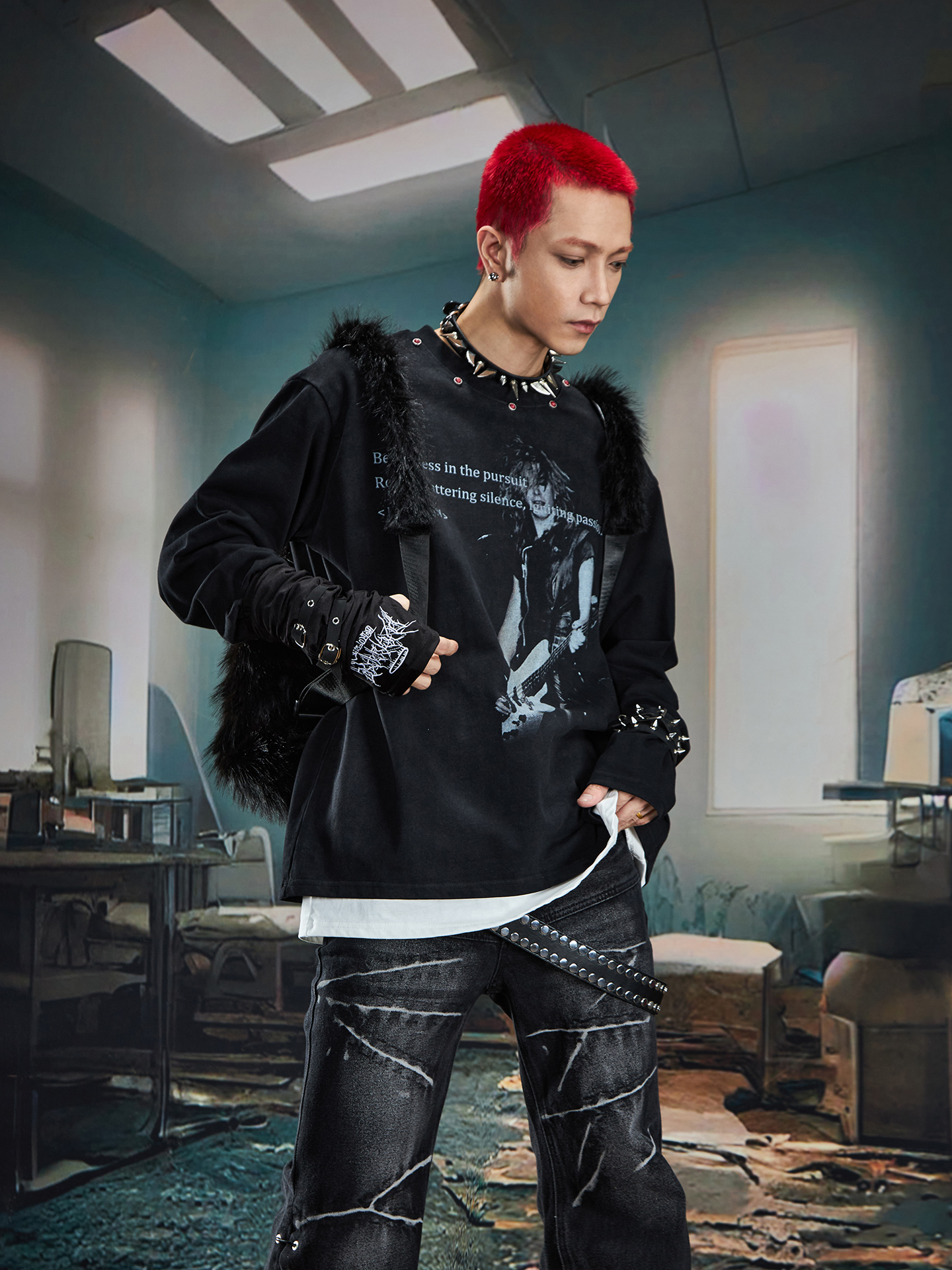 Washed Digital Portrait Slogan Print Stud Long Sleeve T-Shirt WN20559
