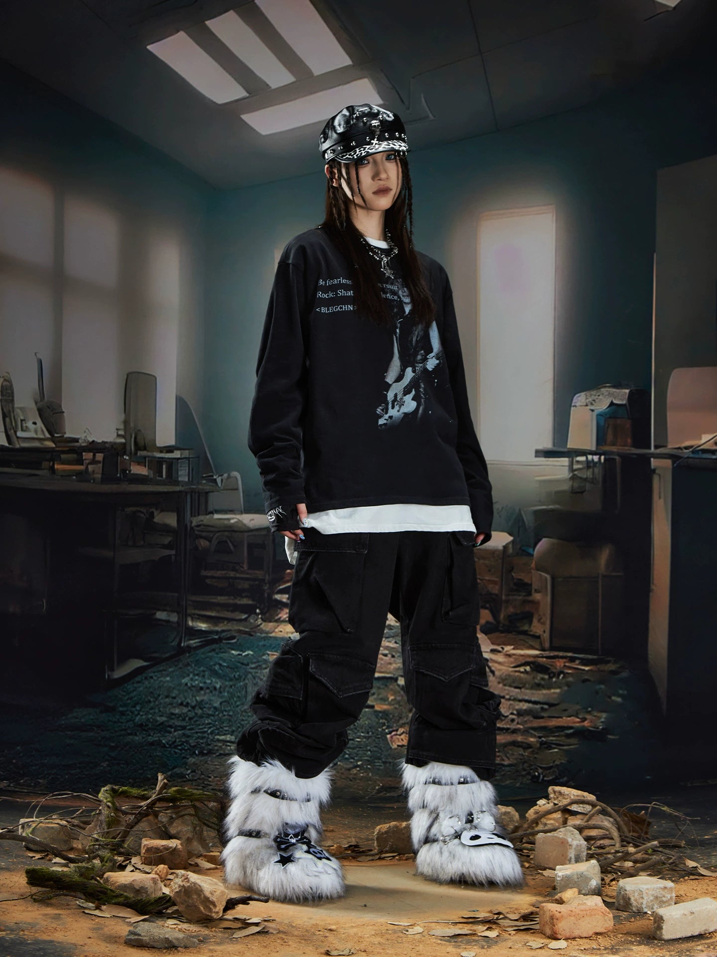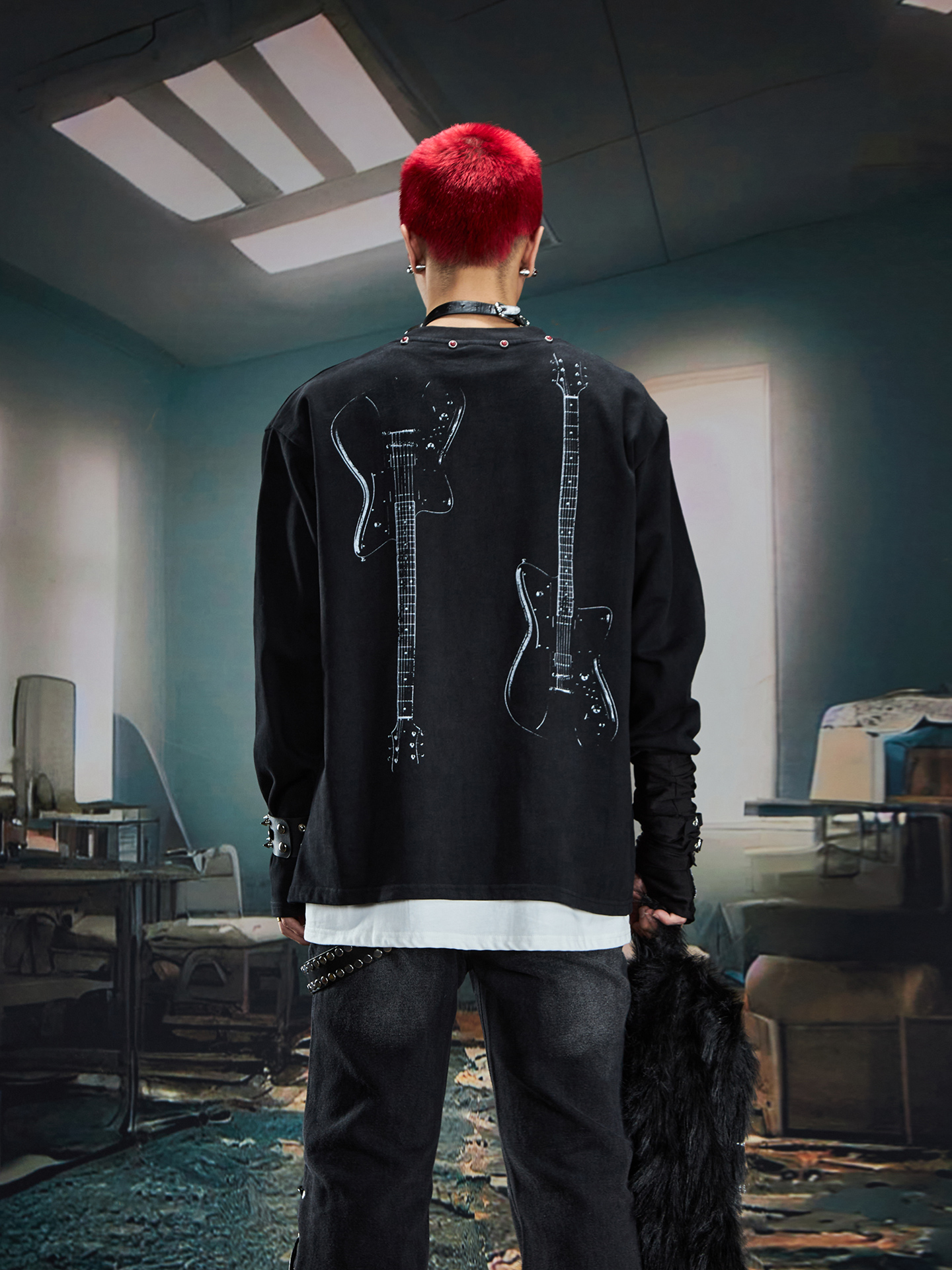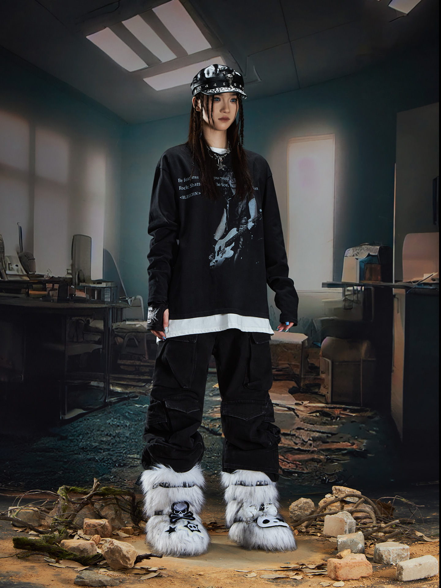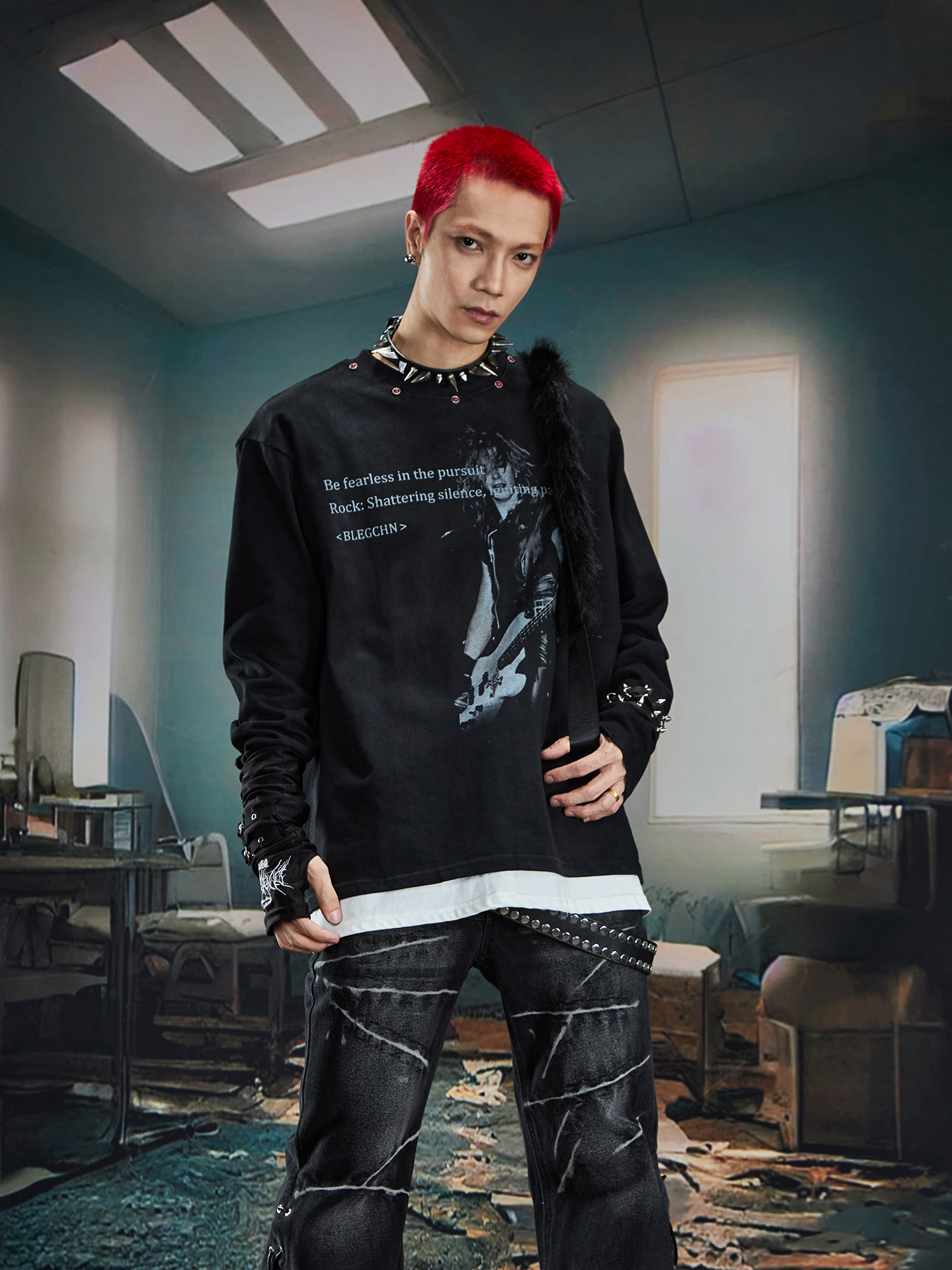 Washed Digital Portrait Slogan Print Stud Long Sleeve T-Shirt WN20559