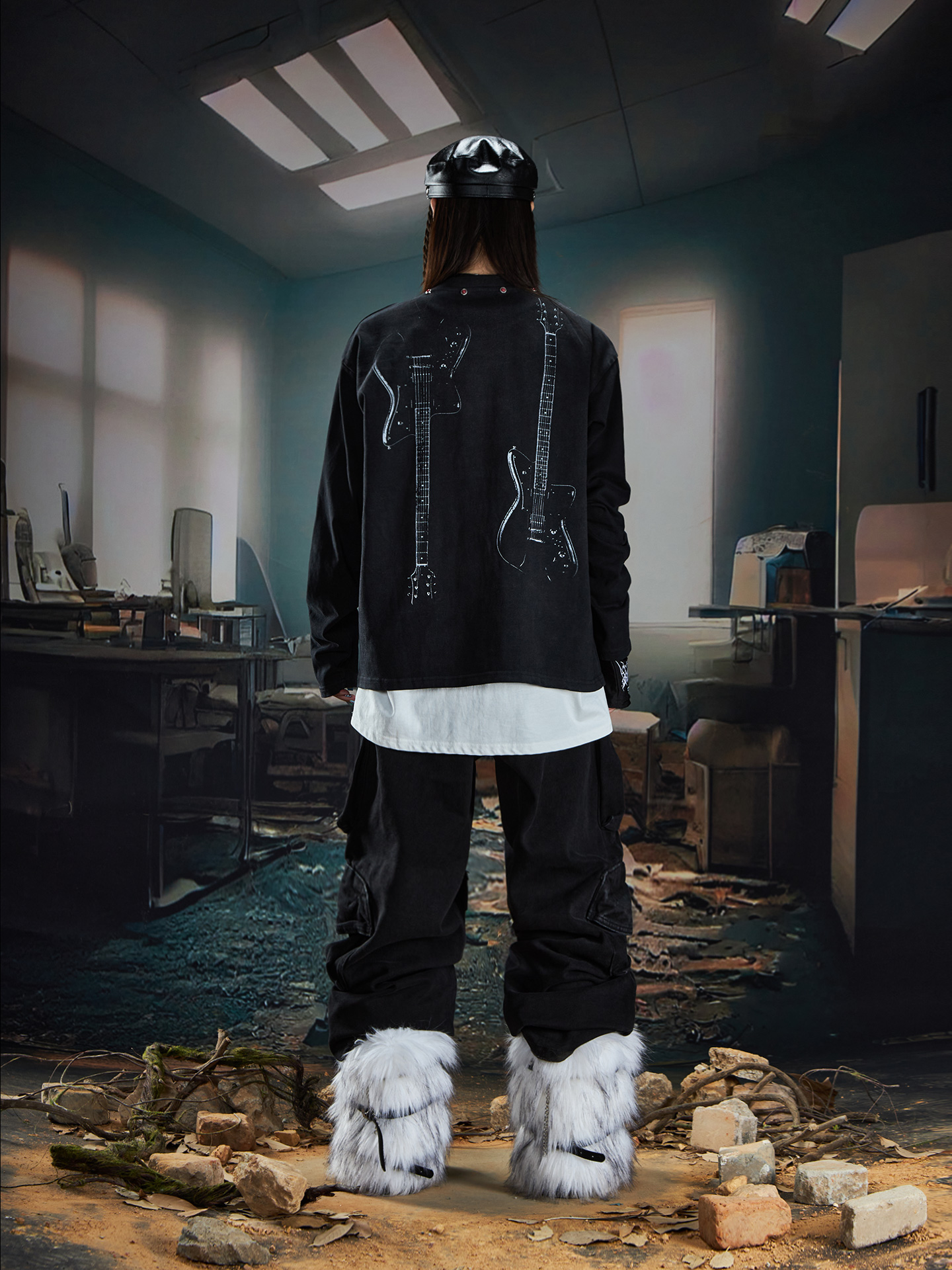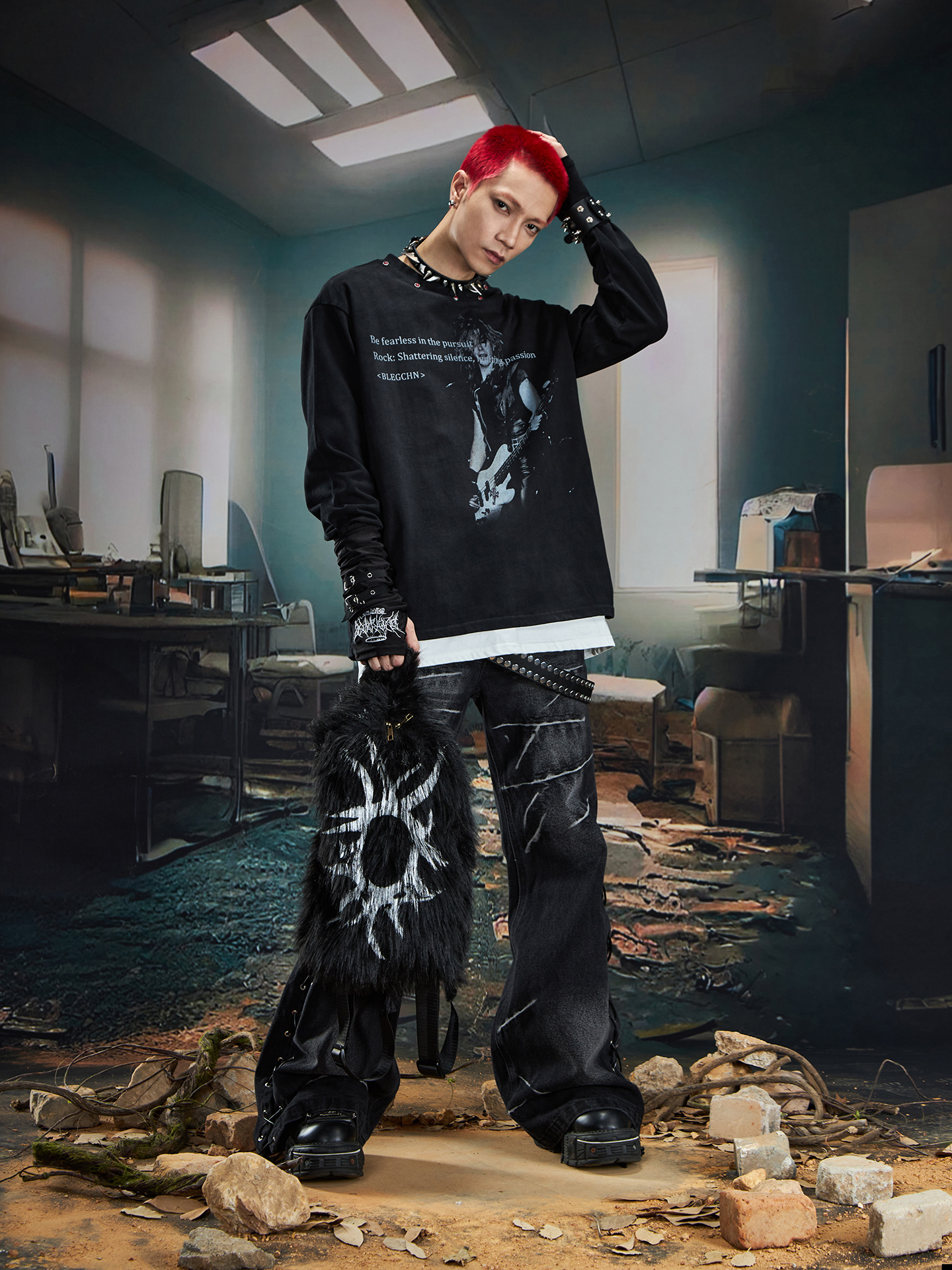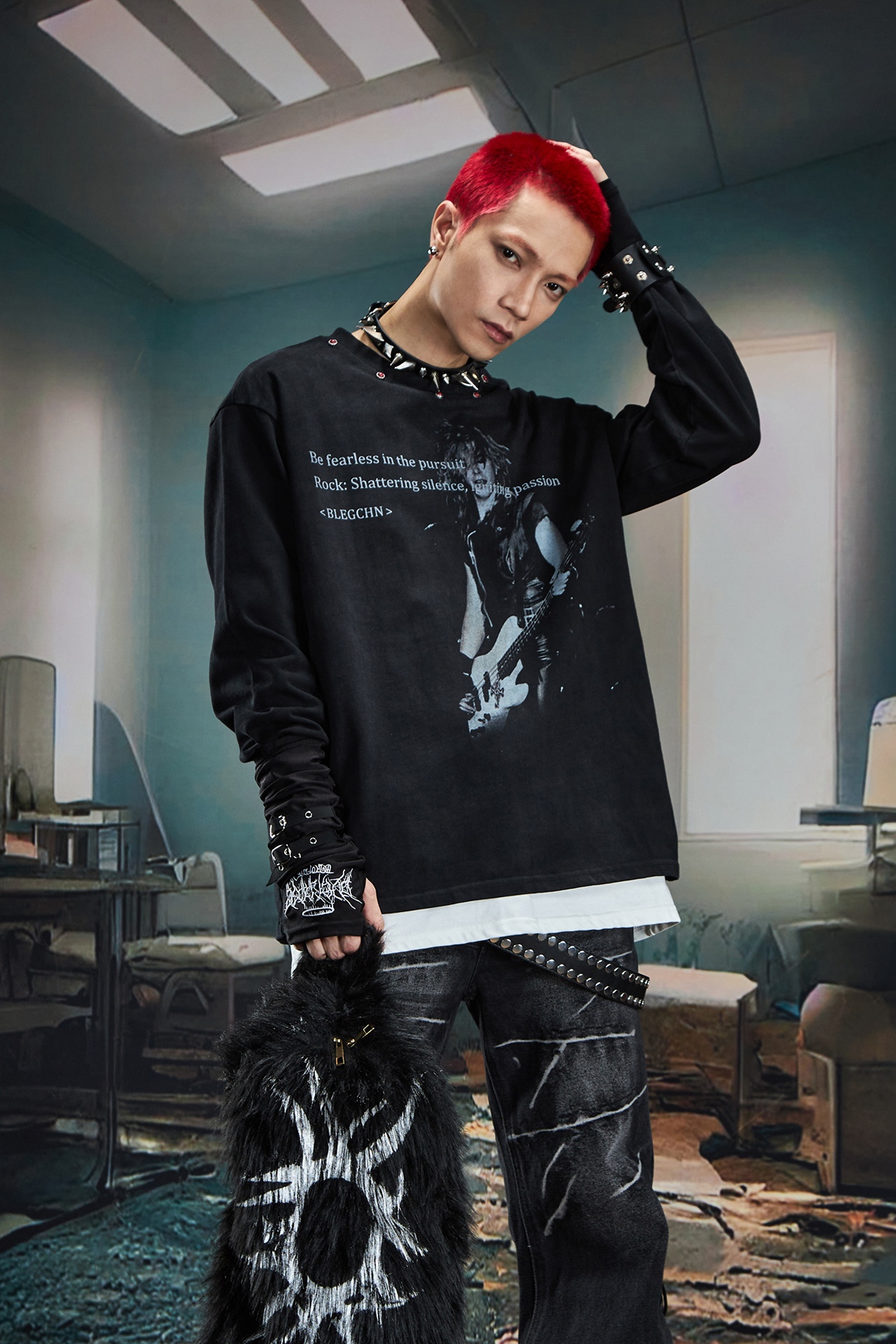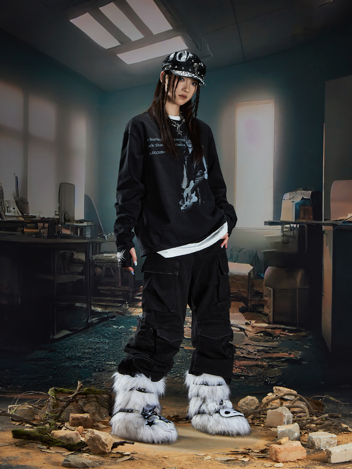 Washed Digital Portrait Slogan Print Stud Long Sleeve T-Shirt WN20559