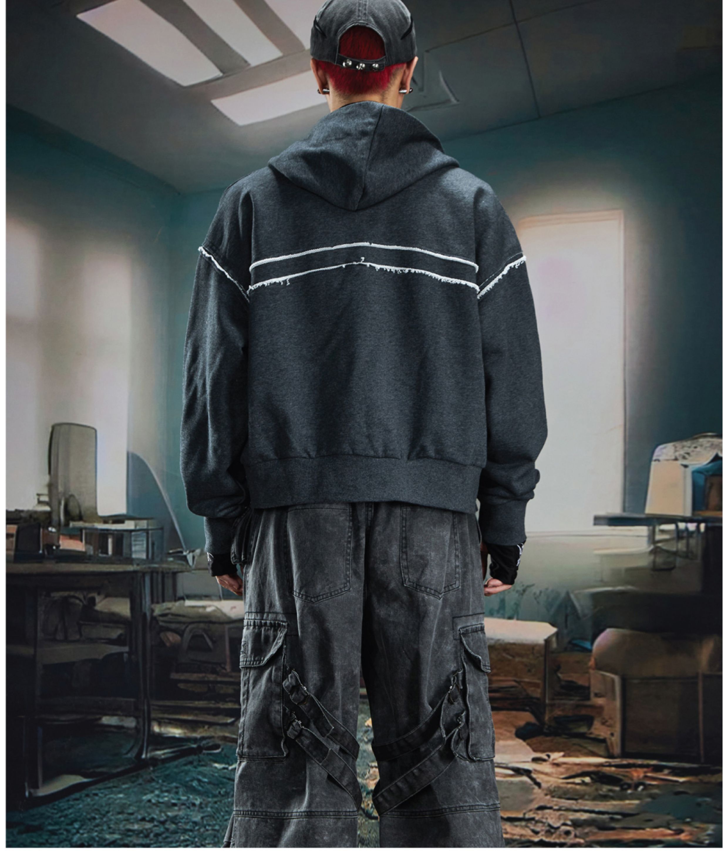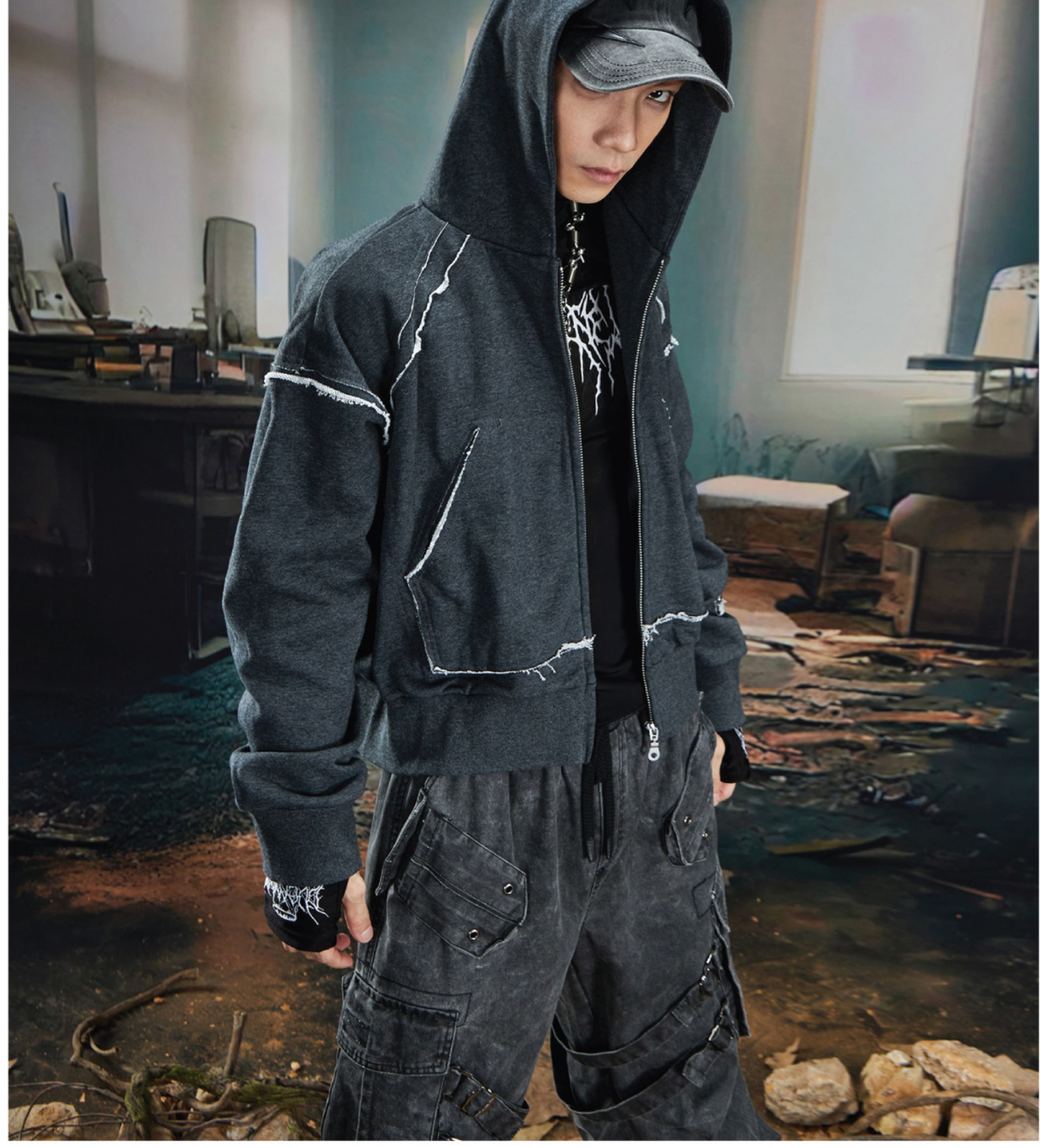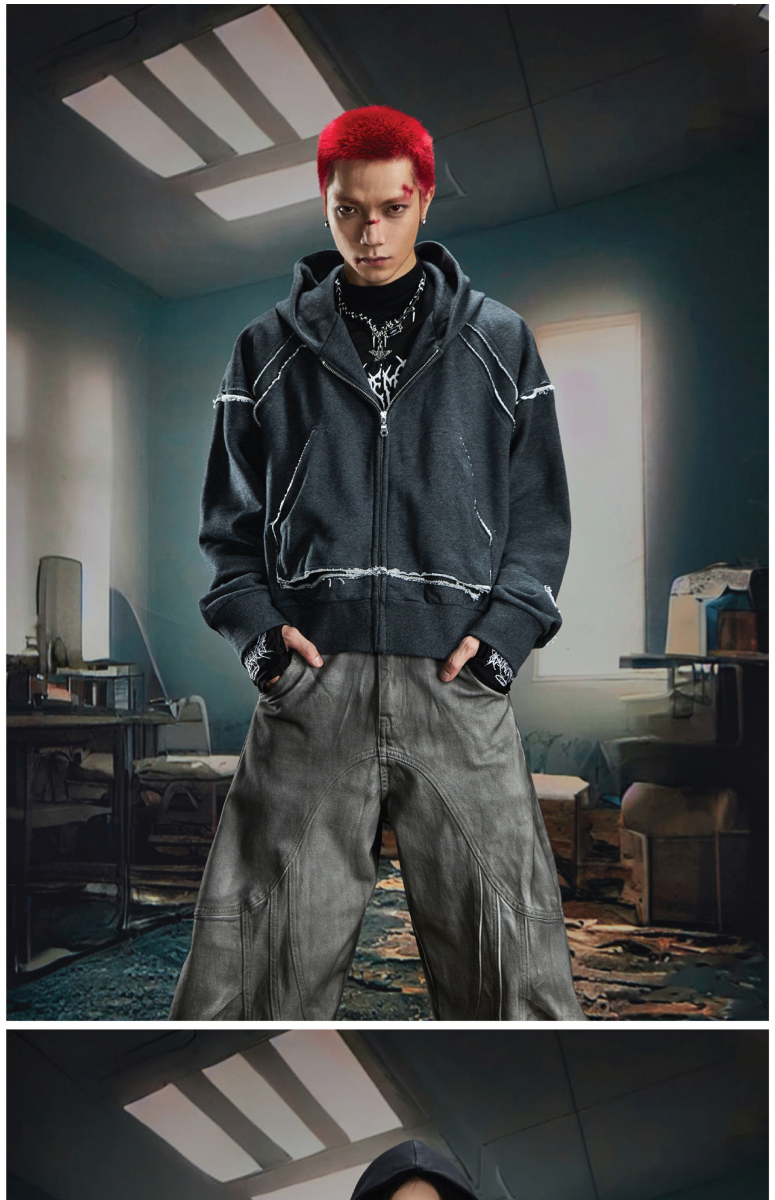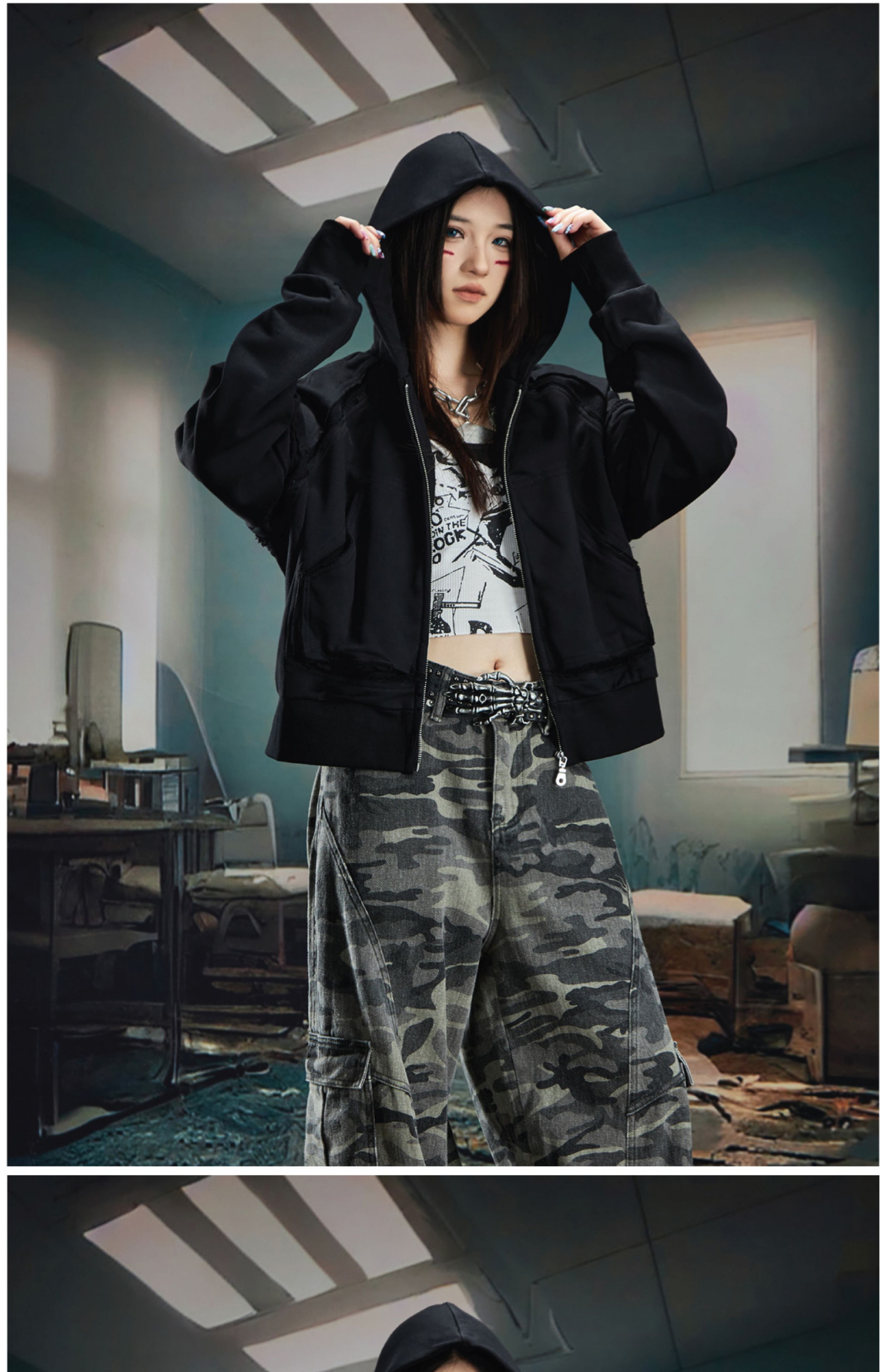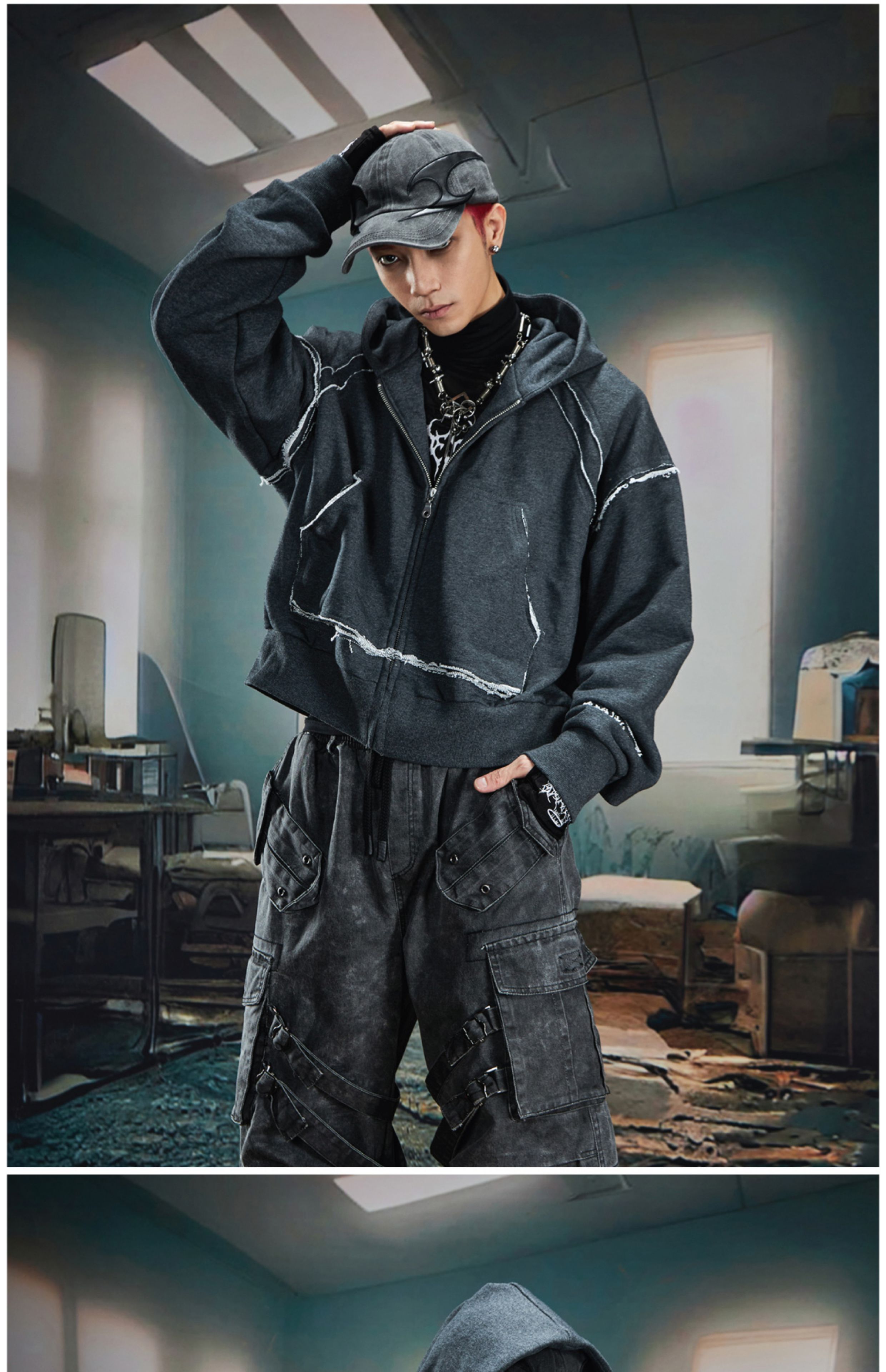 Fringe Deconstructed Patchwork Short Zipper Hoodie WN20583