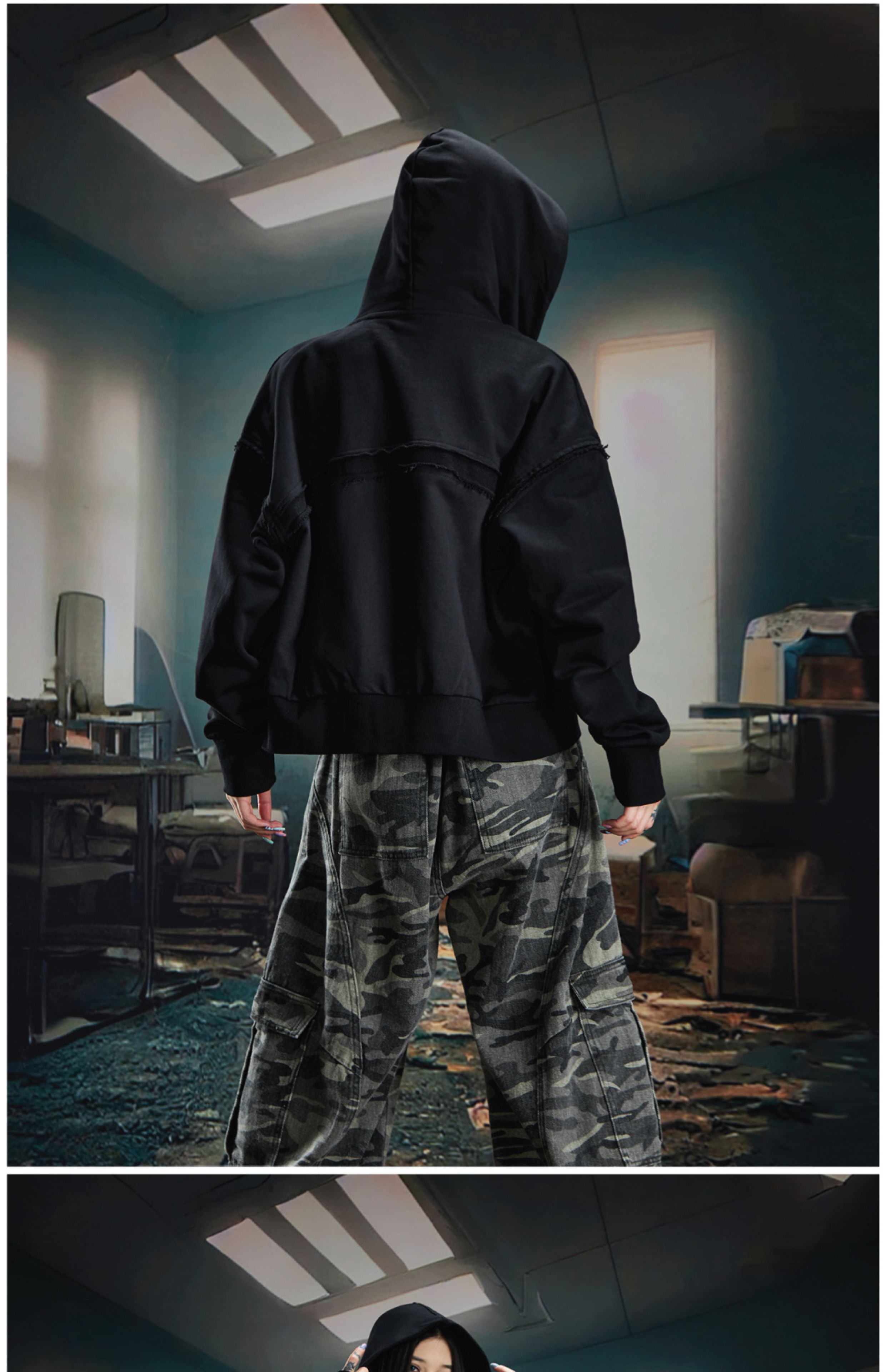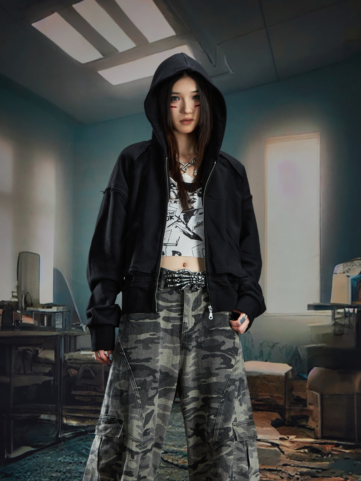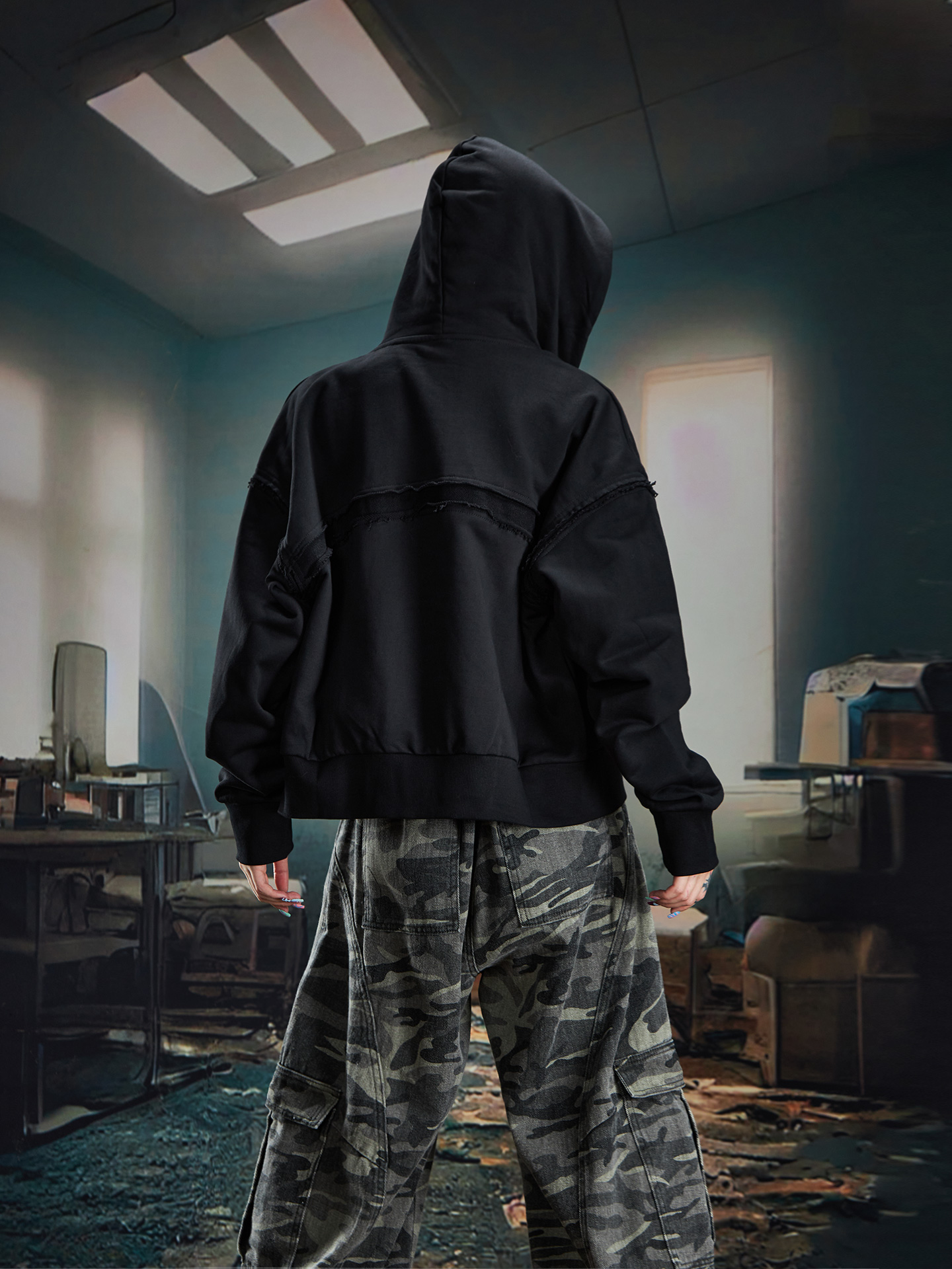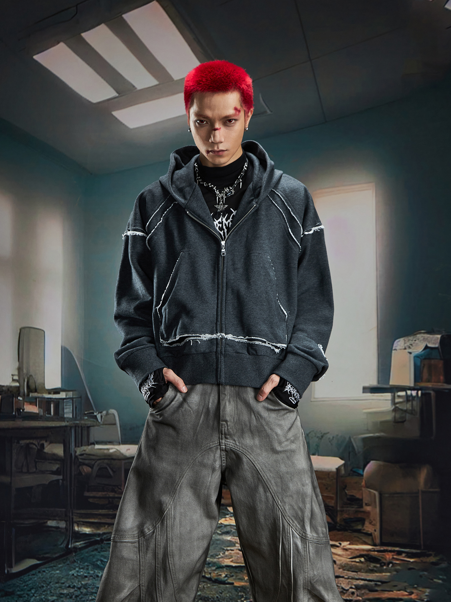 Fringe Deconstructed Patchwork Short Zipper Hoodie WN20583