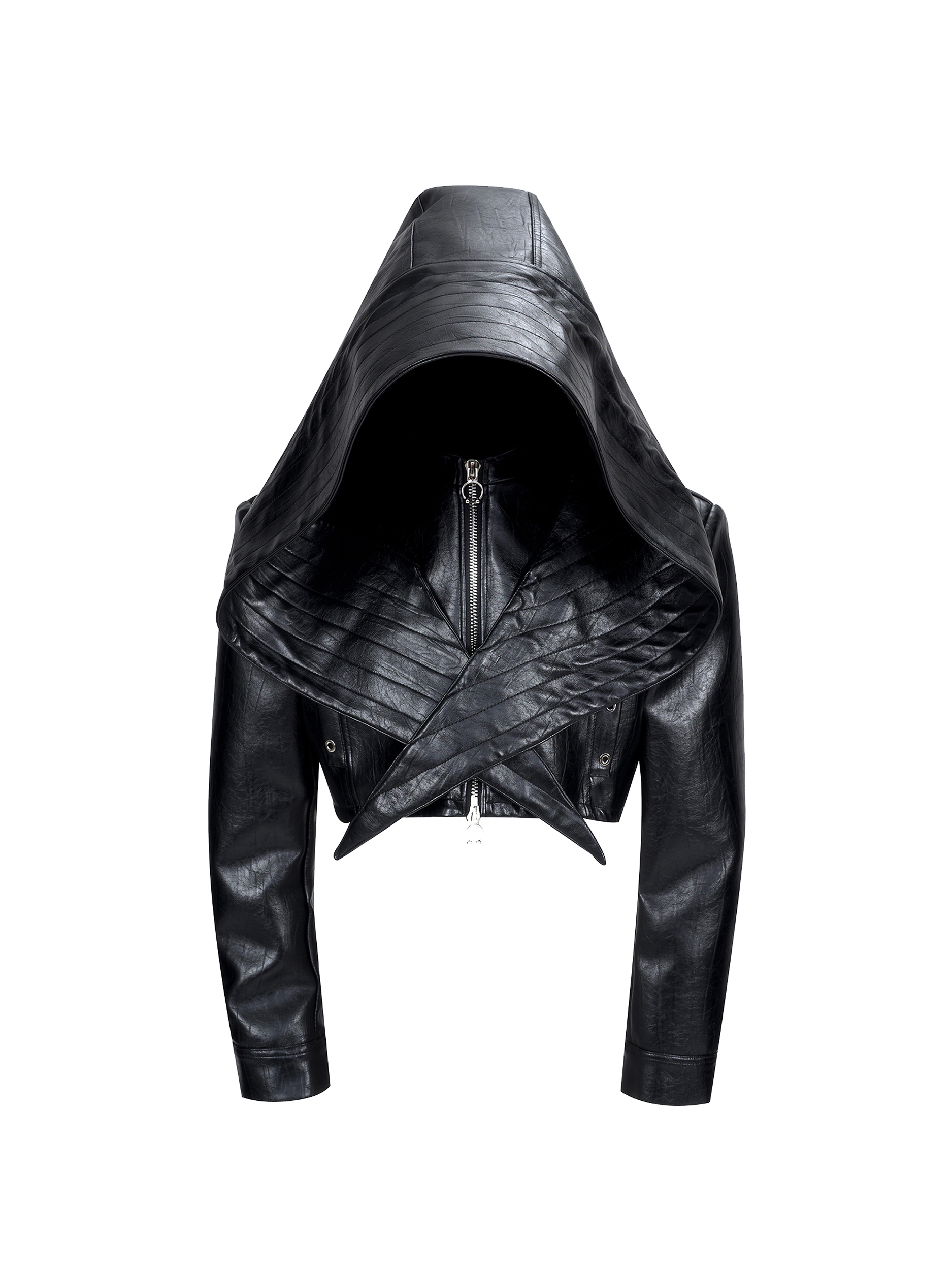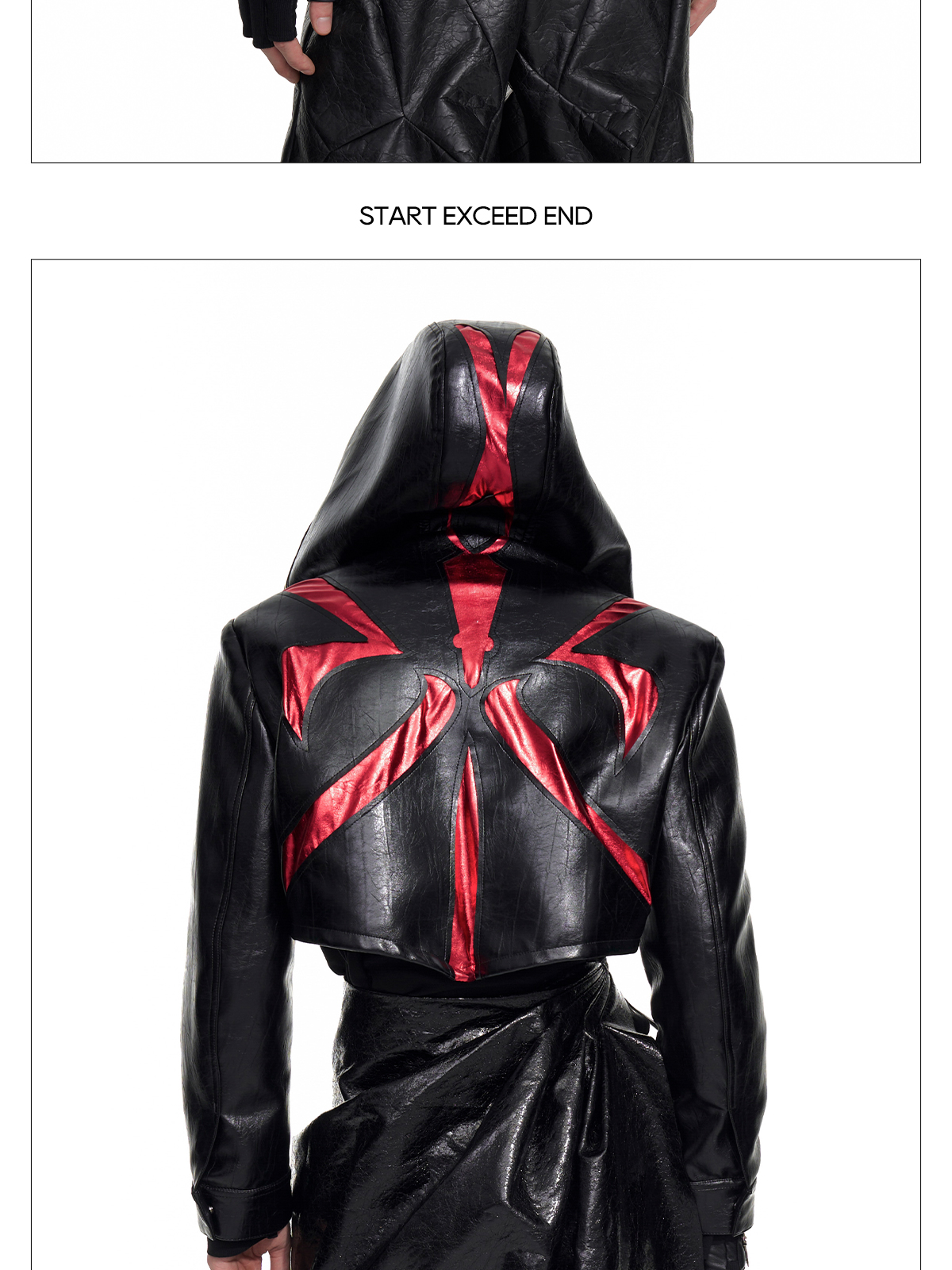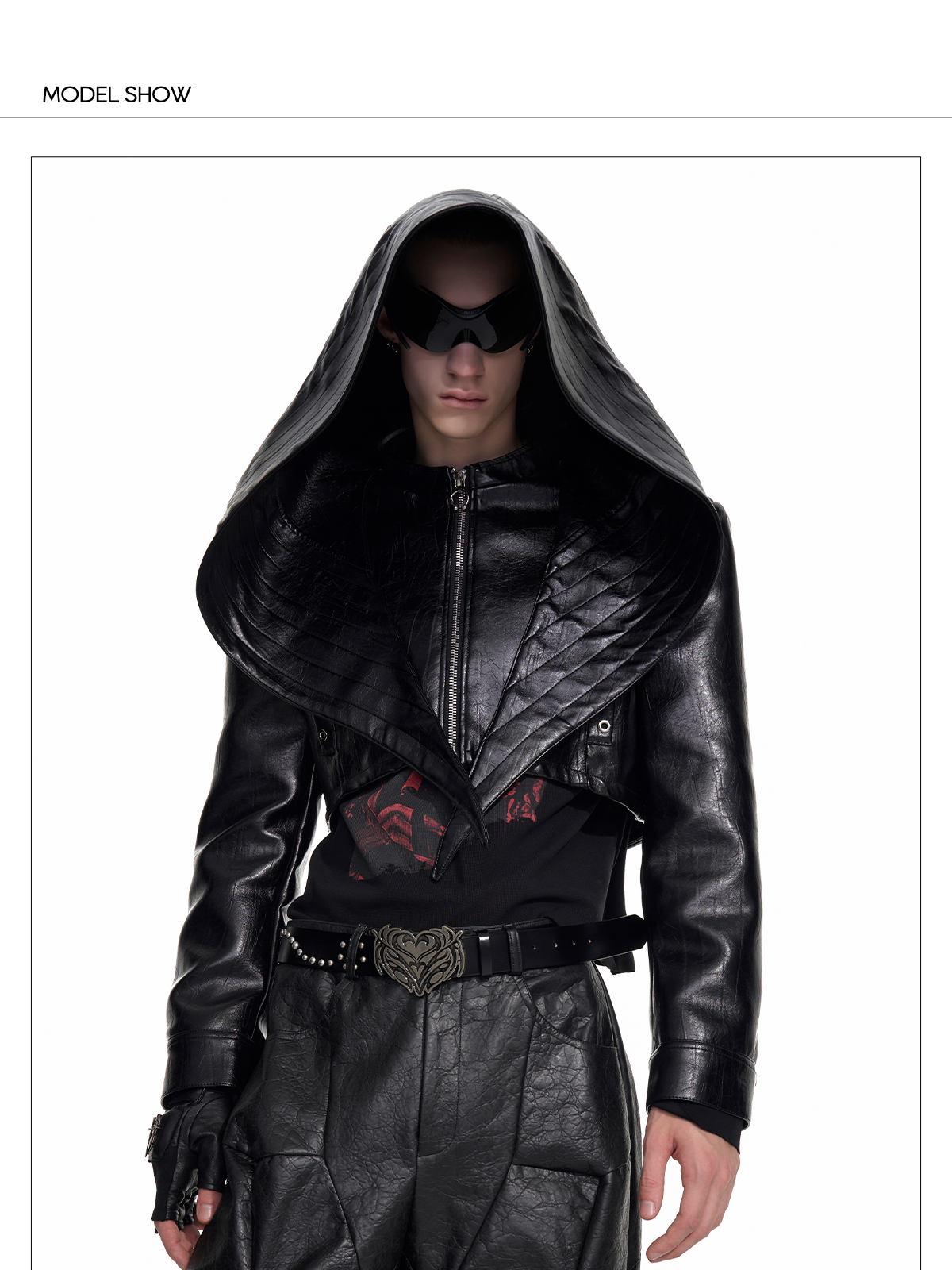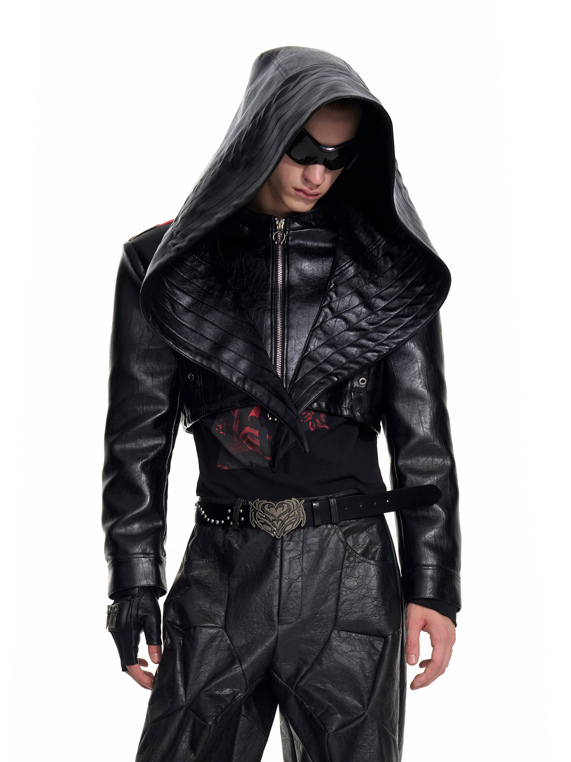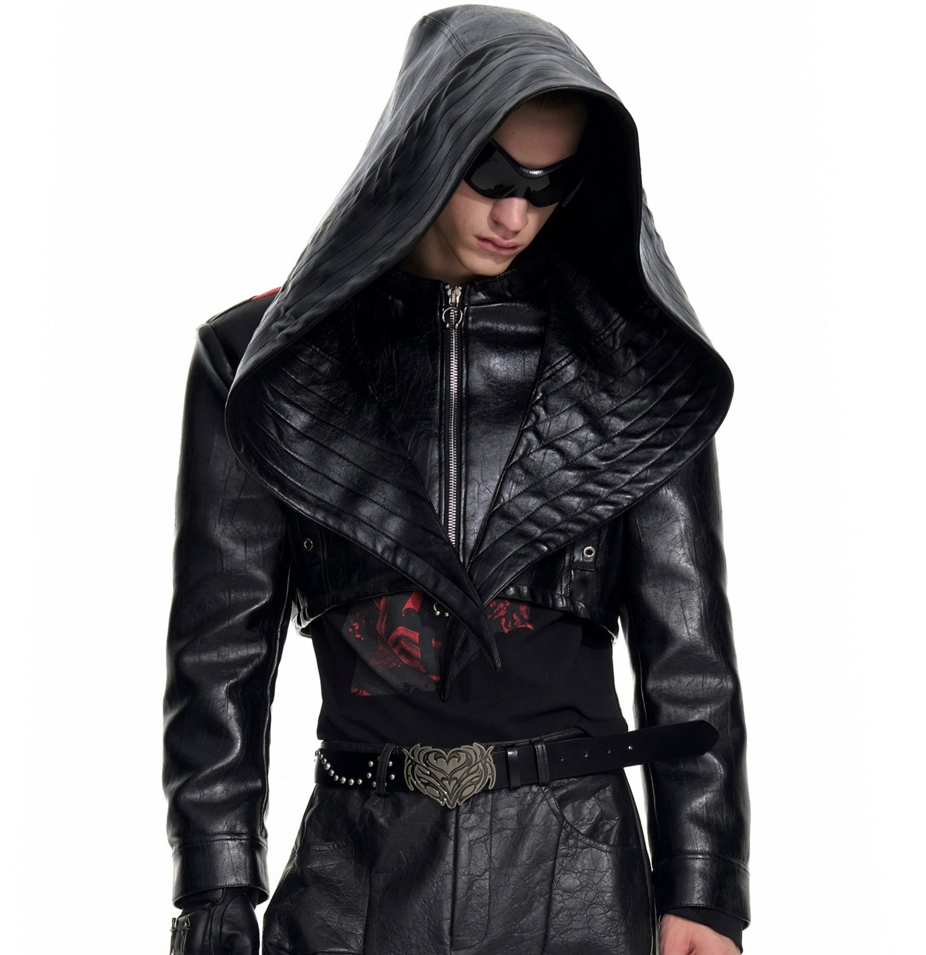 Bat Hat Design PU Leather Hooded Short Jacket WN20926