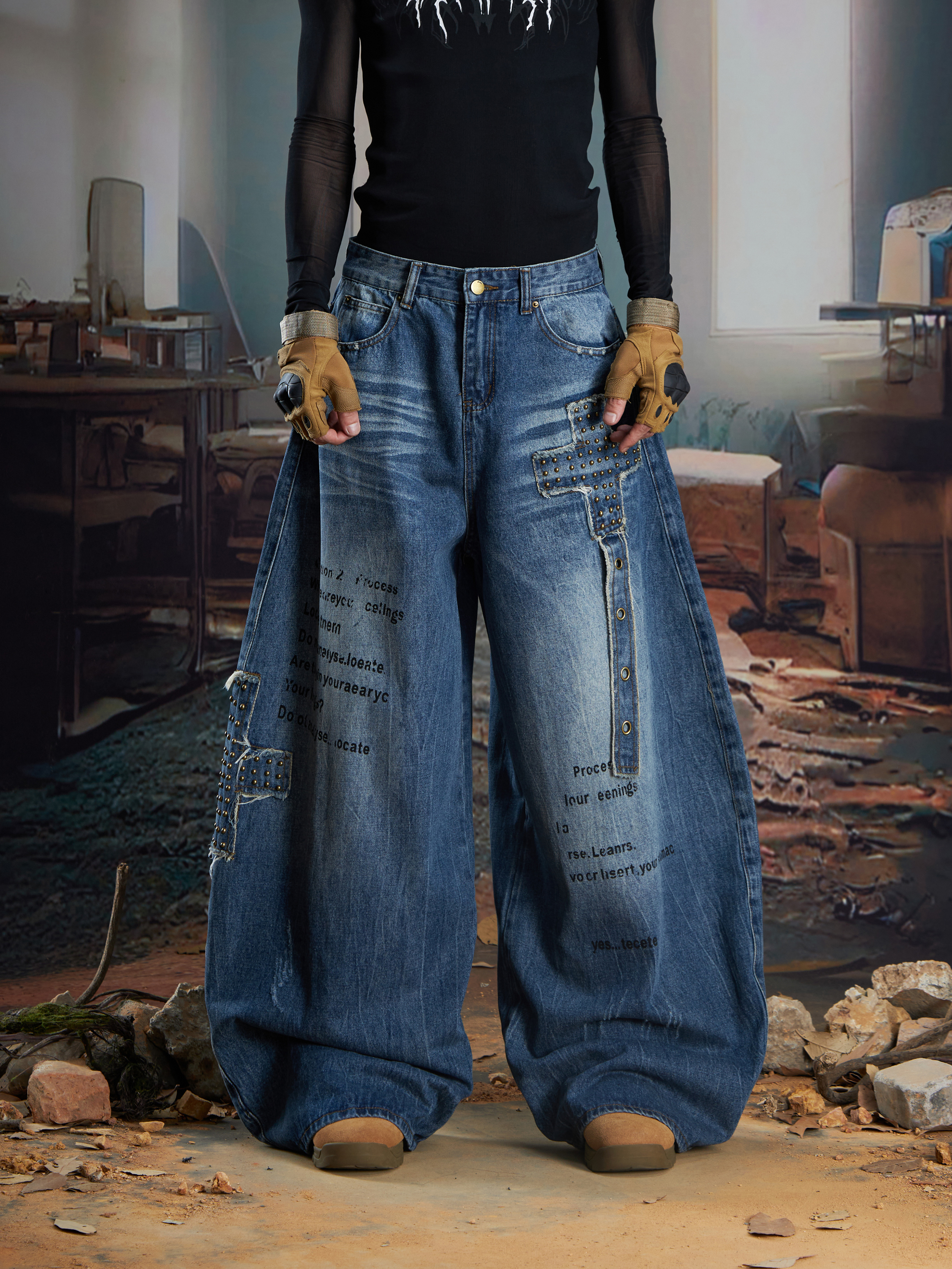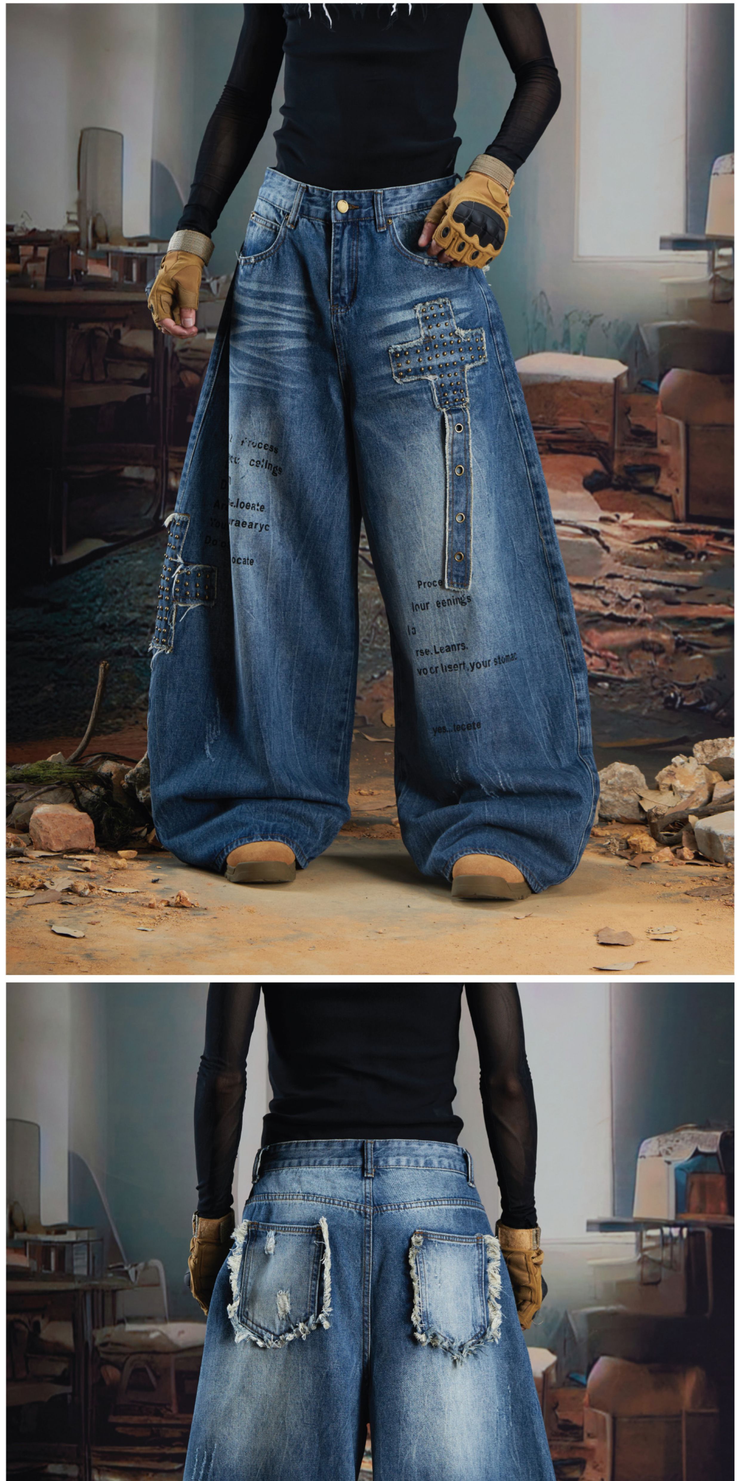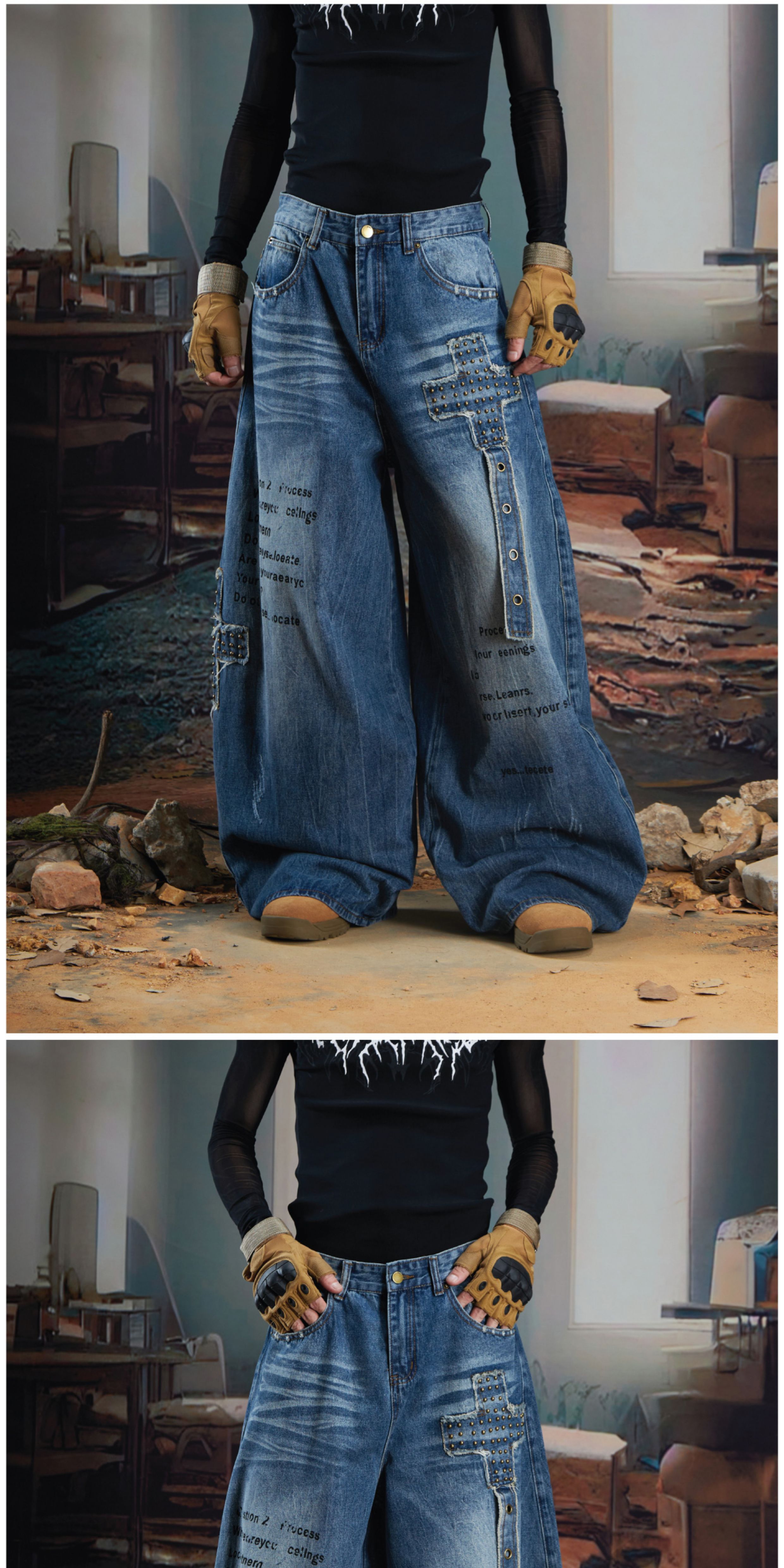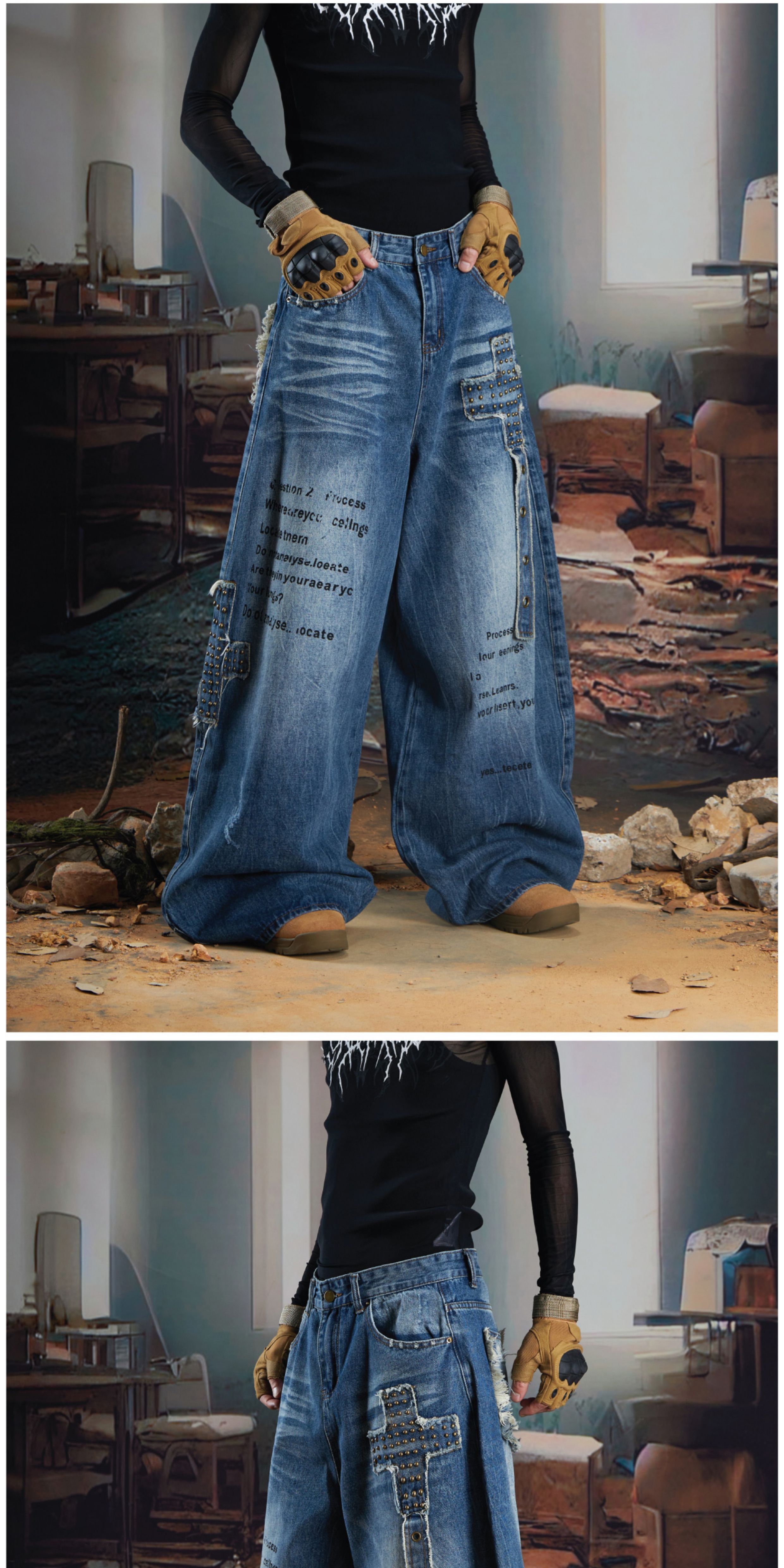 Splicing Studs Washed Damage Wide Leg Denim Jeans WN21343