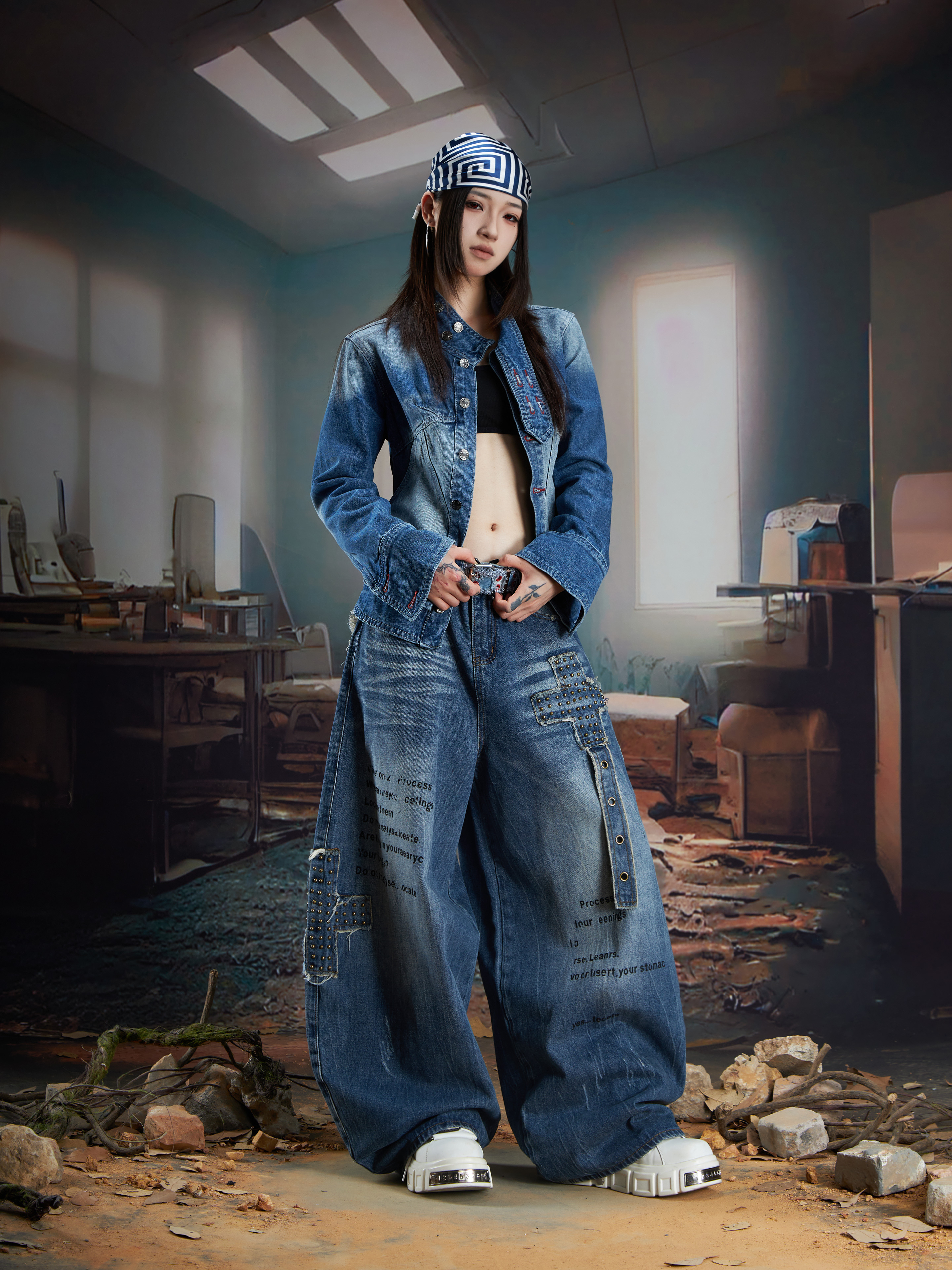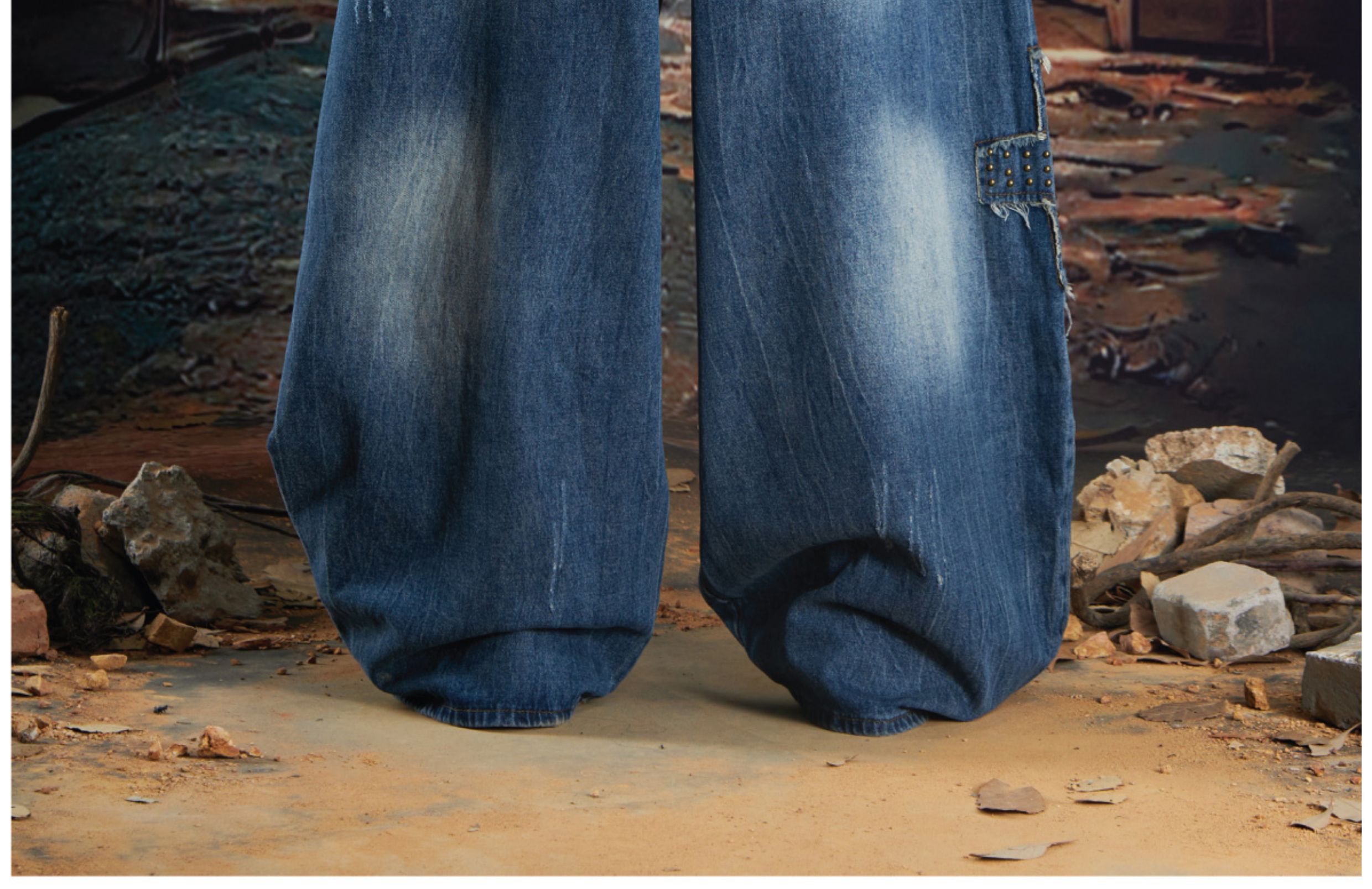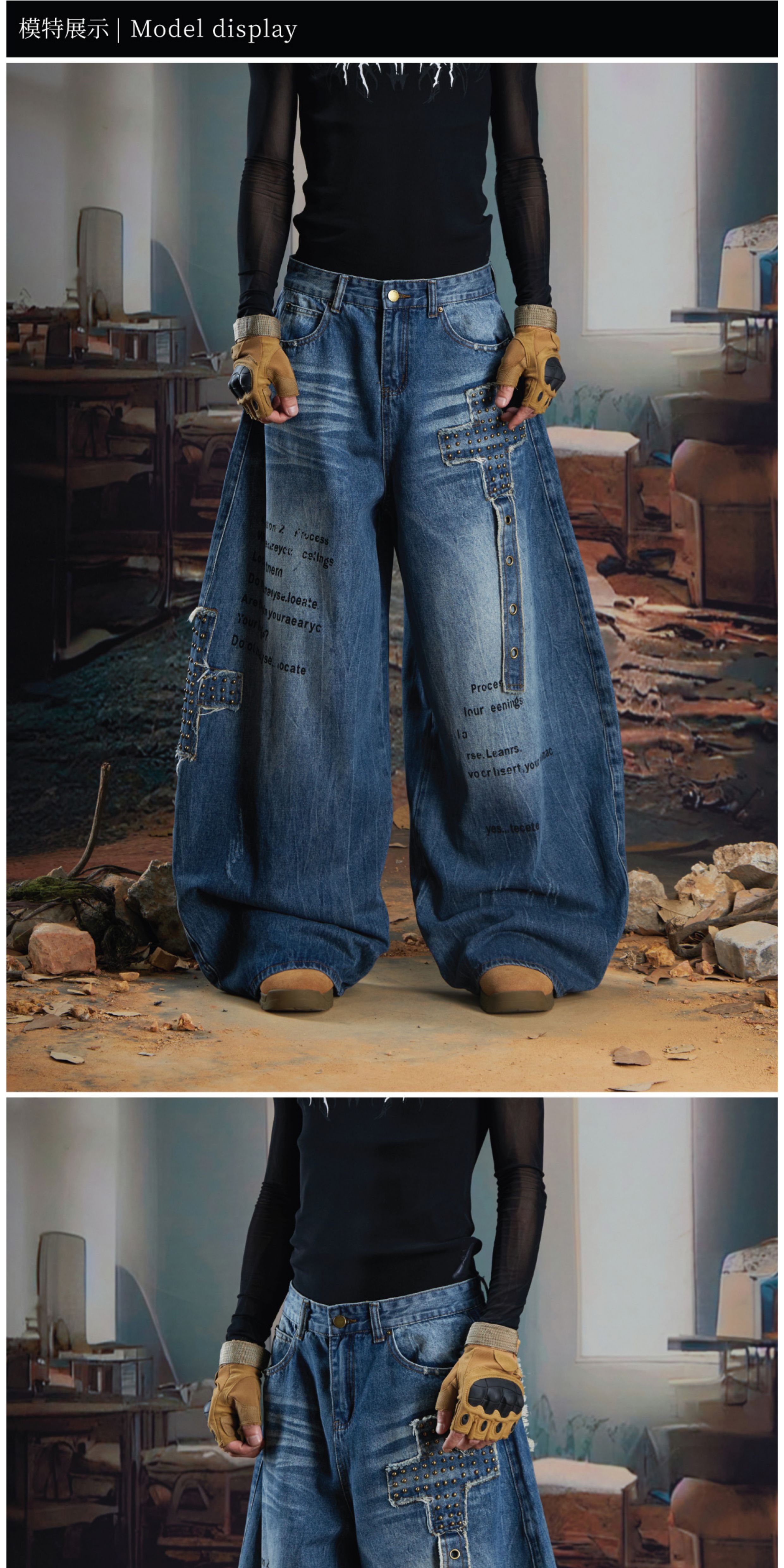 Splicing Studs Washed Damage Wide Leg Denim Jeans WN21343