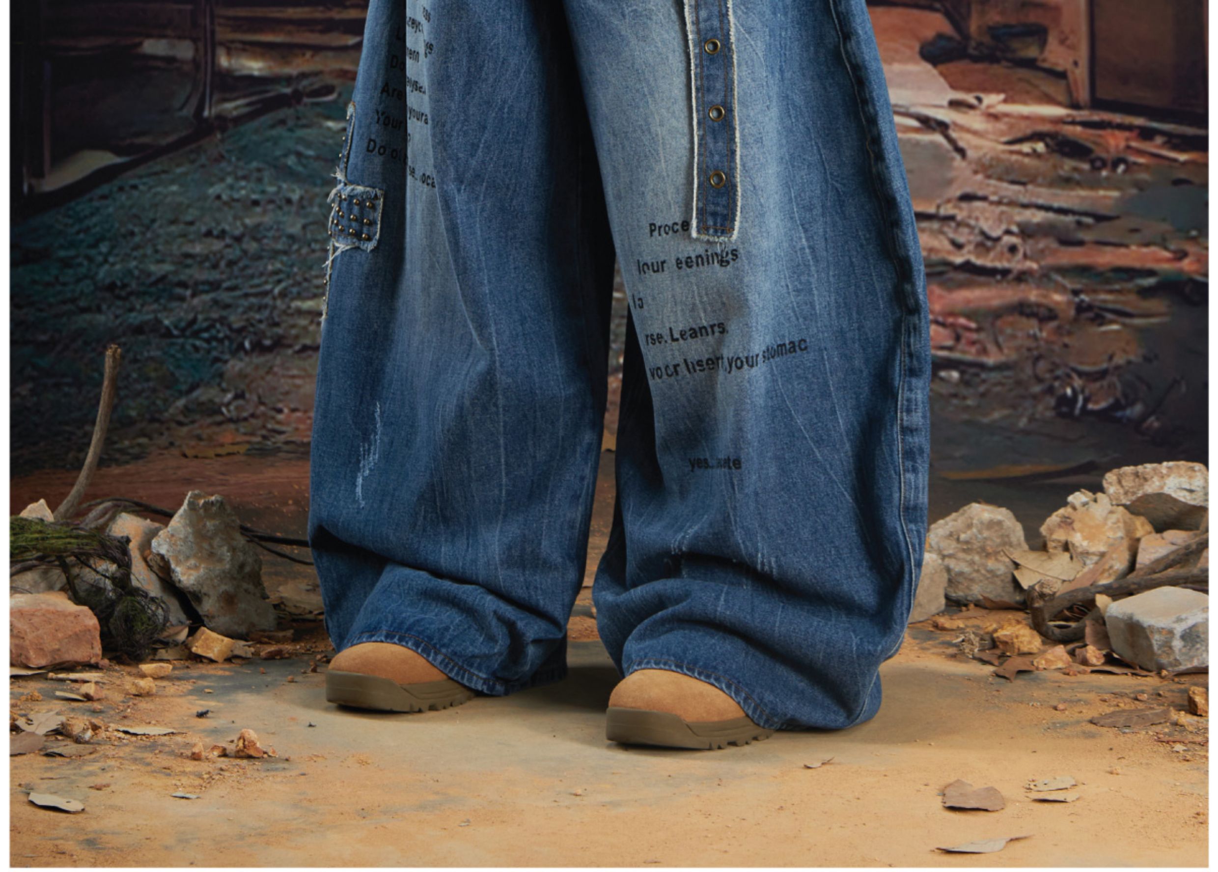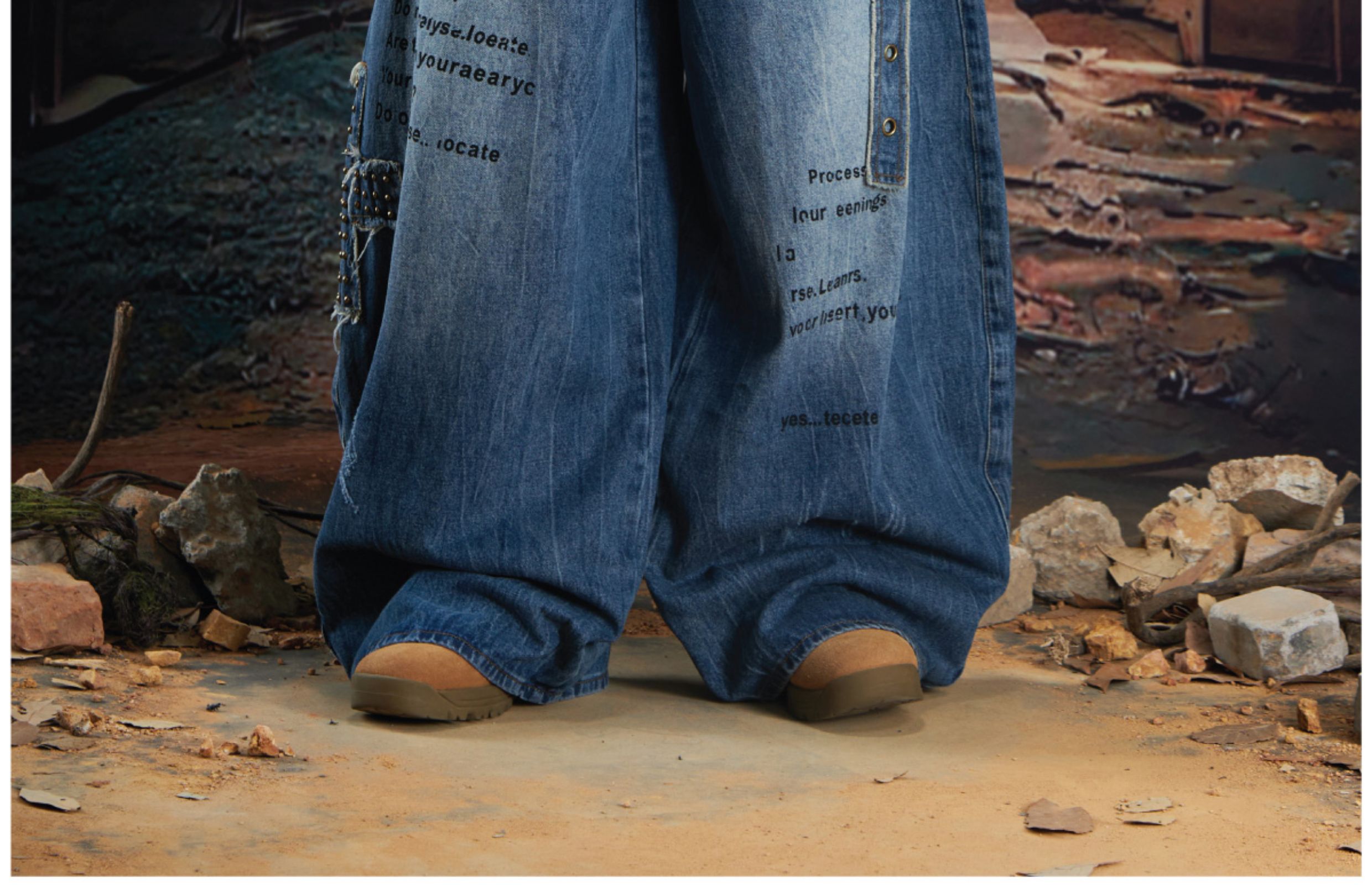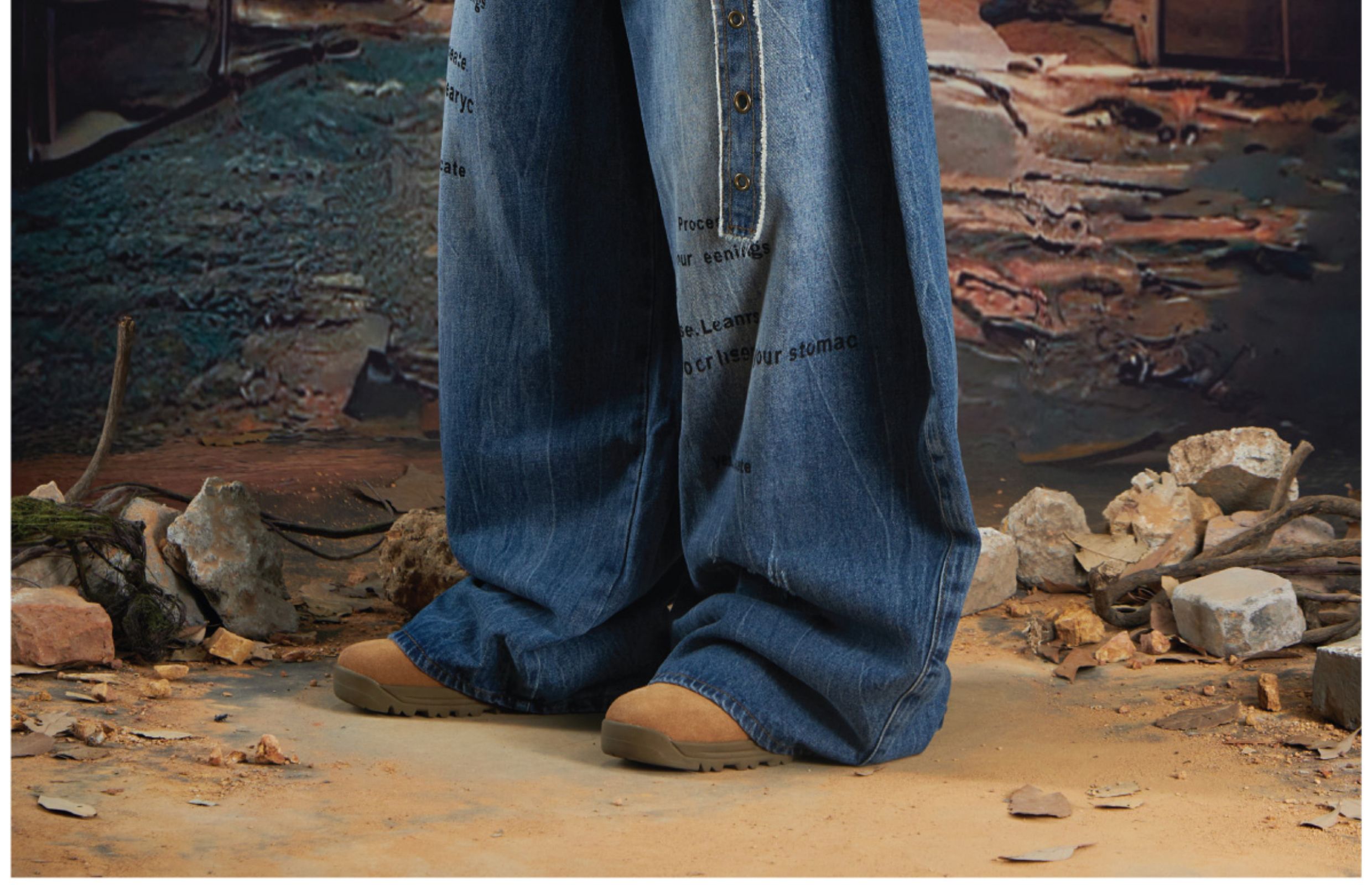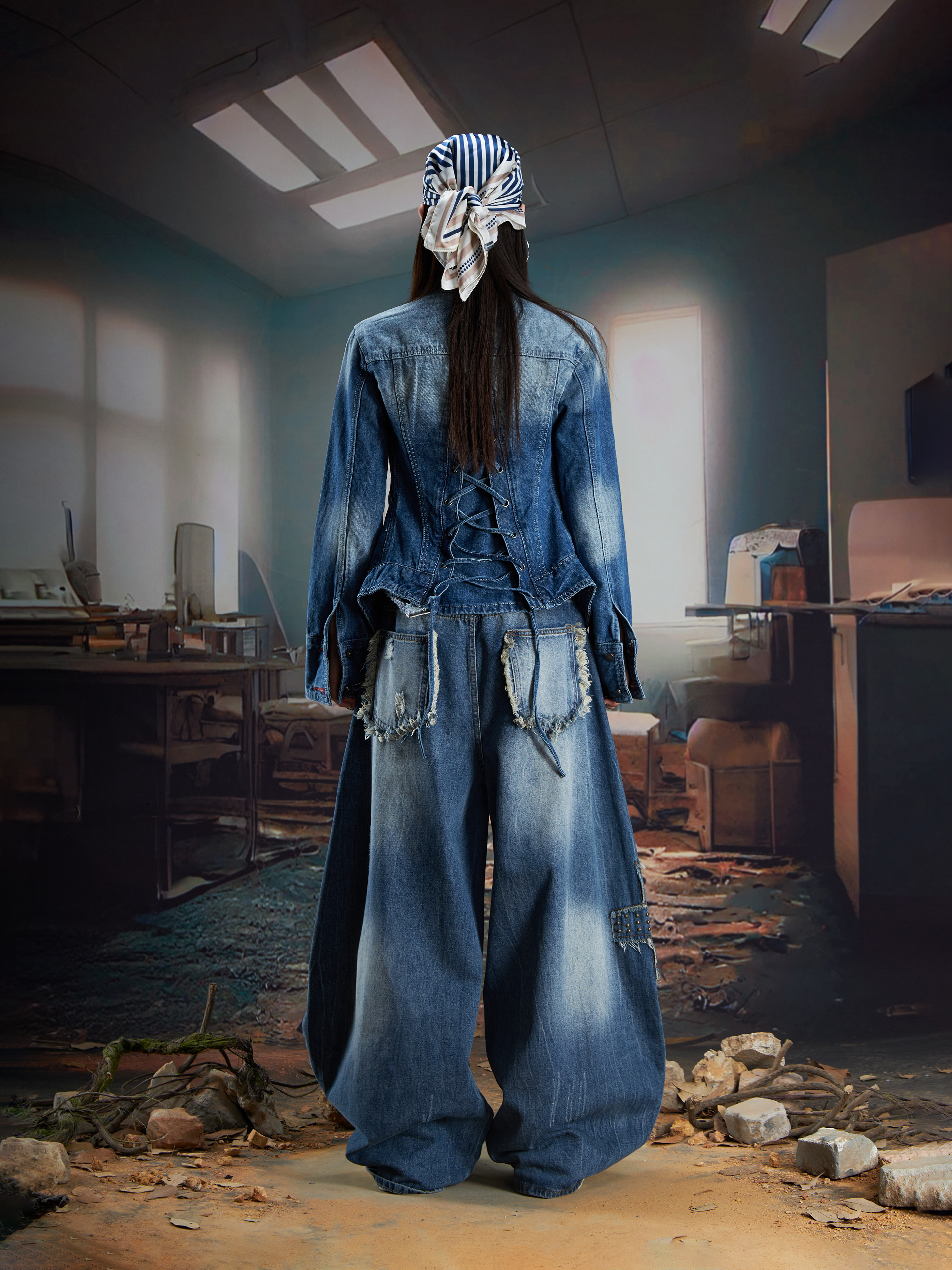 Splicing Studs Washed Damage Wide Leg Denim Jeans WN21343
