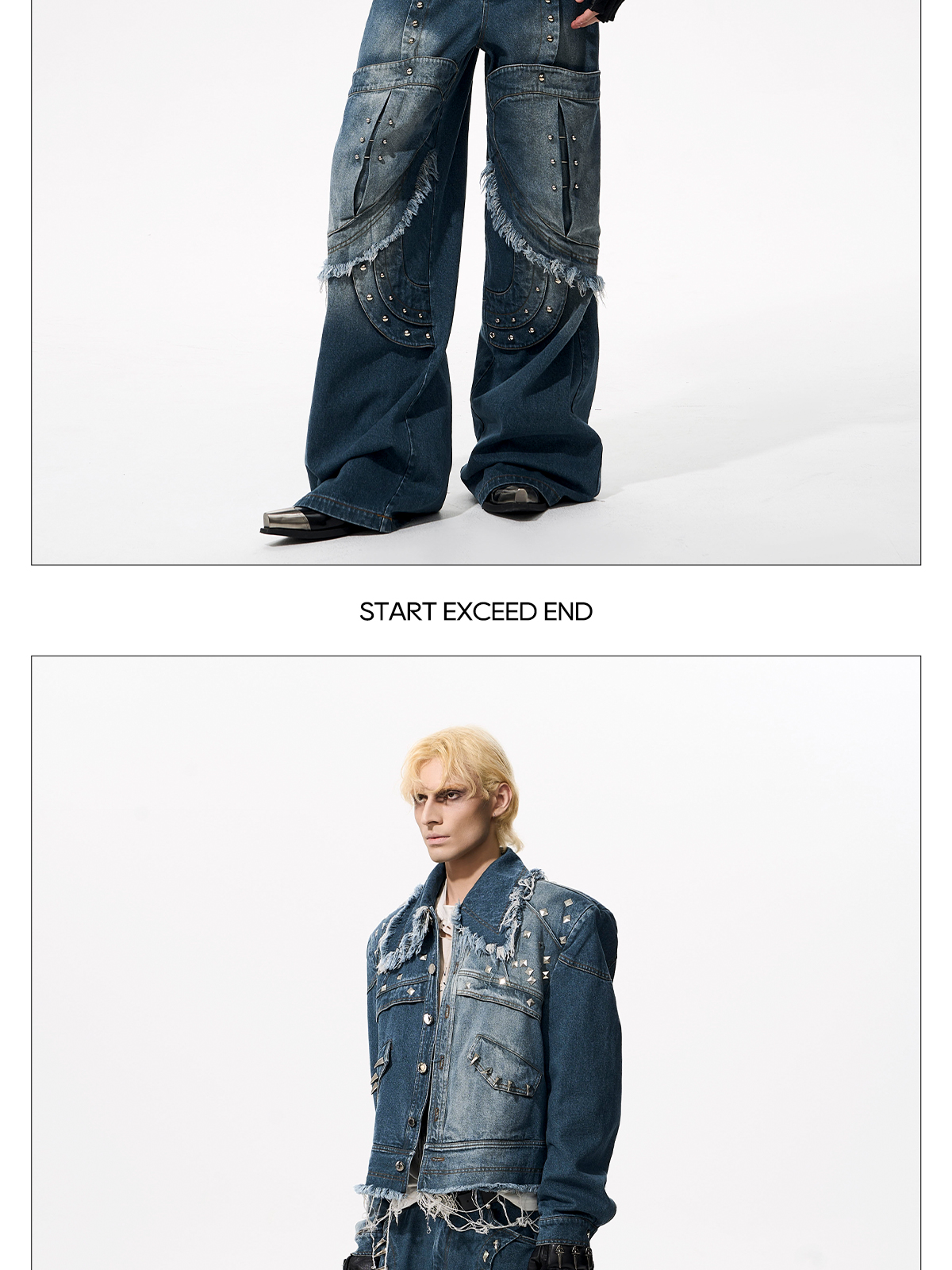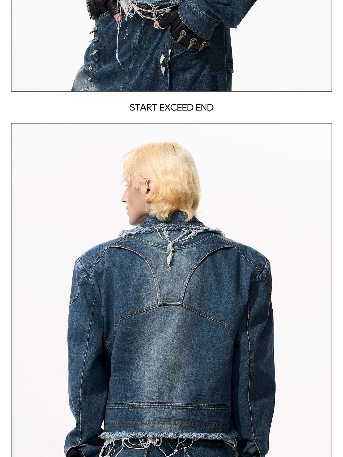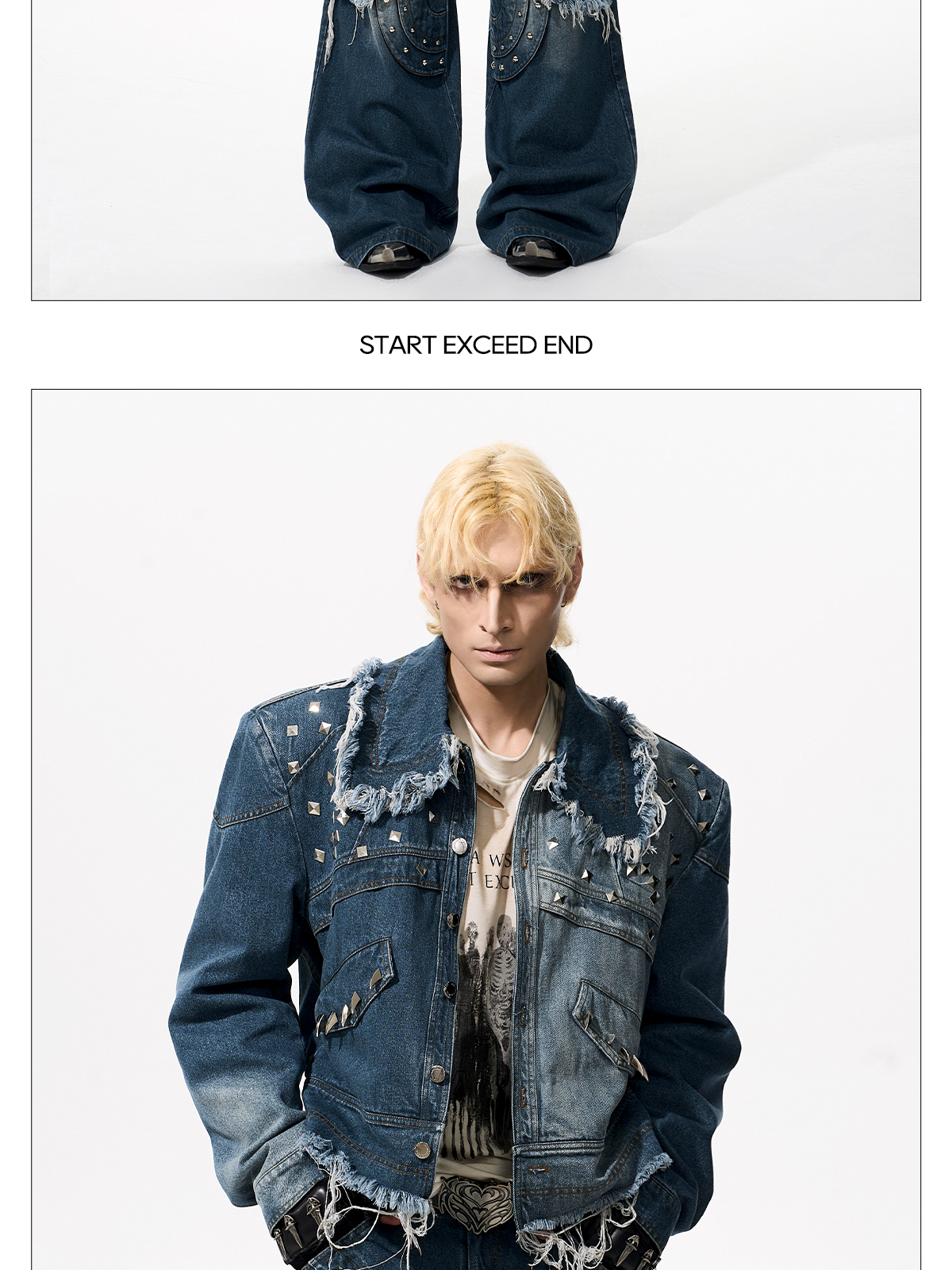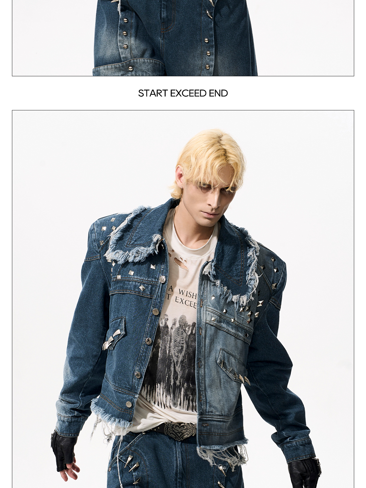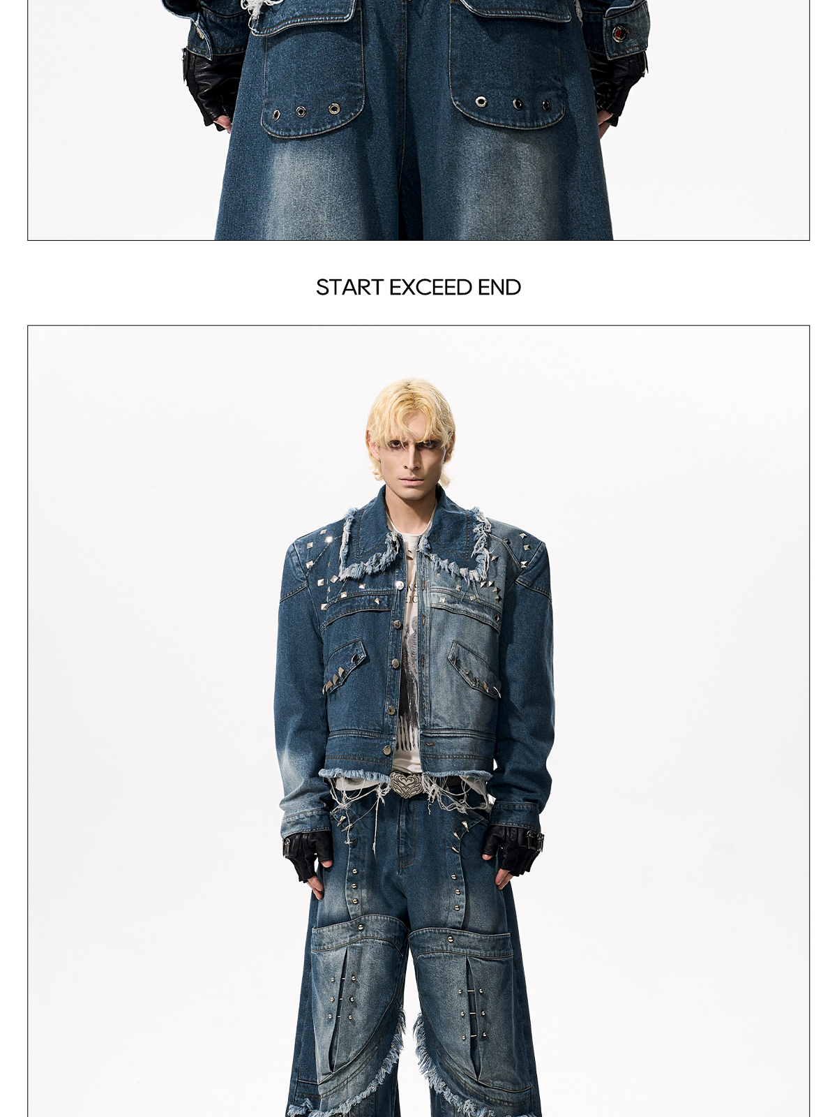 Deconstruction Rivet Design Washed Damege Denim Jacket & Denim Jeans Setup WN21969