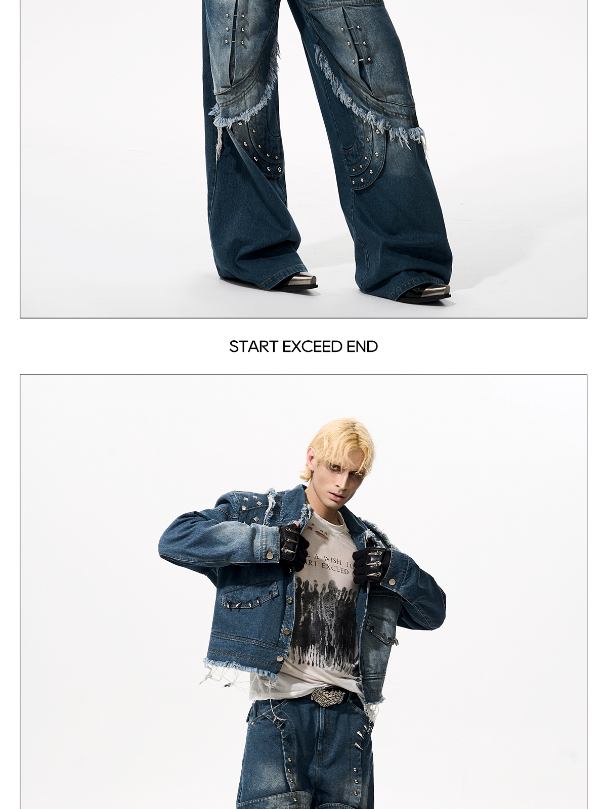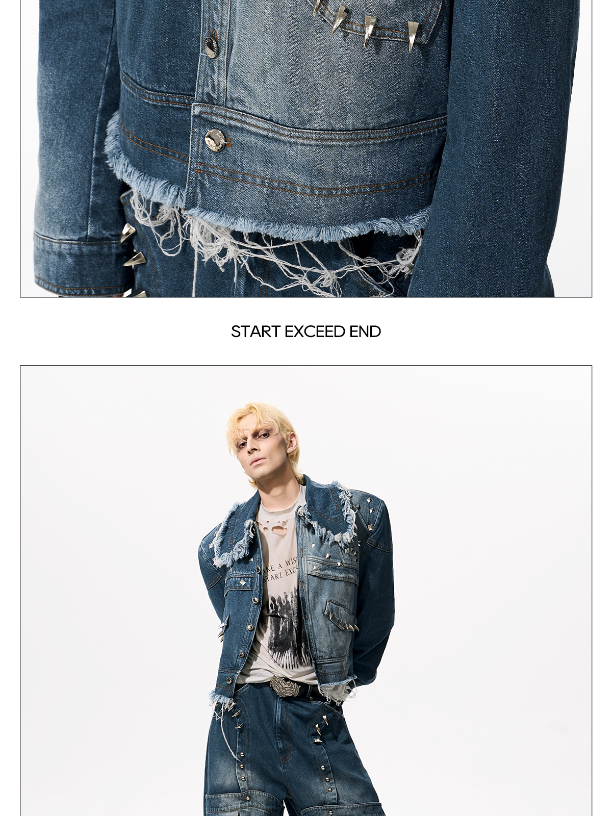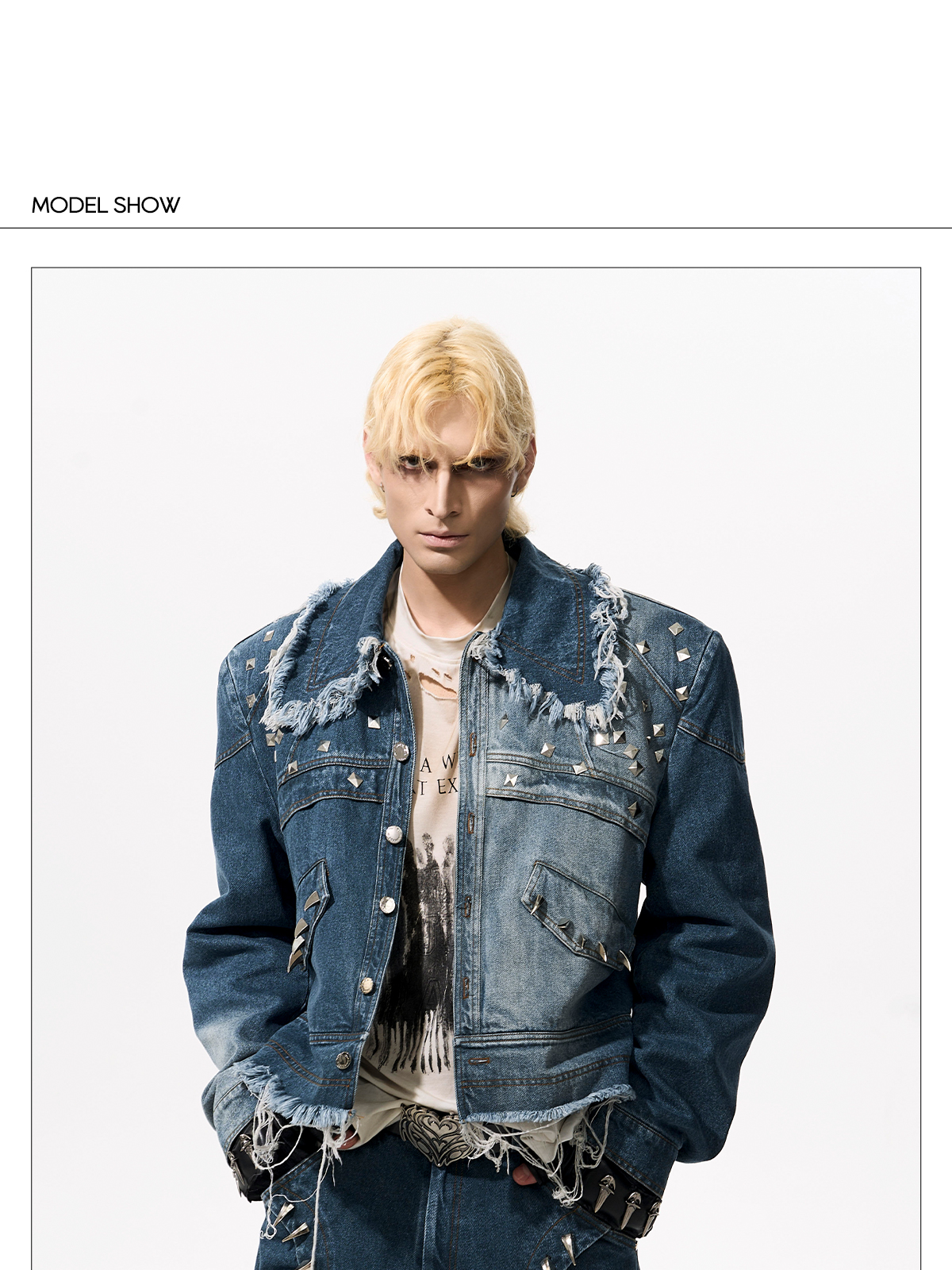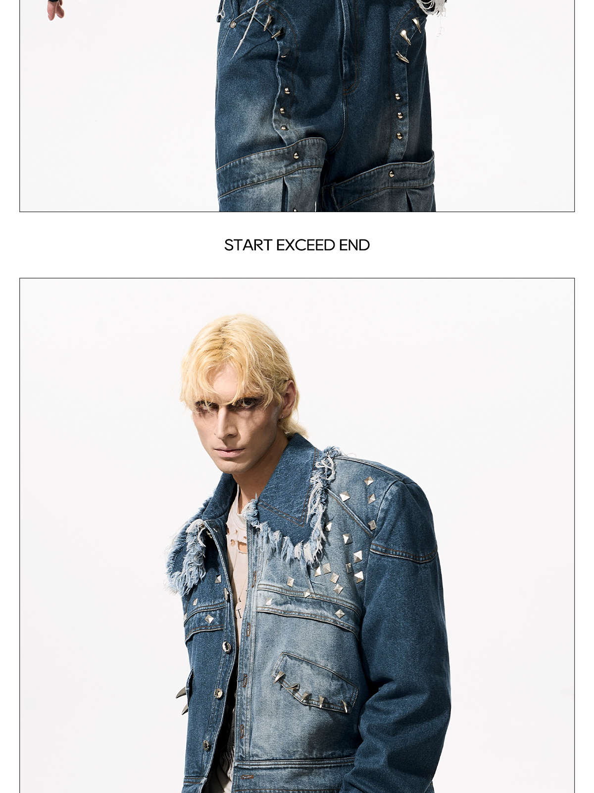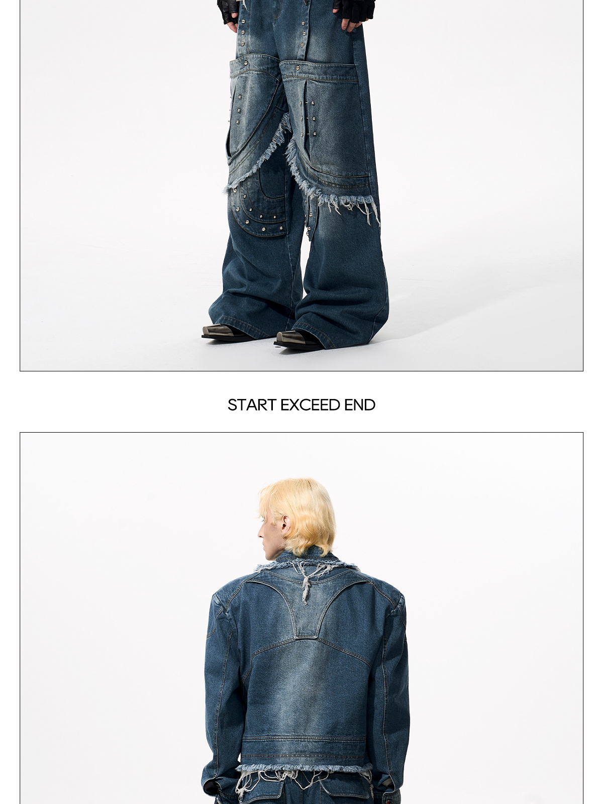 Deconstruction Rivet Design Washed Damege Denim Jacket & Denim Jeans Setup WN21969