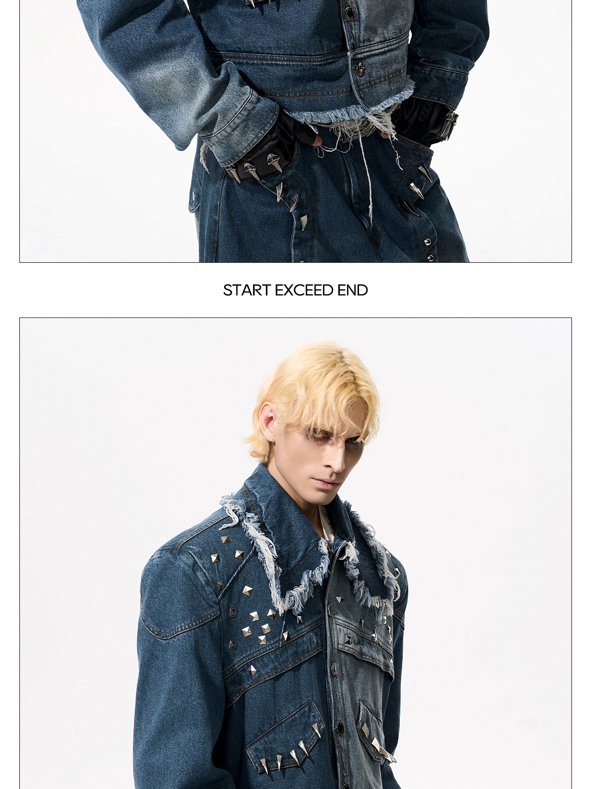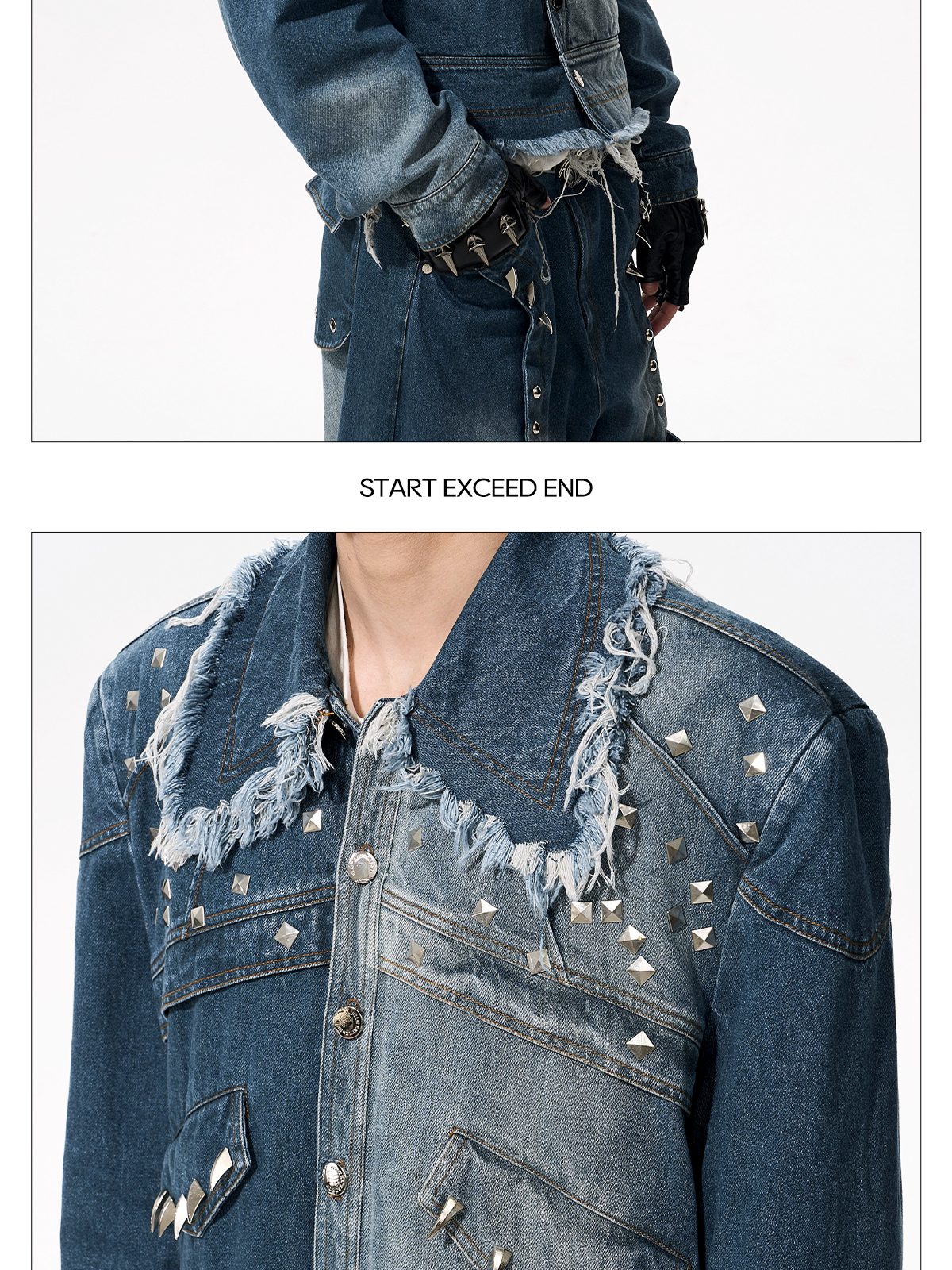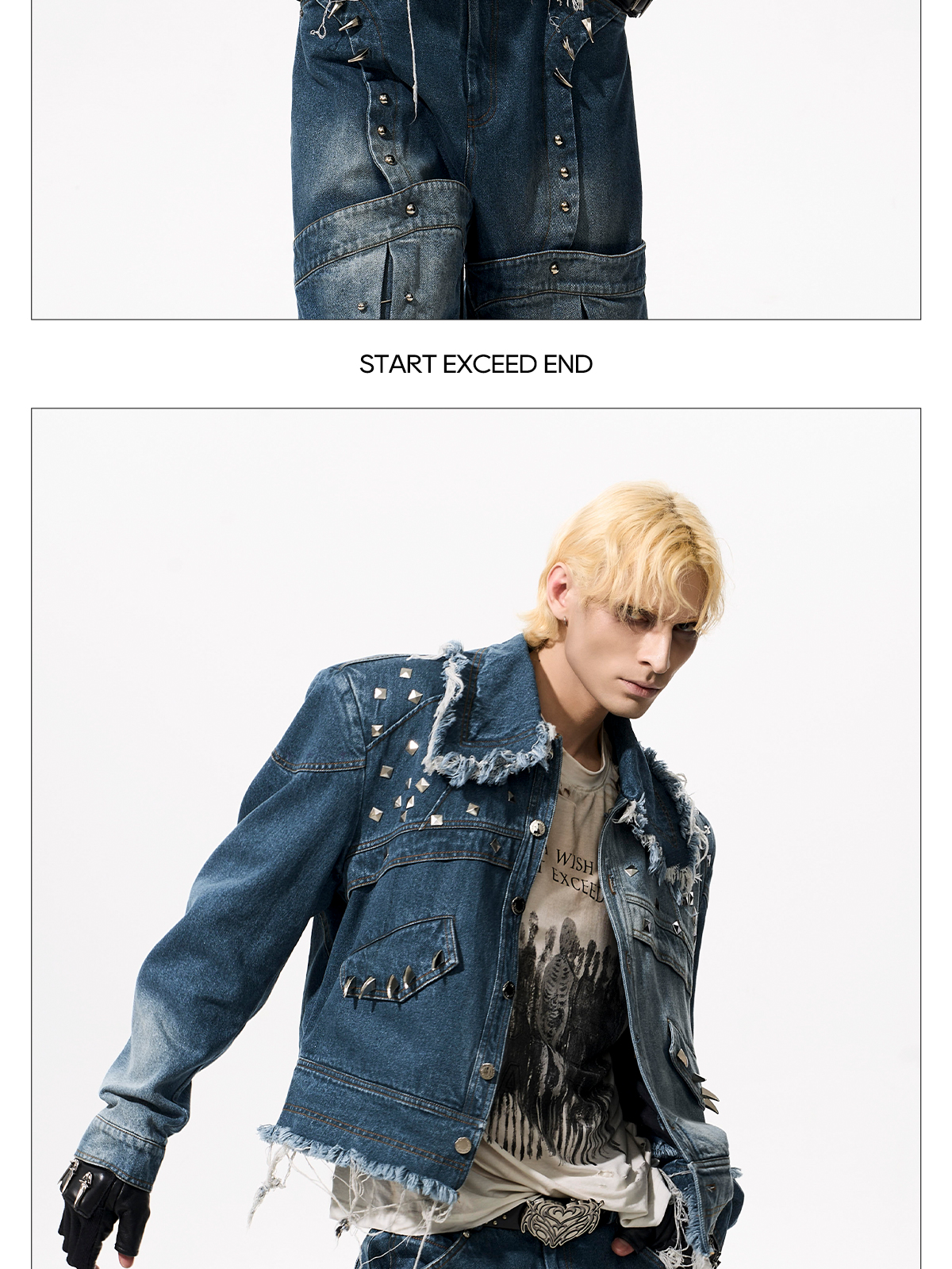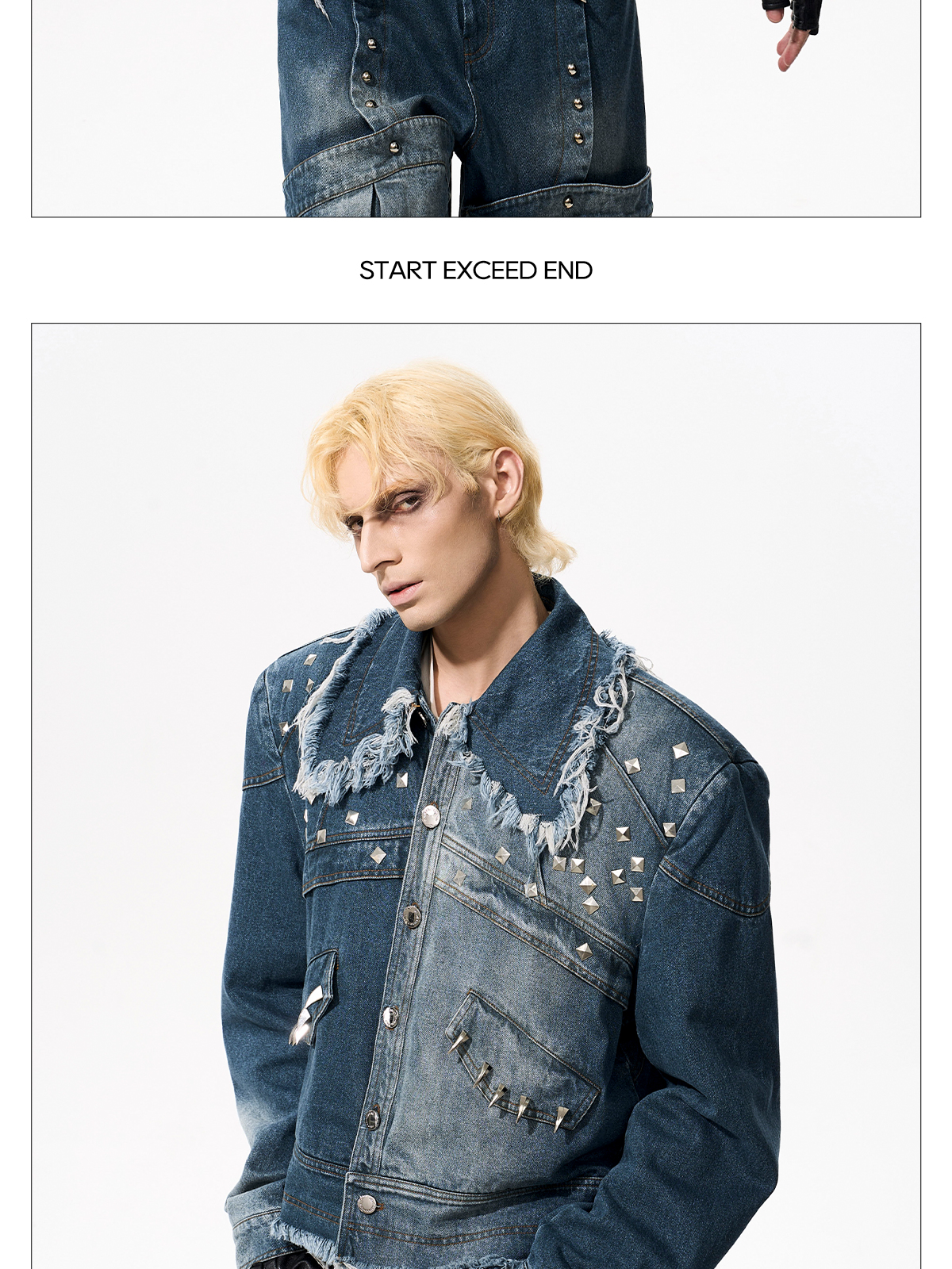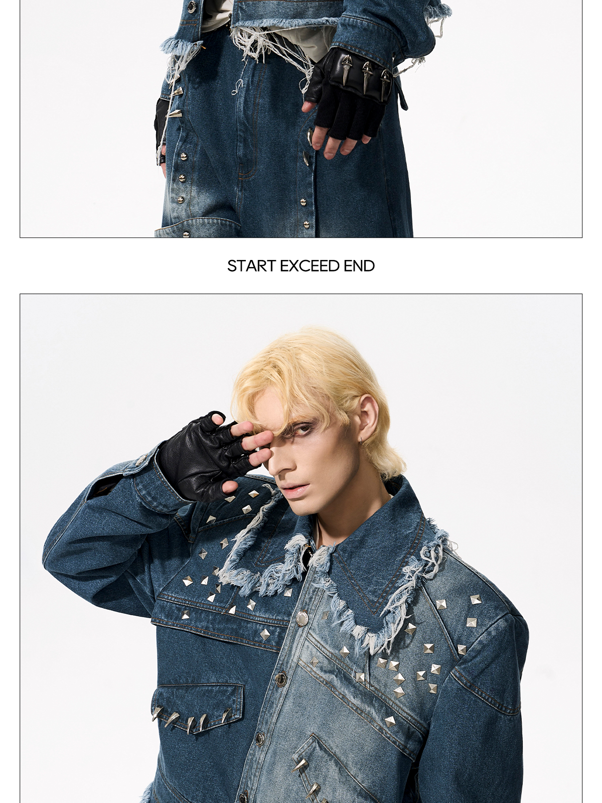 Deconstruction Rivet Design Washed Damege Denim Jacket & Denim Jeans Setup WN21969