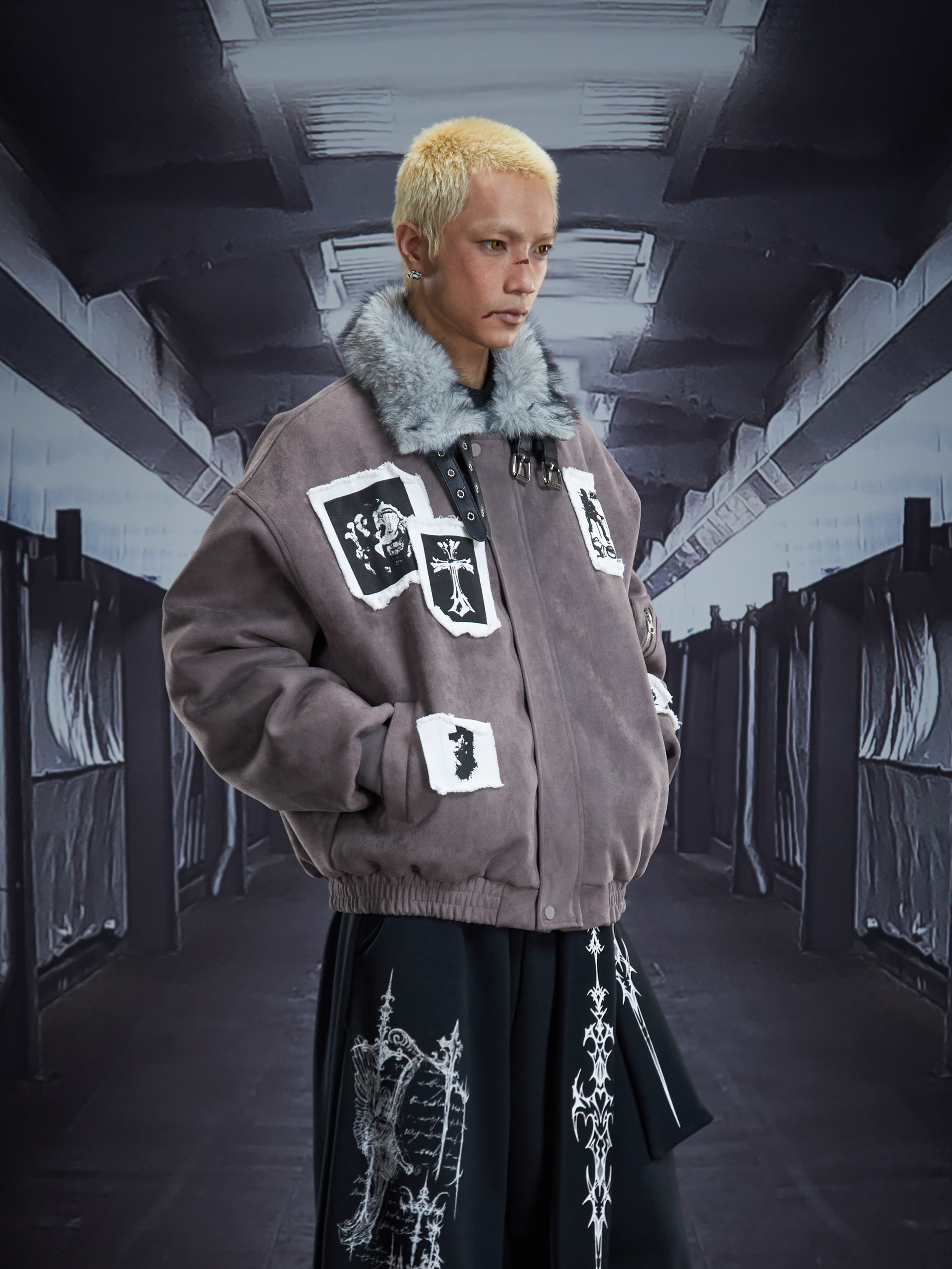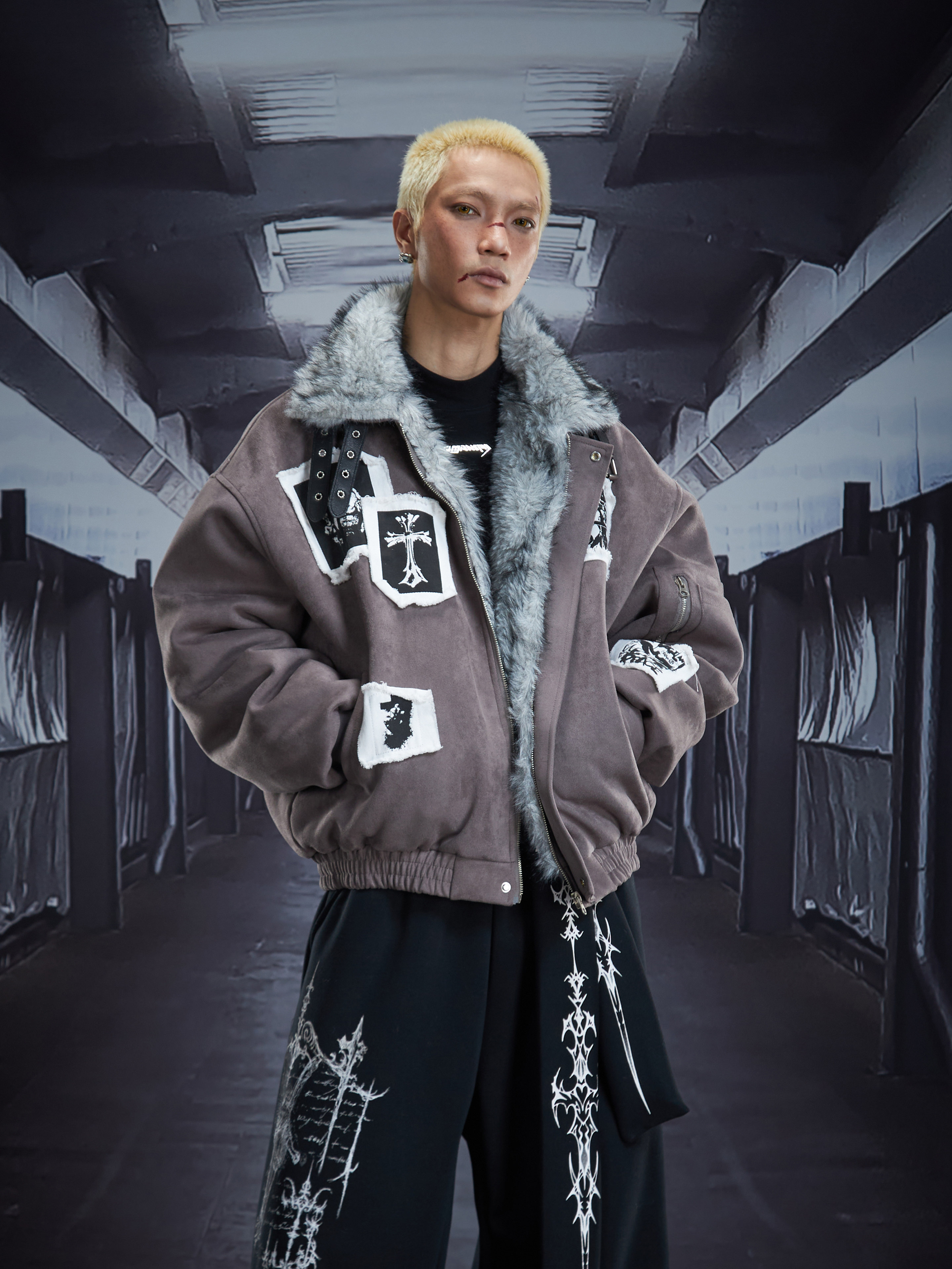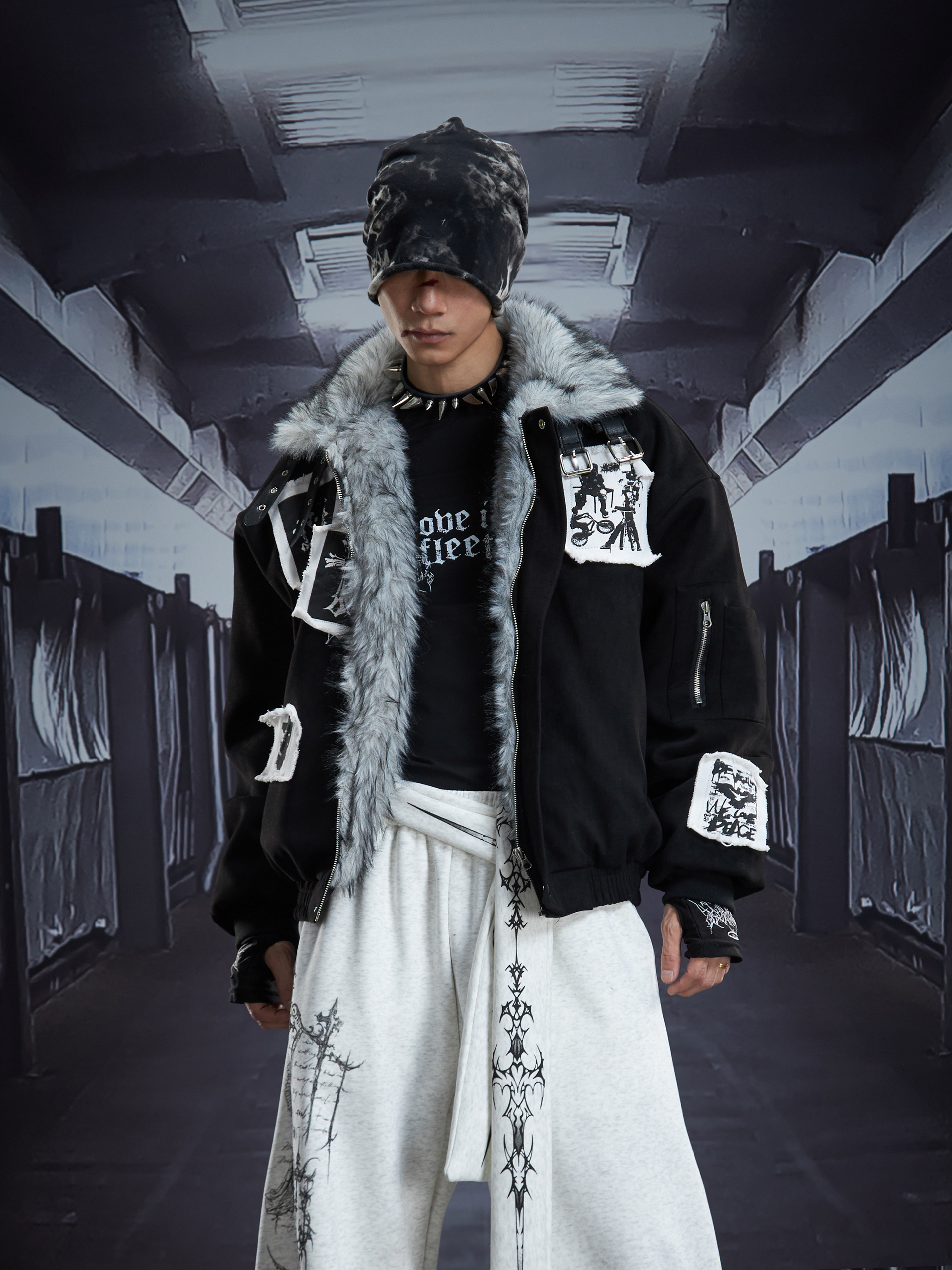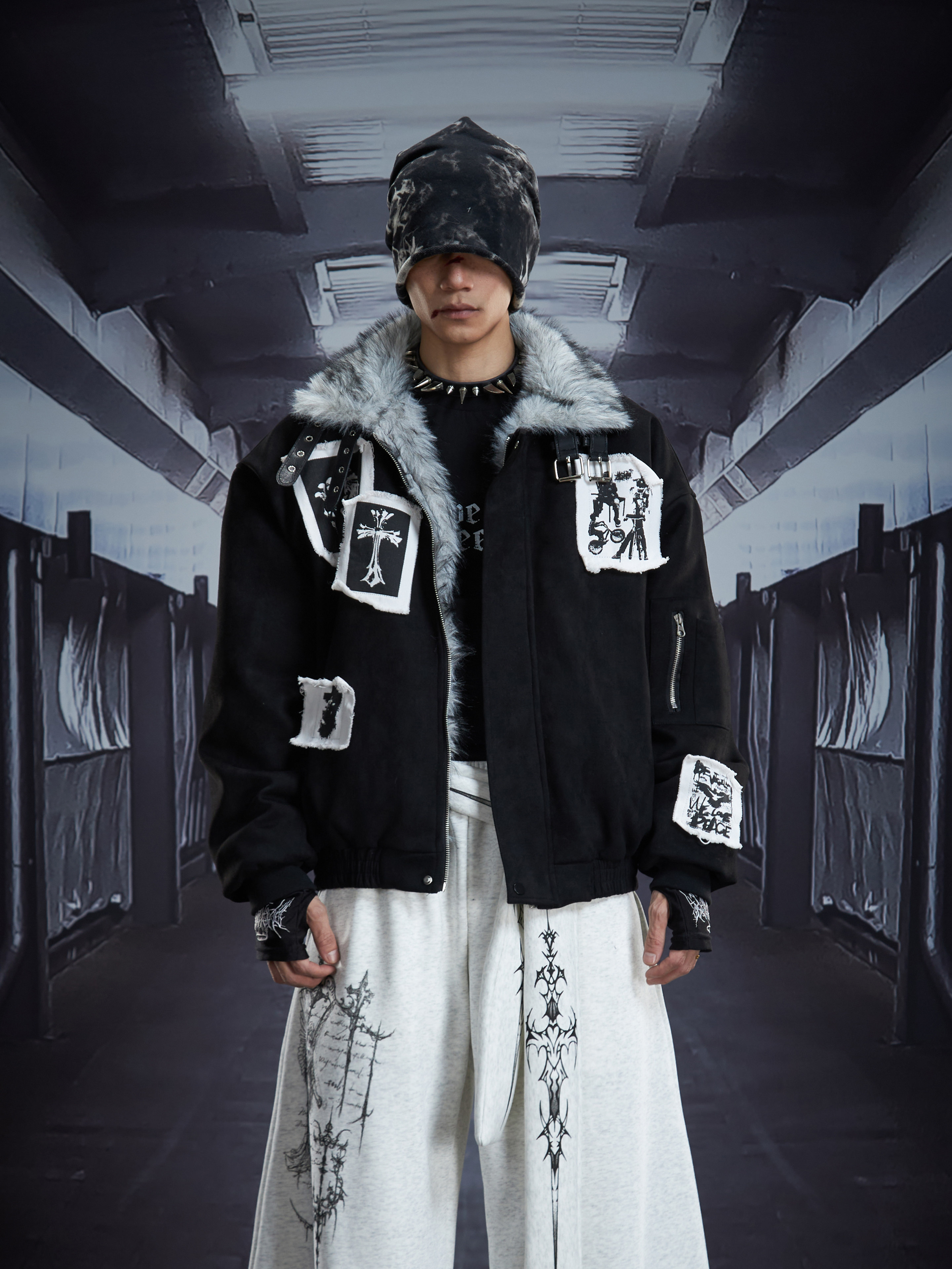 Eagle Patch Fake Fur Collar Stand Neck Padded Jacket WN22868