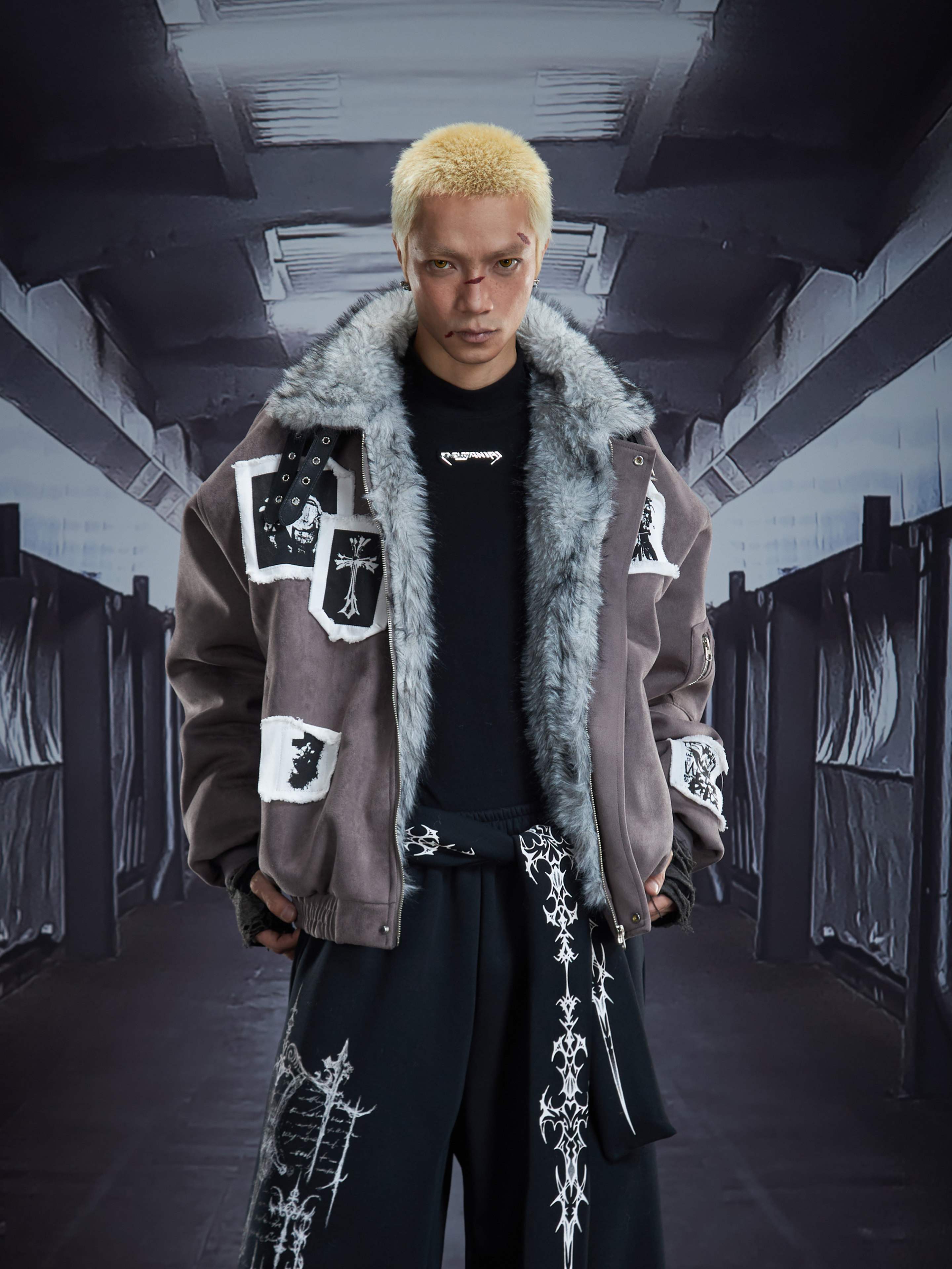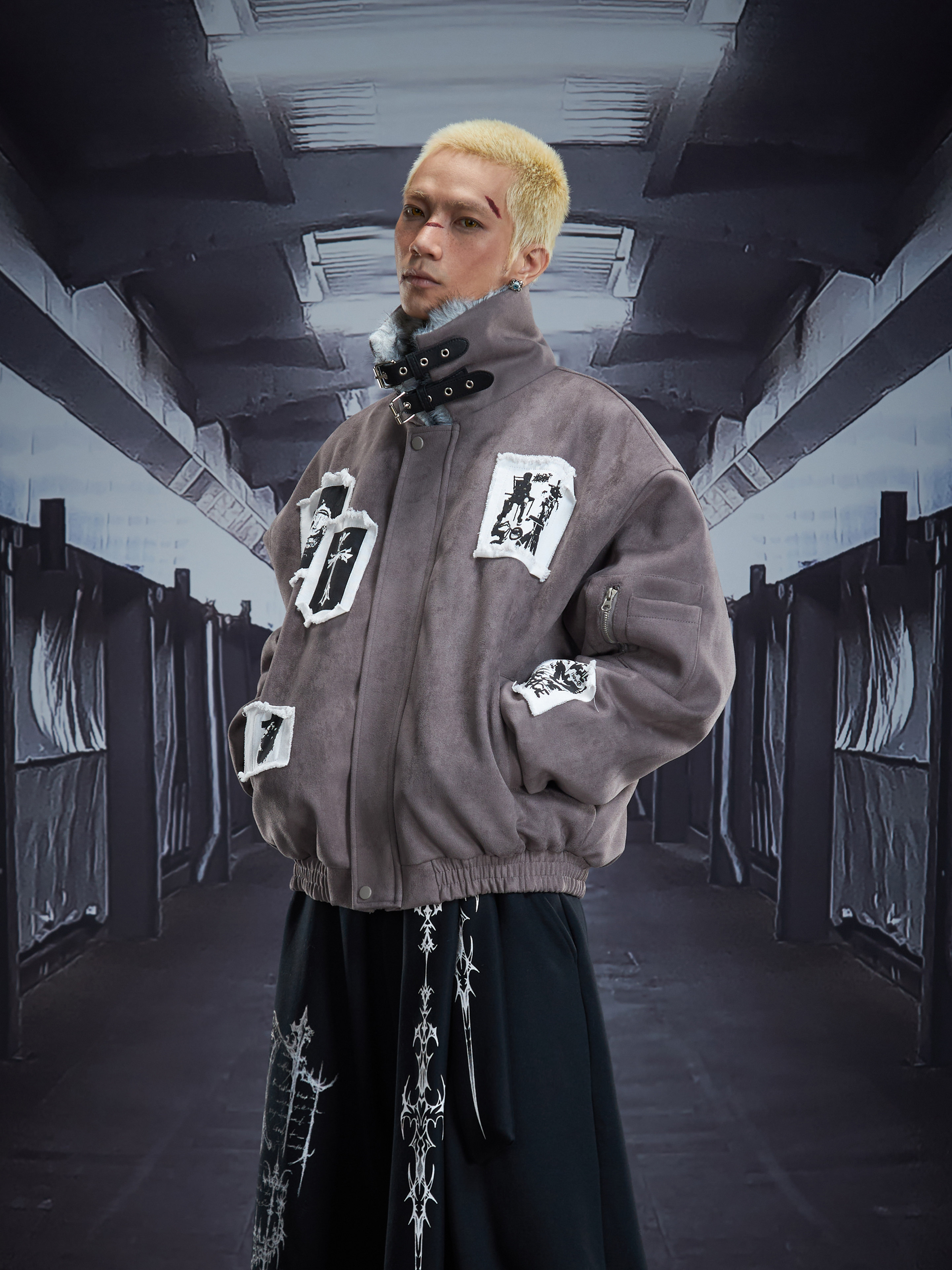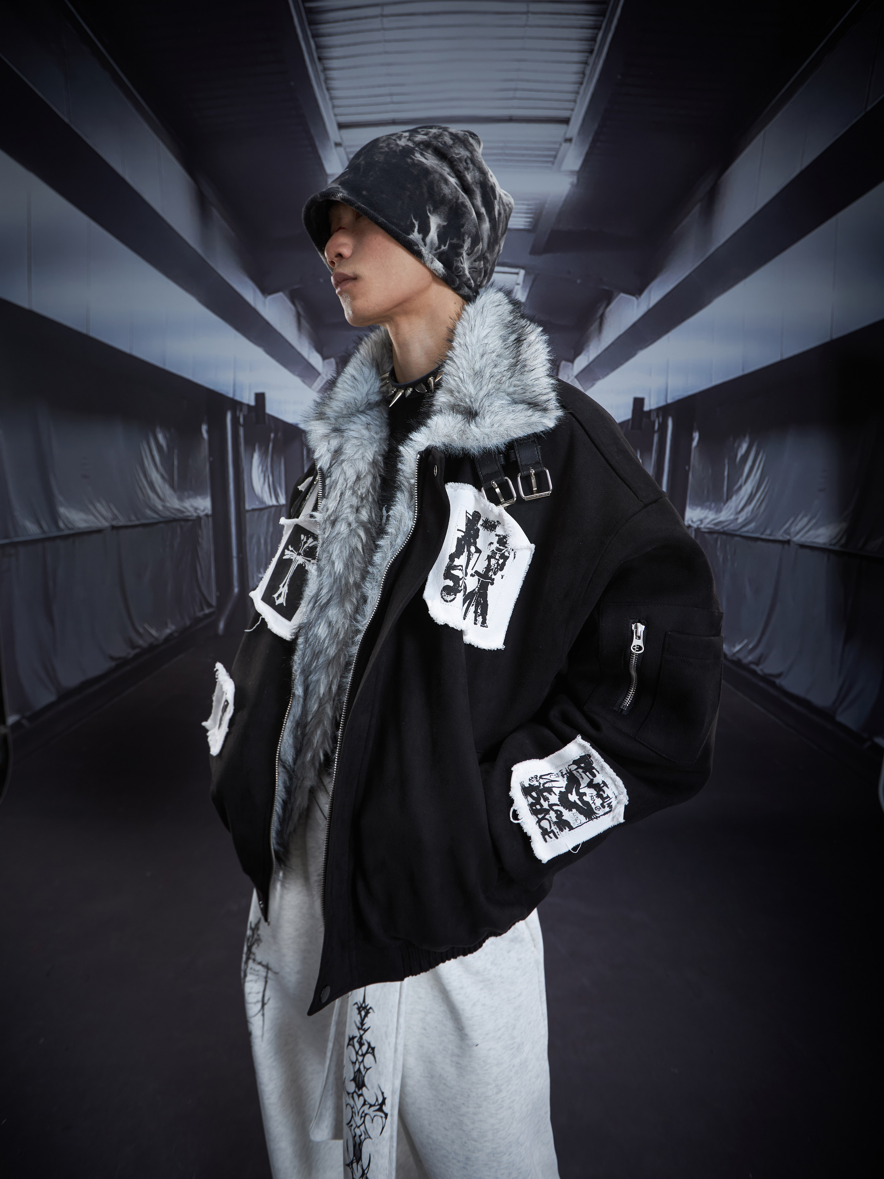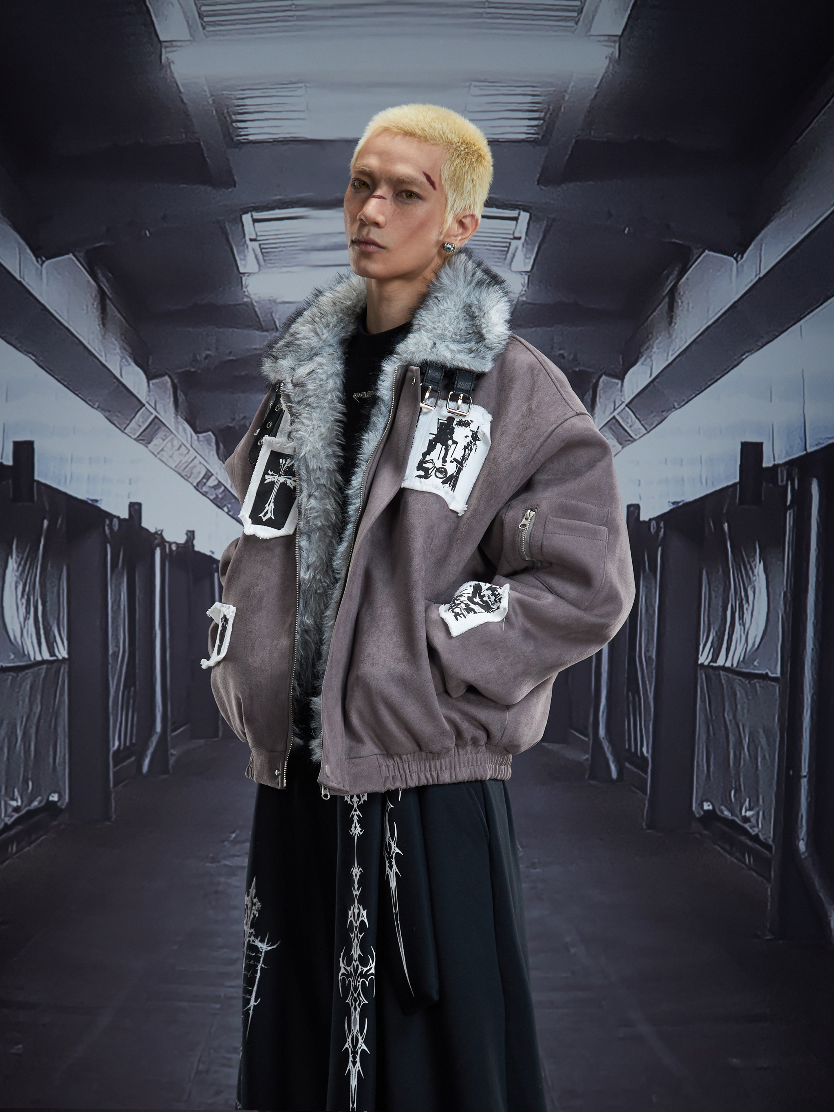 Eagle Patch Fake Fur Collar Stand Neck Padded Jacket WN22868