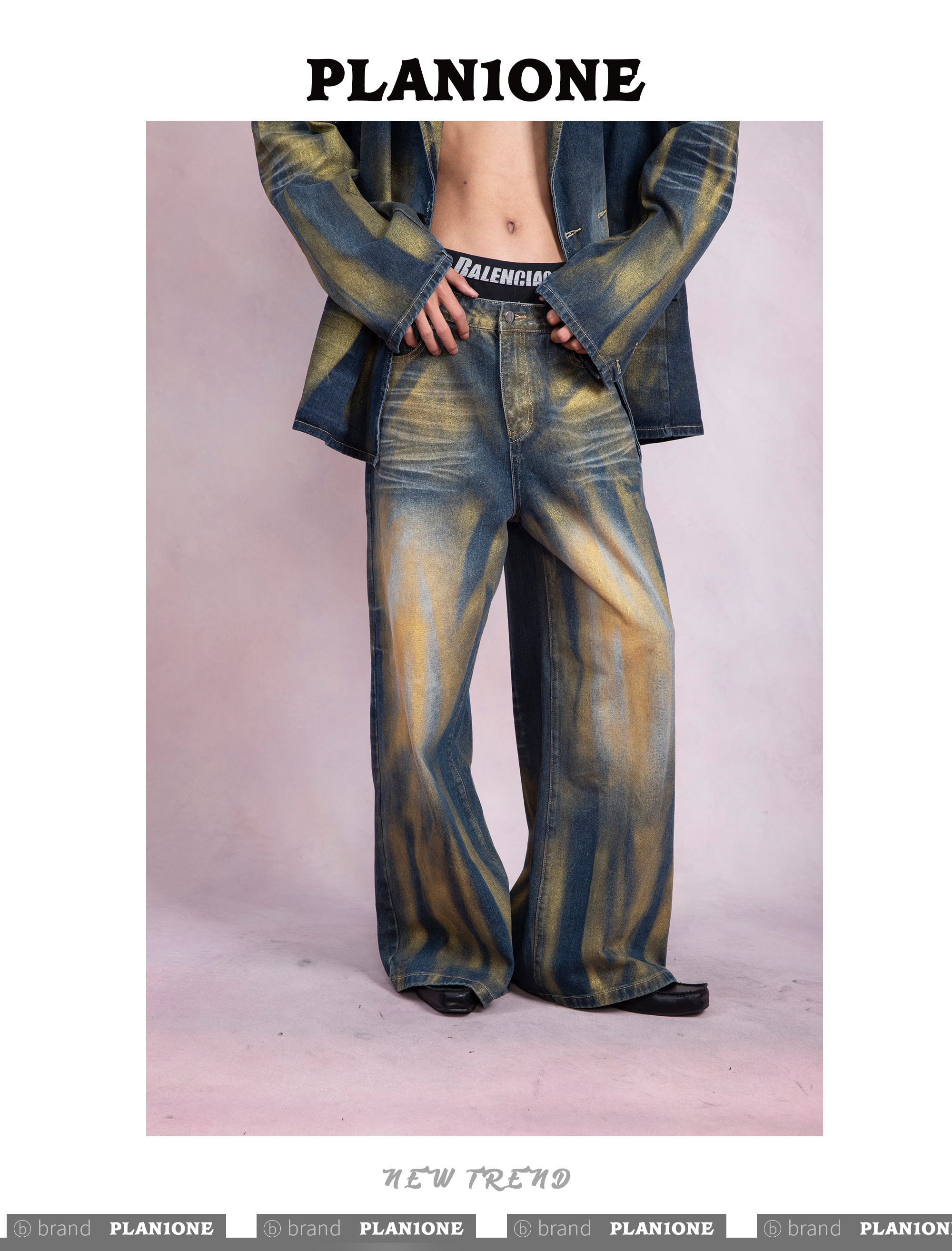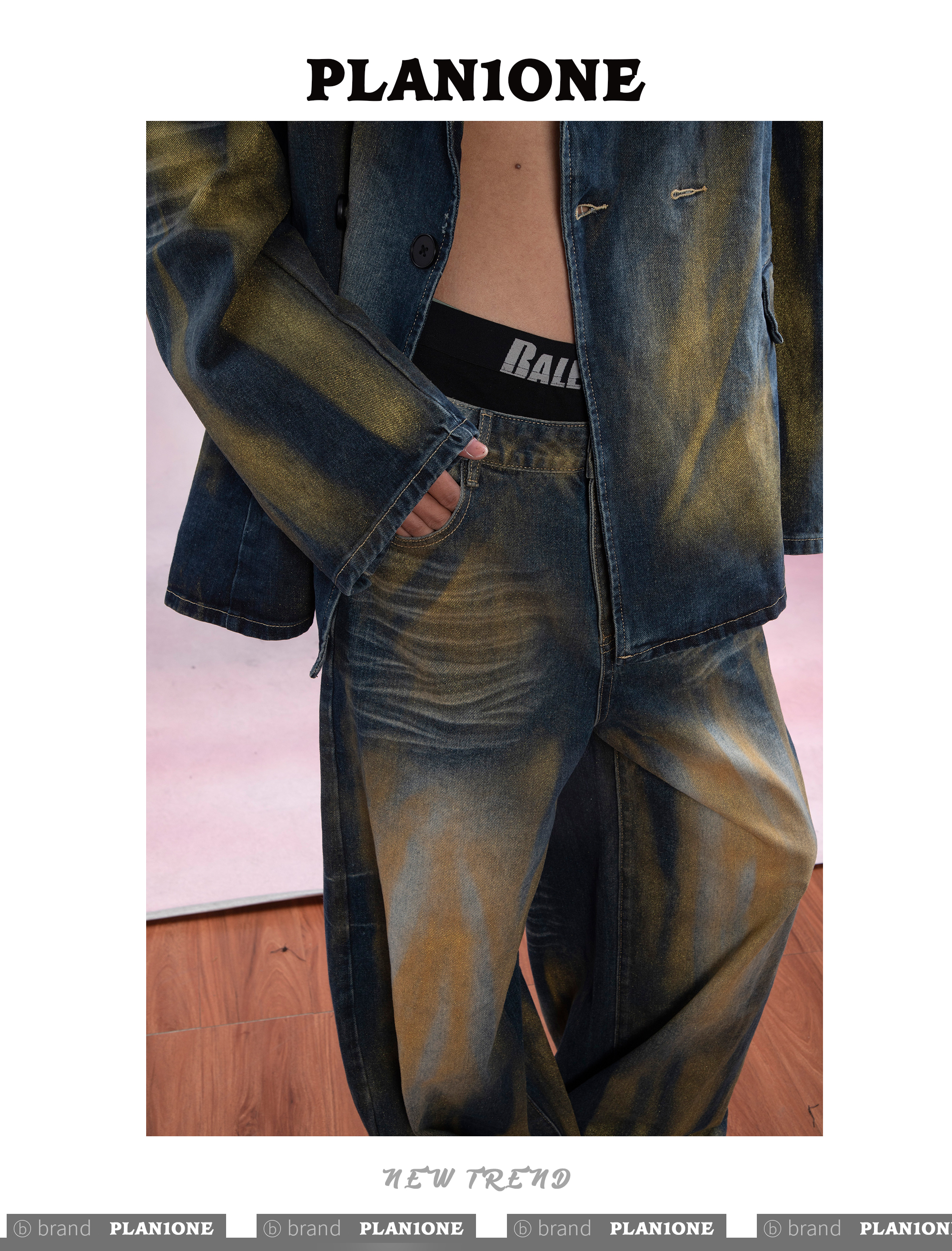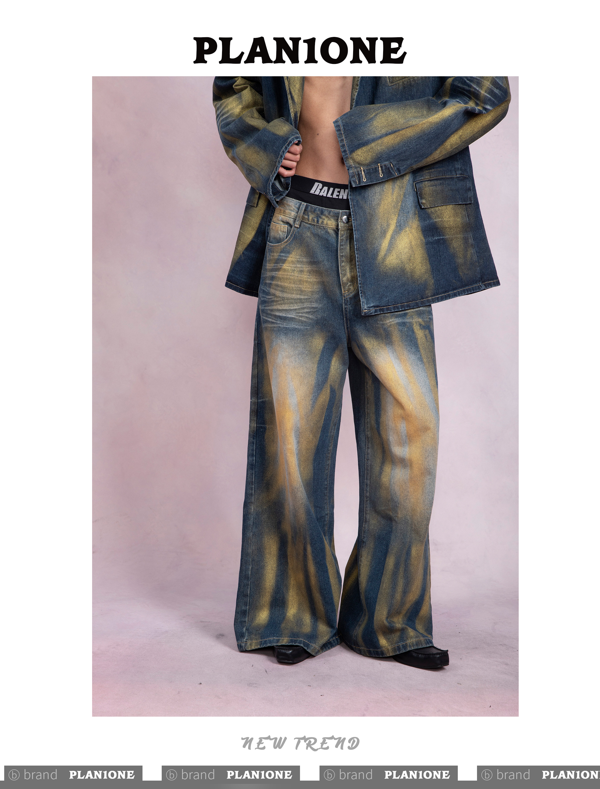 Washed Gradient Wrinkled Denim Tailored Jacket & Wide Leg Denim Jeans Setup WN9243