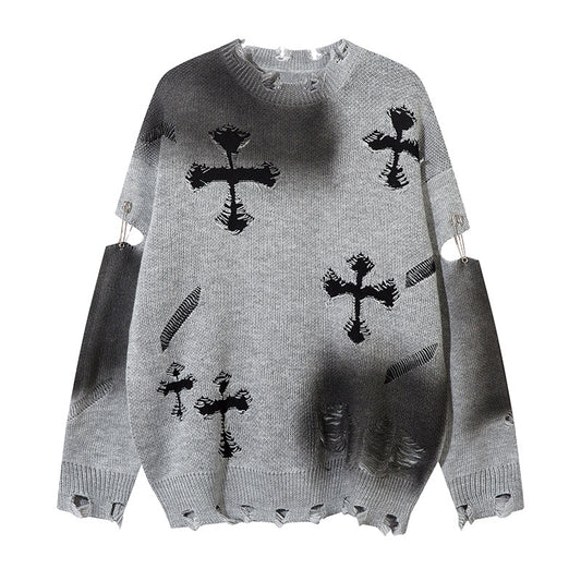 Pin Detail Cat Pattern Damage Knit Sweater WN11248