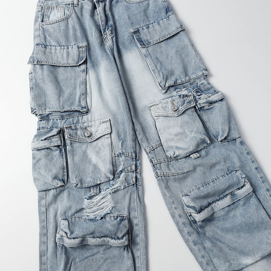 Multi-Pocket Washed Wide-Leg Cargo Denim Jeans WN11280