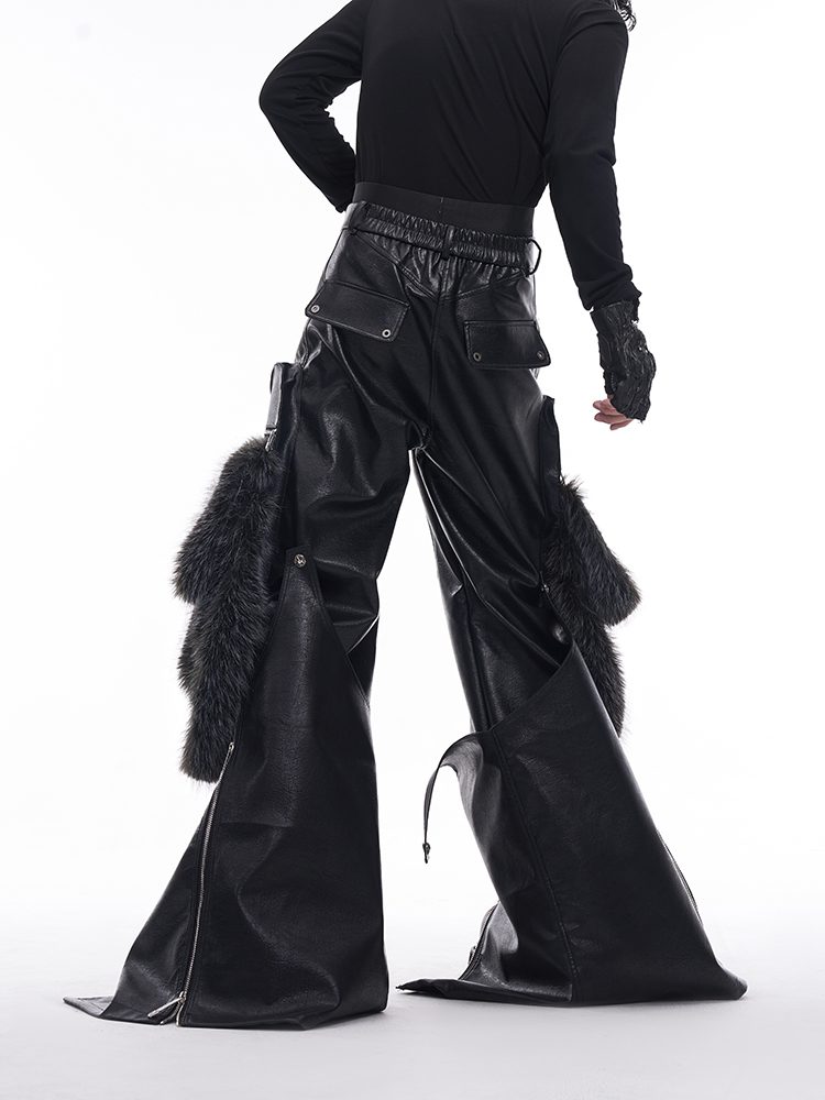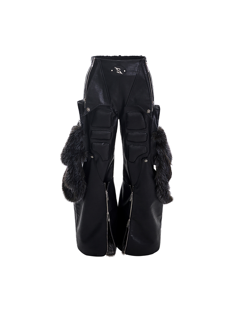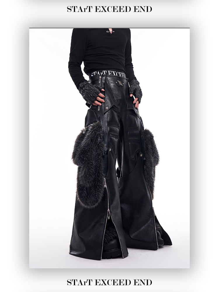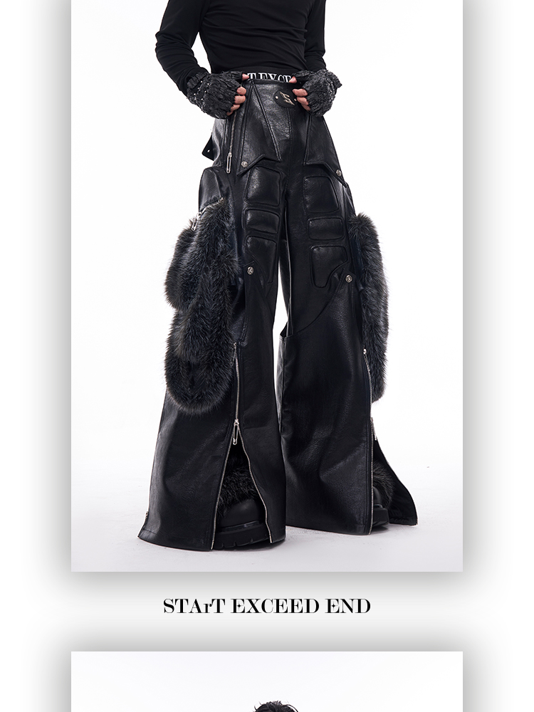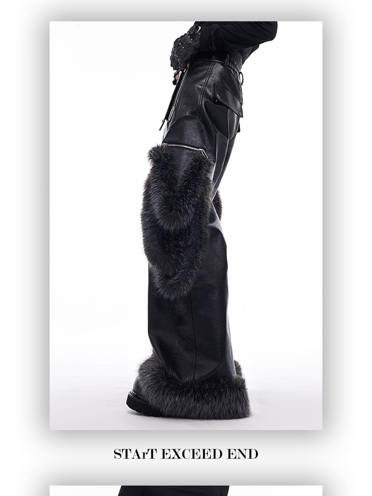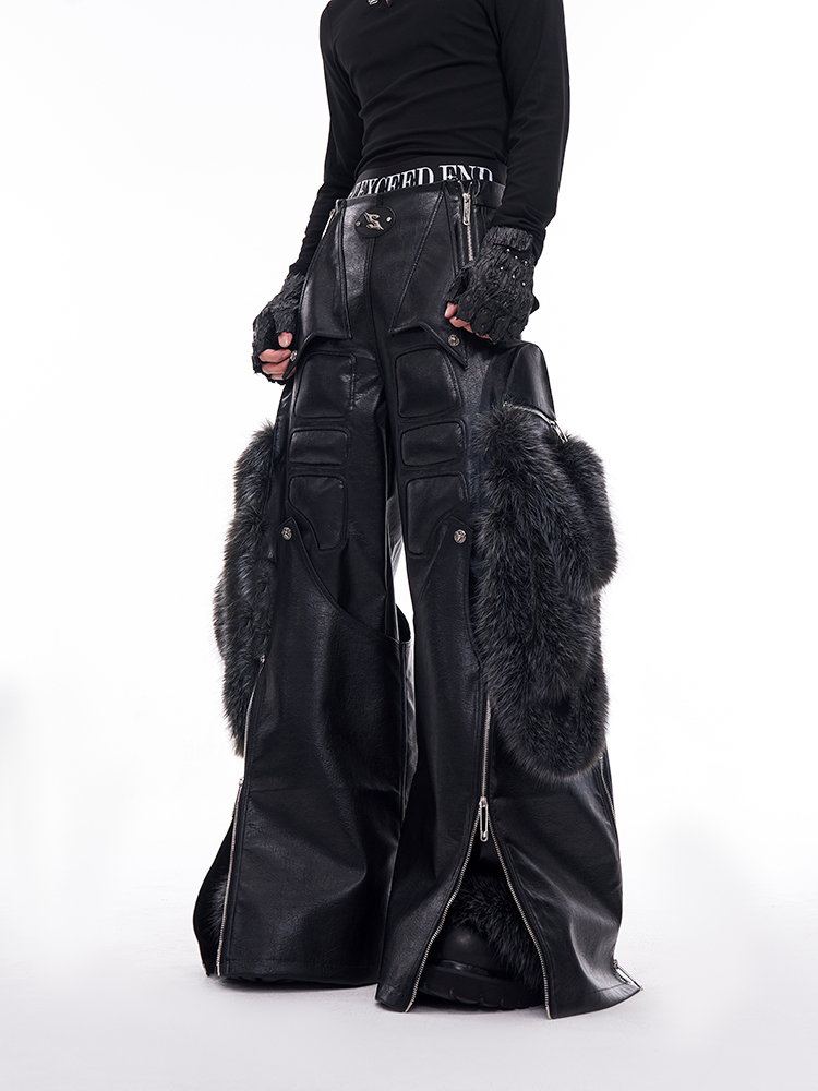 Fake Fur Patchwork PU Leather Wide-Leg Pants WN11681