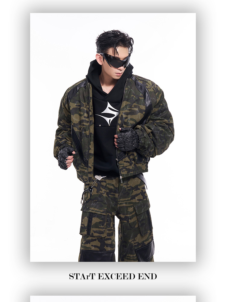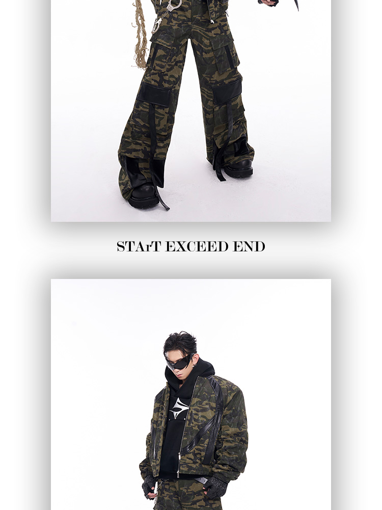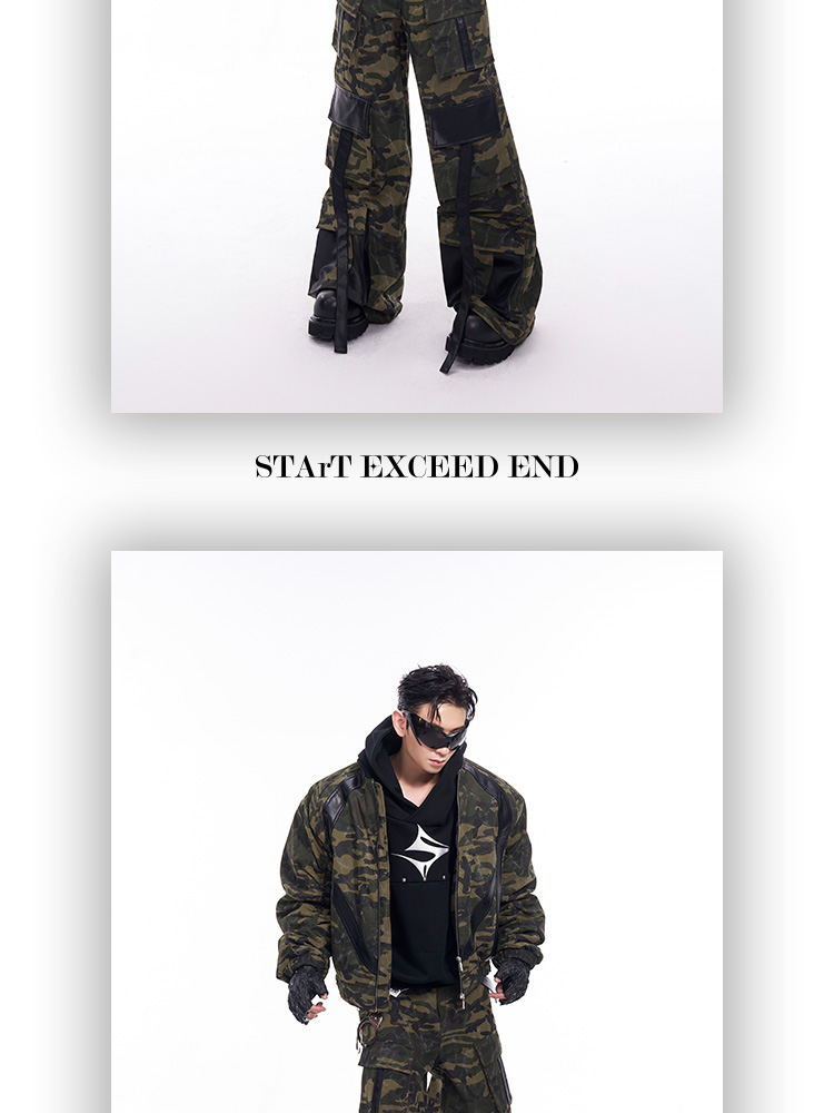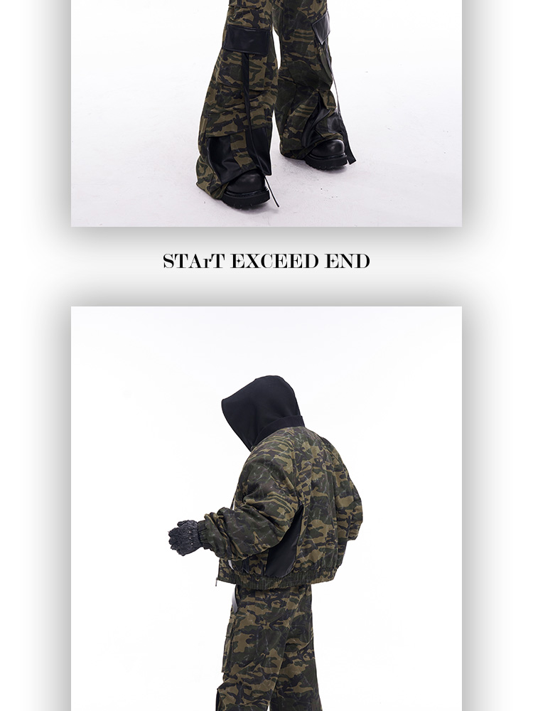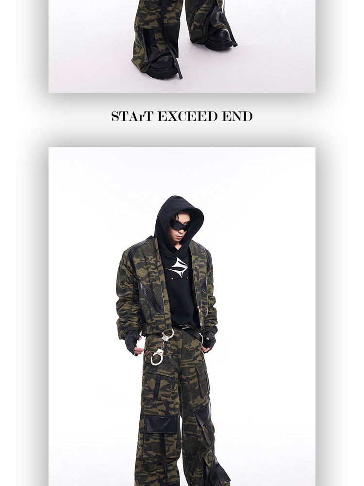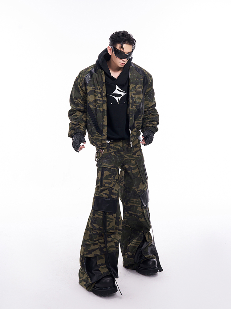 Camouflage Patchwork Leather Jacket & Cargo Pants Setup WN11726