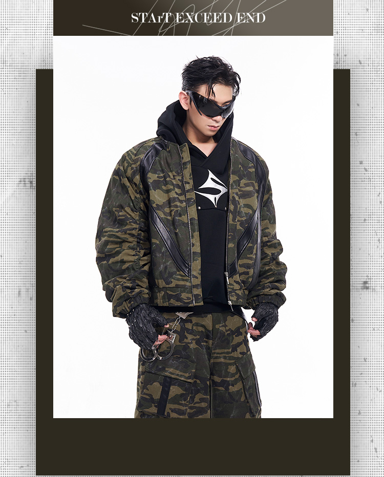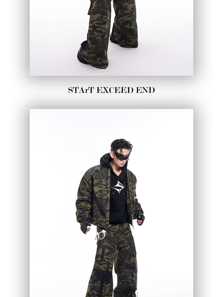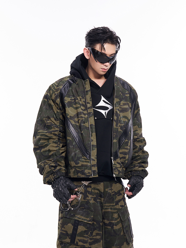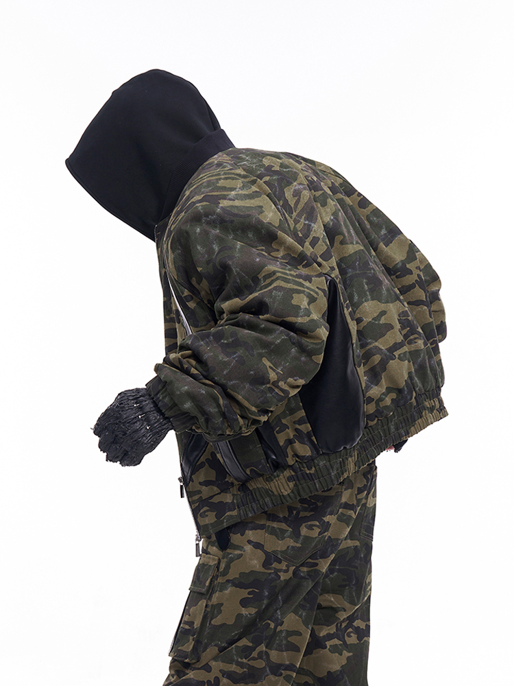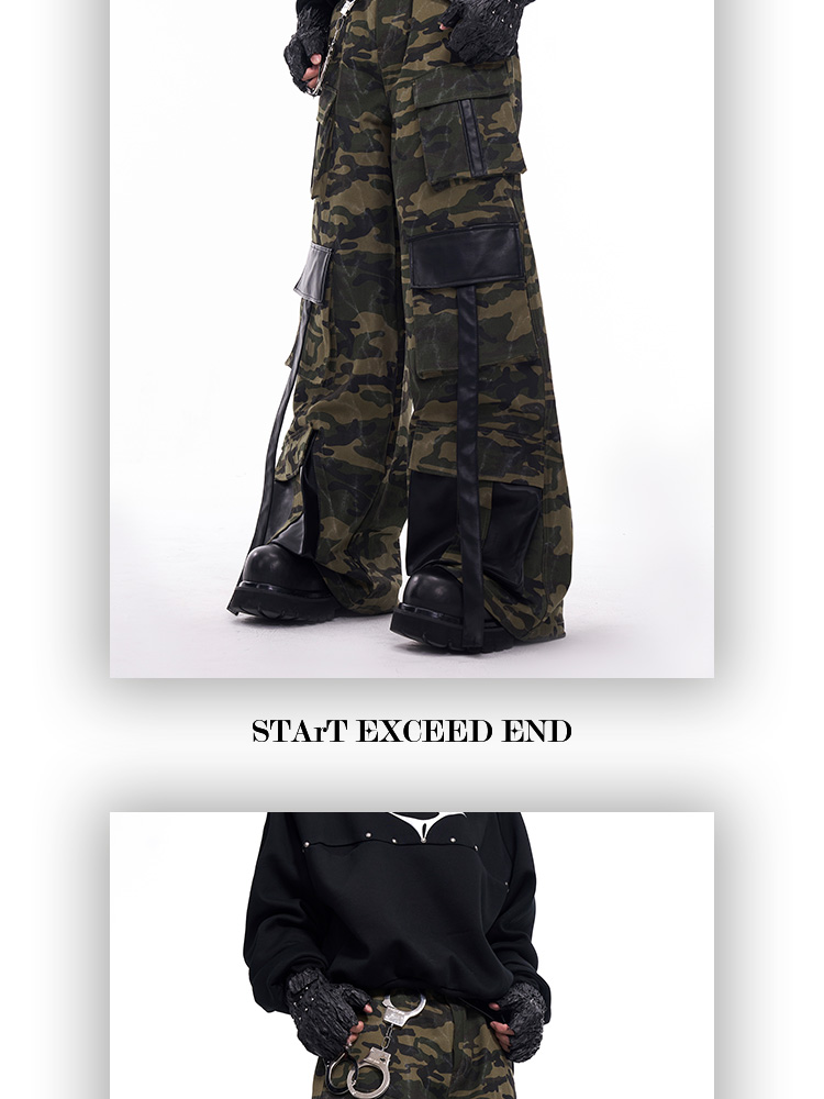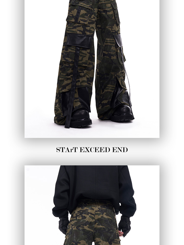 Camouflage Patchwork Leather Jacket & Cargo Pants Setup WN11726