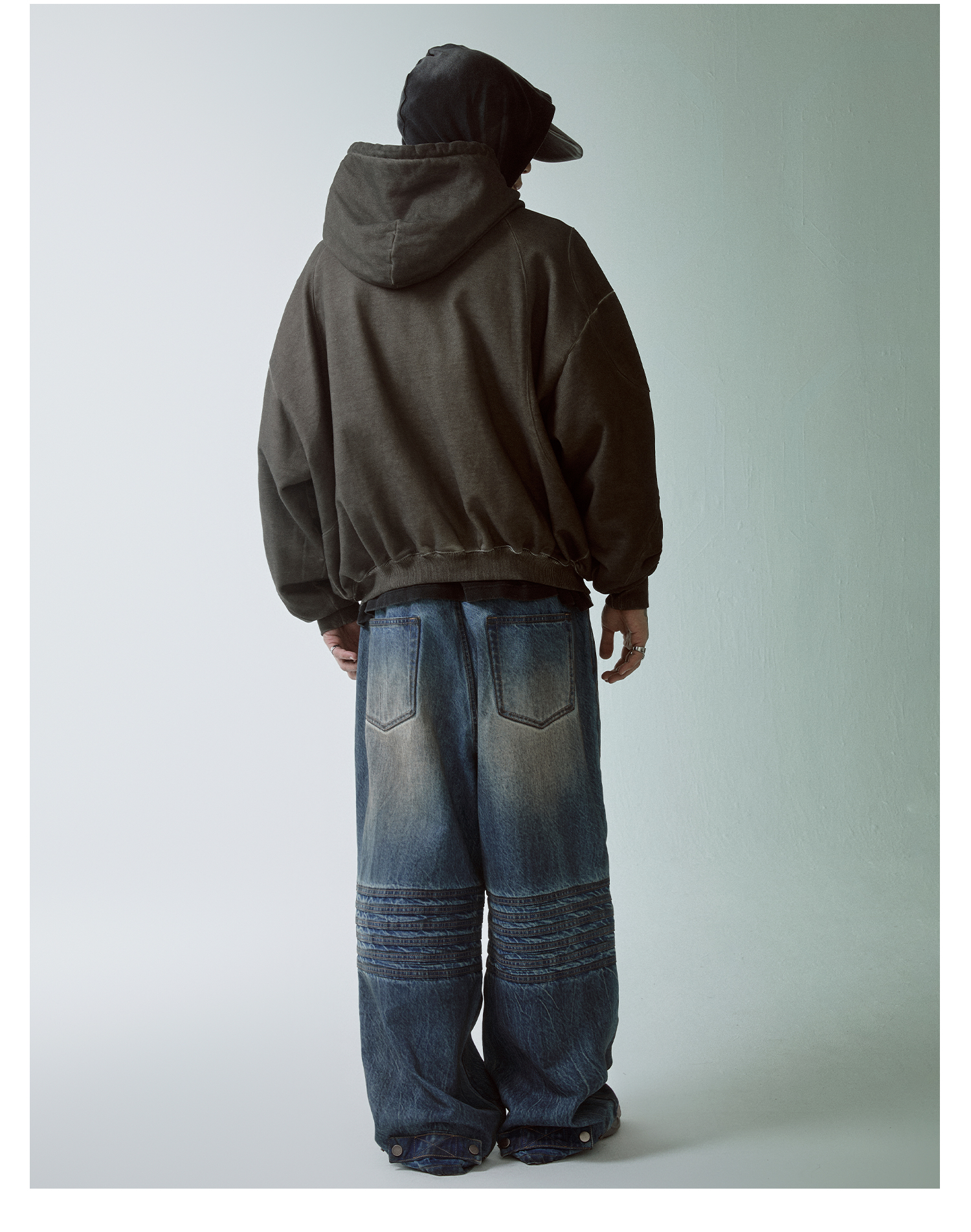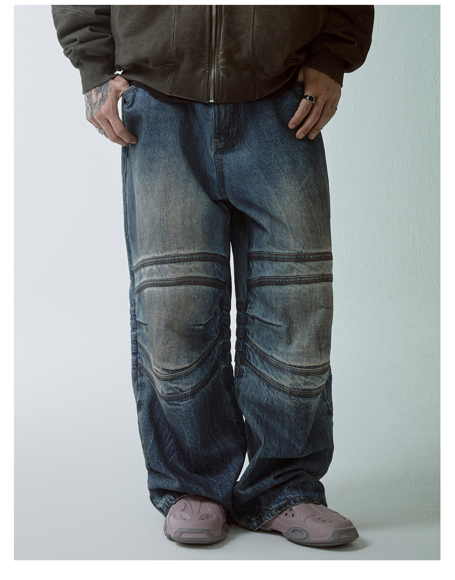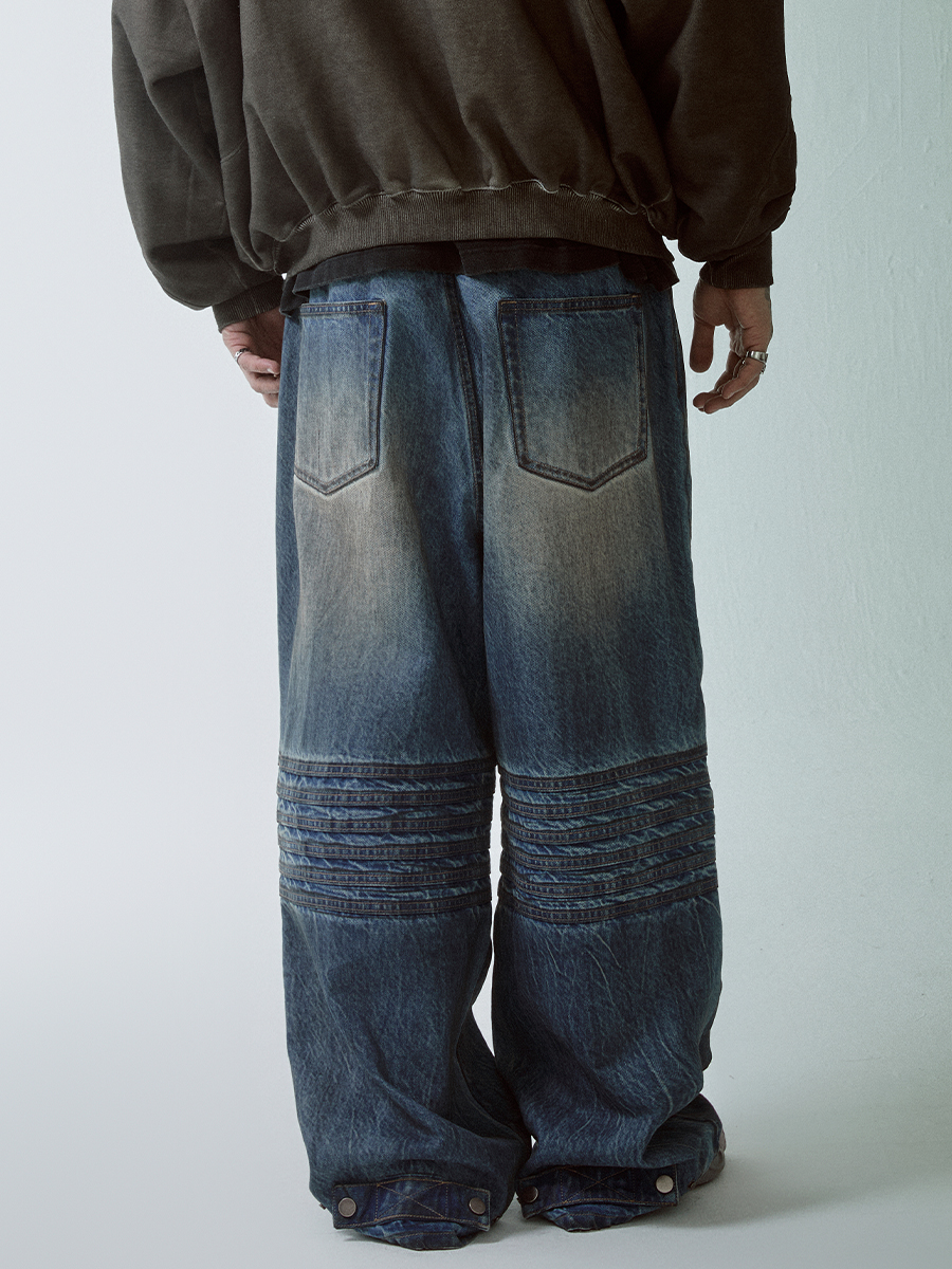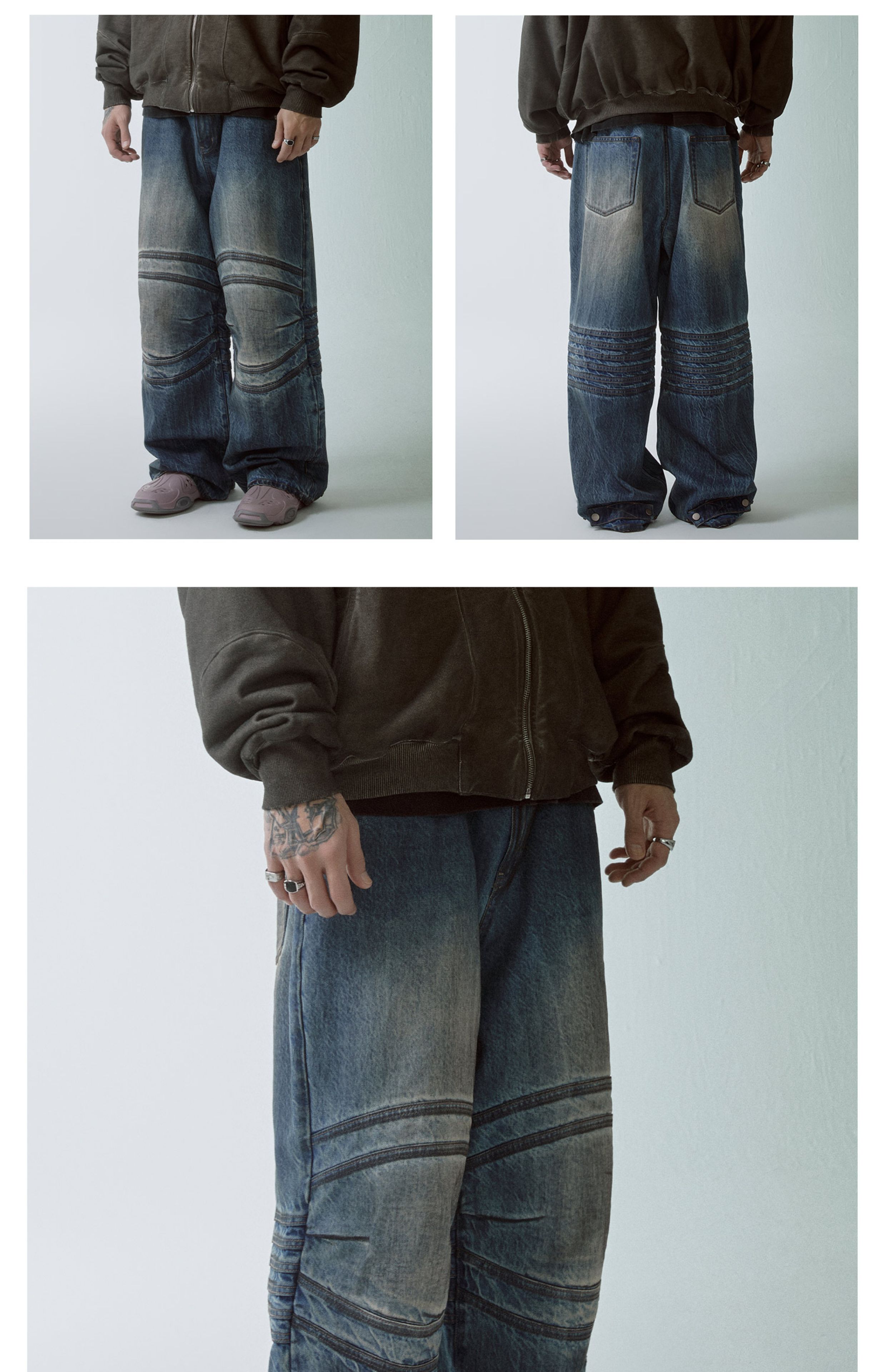 Heavyweight Washed Skeleton-Ruched Wide-Leg Denim Jeans WN12176