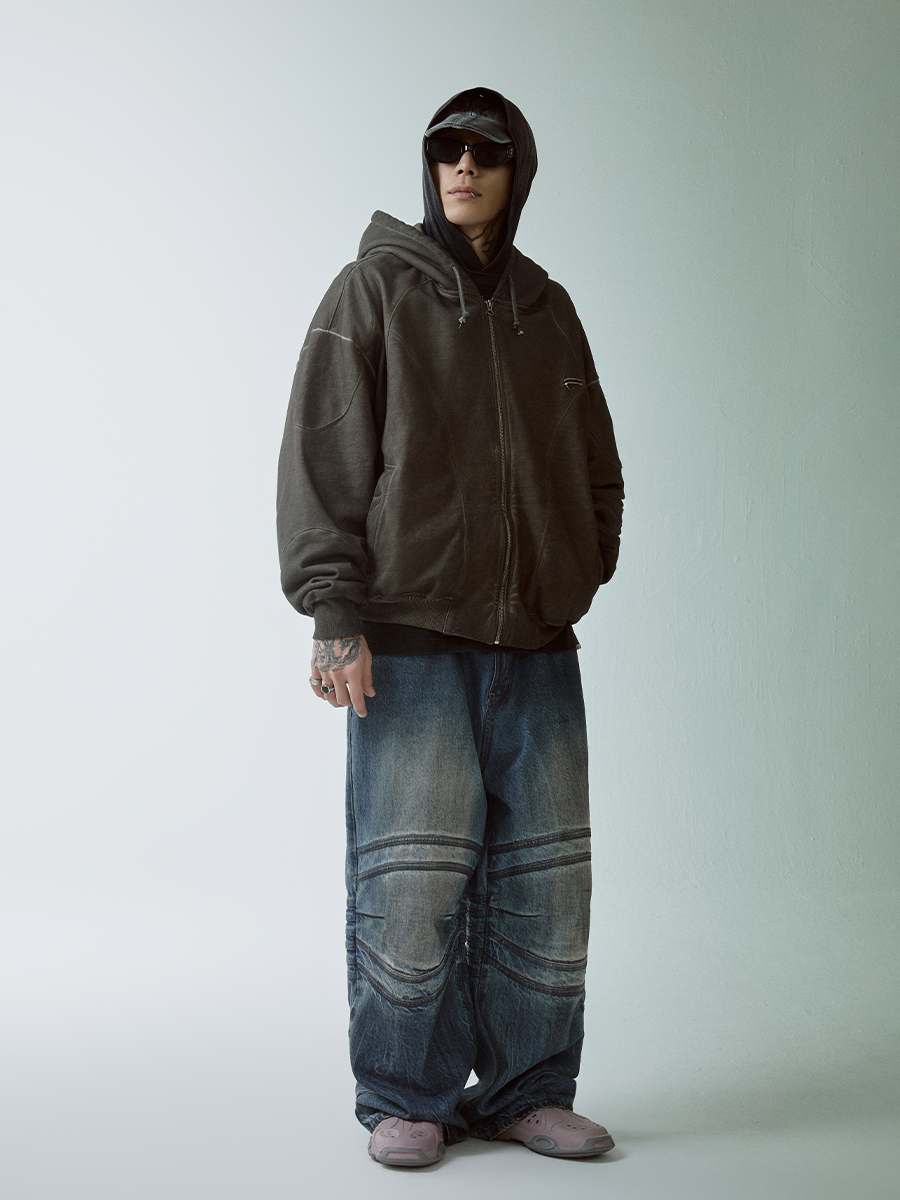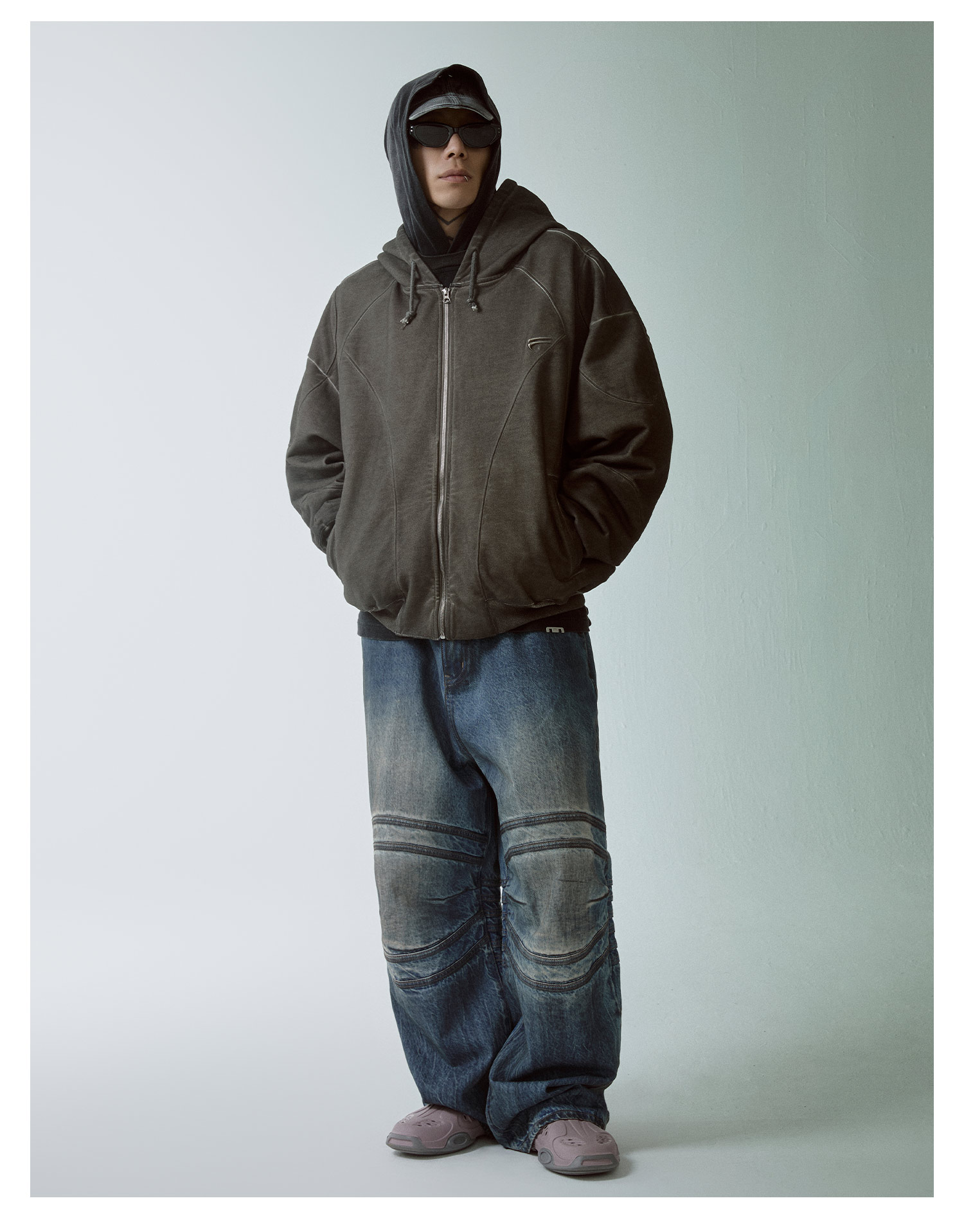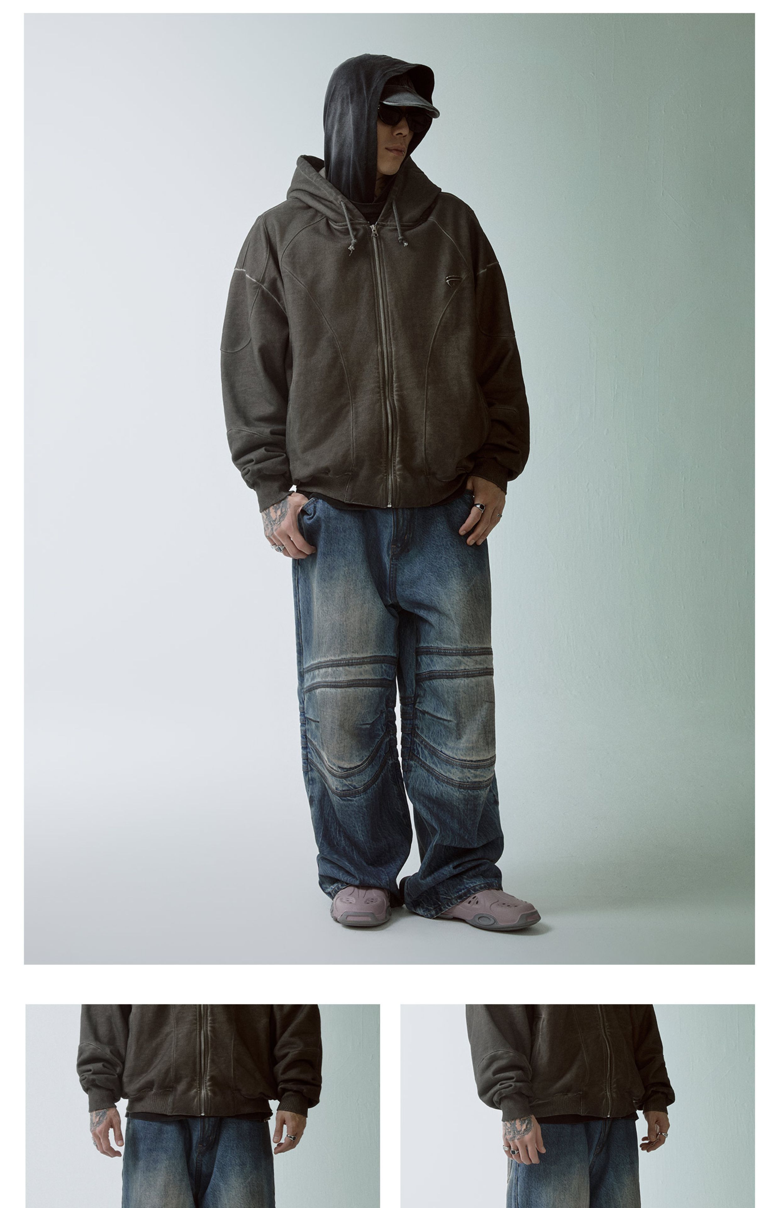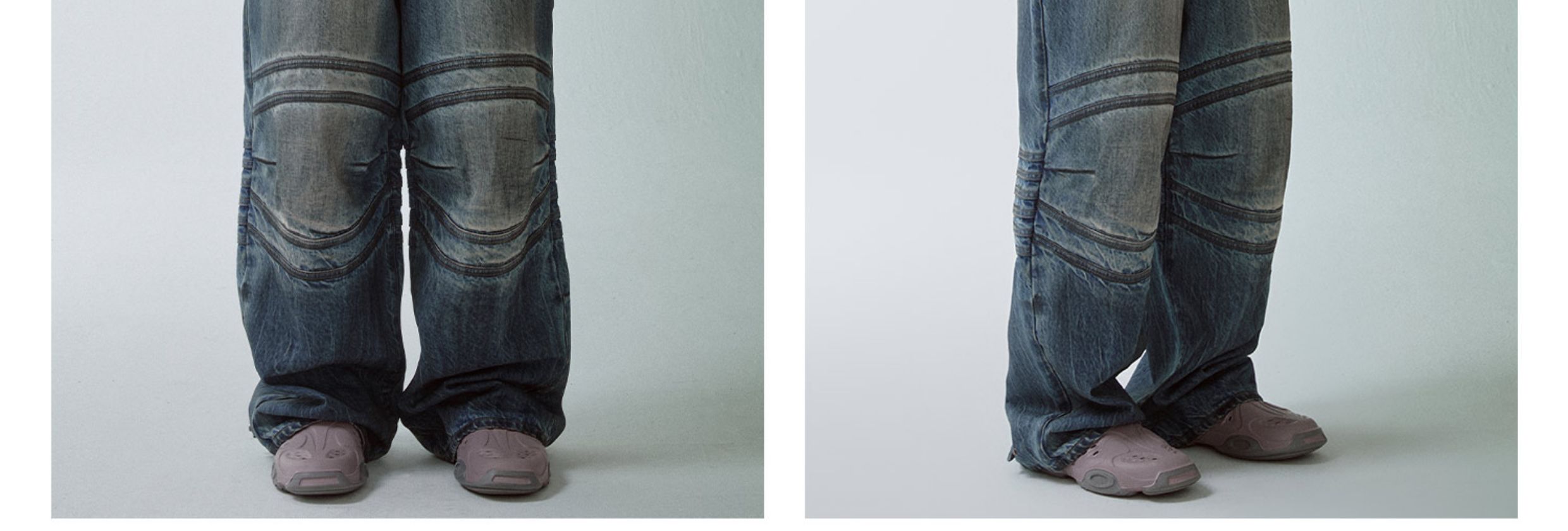 Heavyweight Washed Skeleton-Ruched Wide-Leg Denim Jeans WN12176
