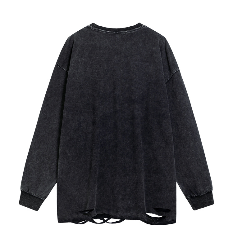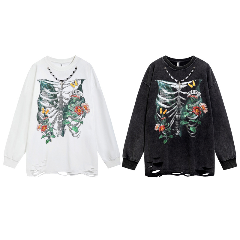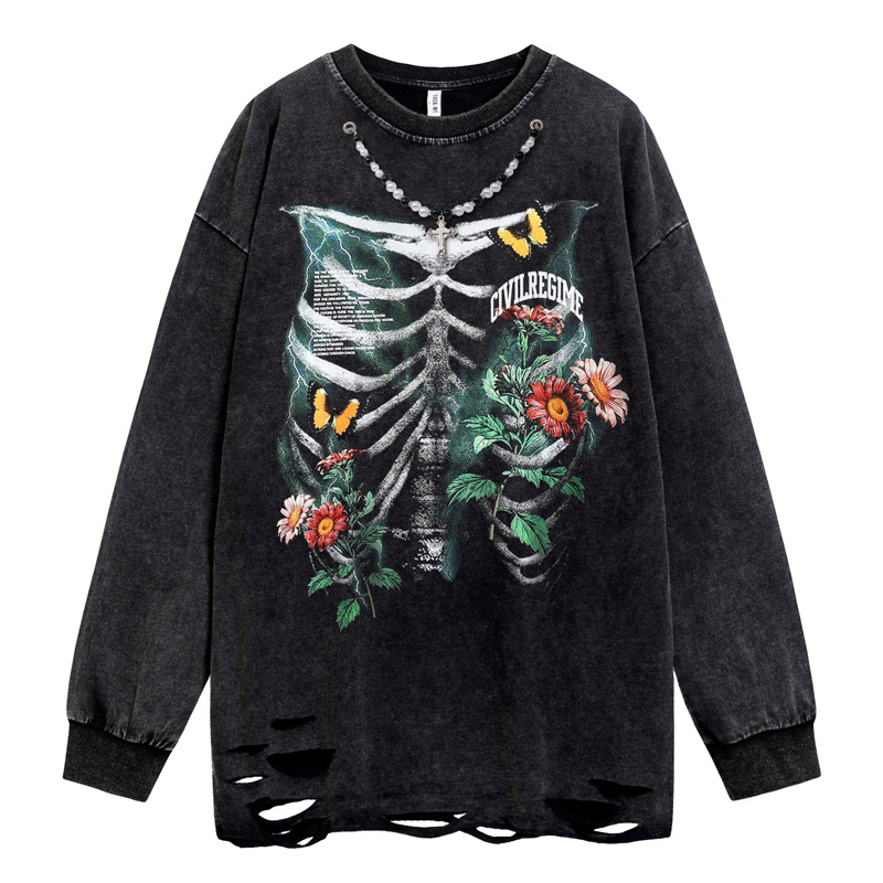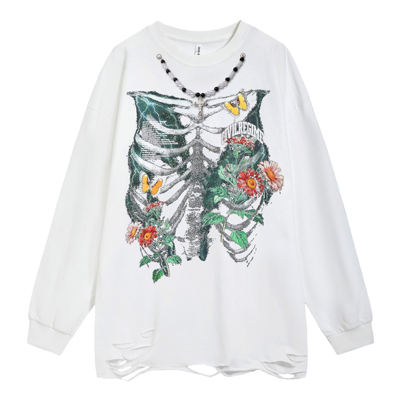 Flower Print Wash Damage Long Sleeve T-Shirt WN16488