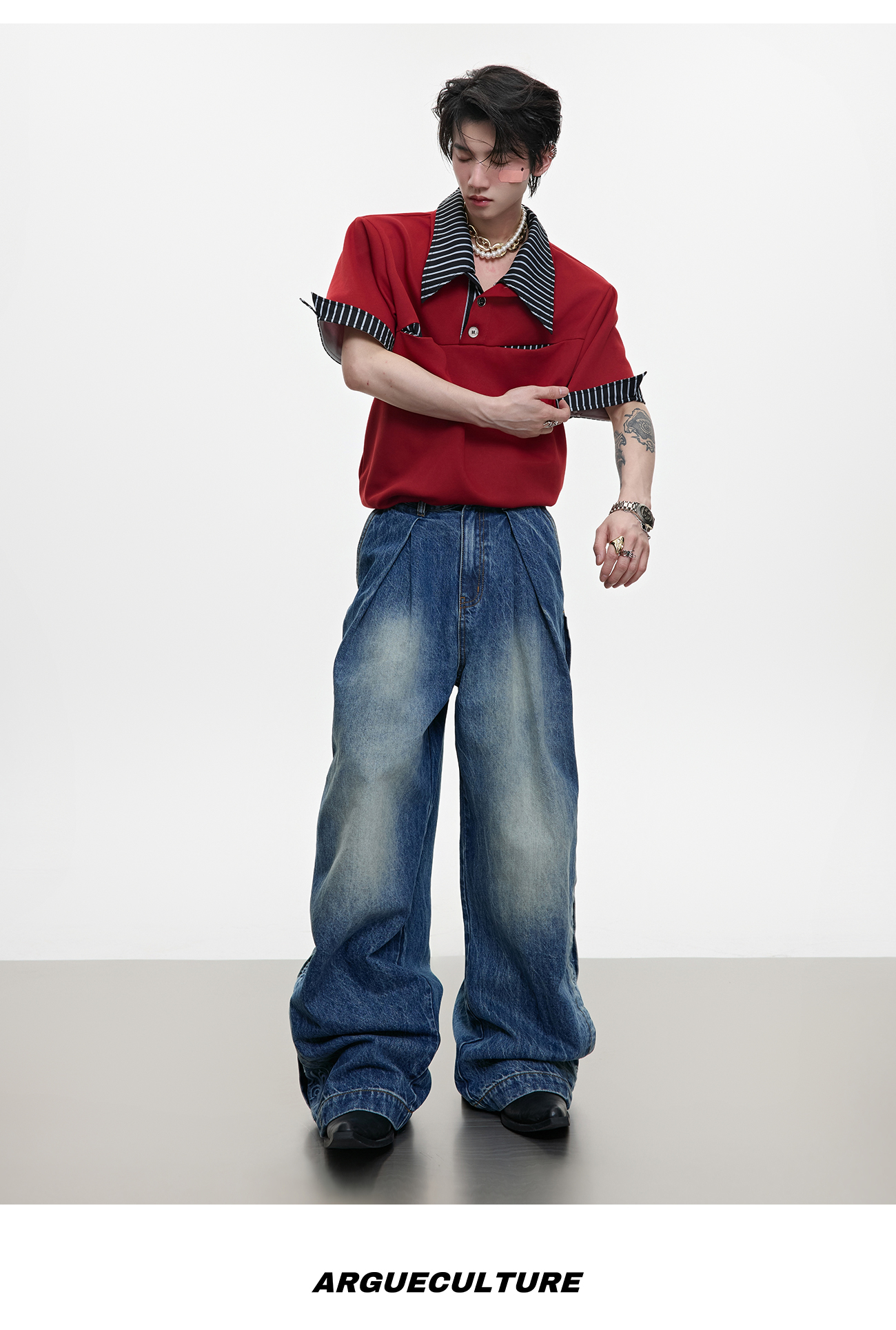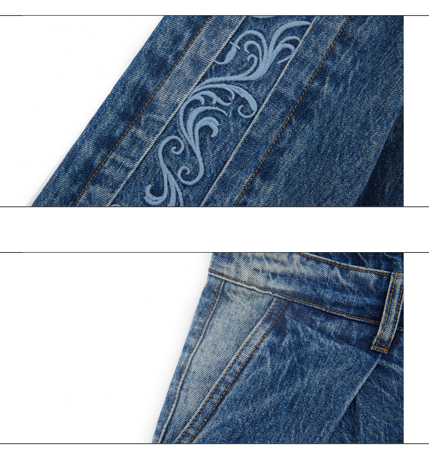 Washed Gradient Embroidery Pleats Straight Denim Jeans WN18363