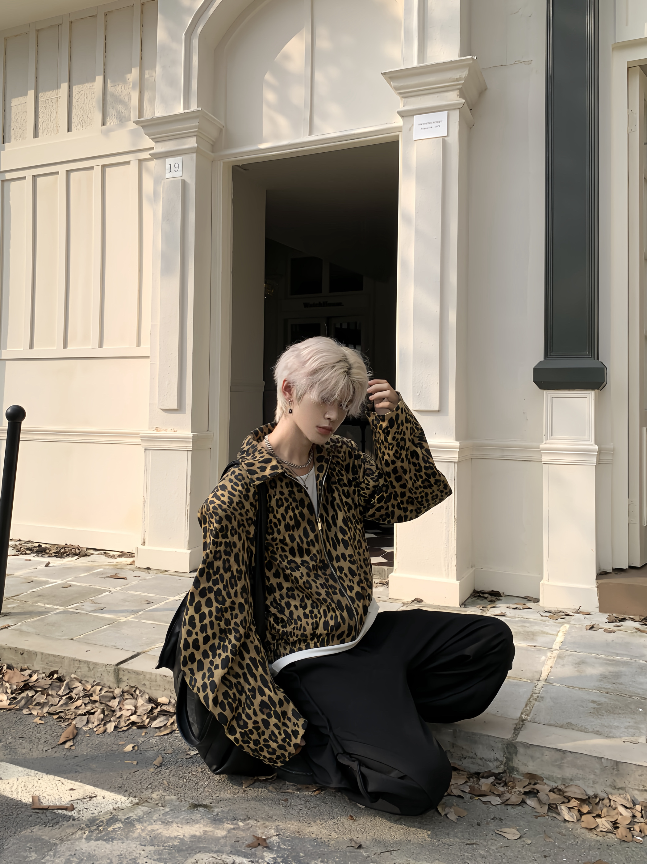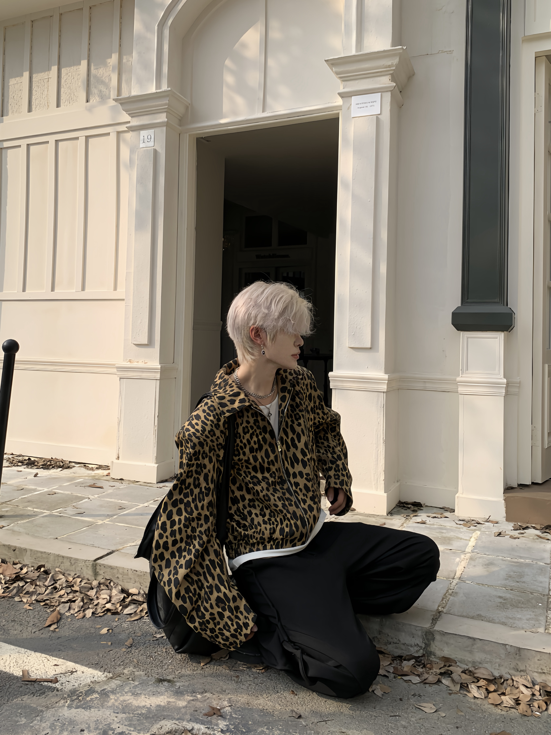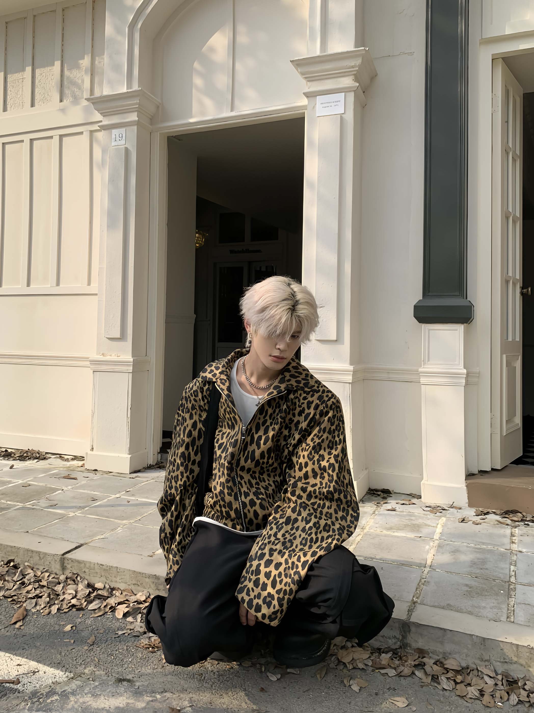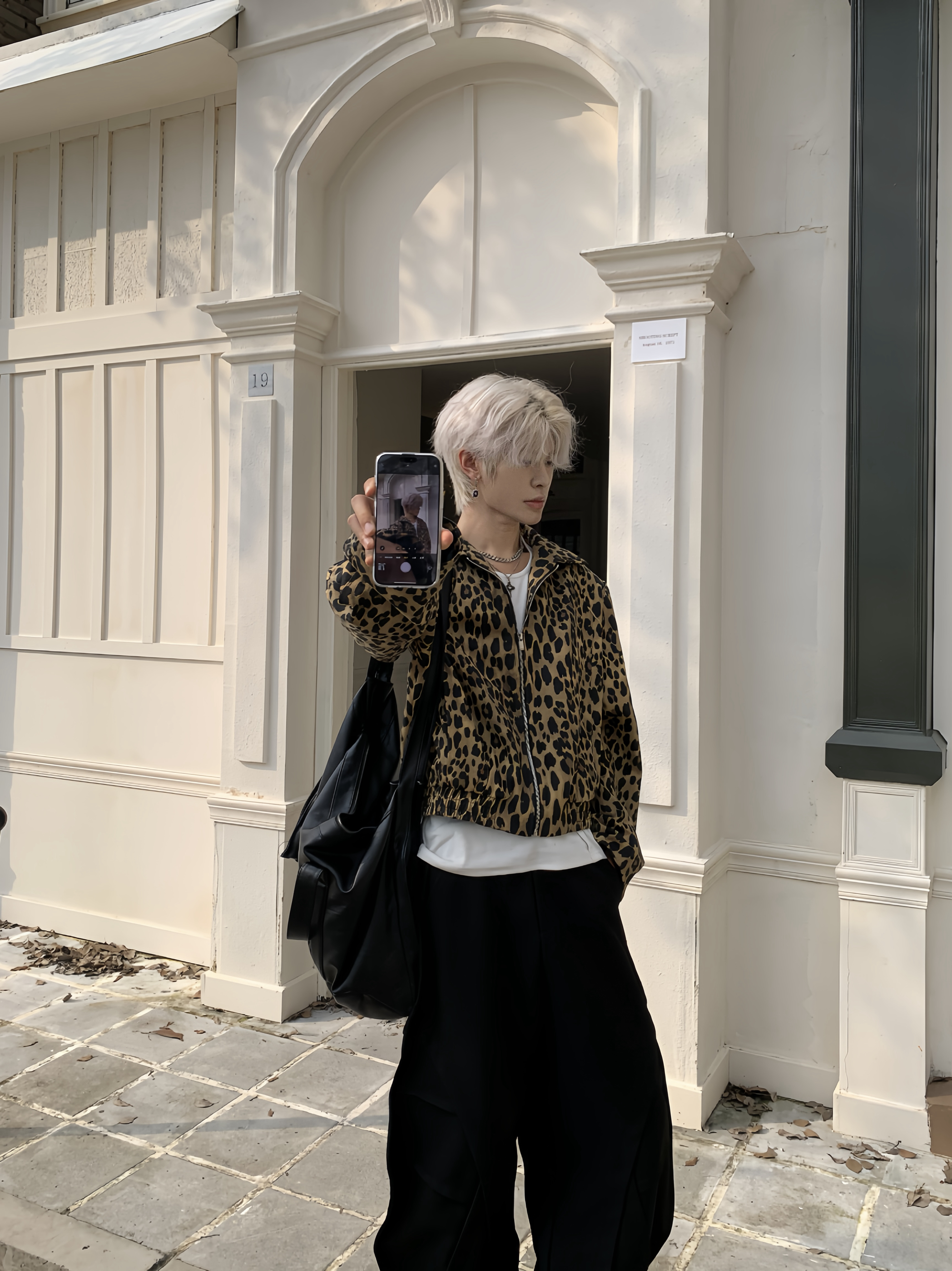 Leopard Print Curved Sleeve Short Zipper Jacket WN19916