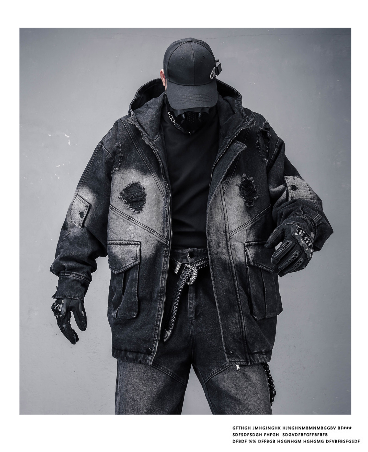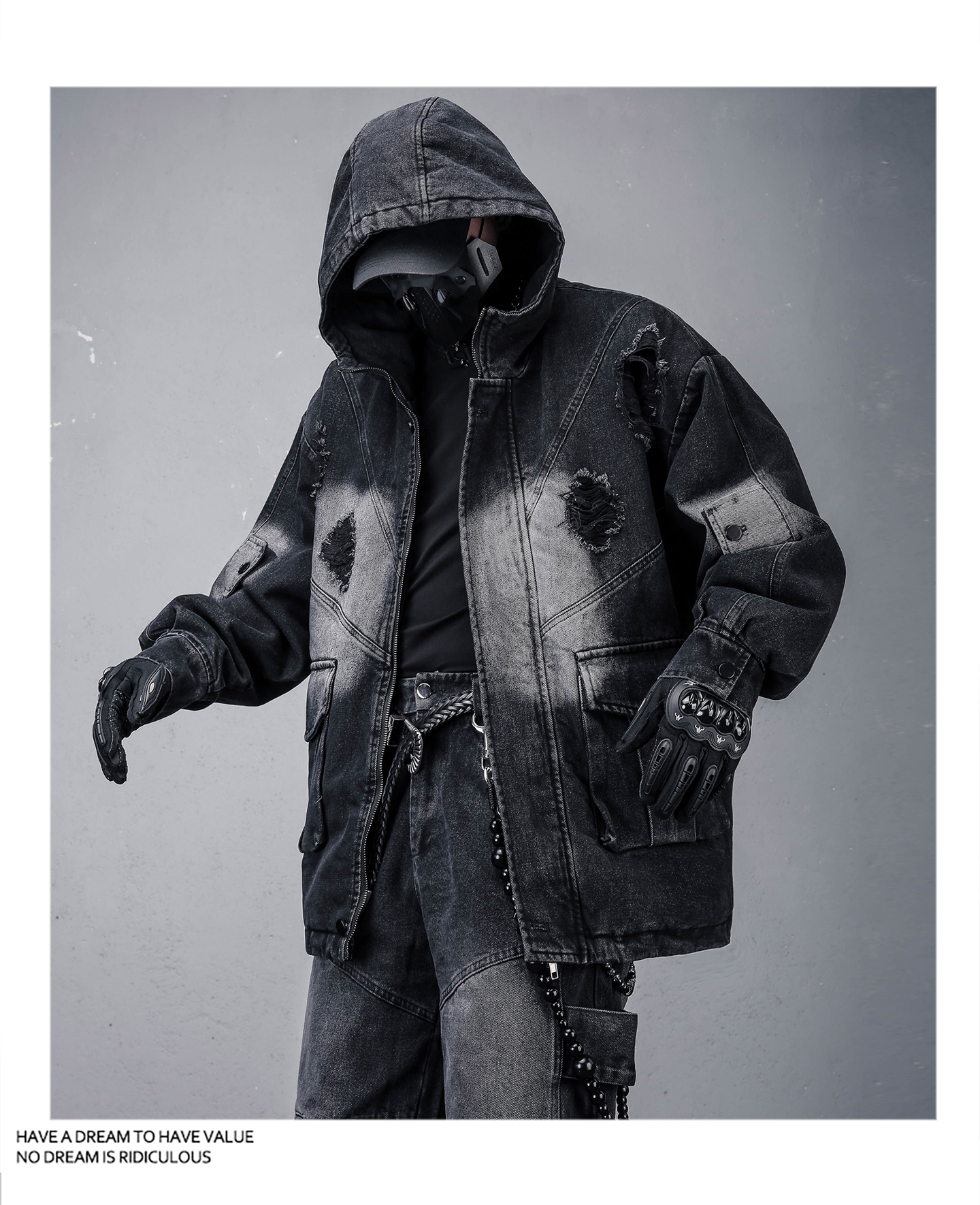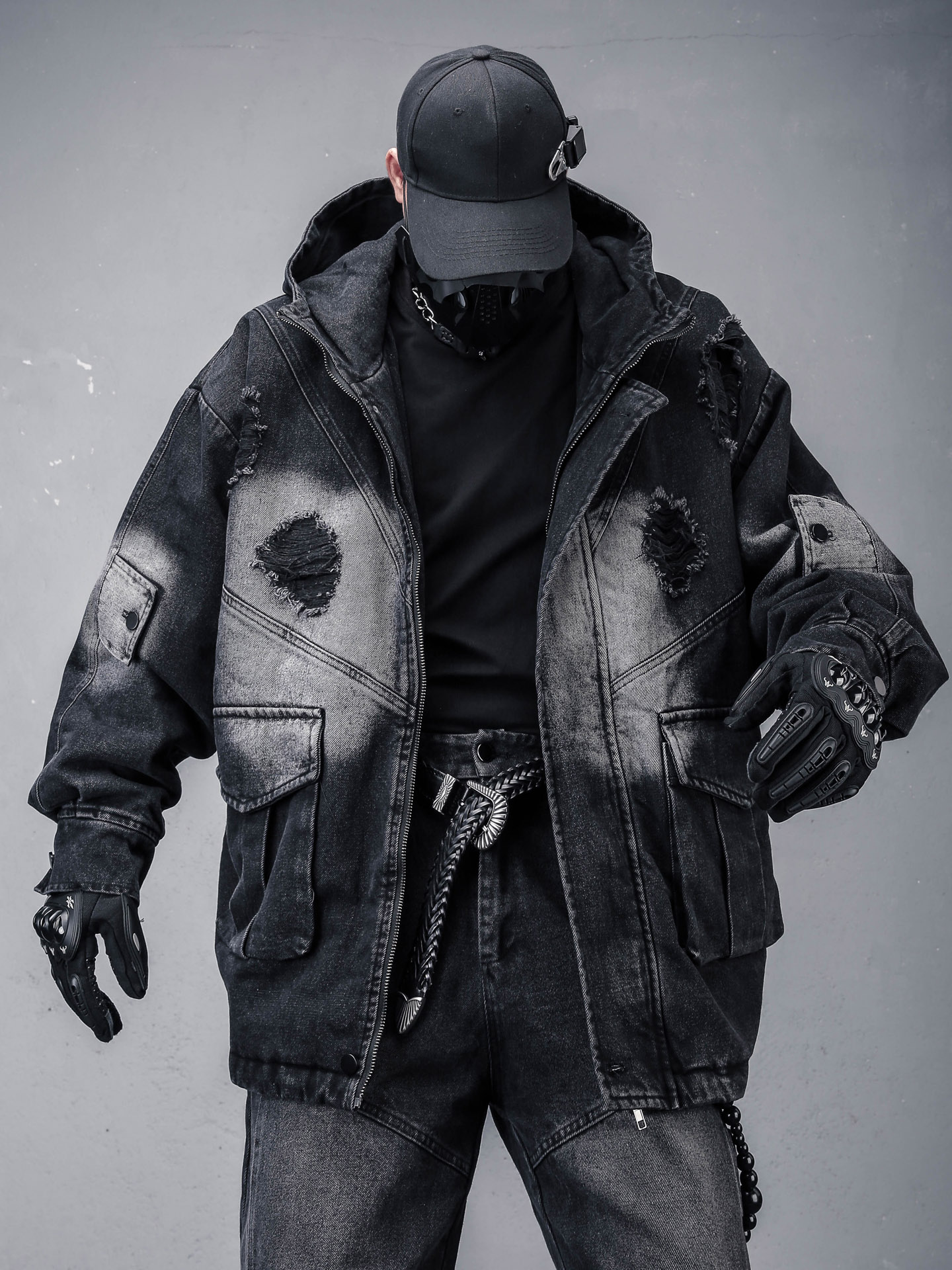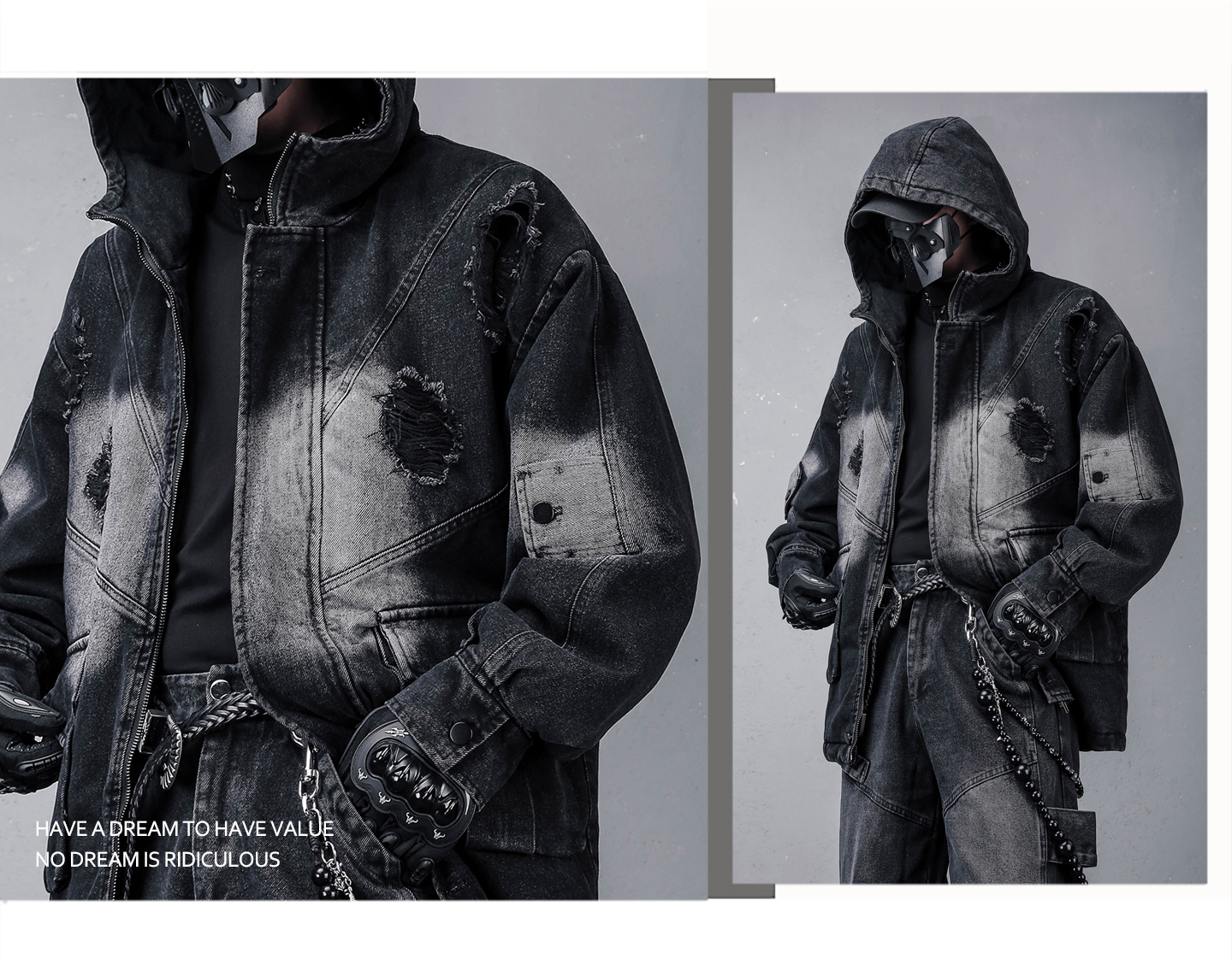 Heavy Wash Damage Hooded Denim Jacket WN22302