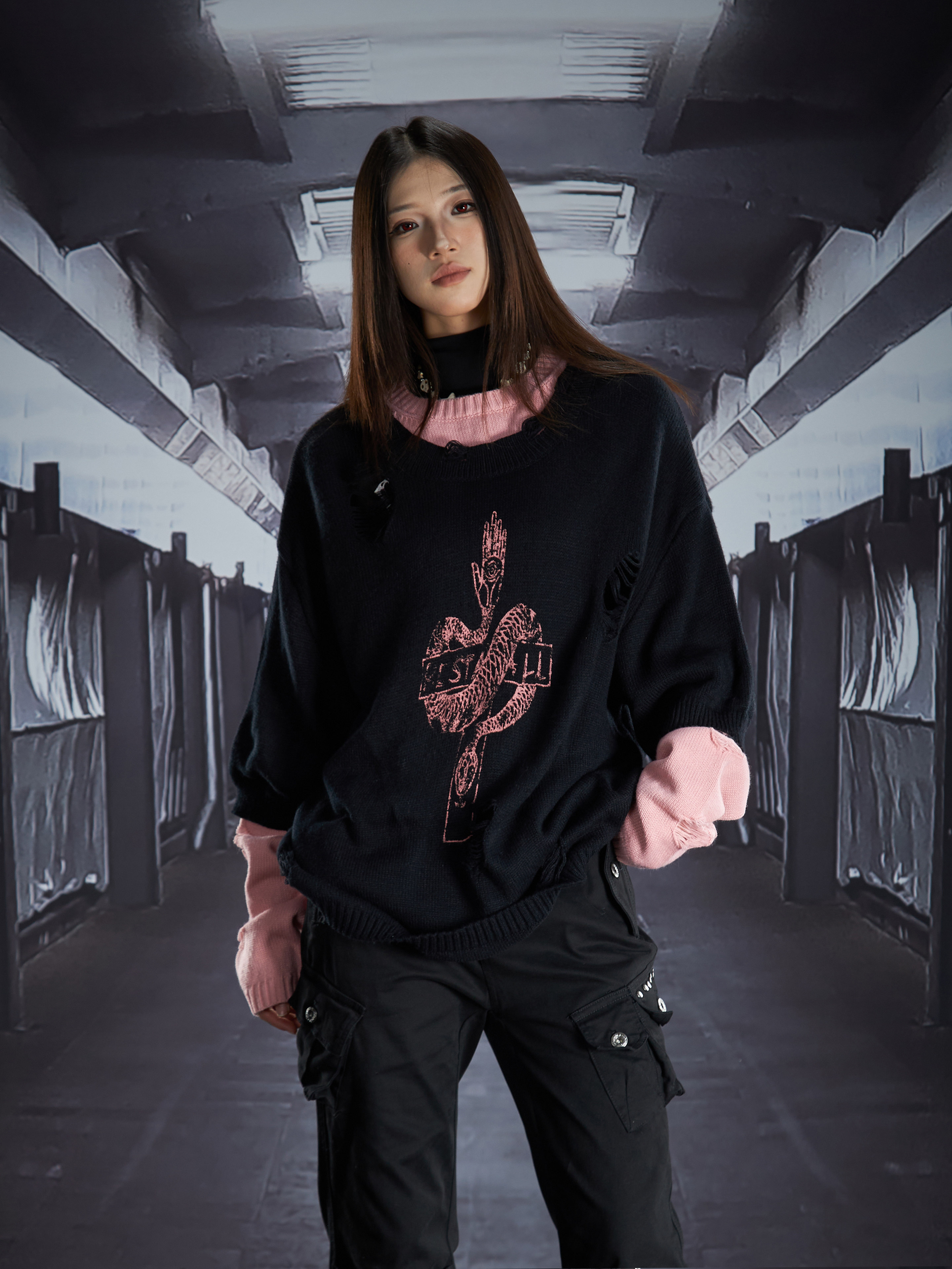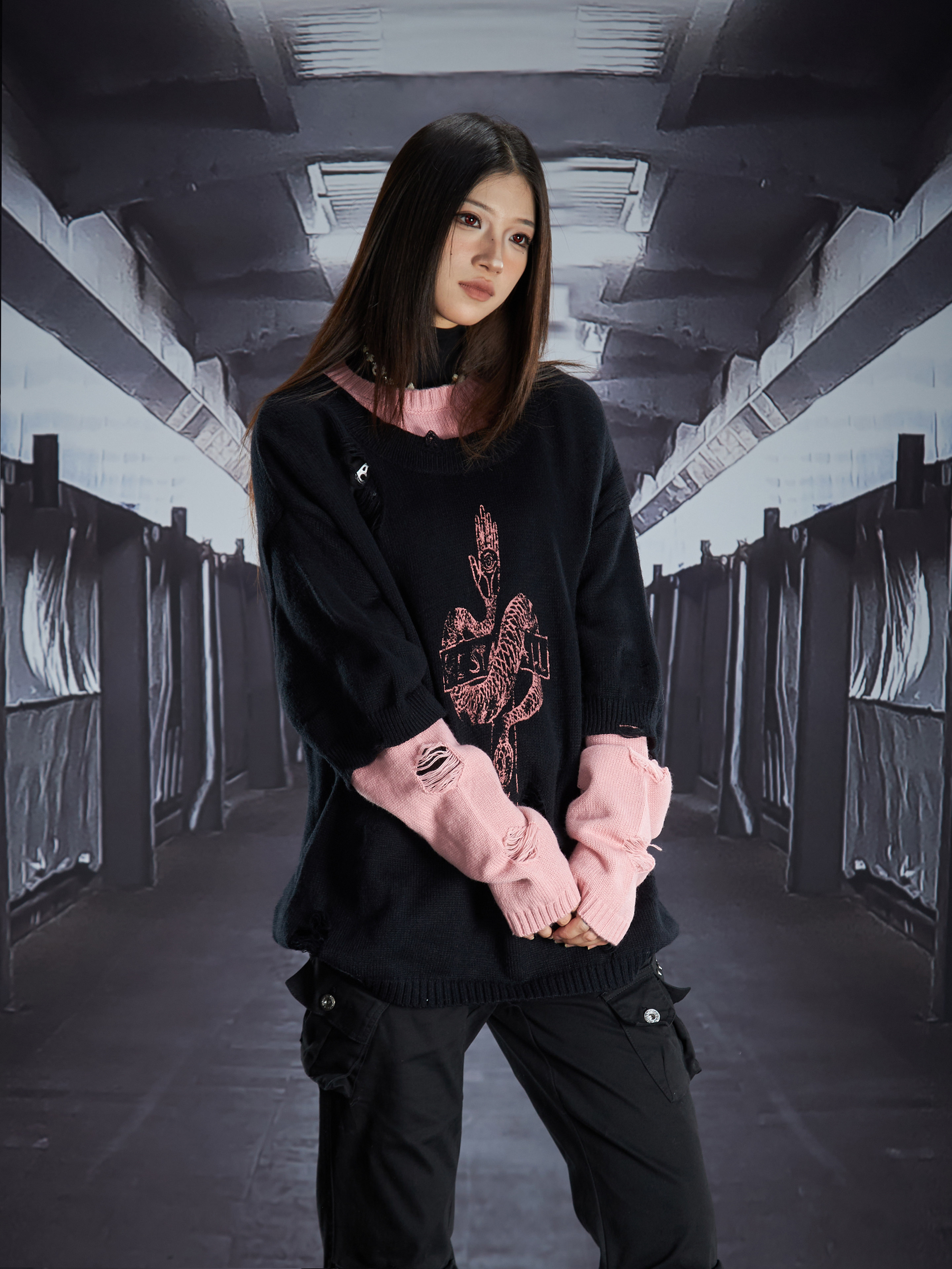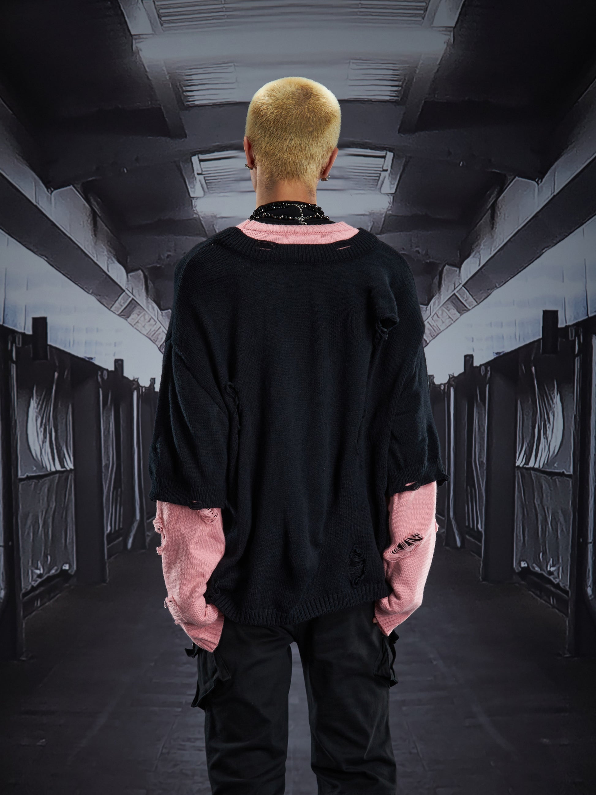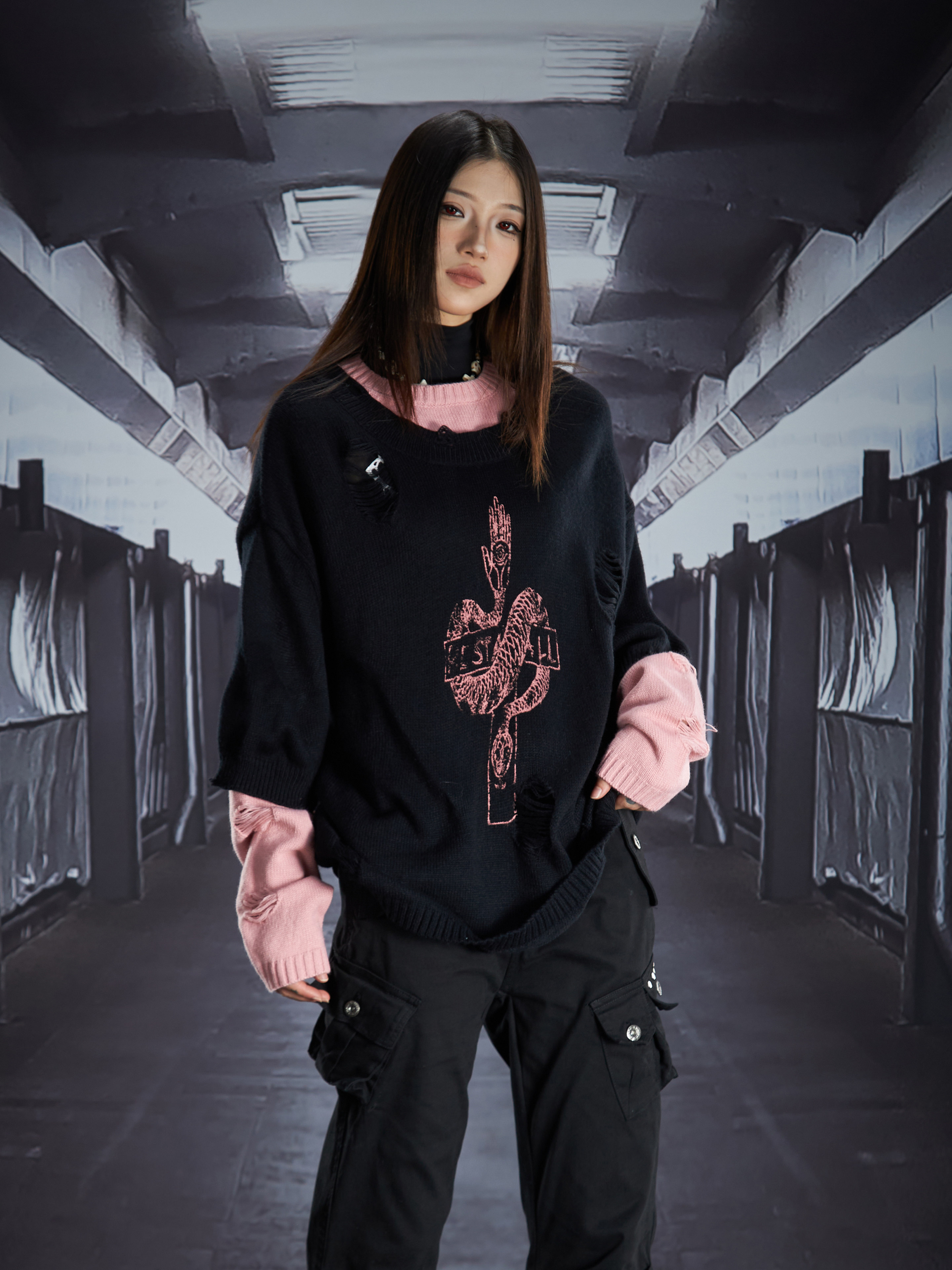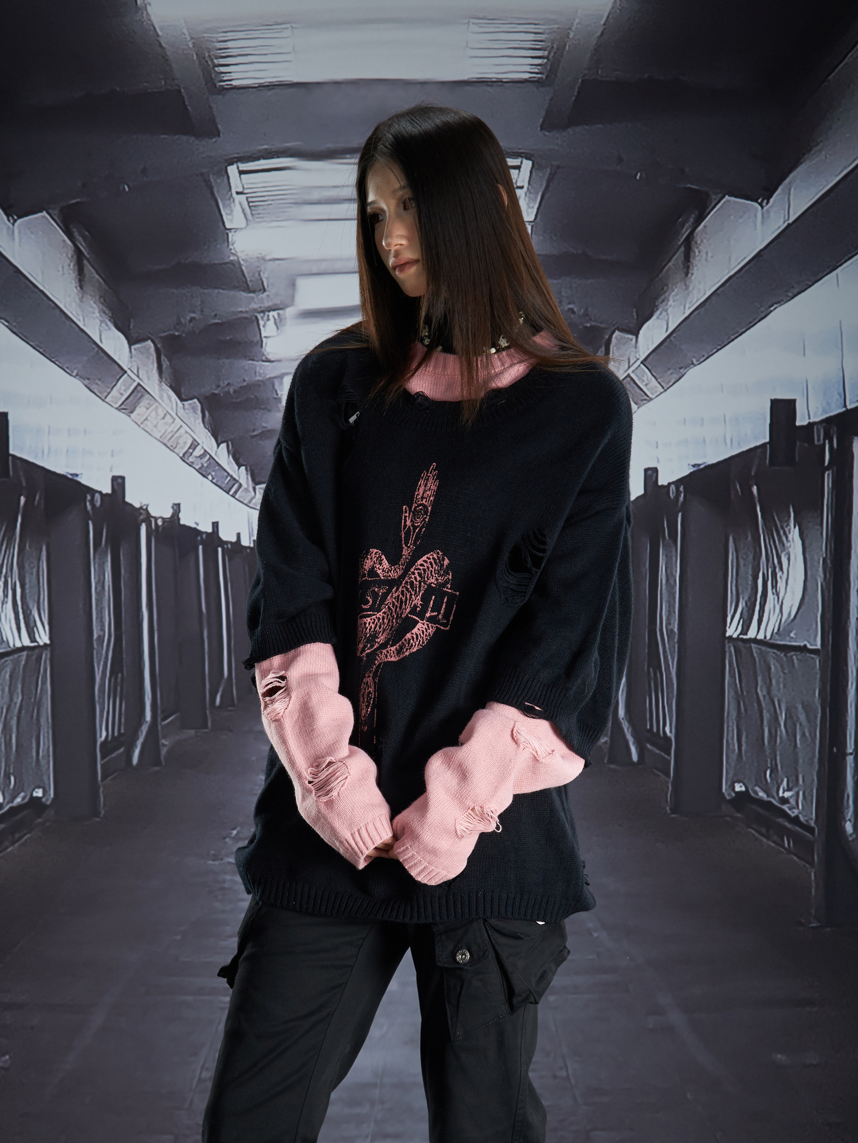 Fake Layered Color Block Damage Print Oversize Knit Sweater WN22802