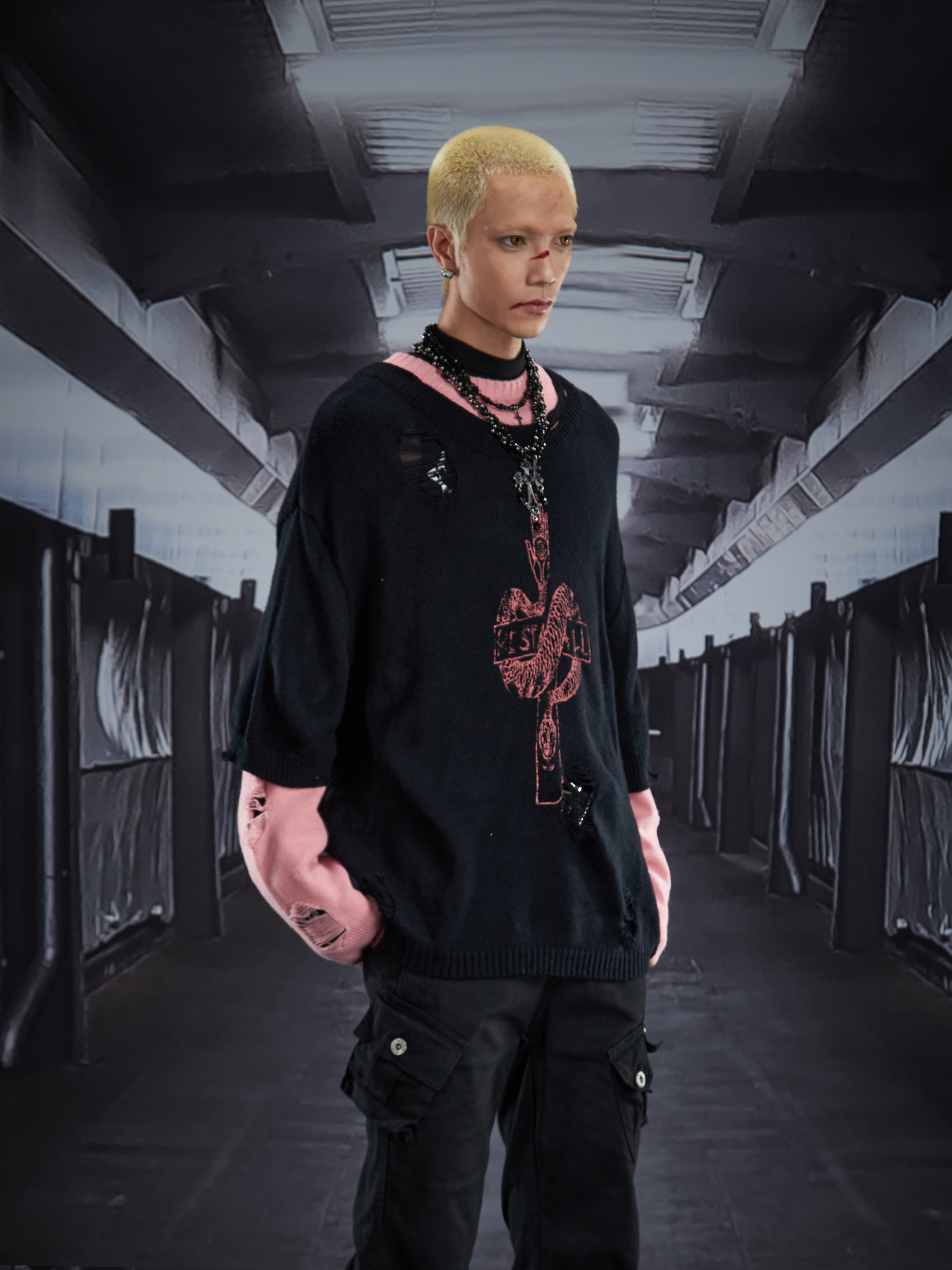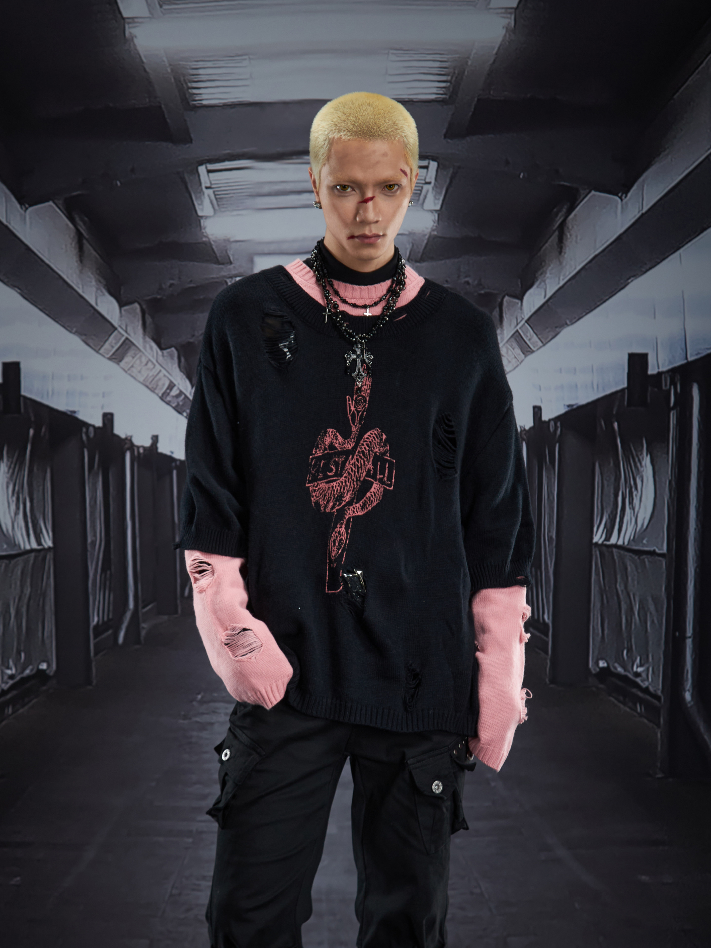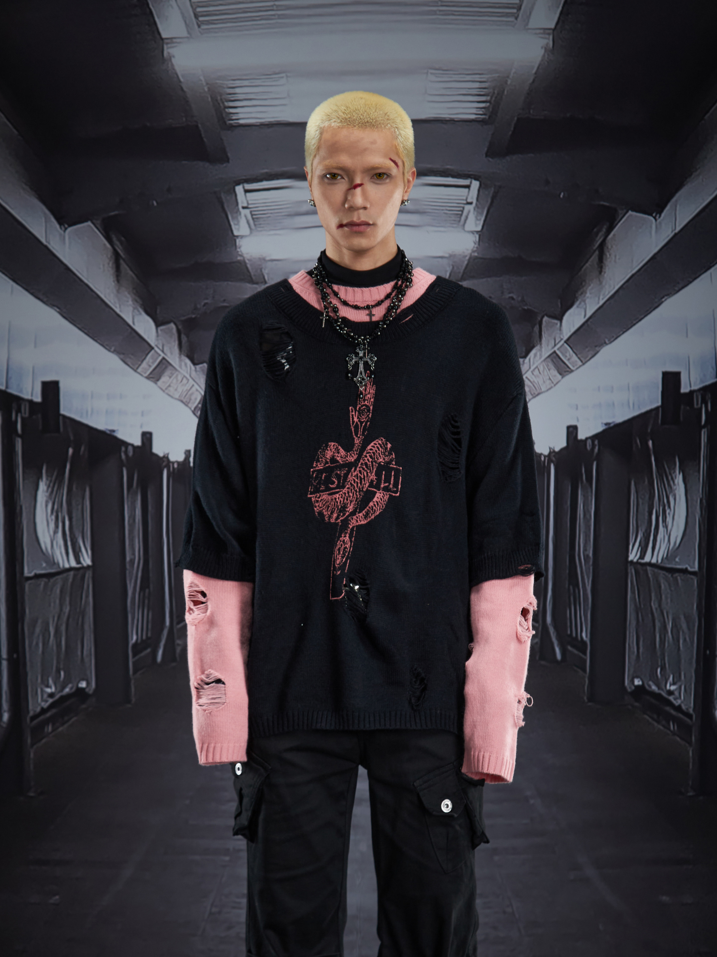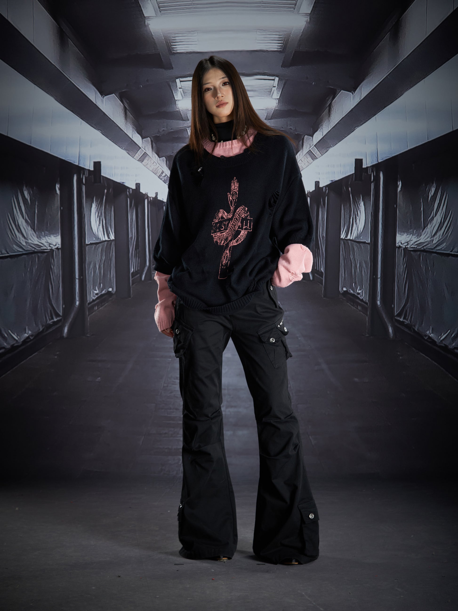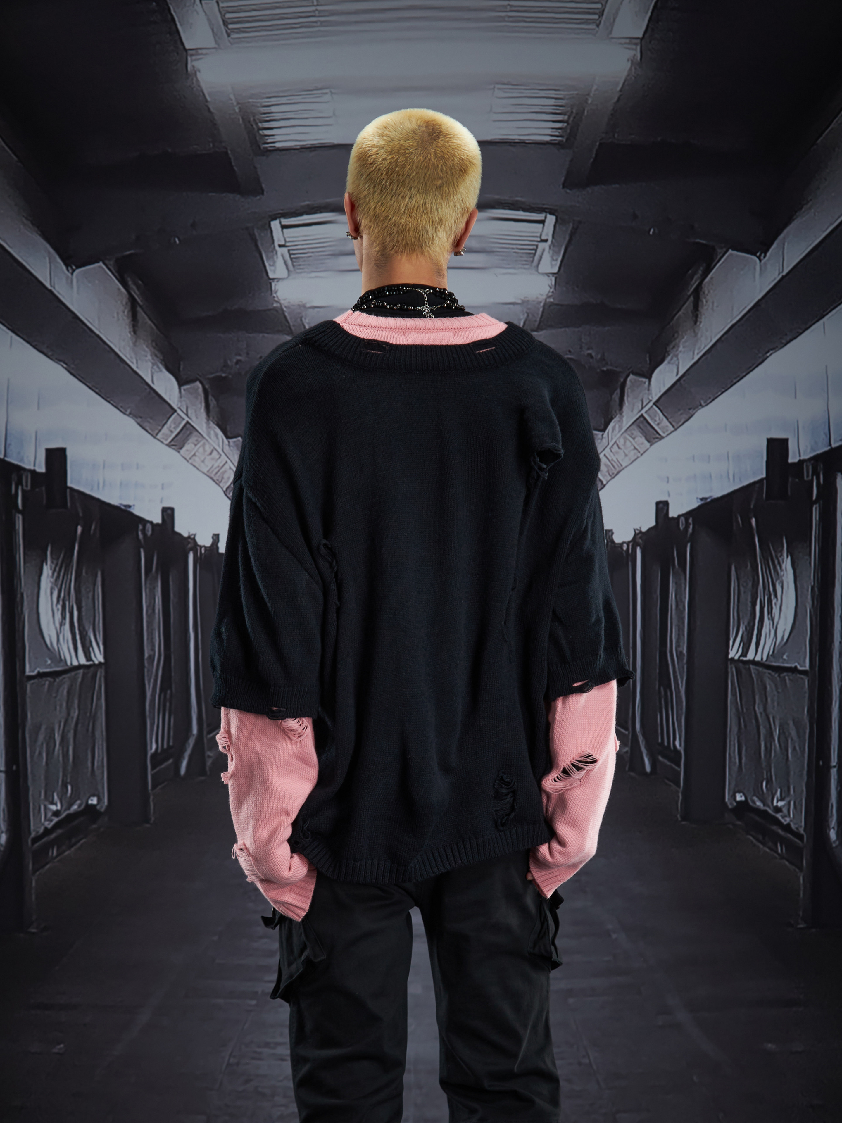 Fake Layered Color Block Damage Print Oversize Knit Sweater WN22802