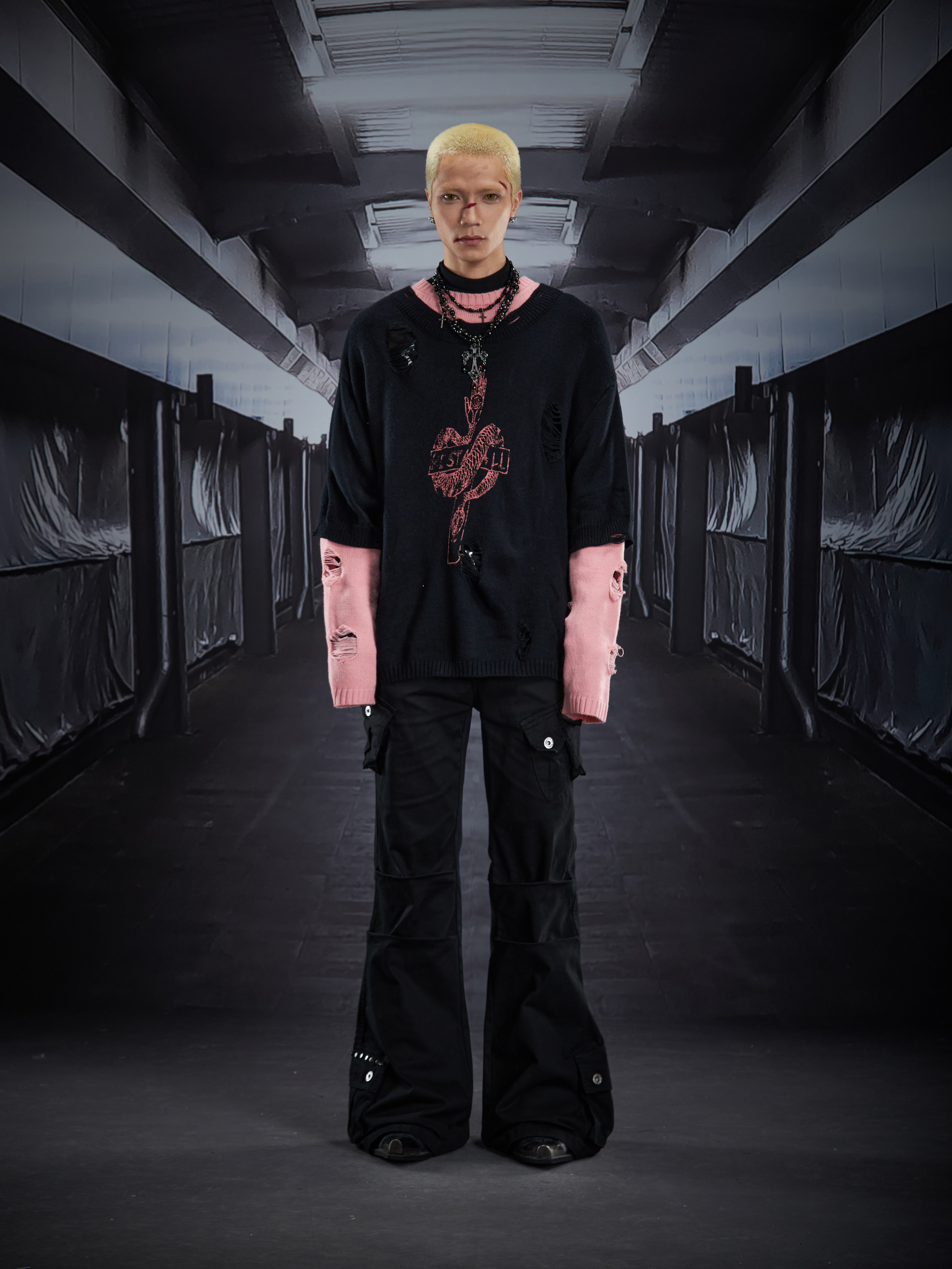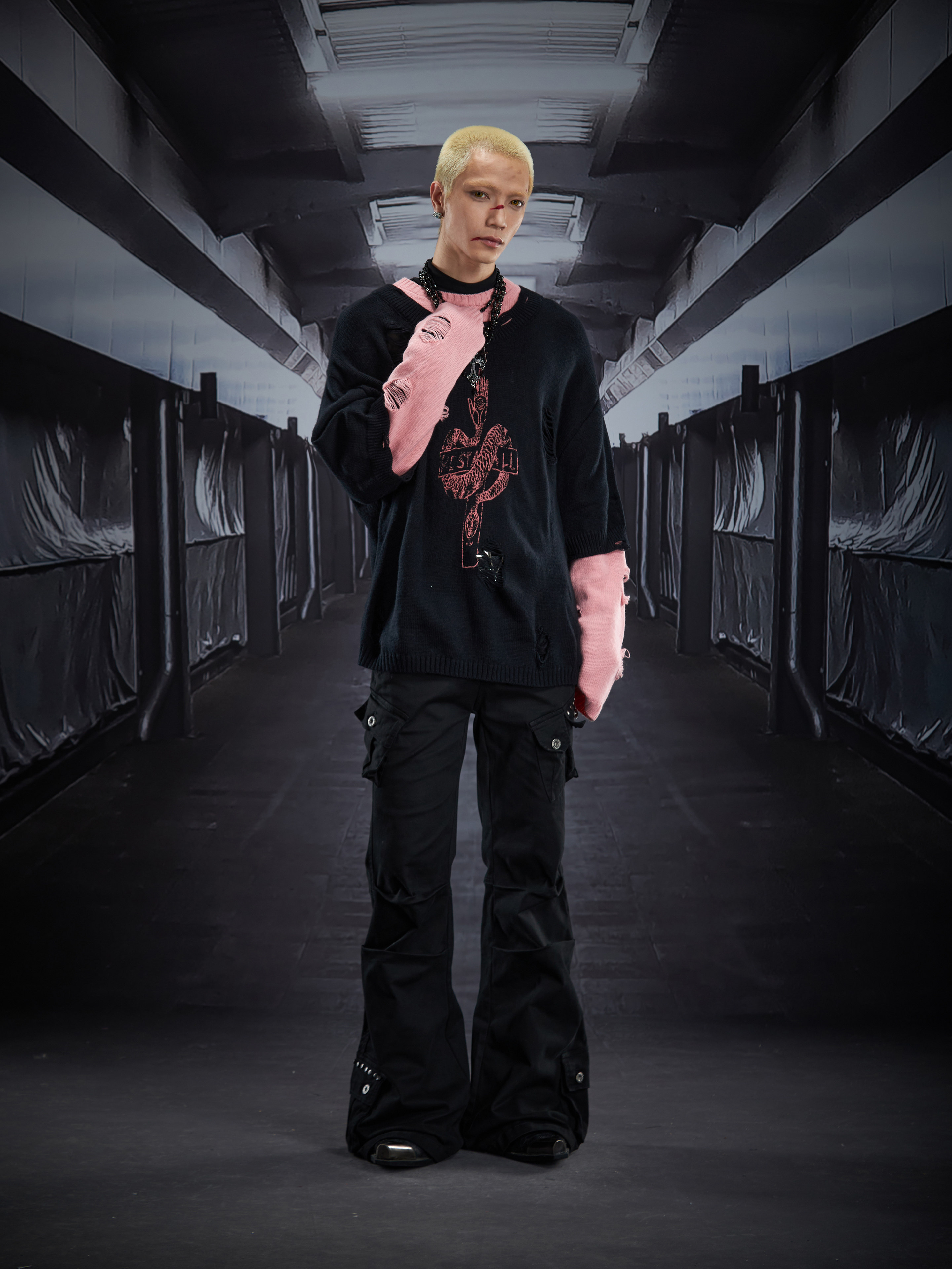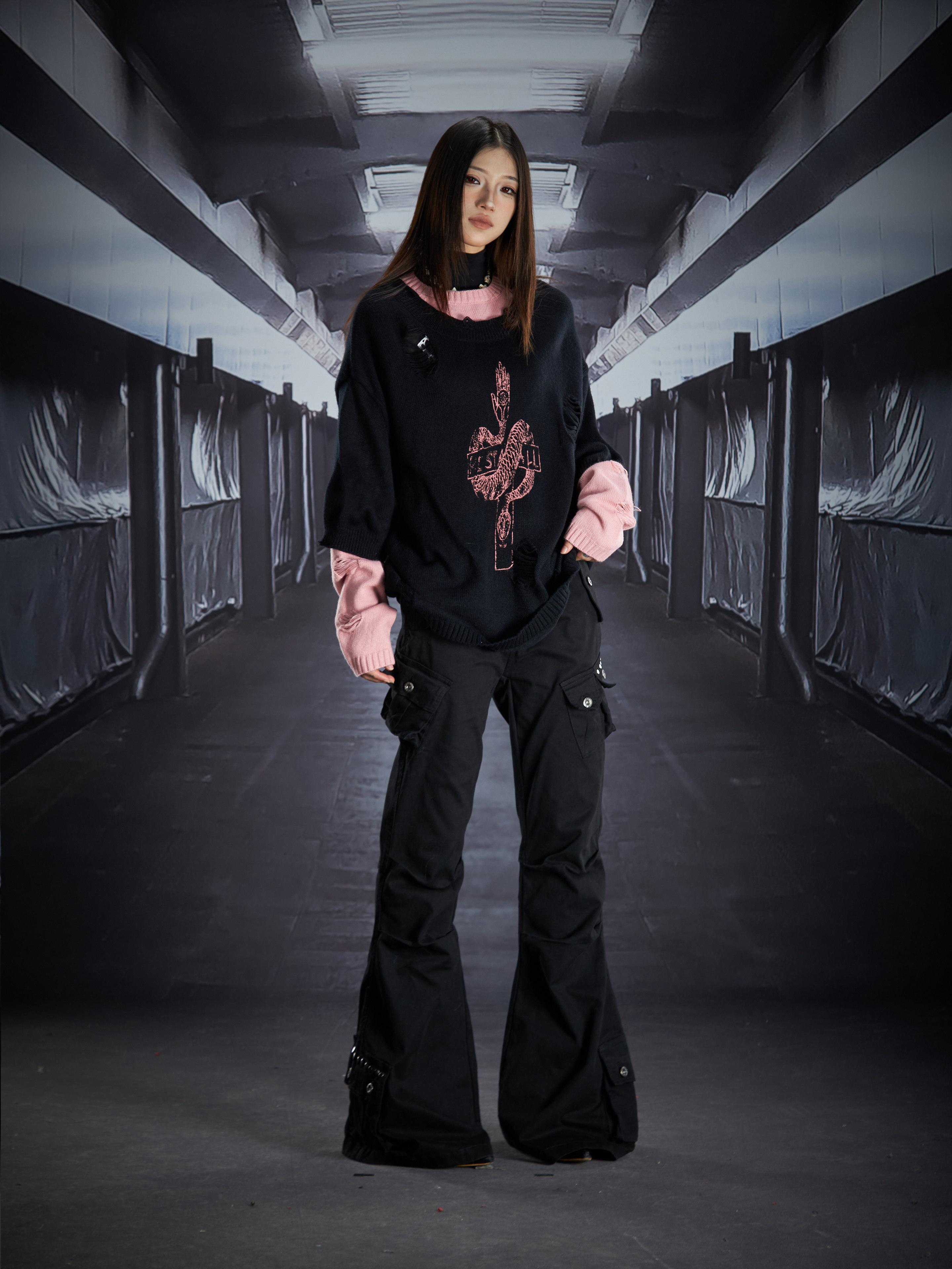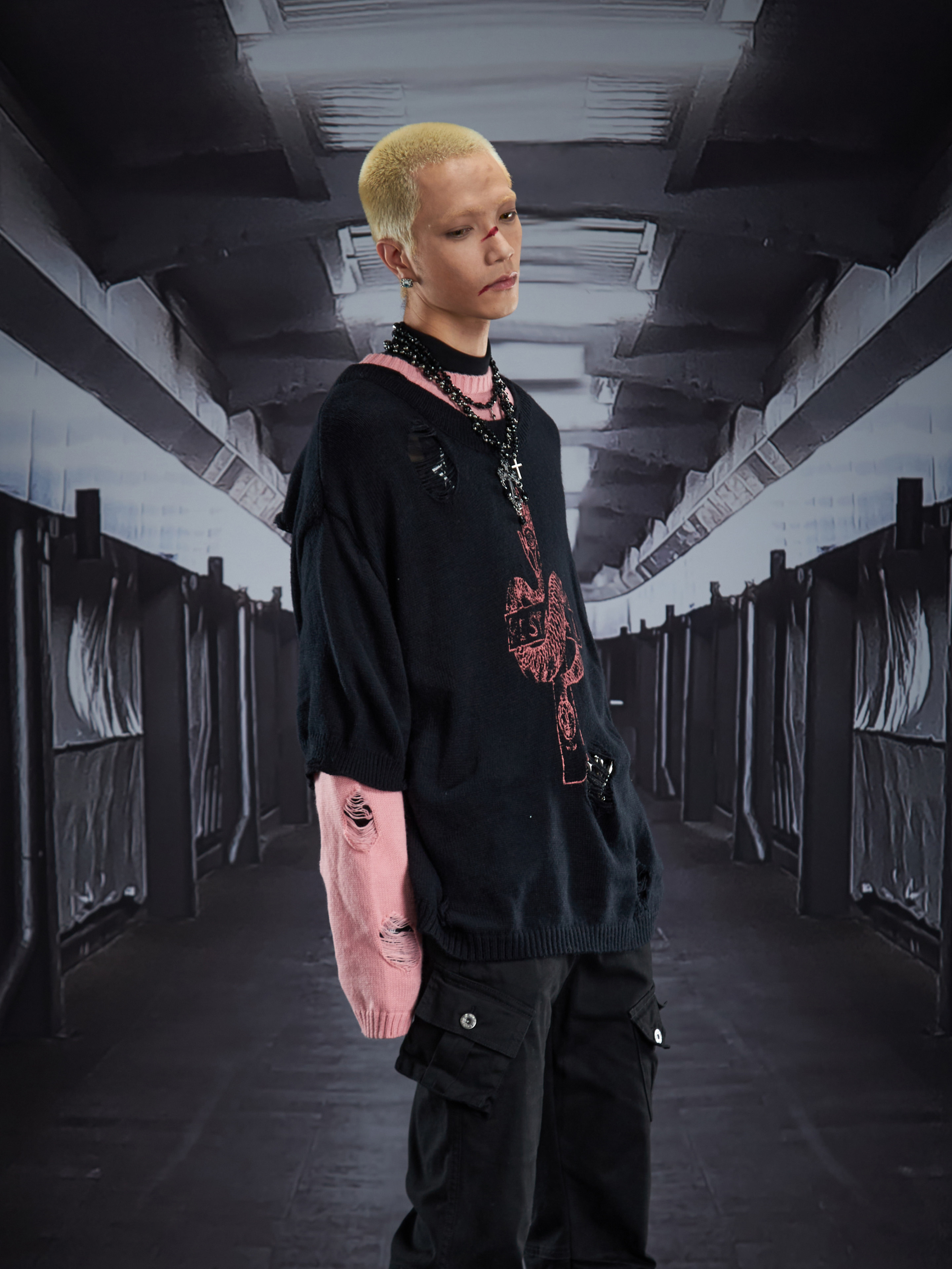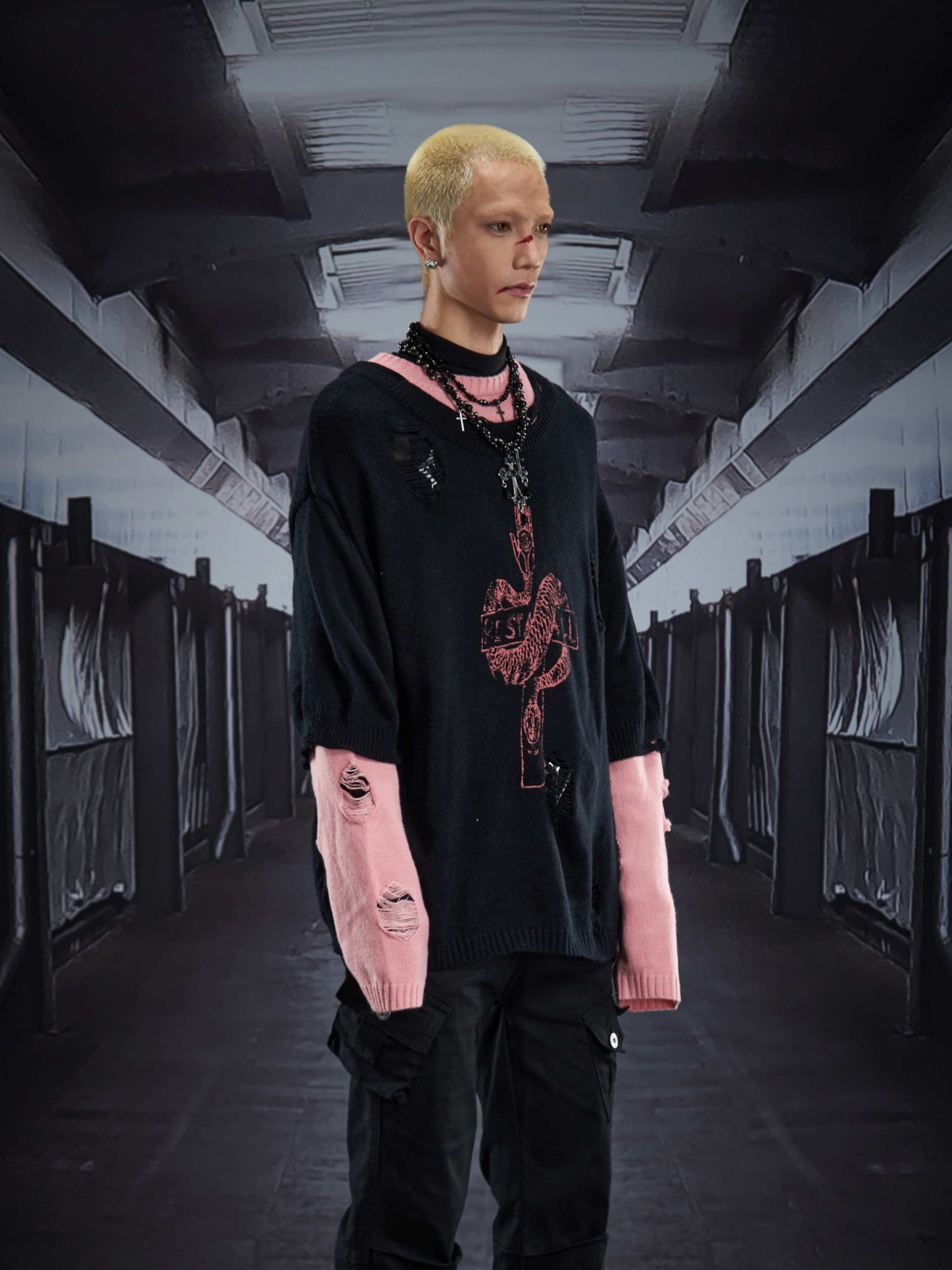 Fake Layered Color Block Damage Print Oversize Knit Sweater WN22802