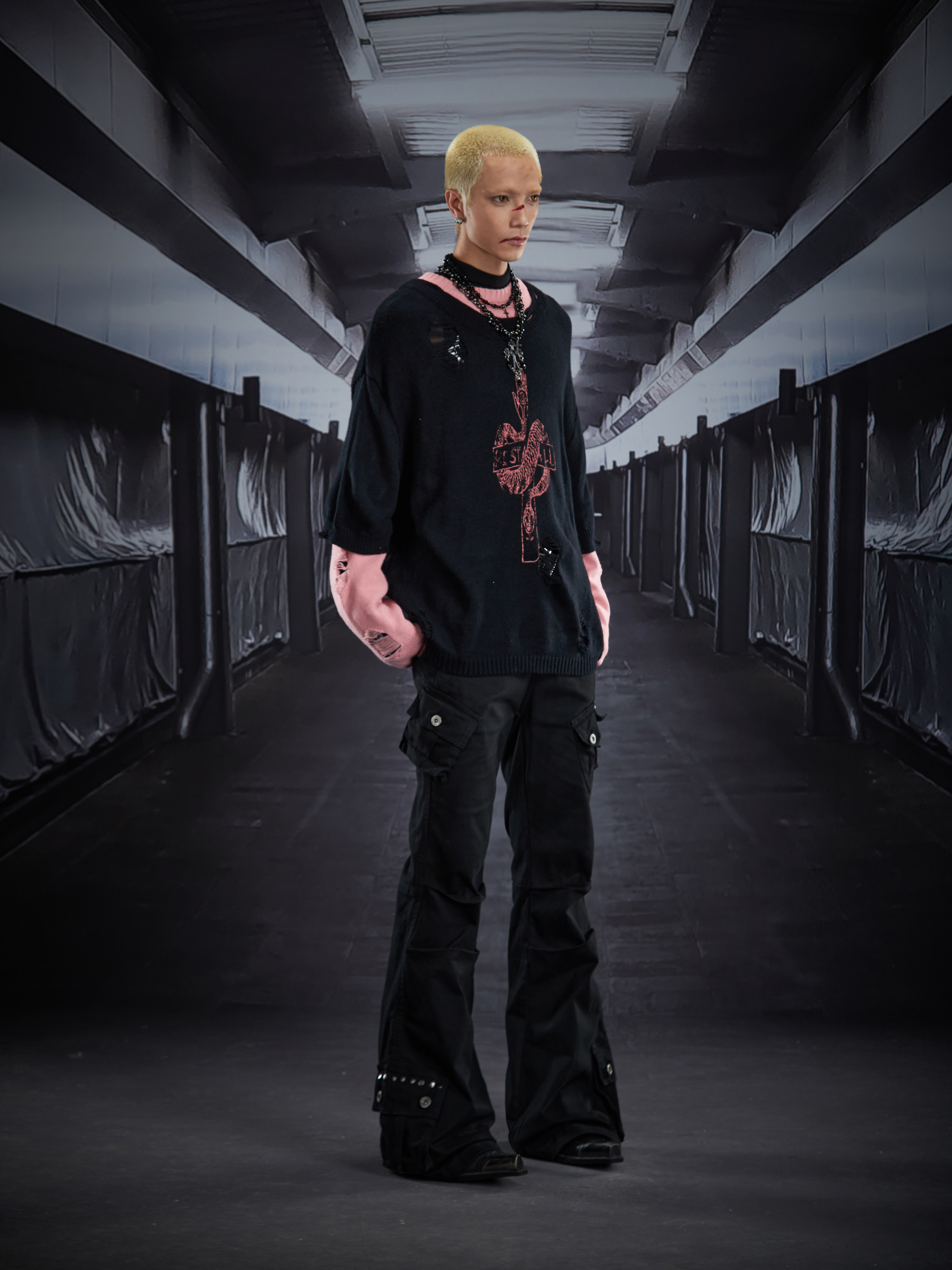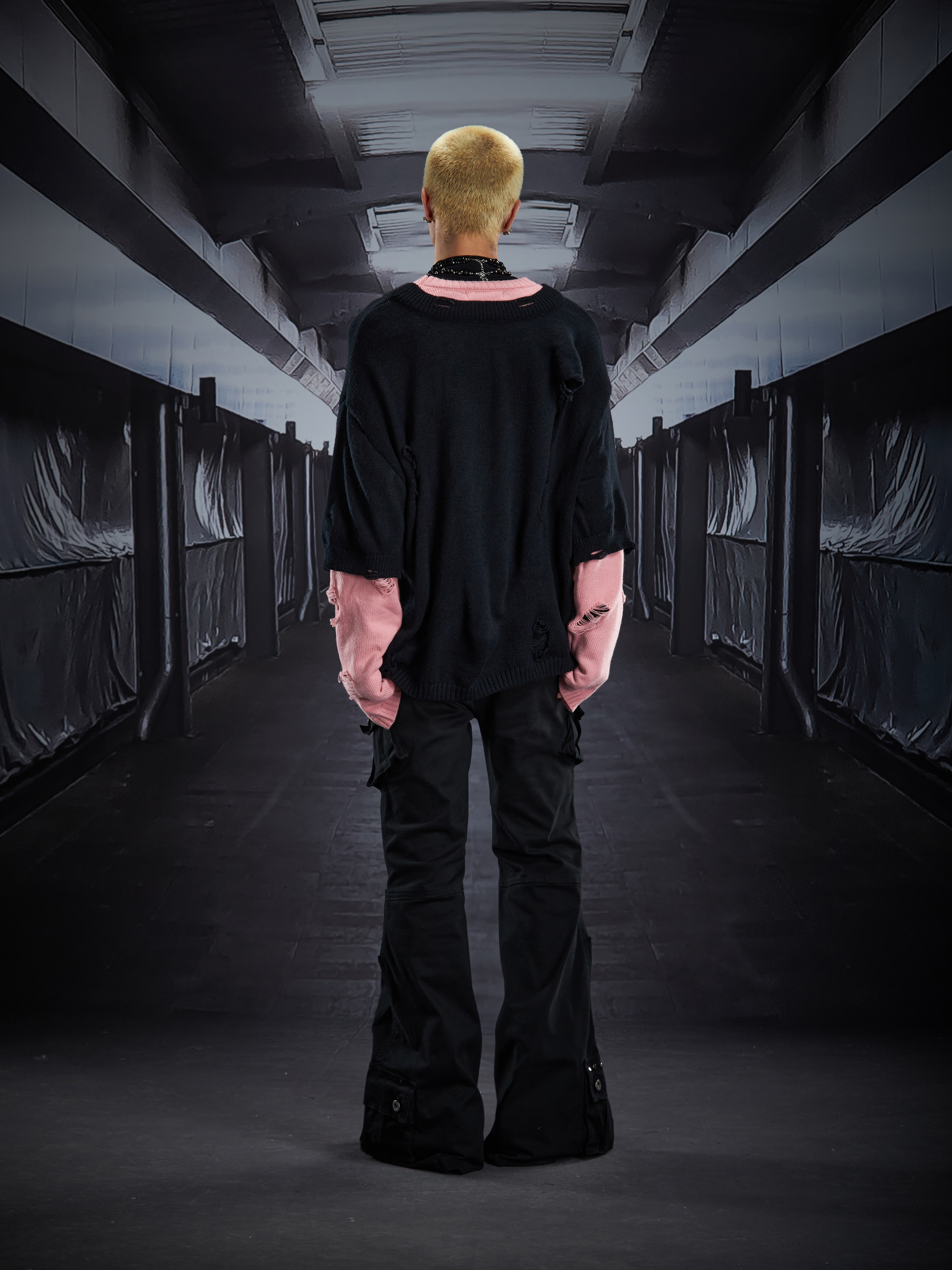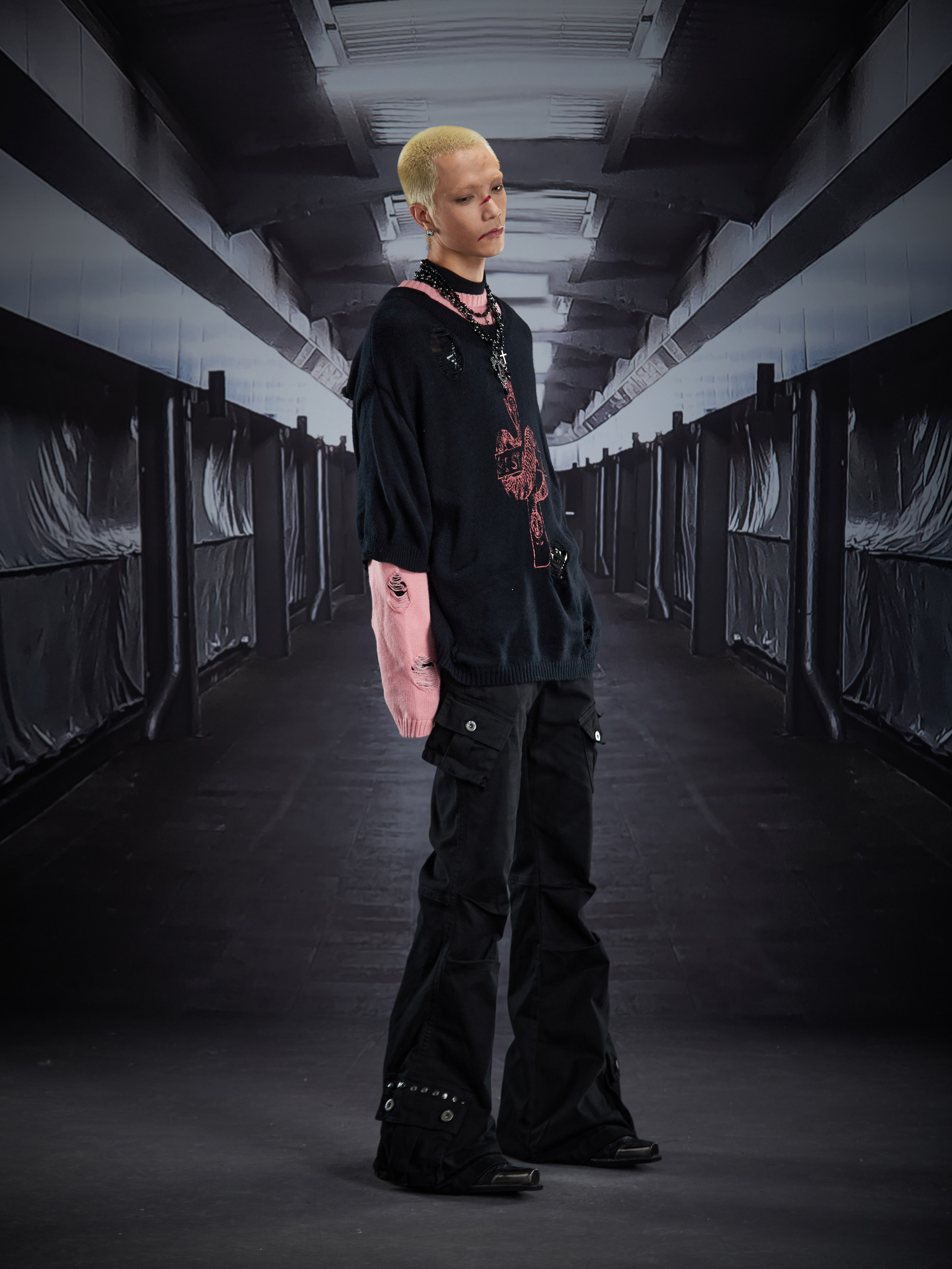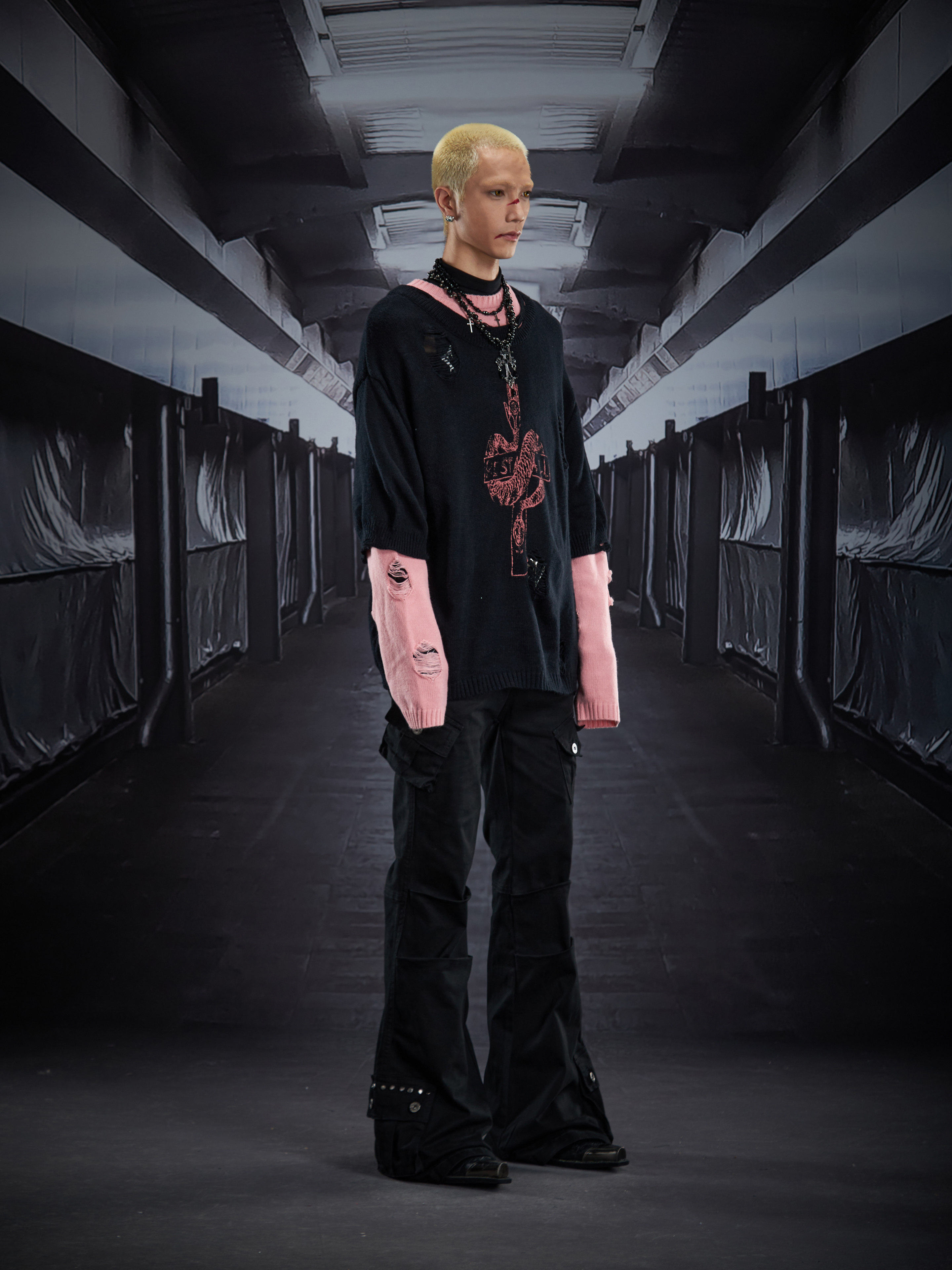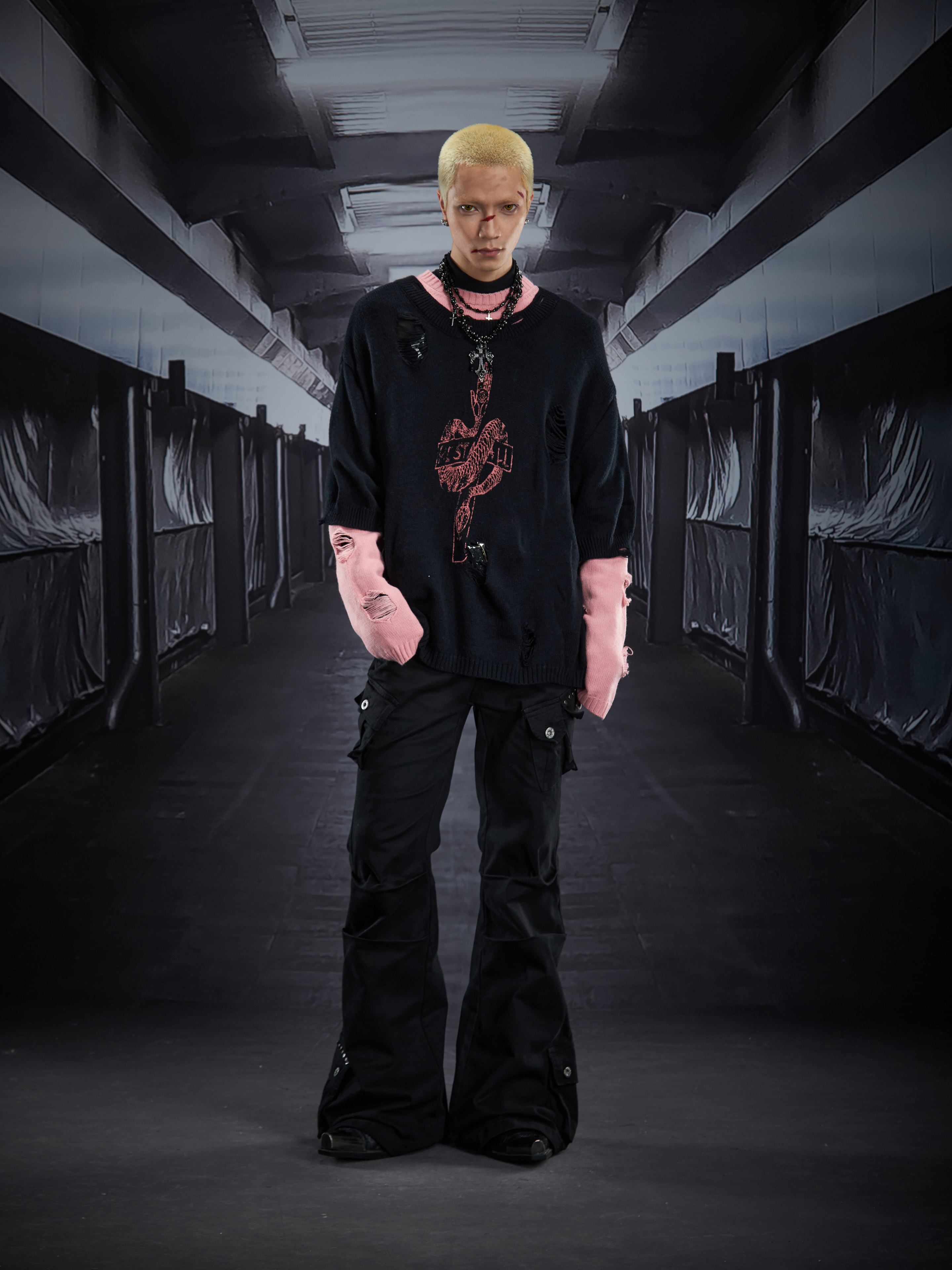 Fake Layered Color Block Damage Print Oversize Knit Sweater WN22802
