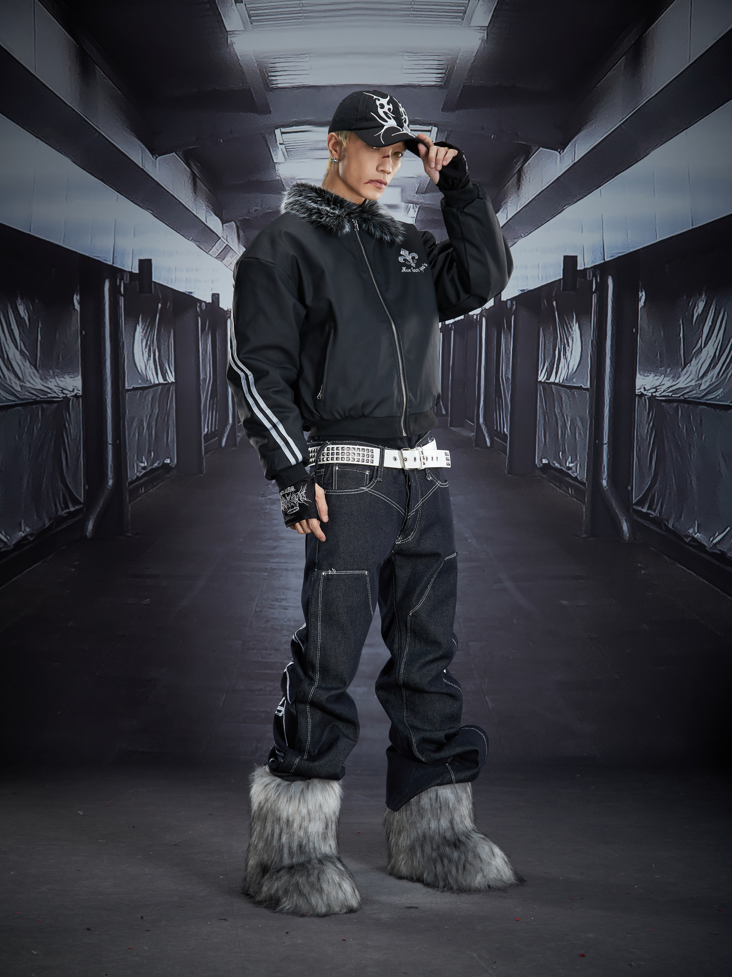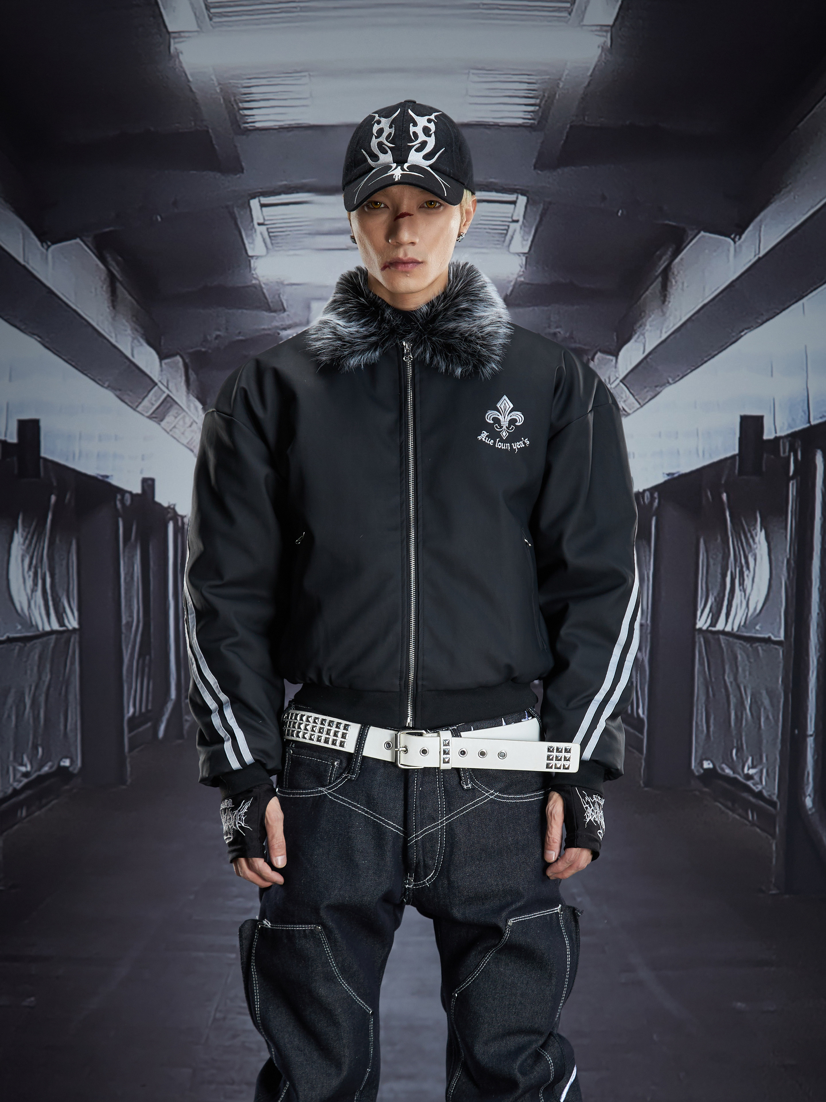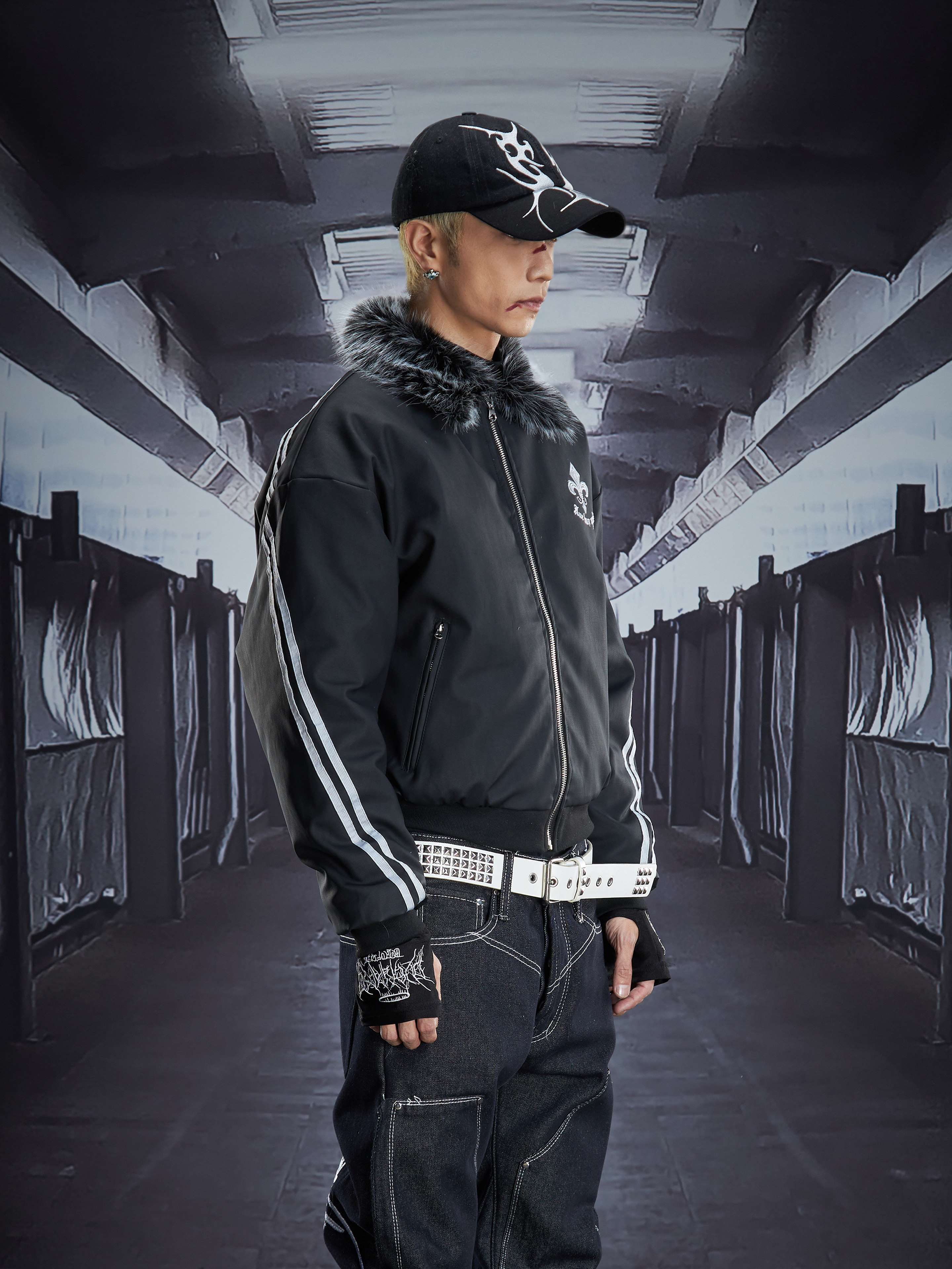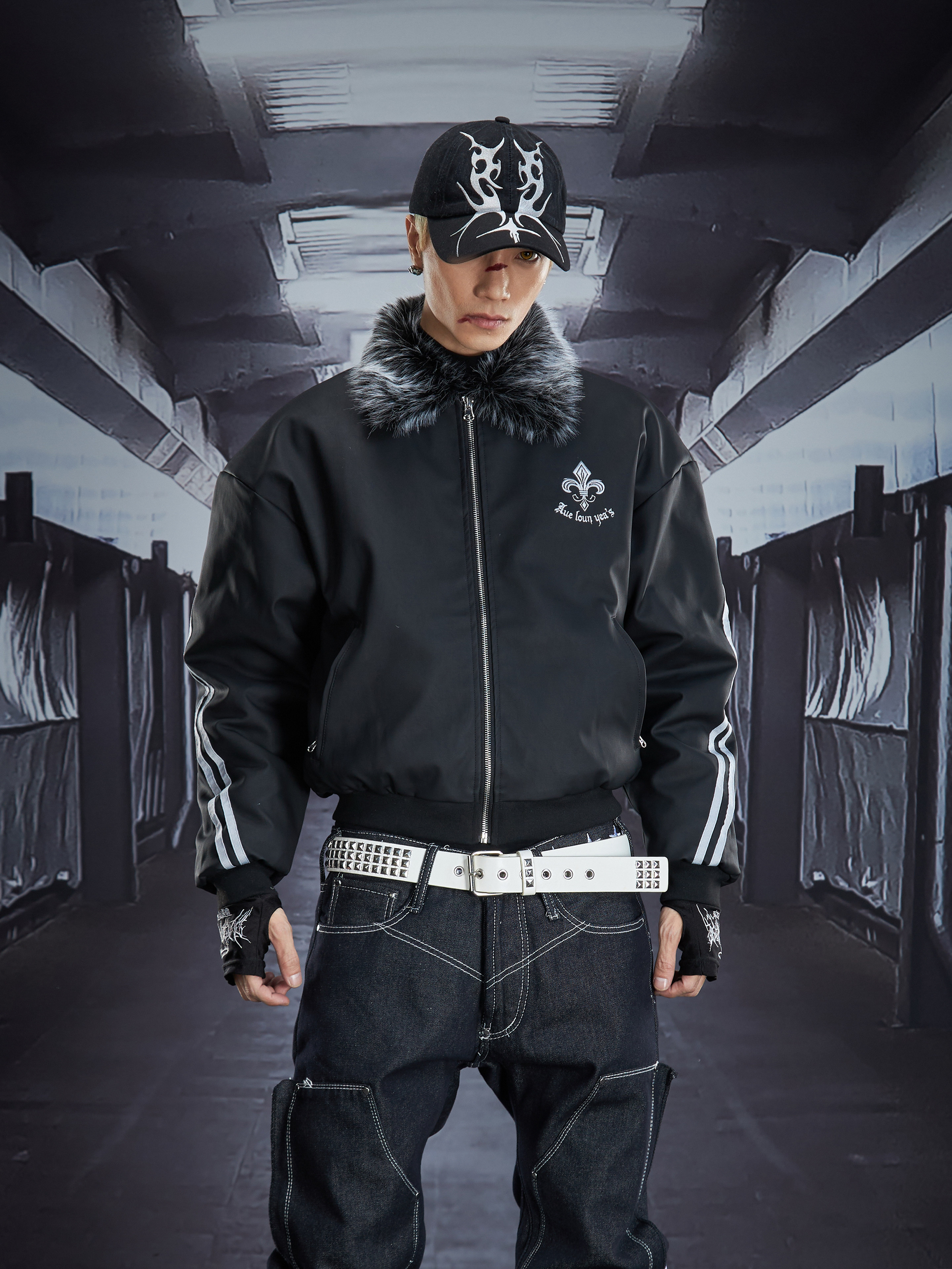 Lapel Fake Fur Striped Embroidery Cropped Zipper PU Leather Jacket WN22837