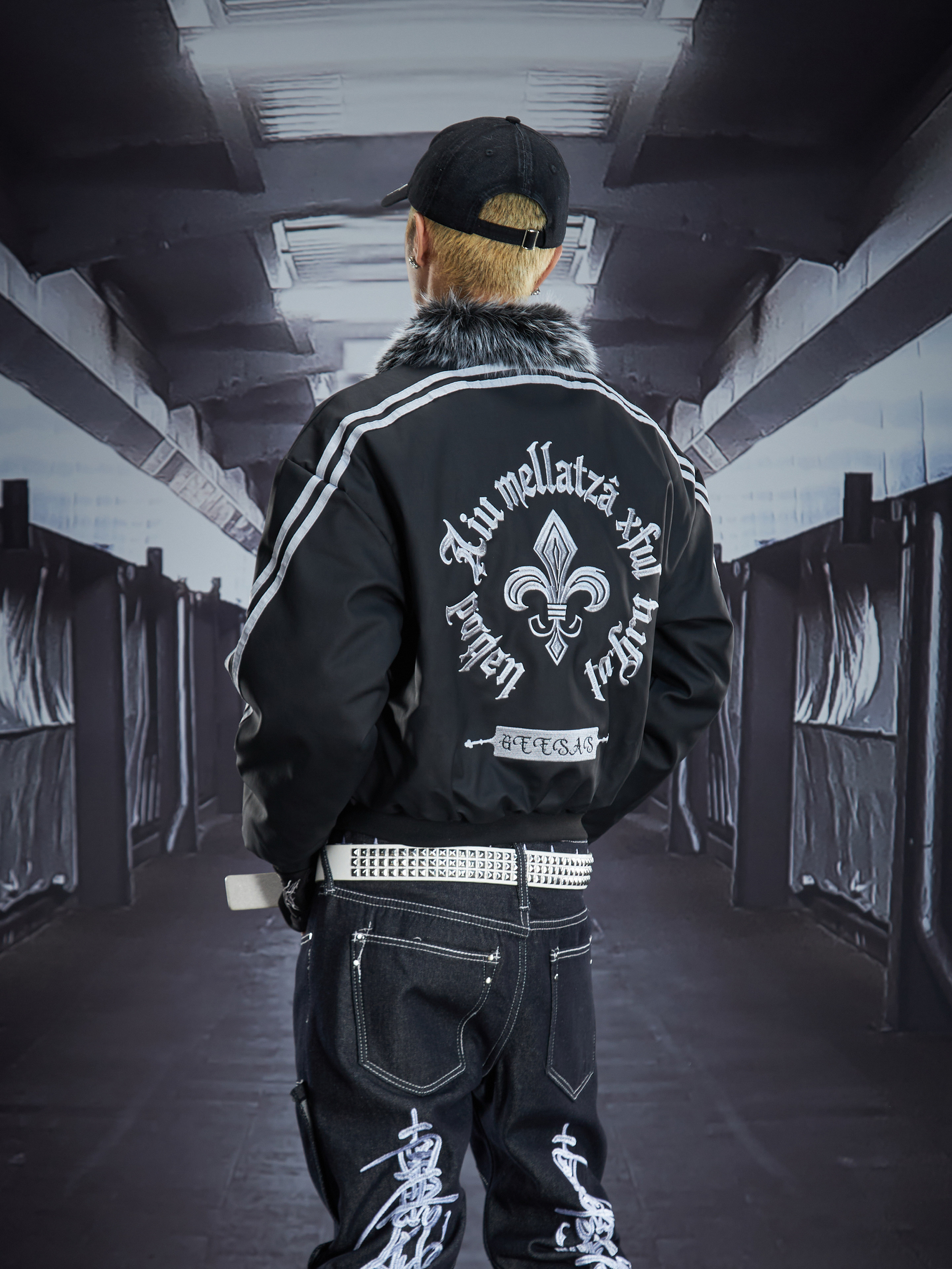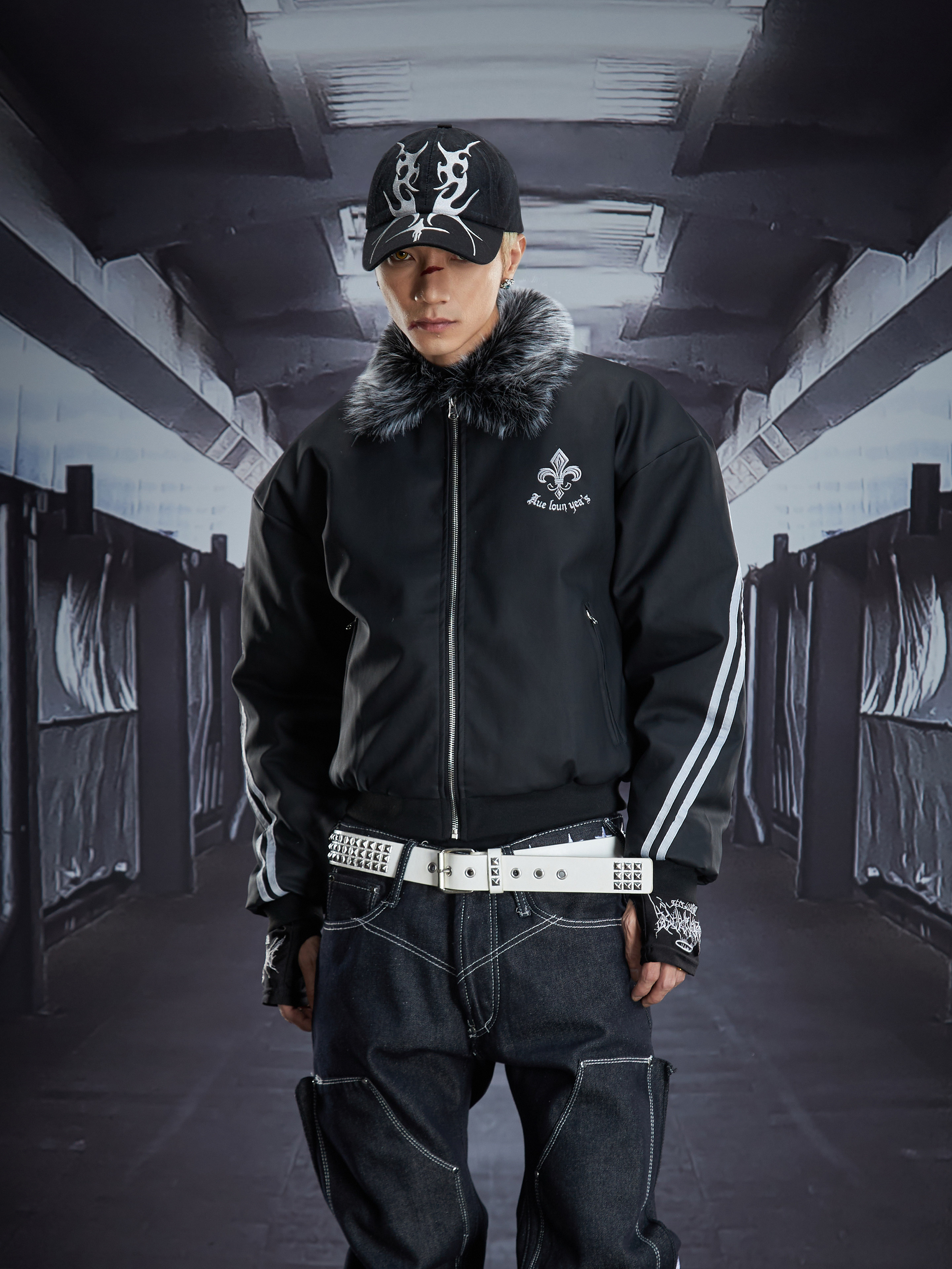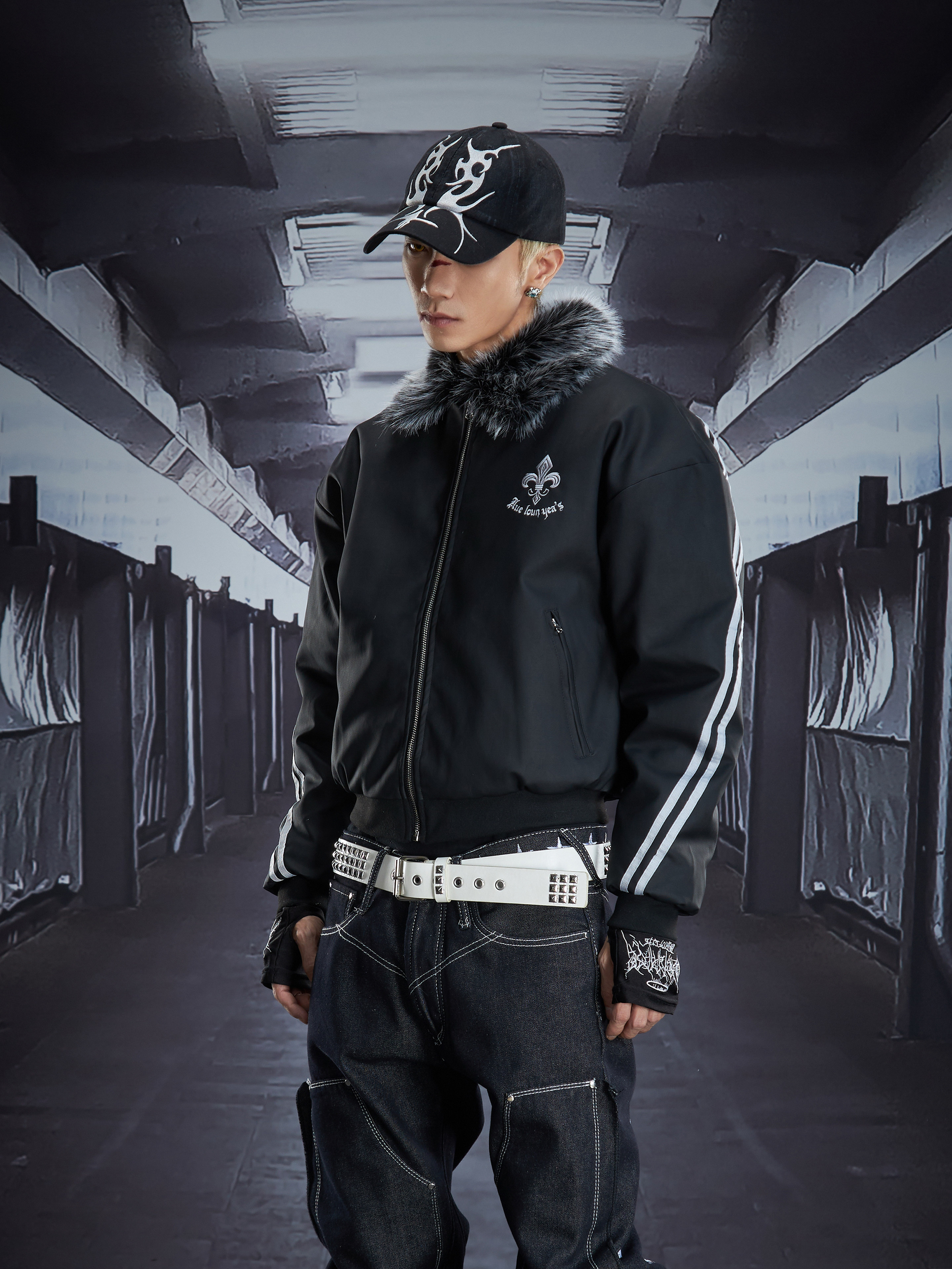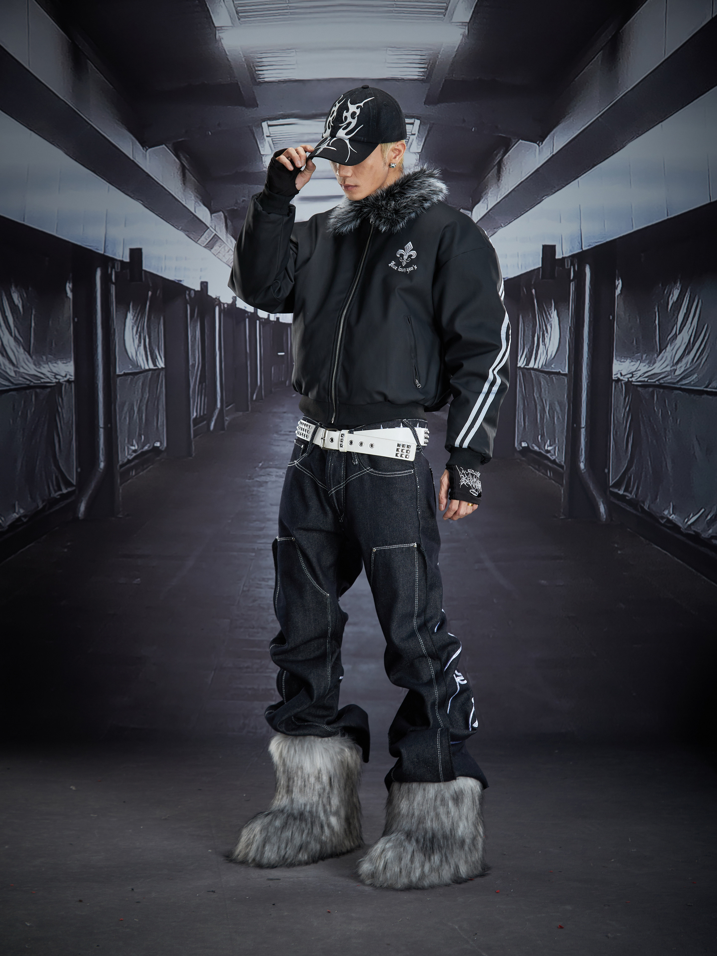 Lapel Fake Fur Striped Embroidery Cropped Zipper PU Leather Jacket WN22837