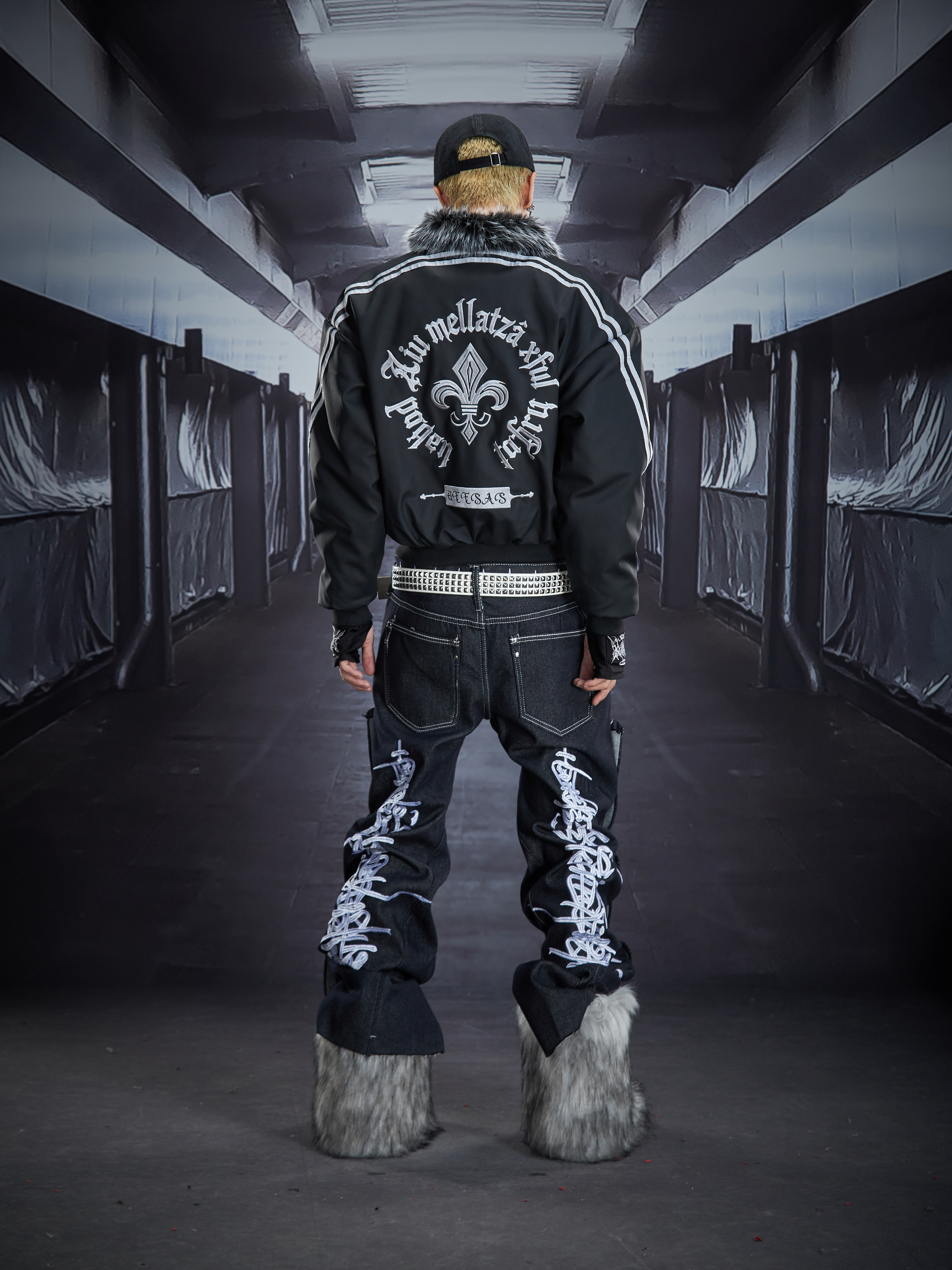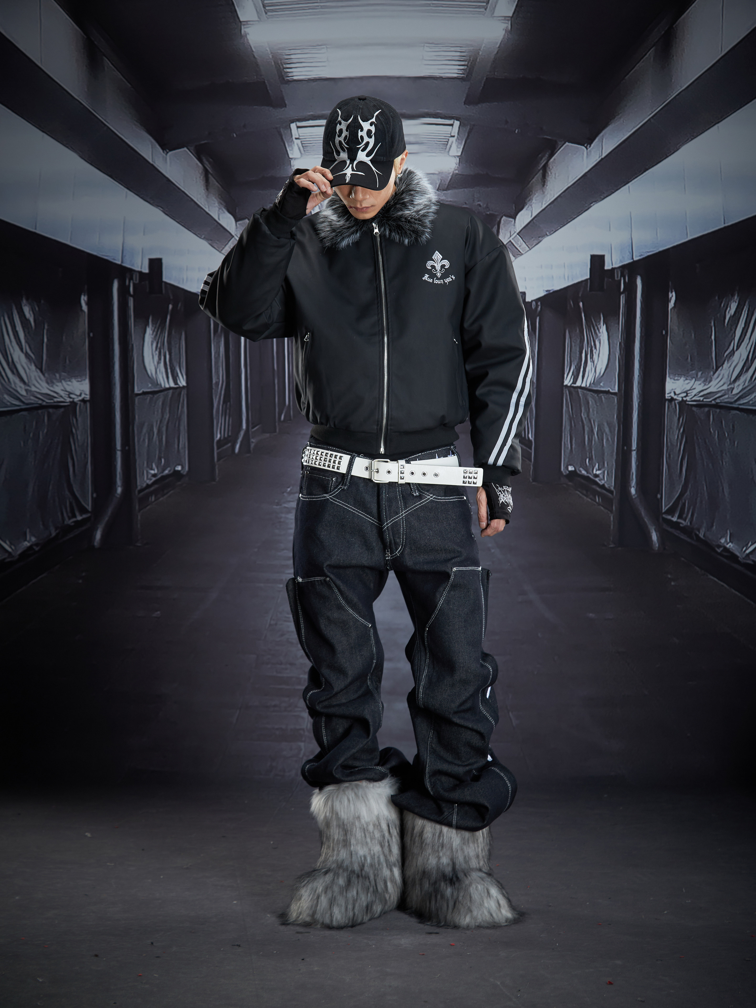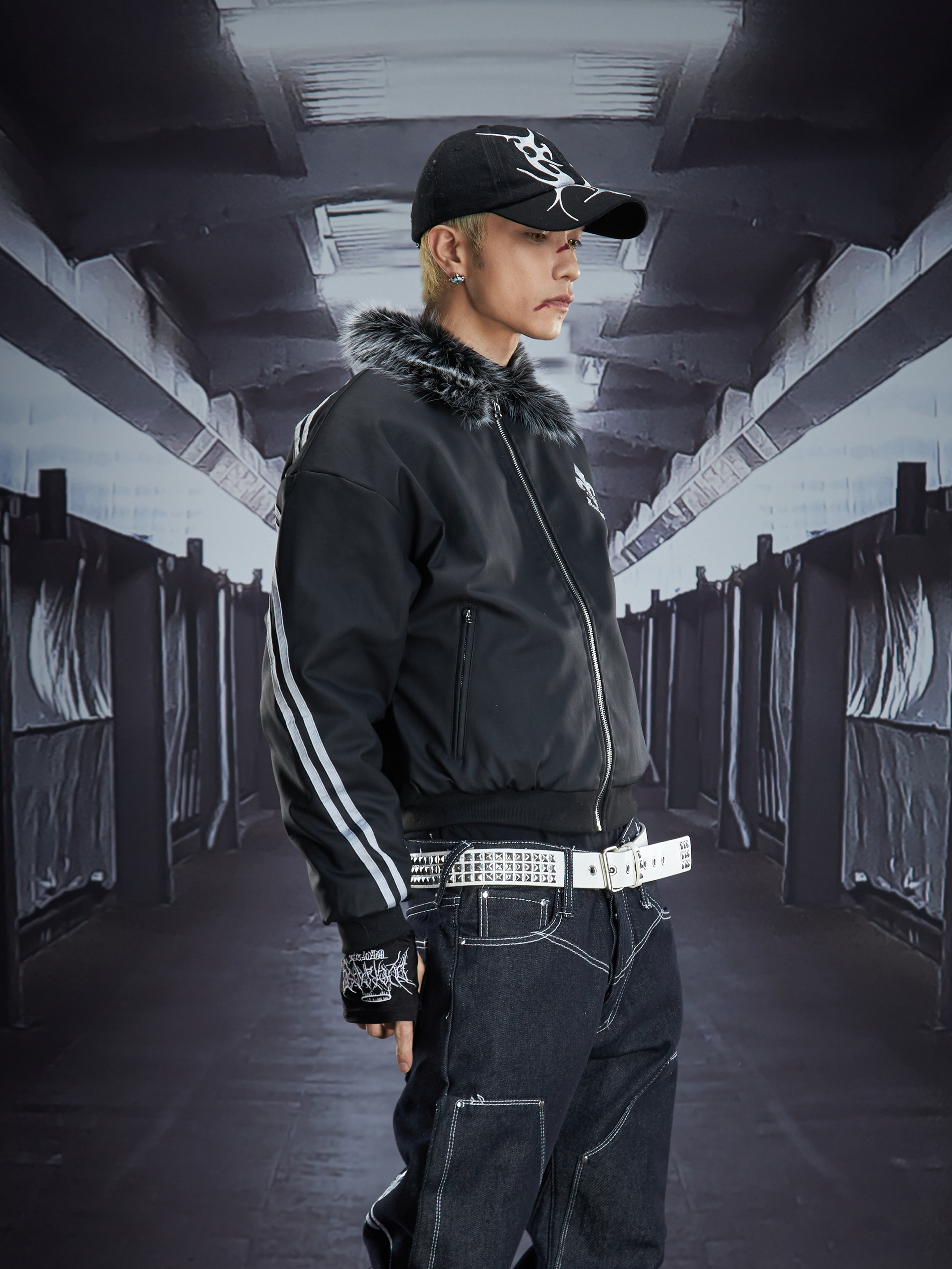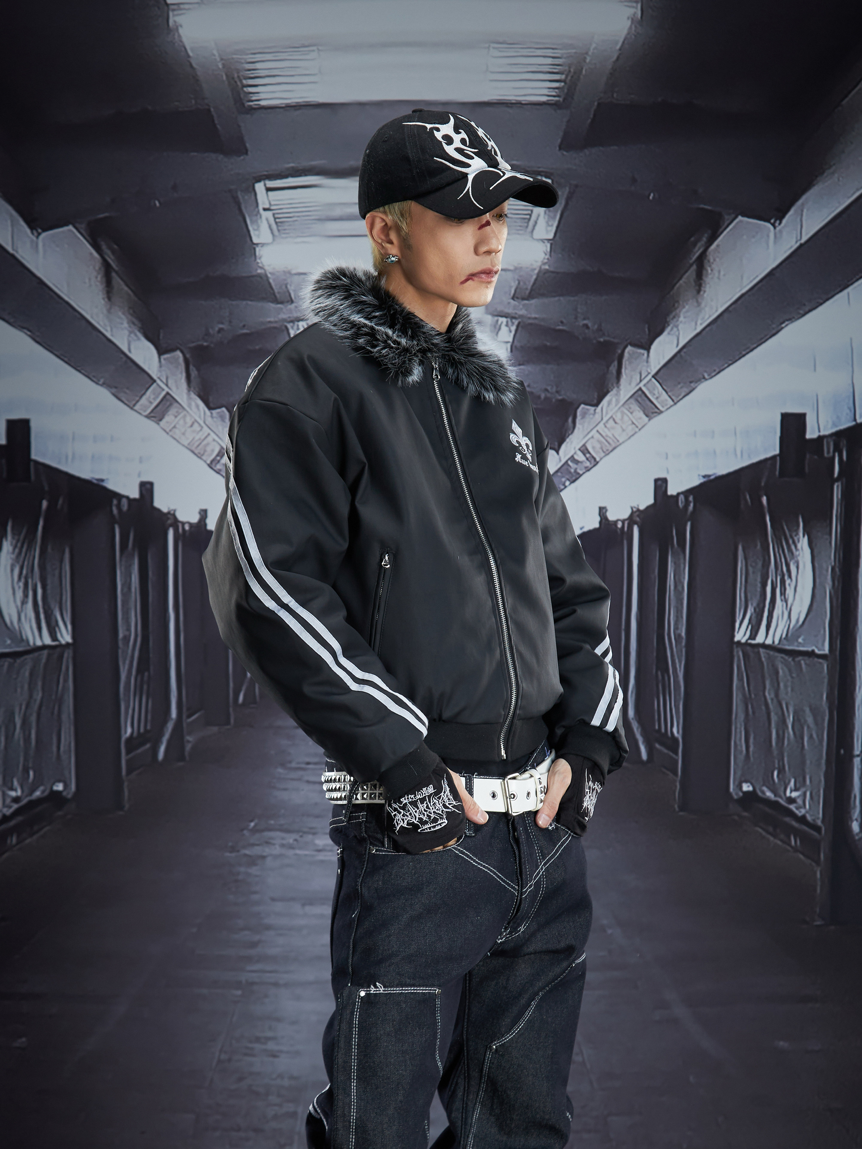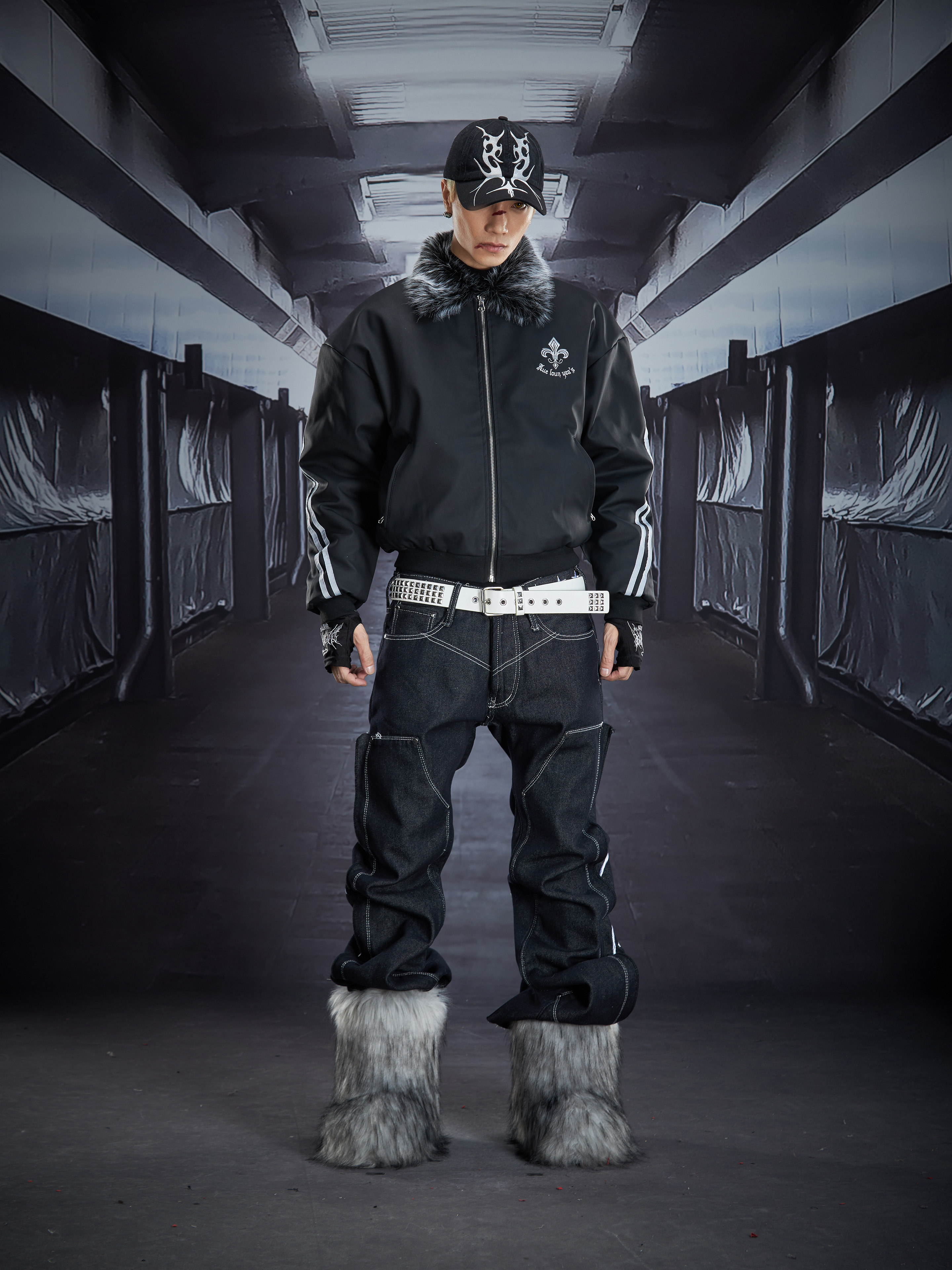 Lapel Fake Fur Striped Embroidery Cropped Zipper PU Leather Jacket WN22837