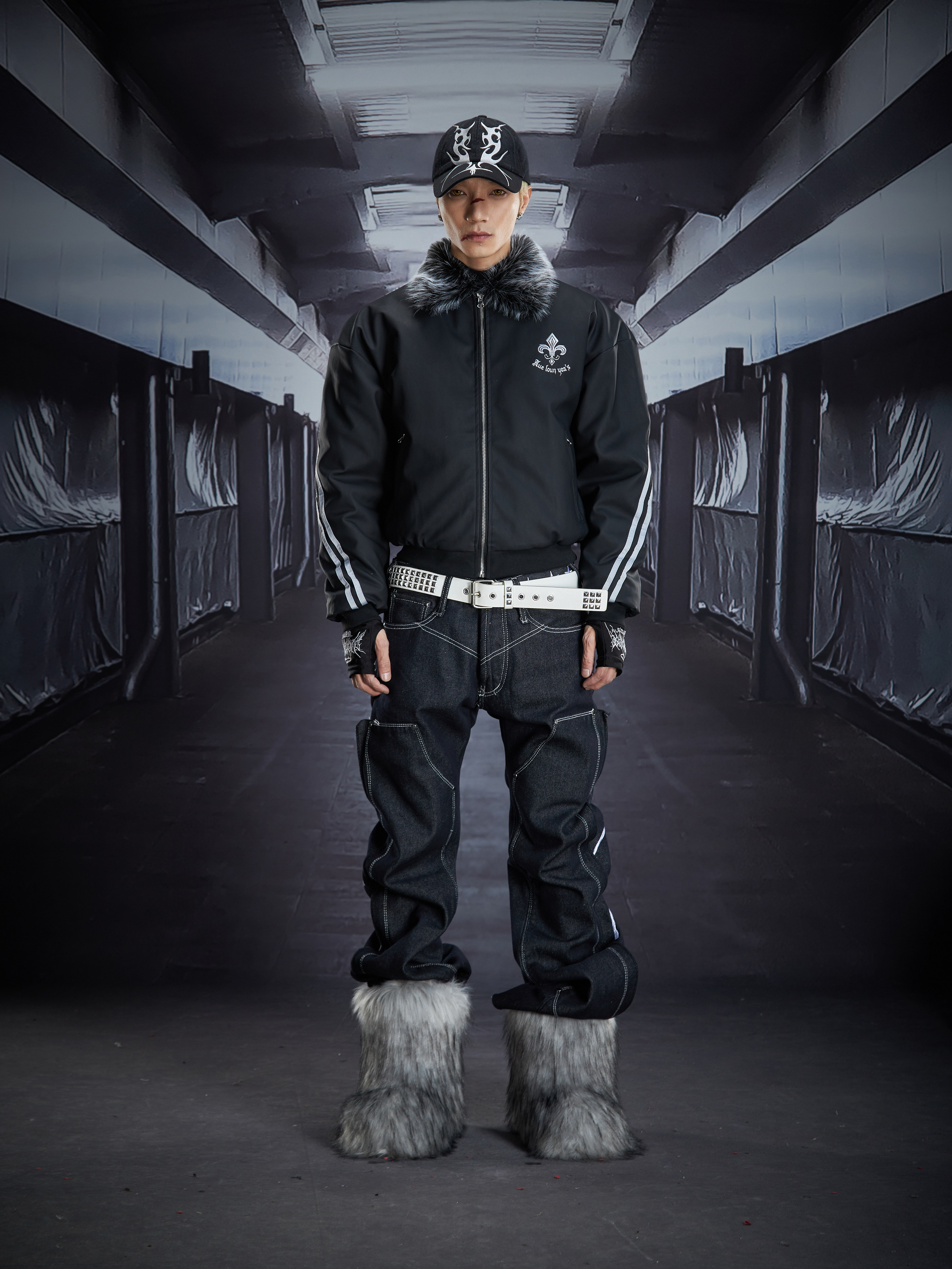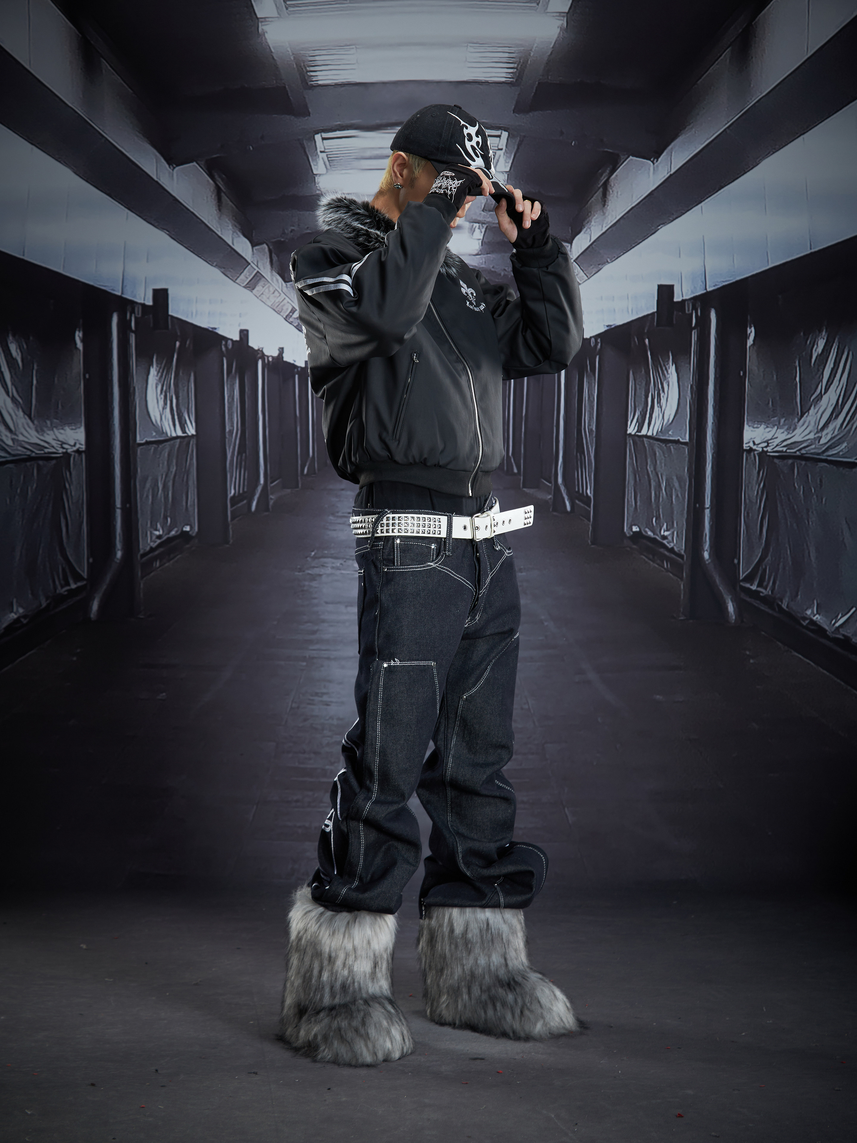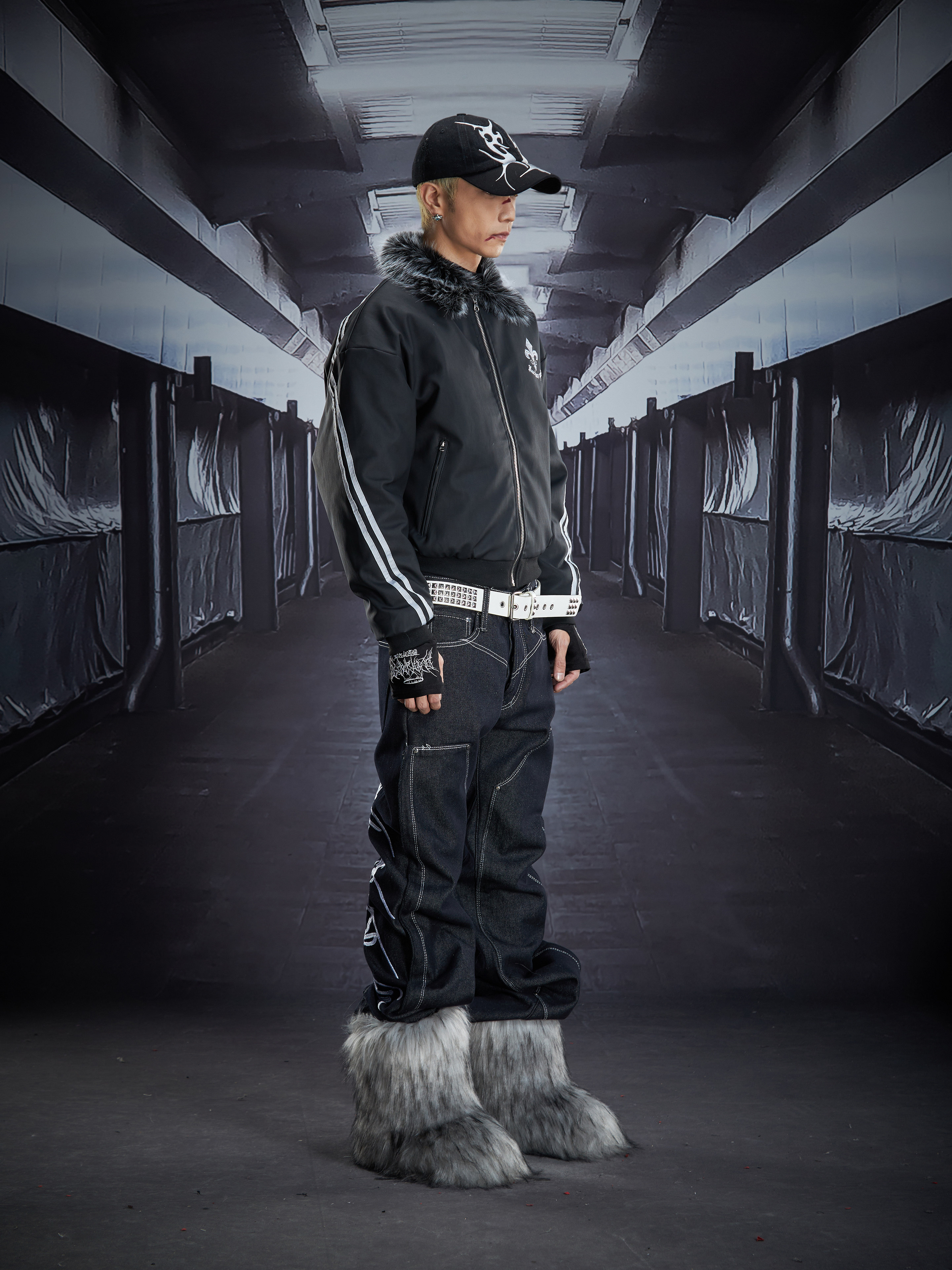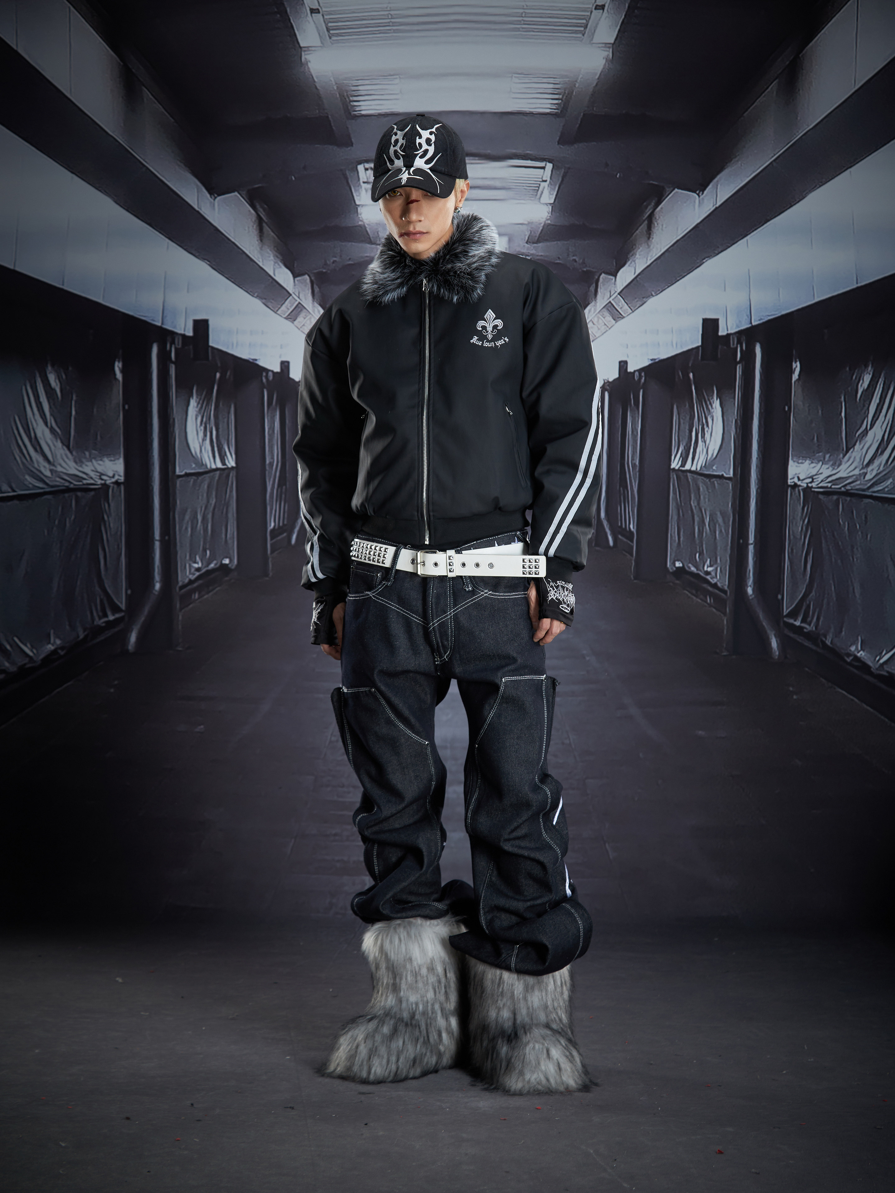 Lapel Fake Fur Striped Embroidery Cropped Zipper PU Leather Jacket WN22837