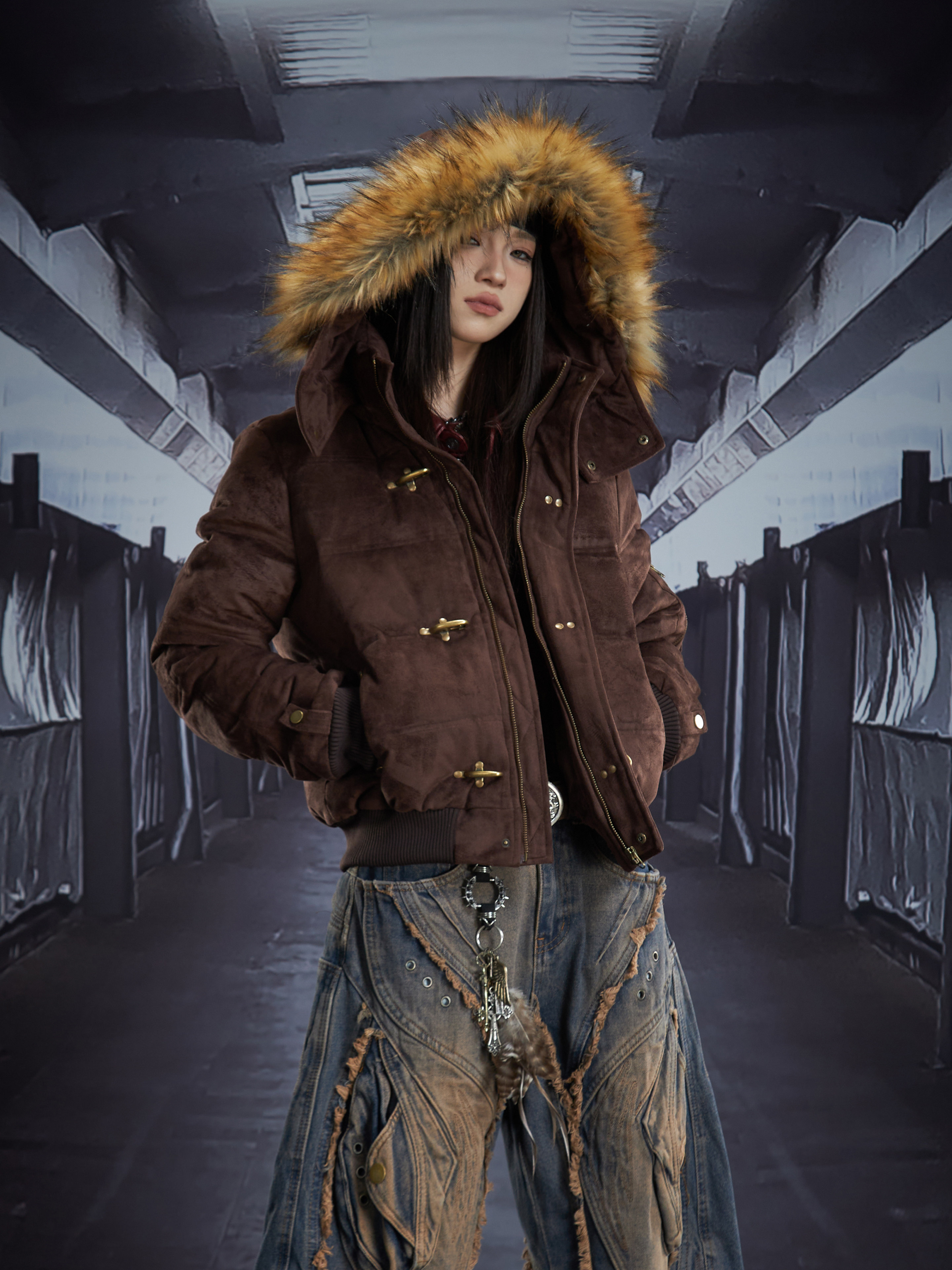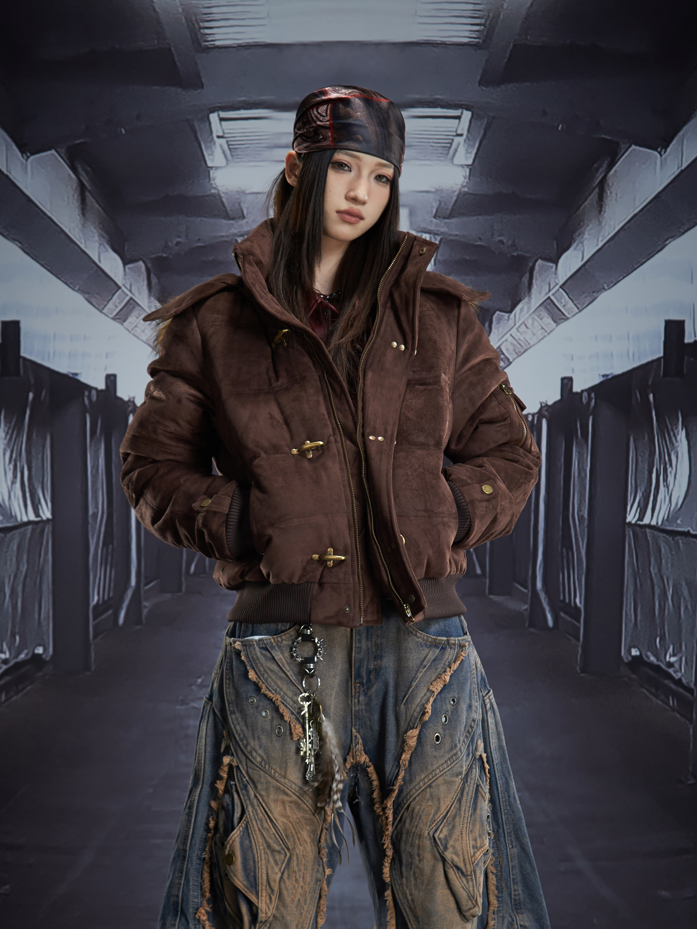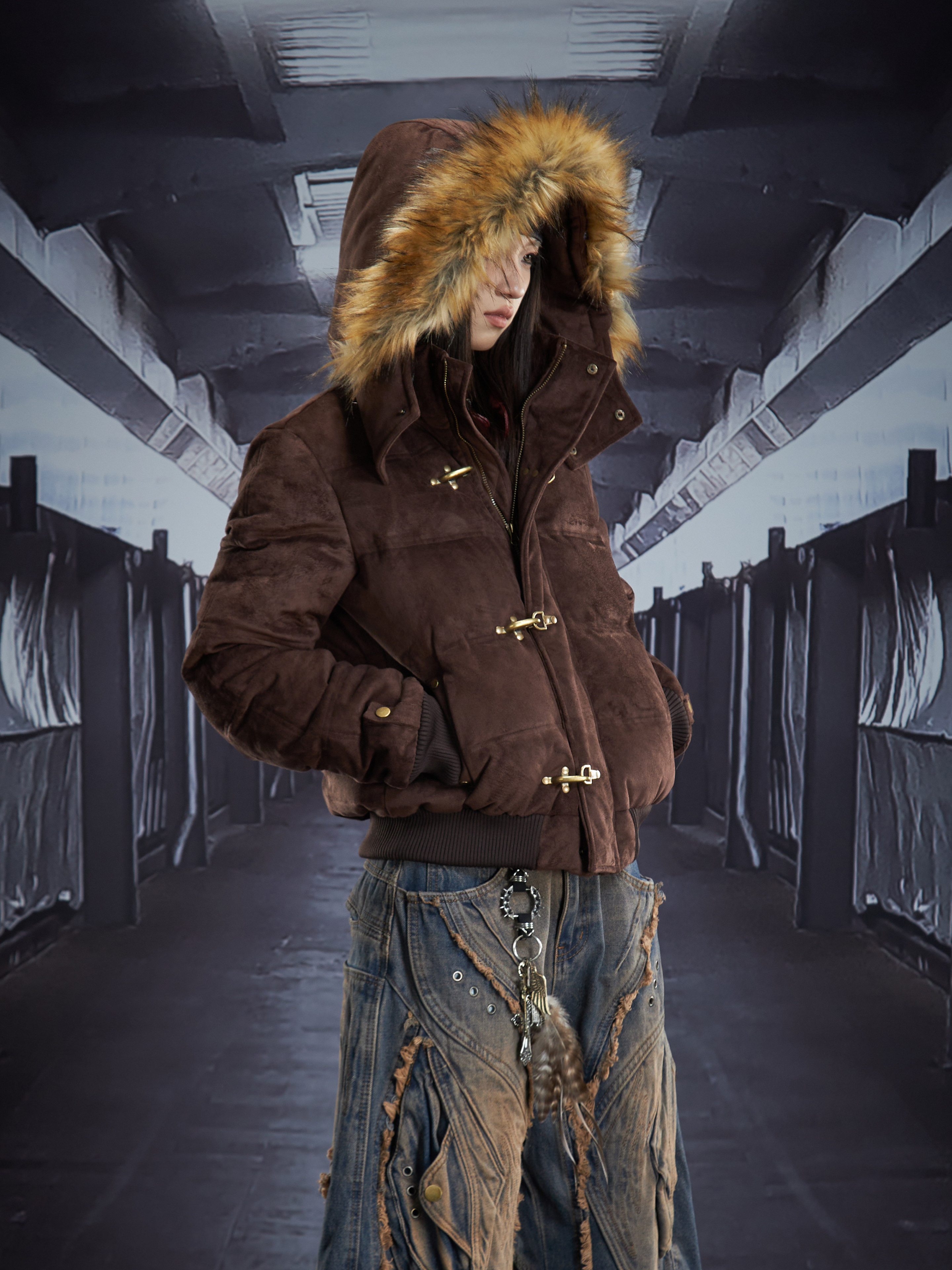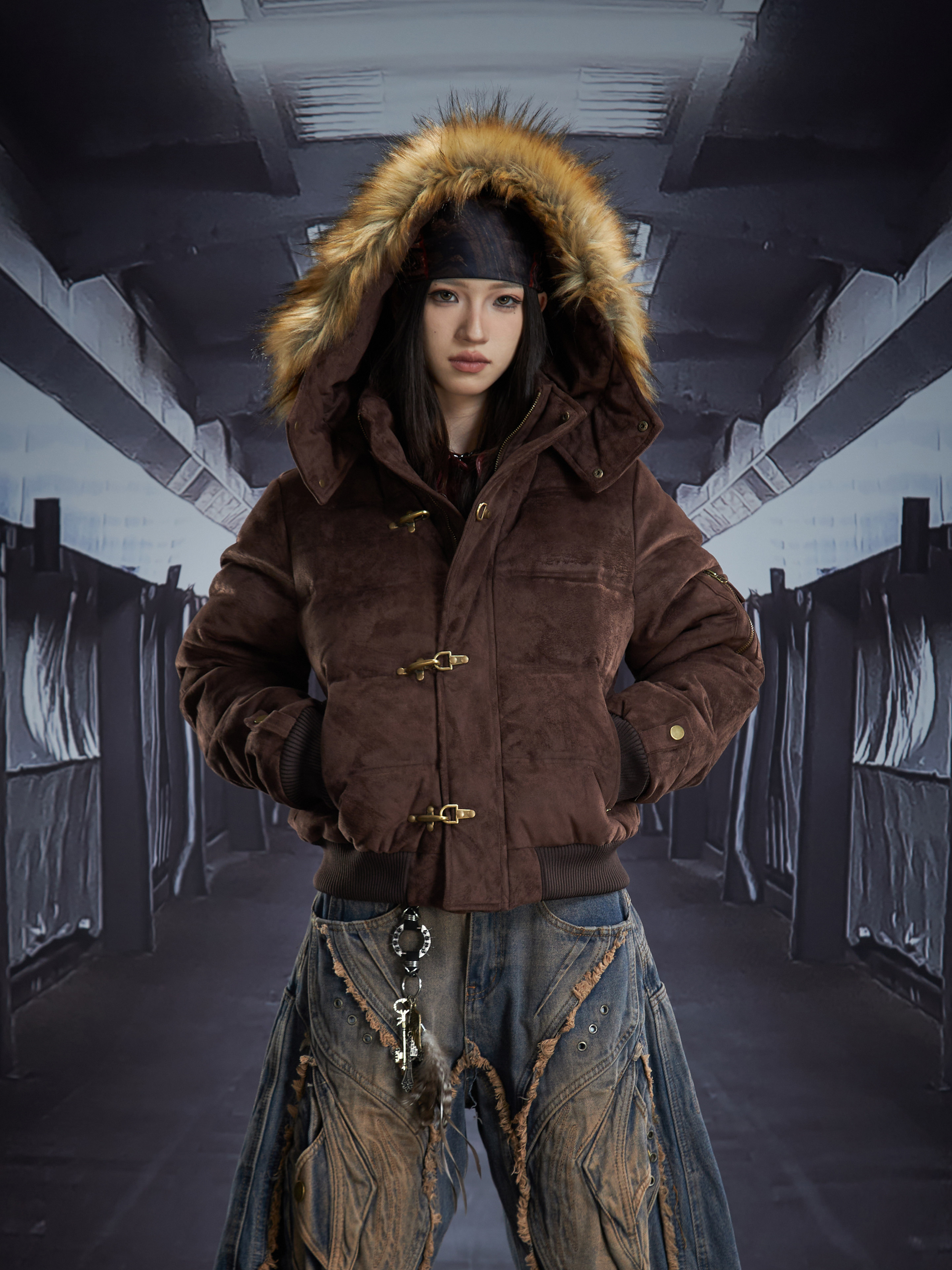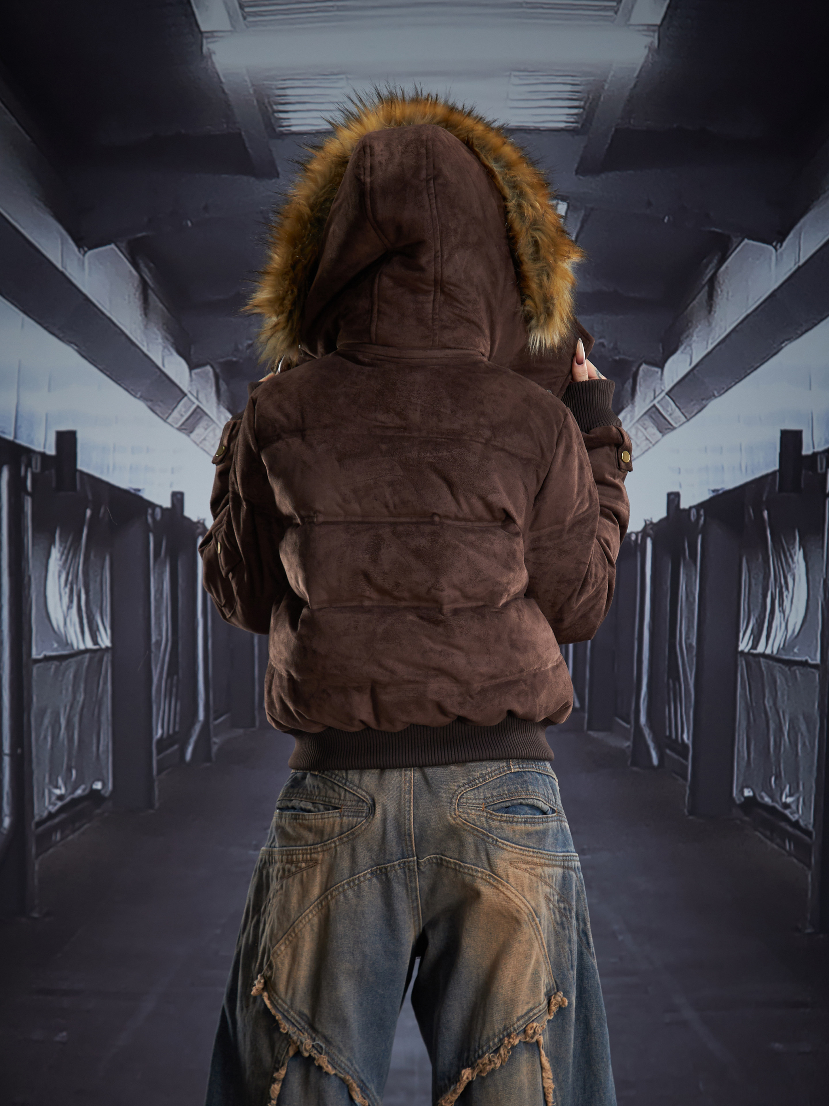 Detachable Hooded Suede Stand Neck Puffer Jacket WN22877