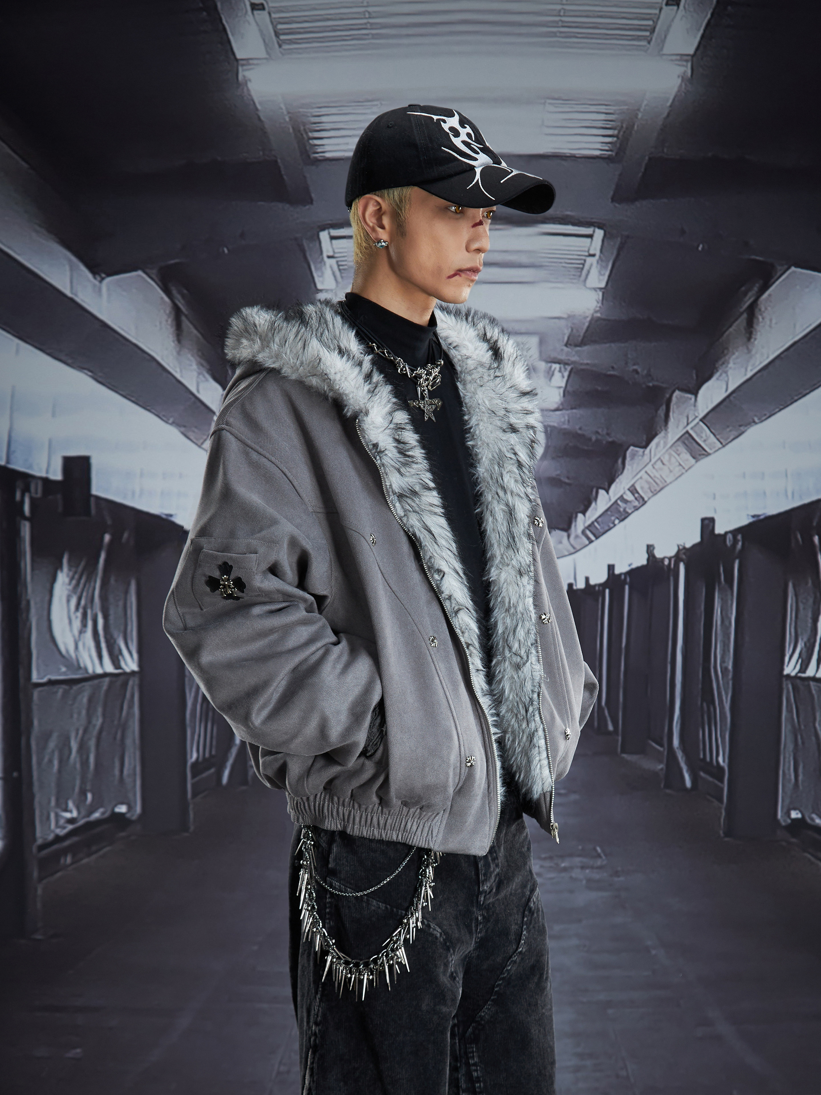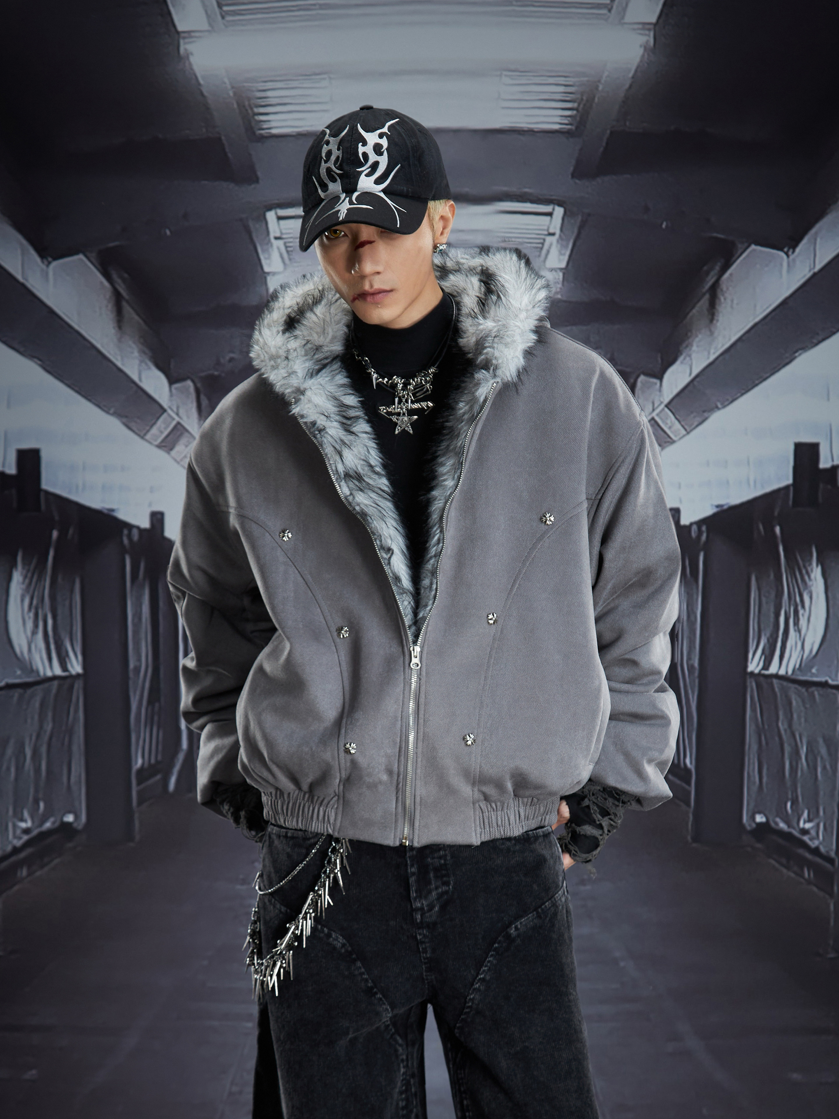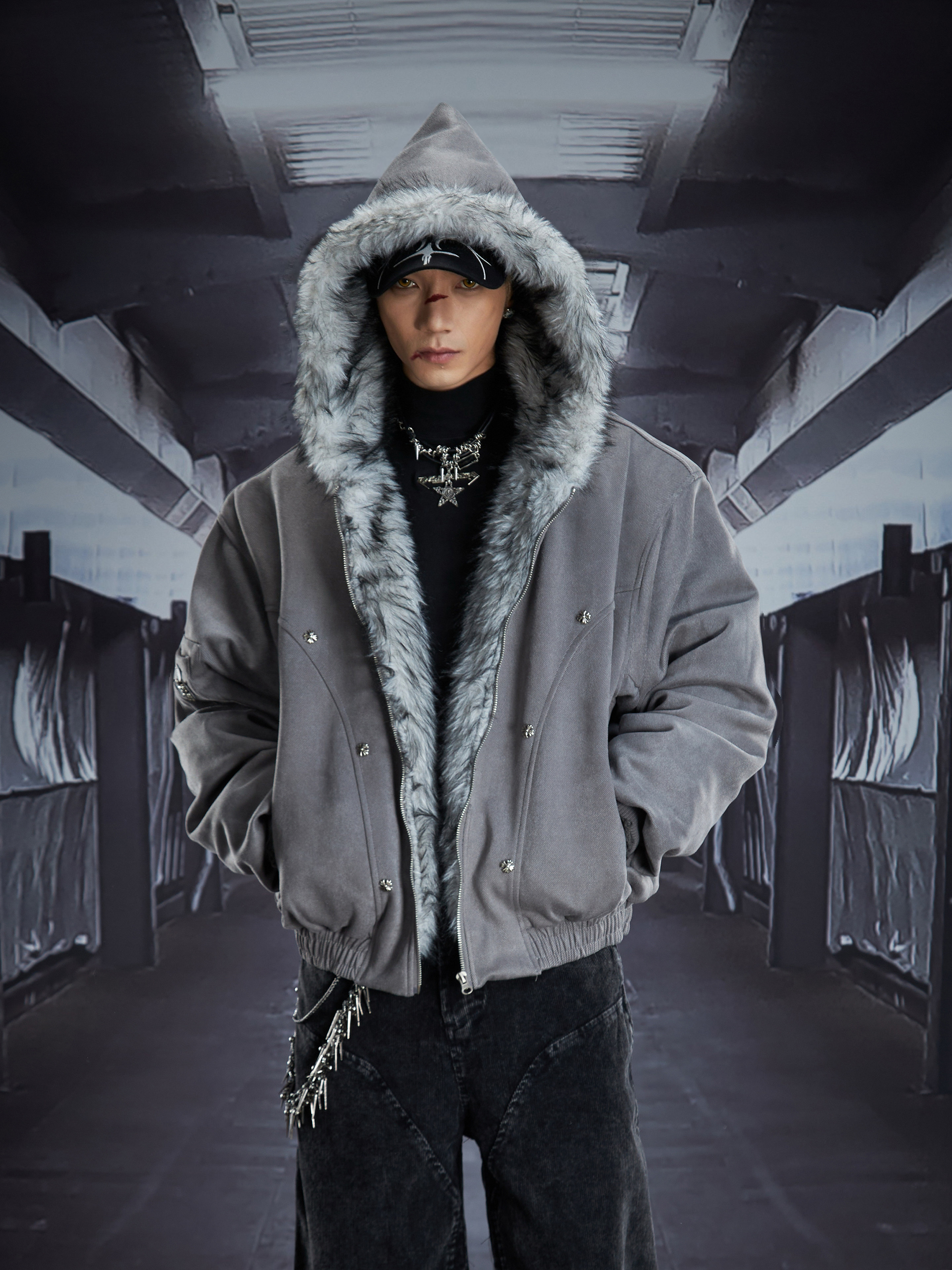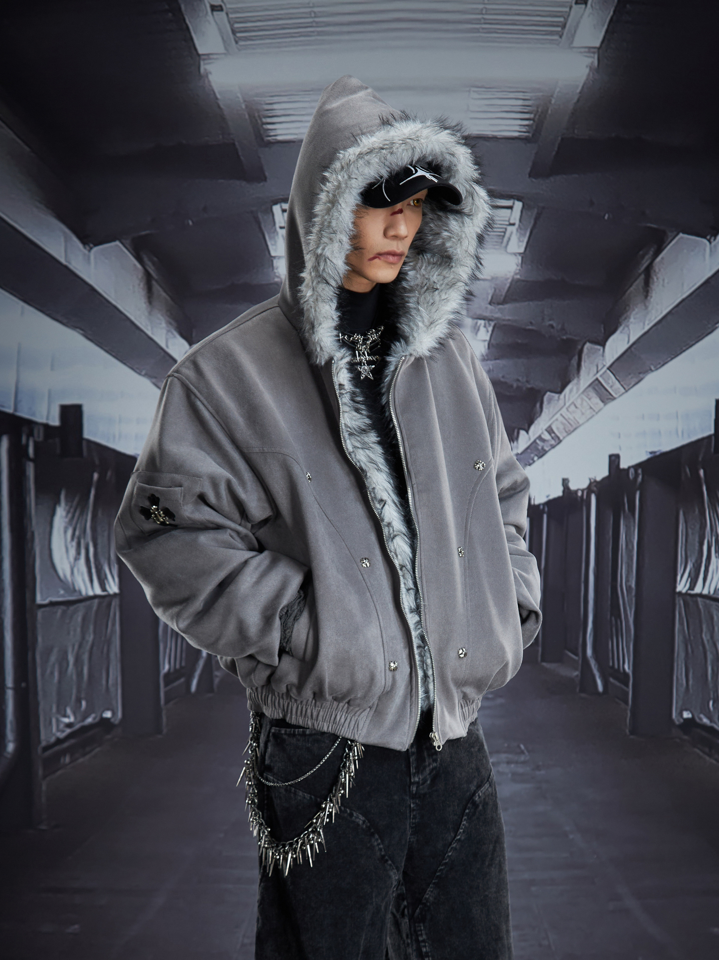 Metal Stud Patchwork Leather Fake Fur Hooded Padded Jacket WN22879