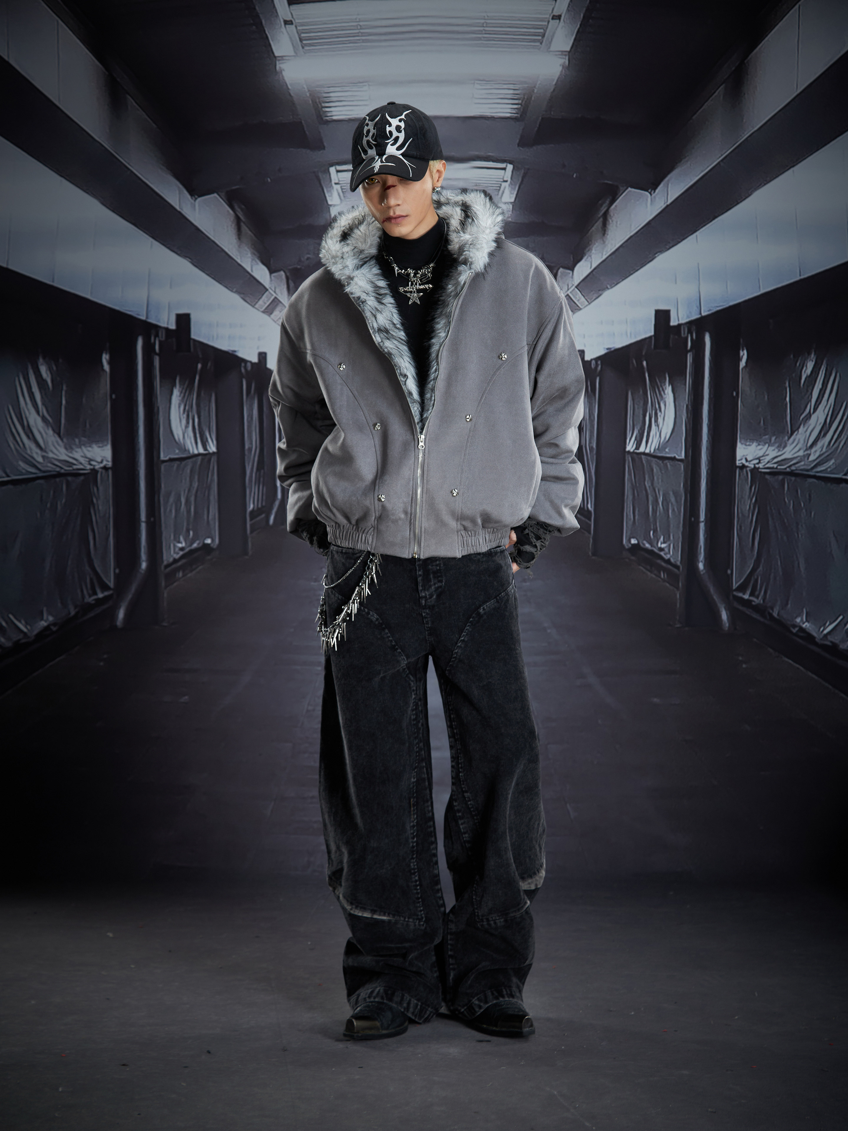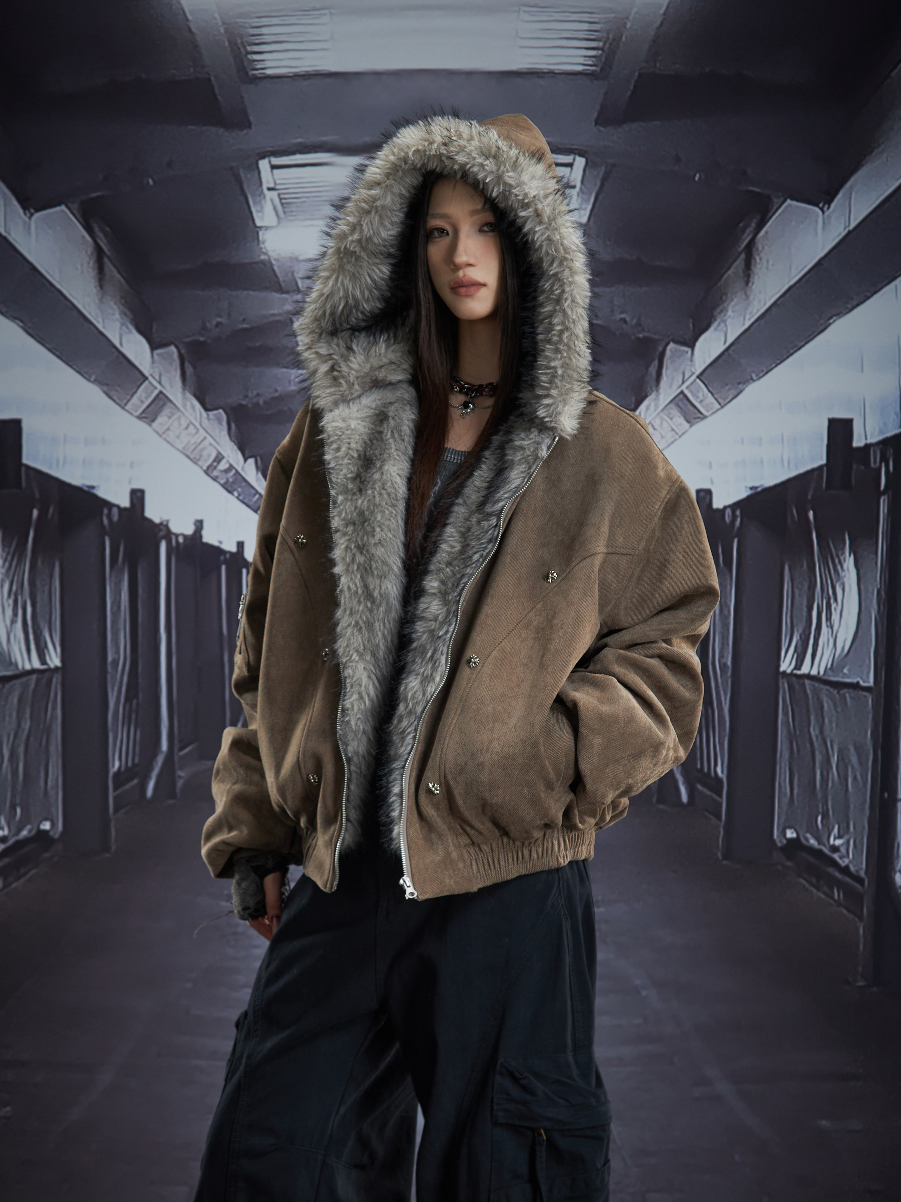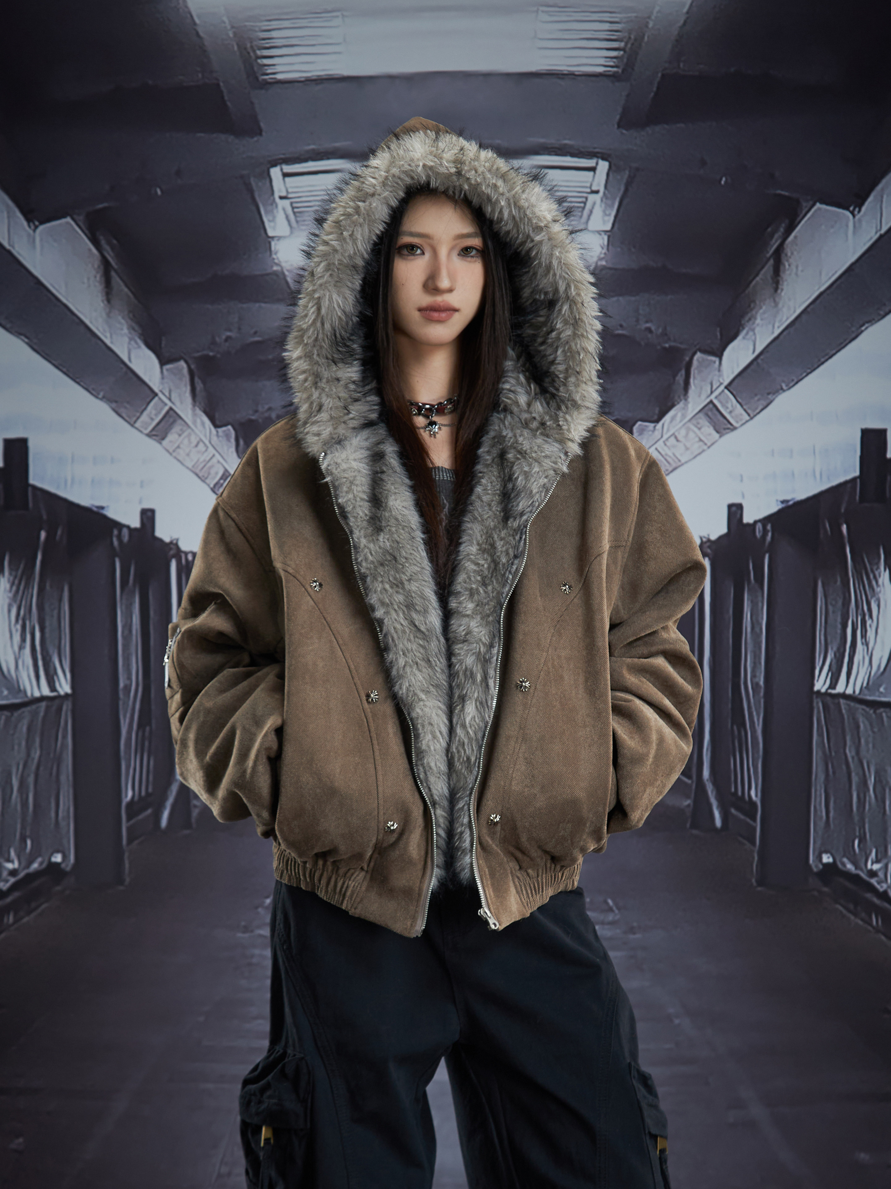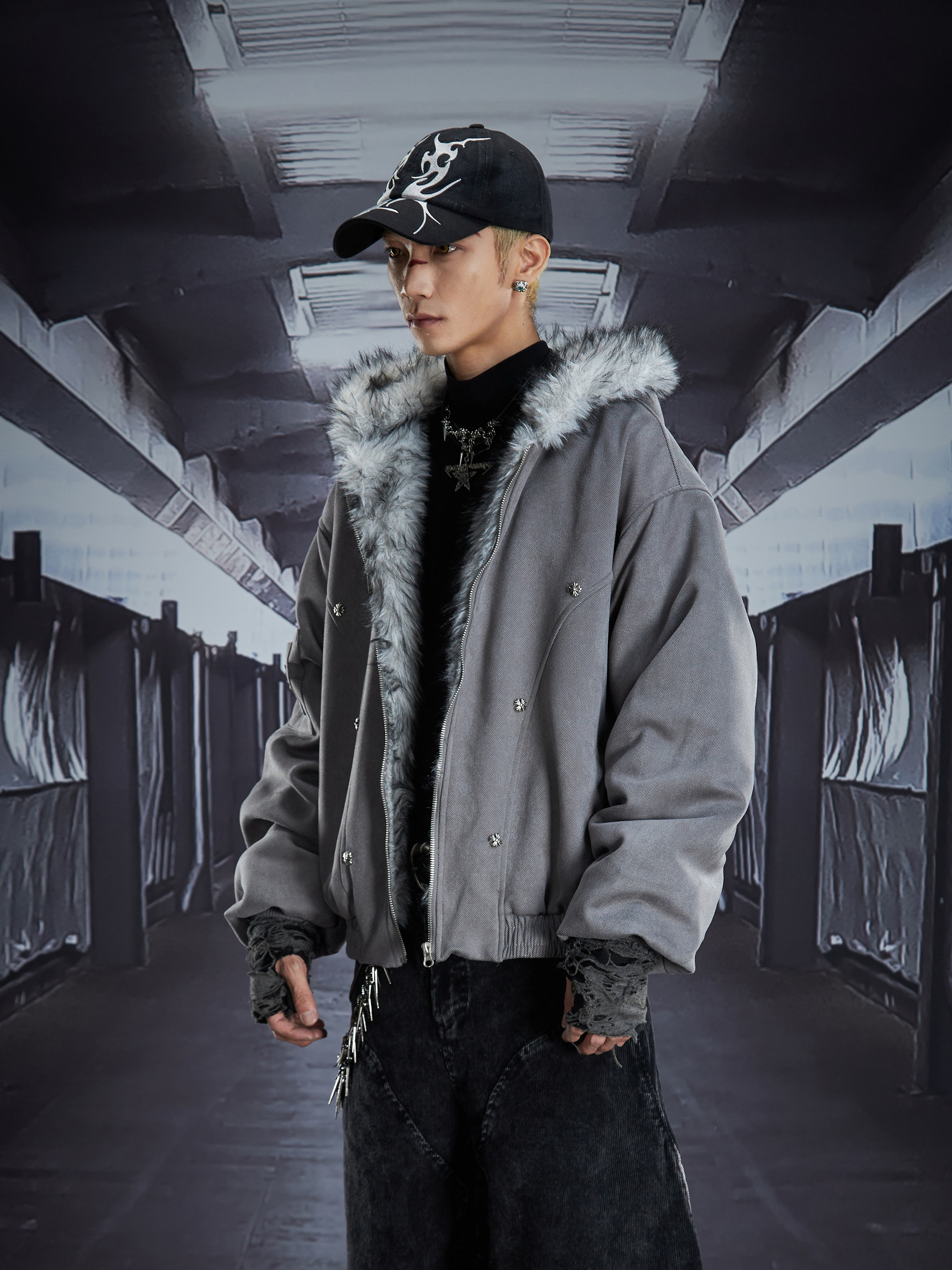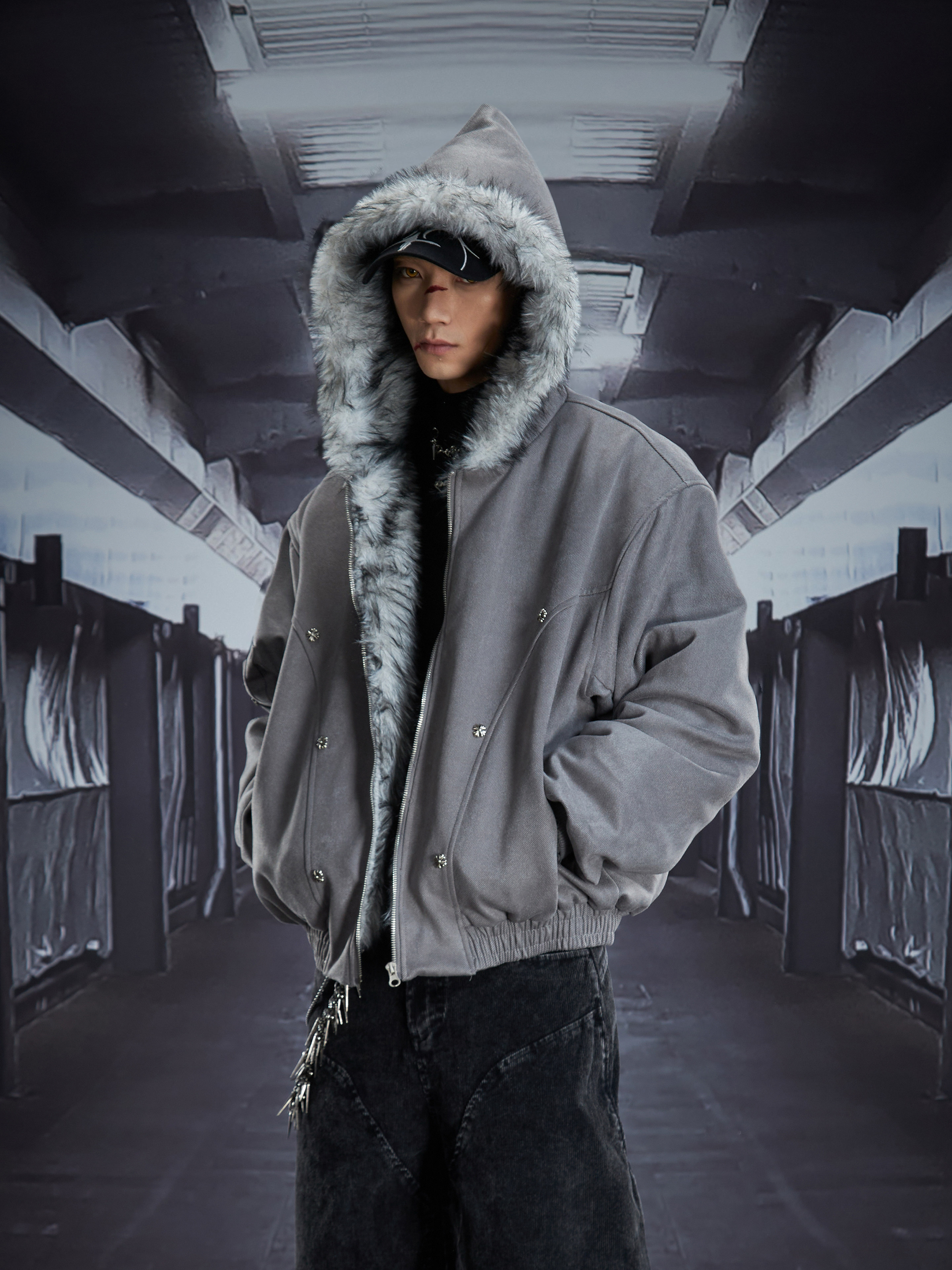 Metal Stud Patchwork Leather Fake Fur Hooded Padded Jacket WN22879