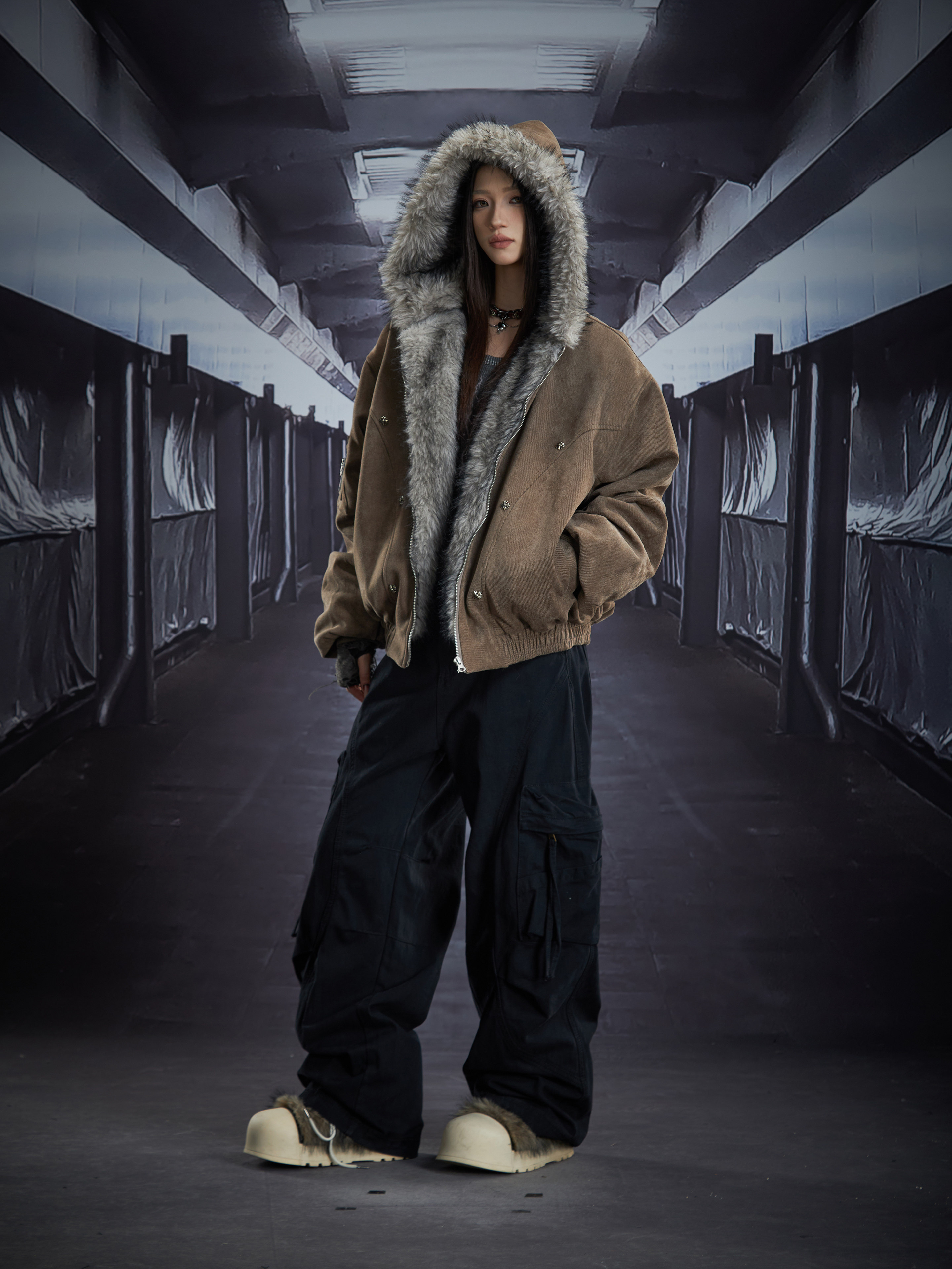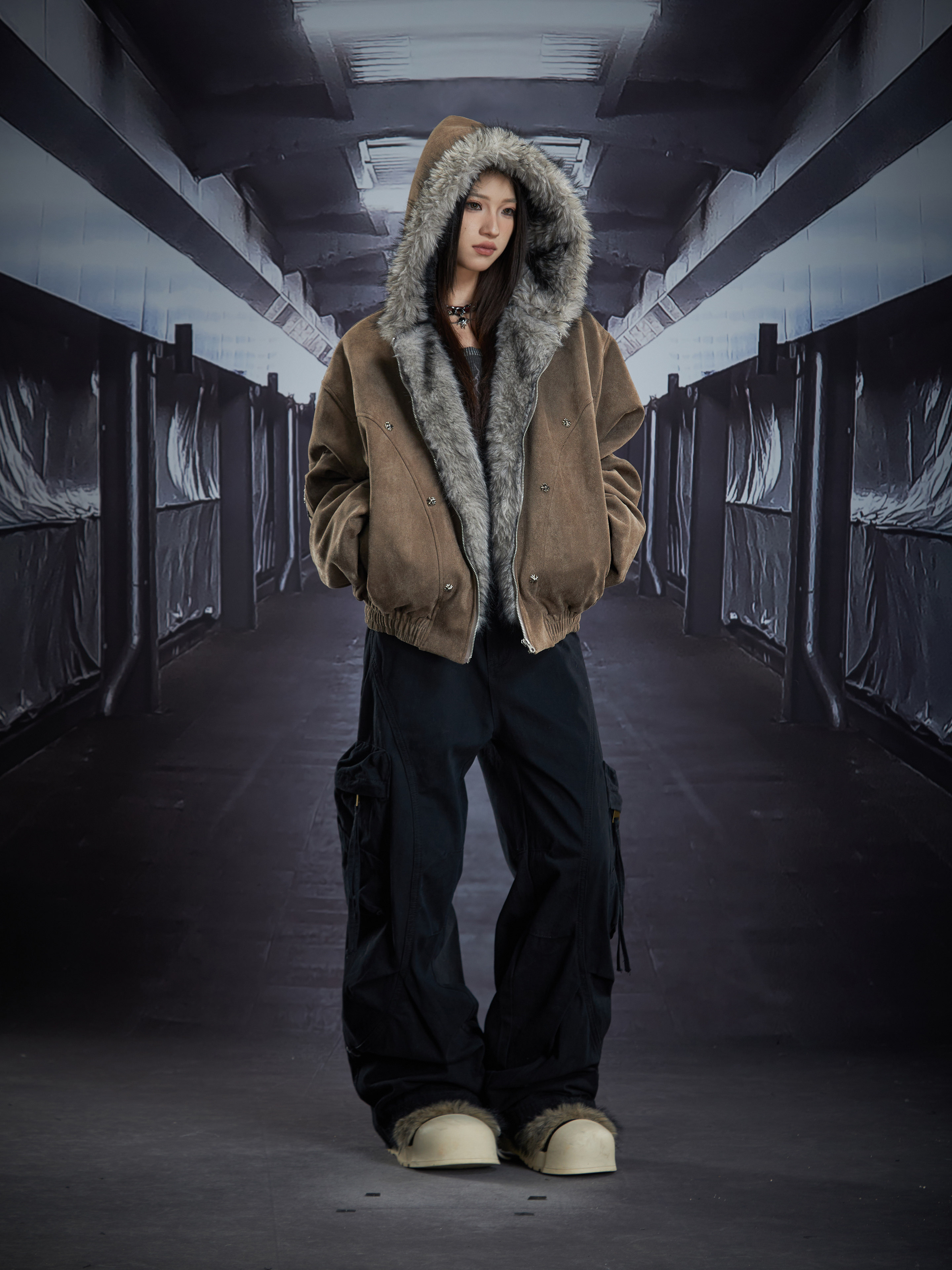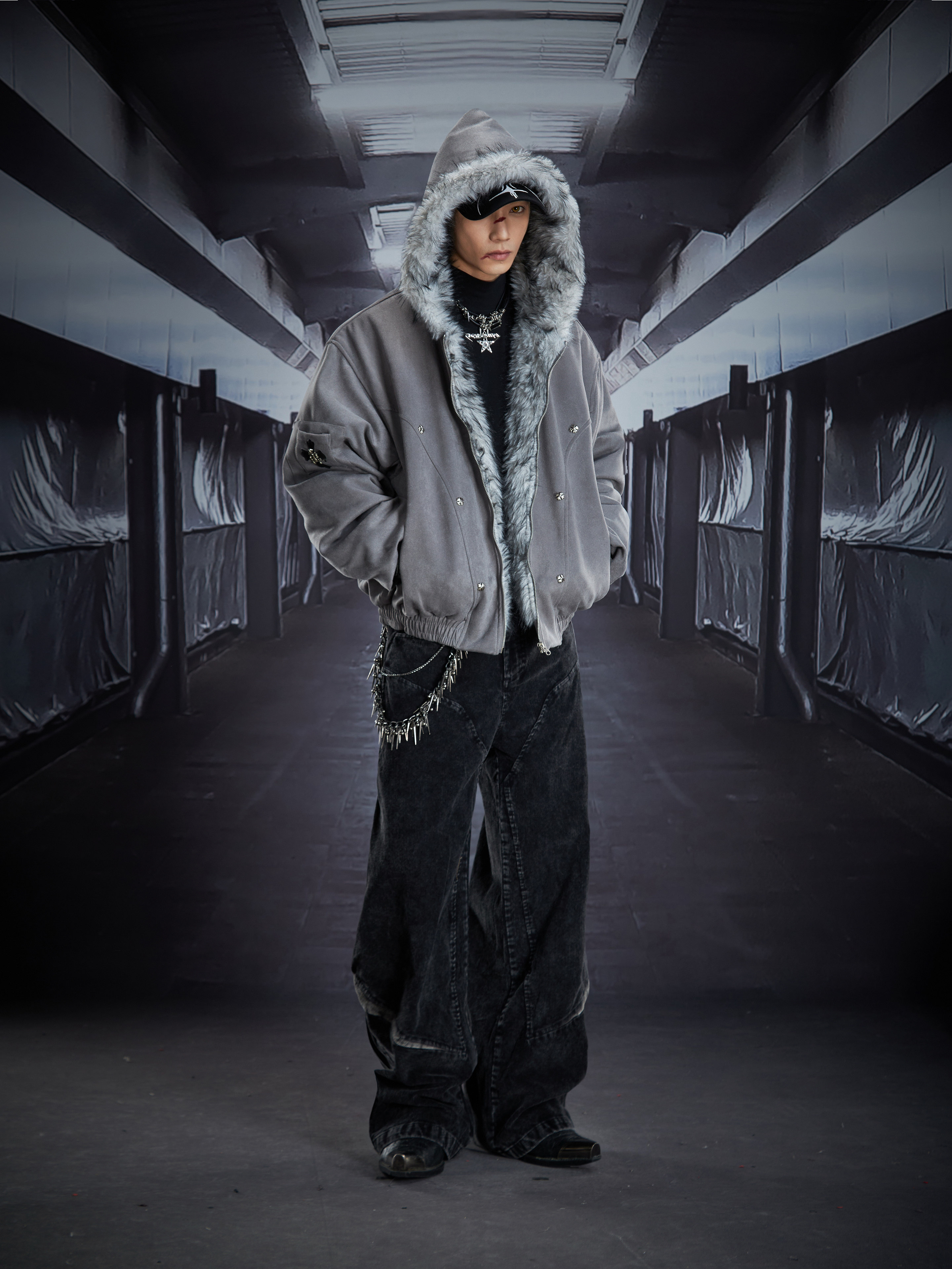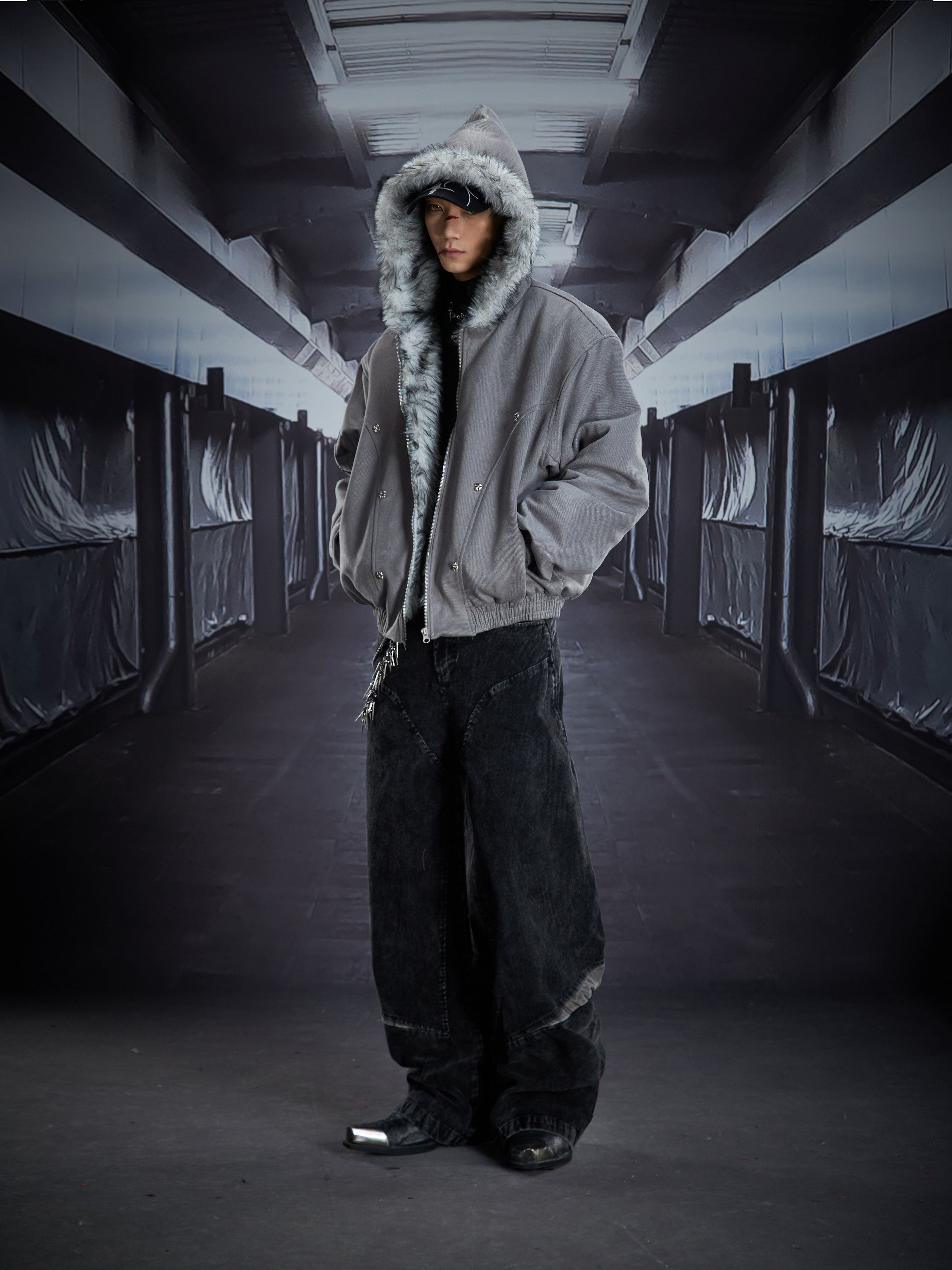 Metal Stud Patchwork Leather Fake Fur Hooded Padded Jacket WN22879