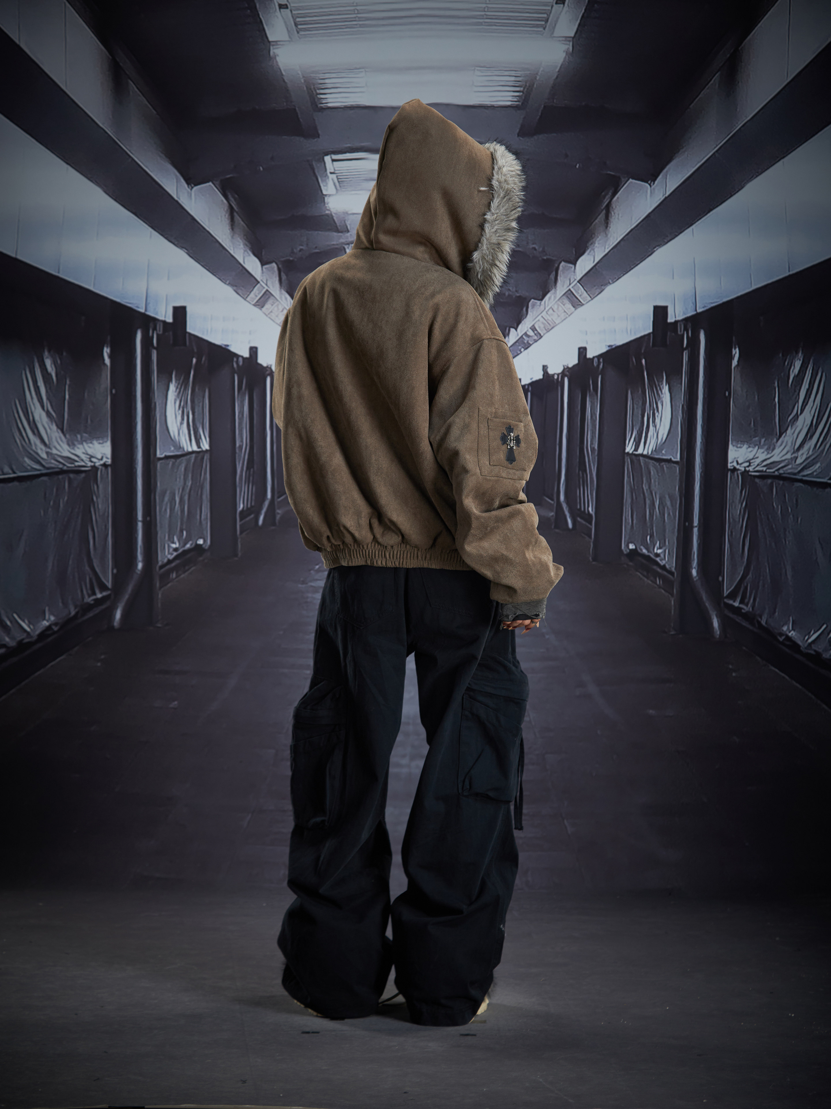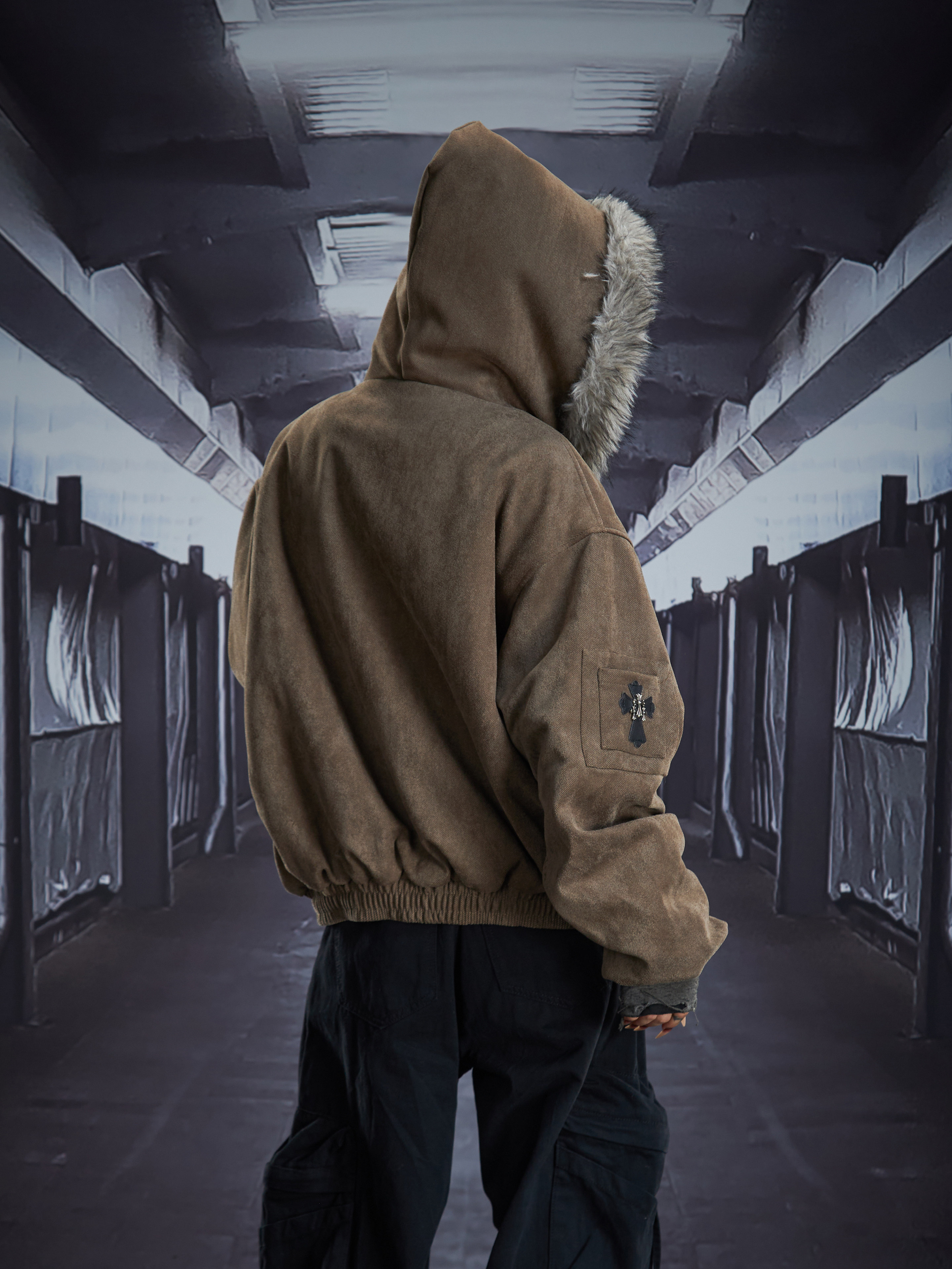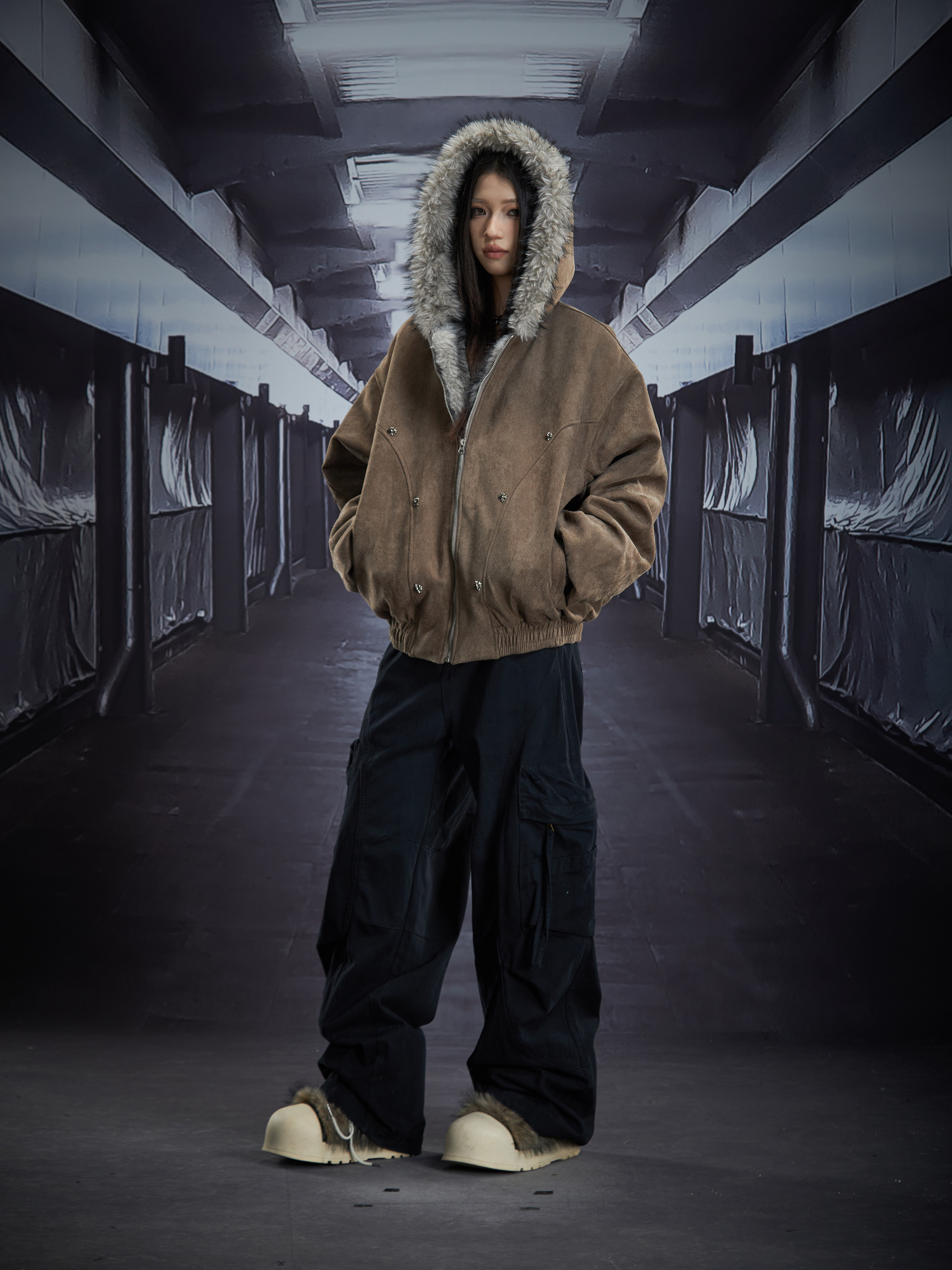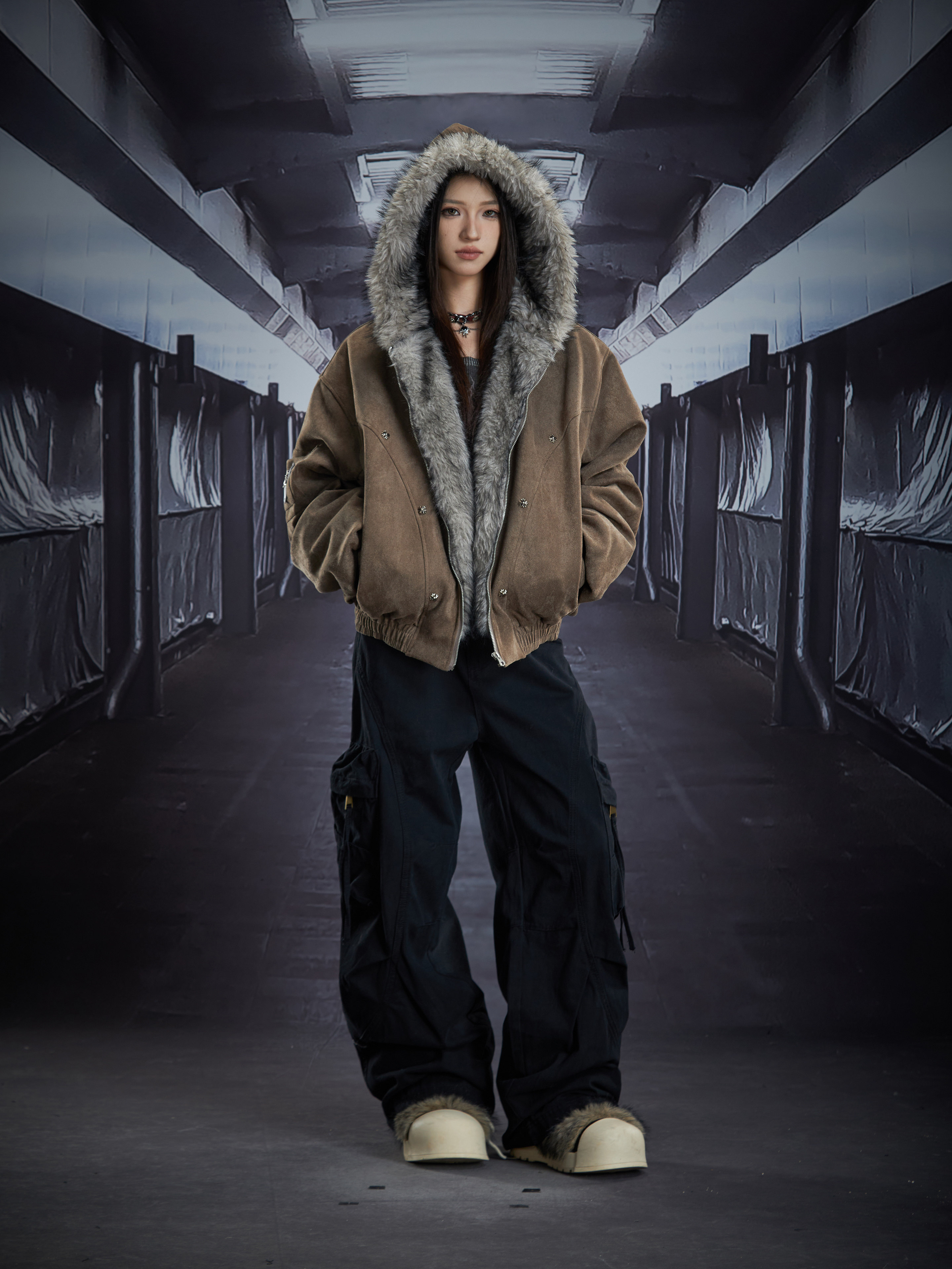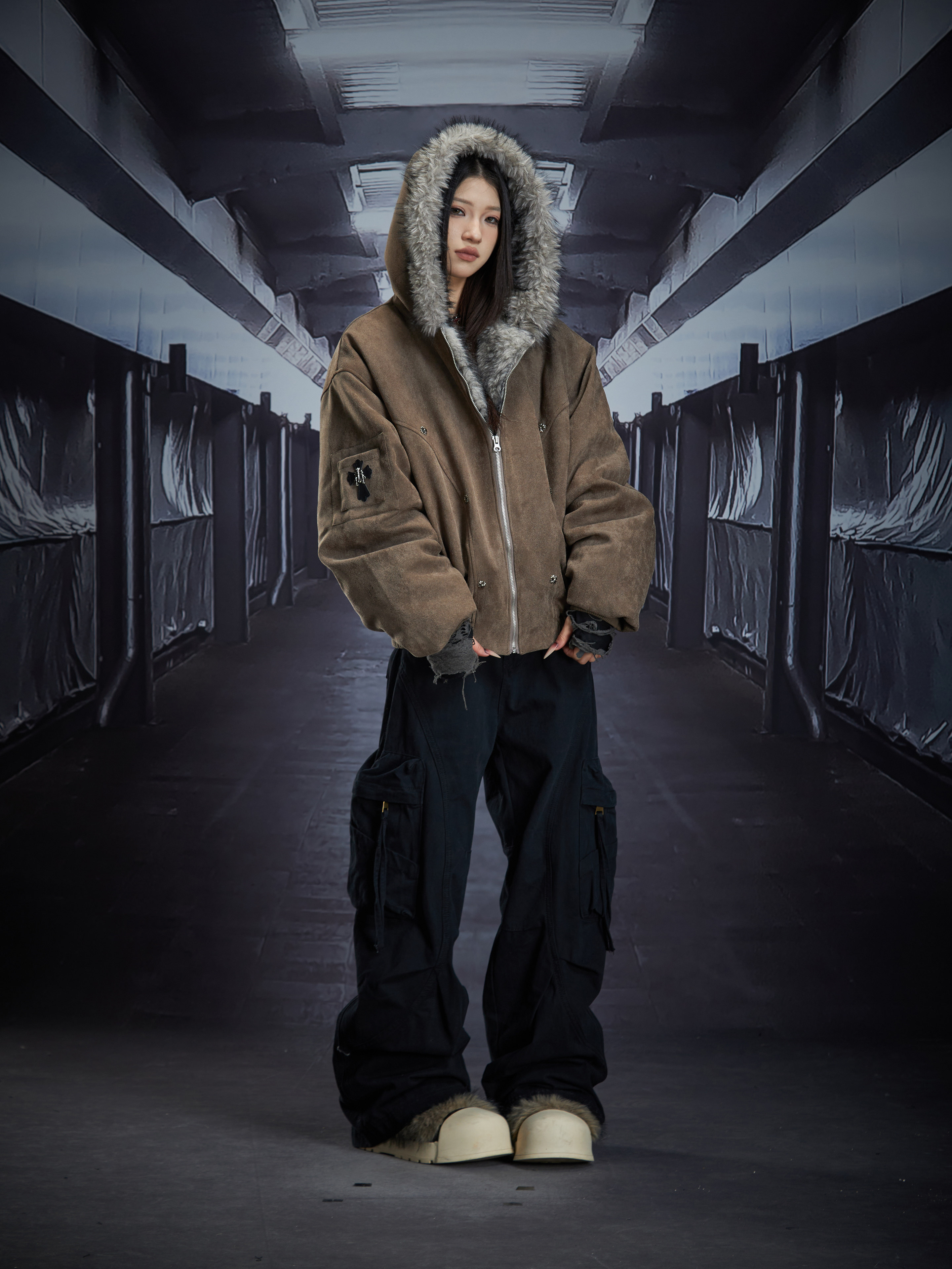 Metal Stud Patchwork Leather Fake Fur Hooded Padded Jacket WN22879