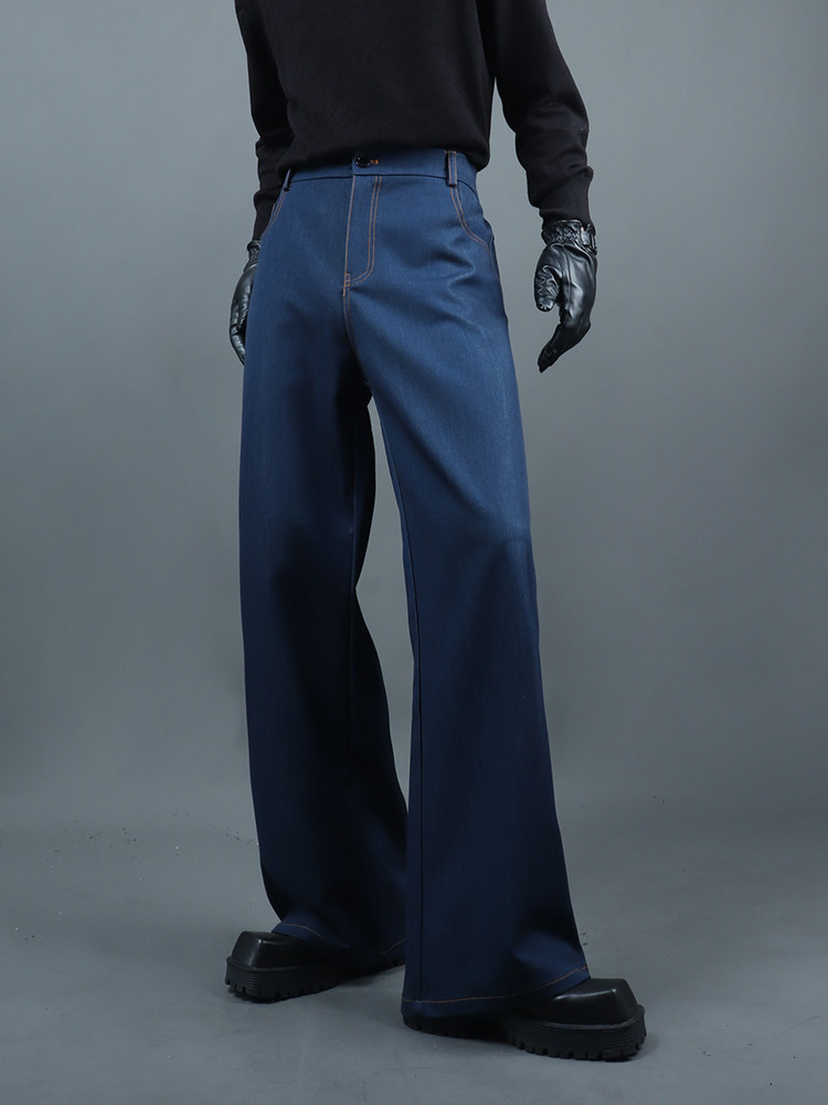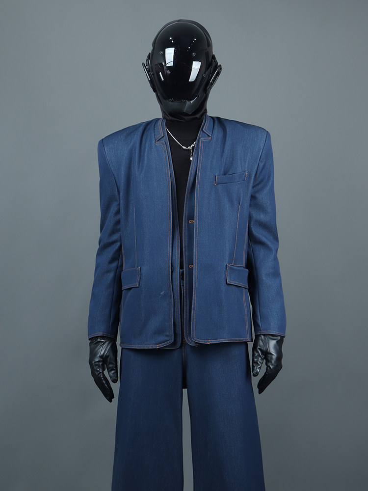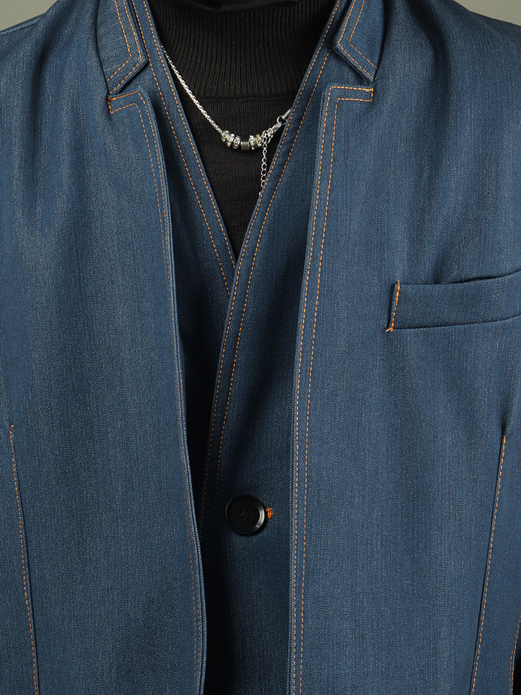 Standing-Collar Fake Layered Denim Jacket & Washed Wide Leg Denim Jeans Setup WN23757