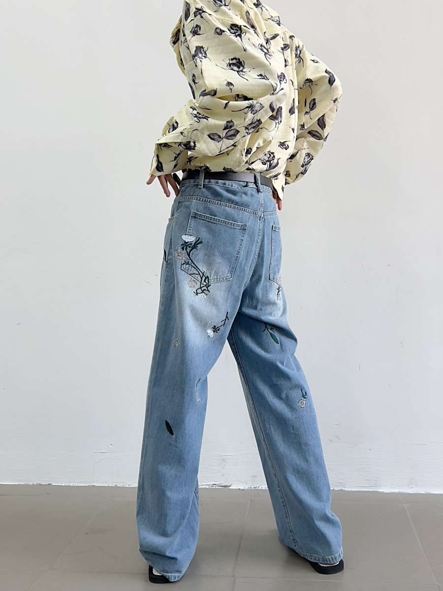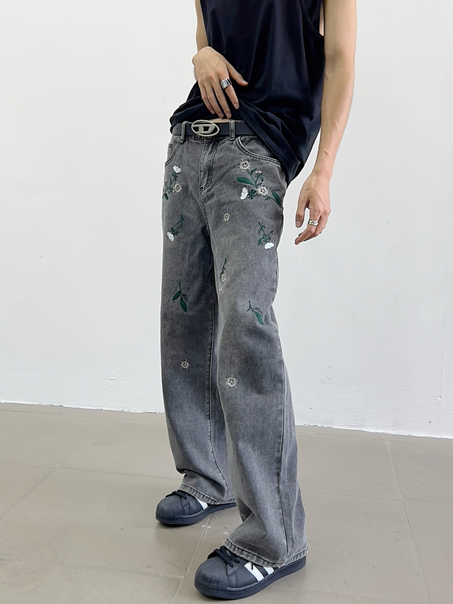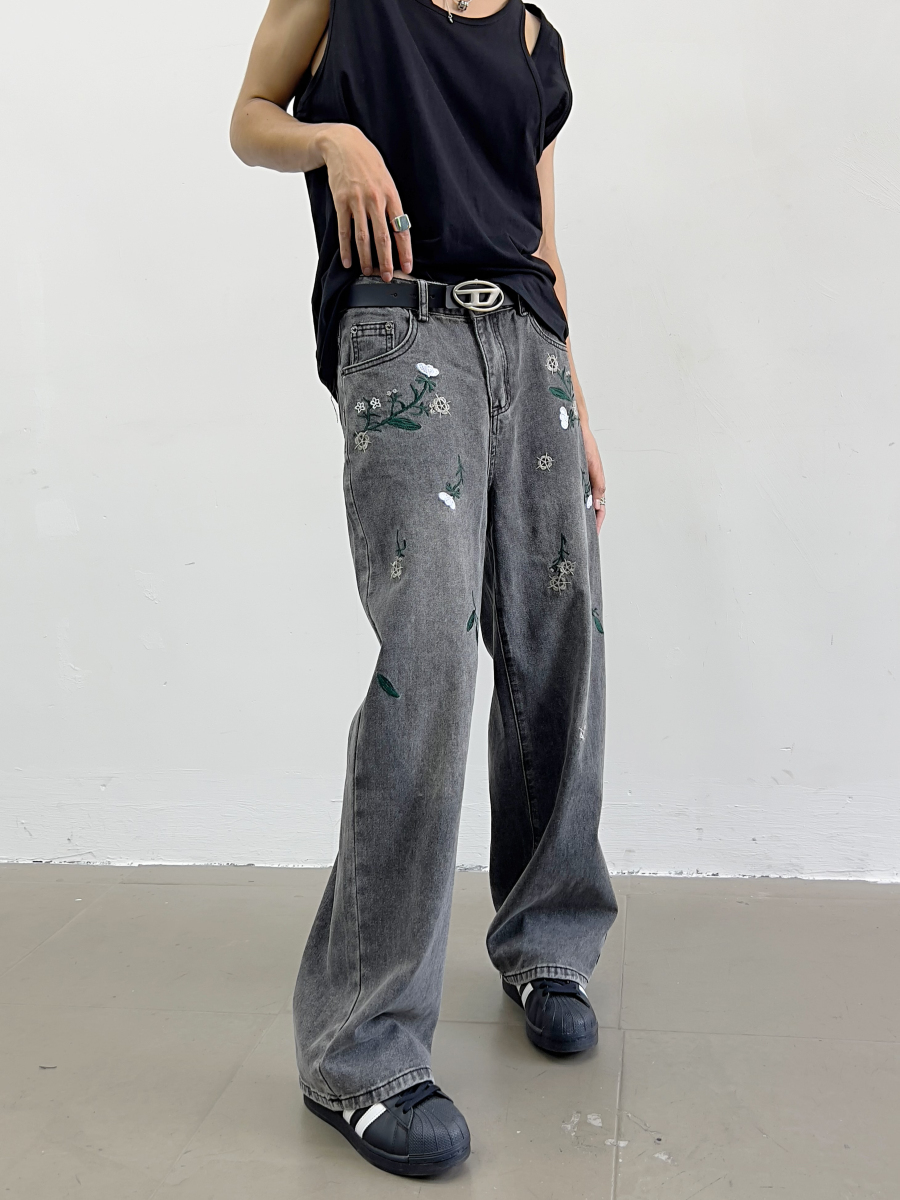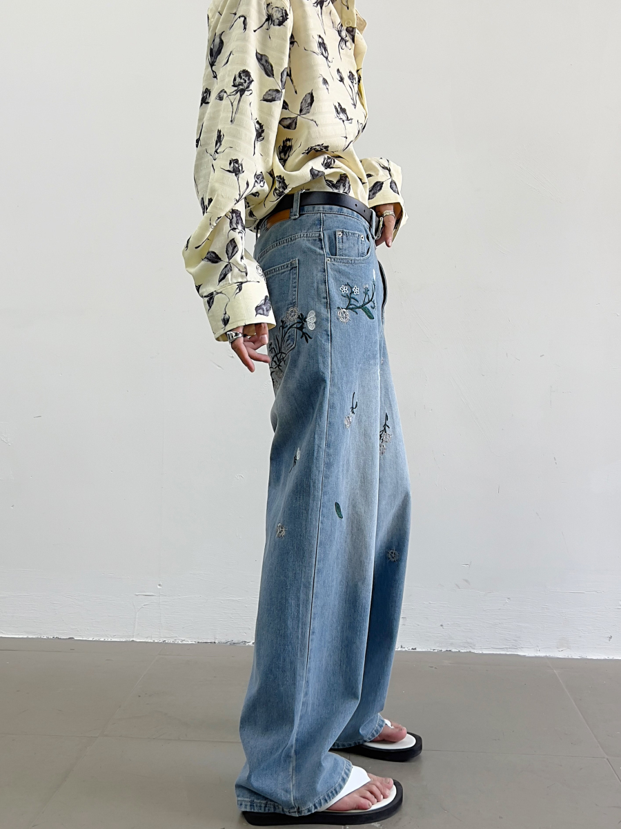 Flower Embroidery Wide-Leg Straight Denim Jeans WN7362