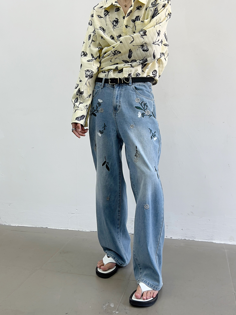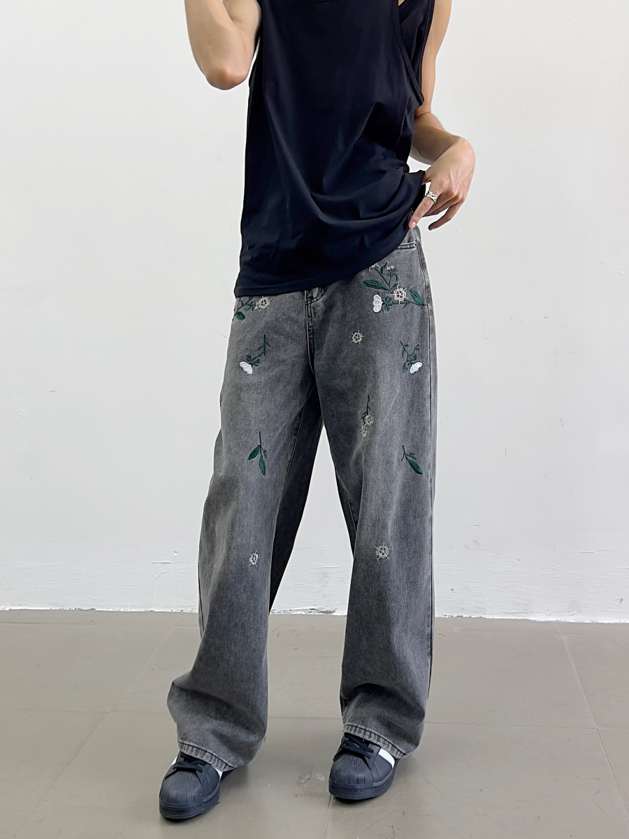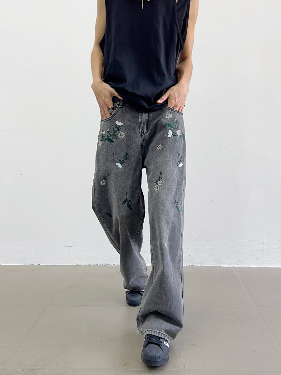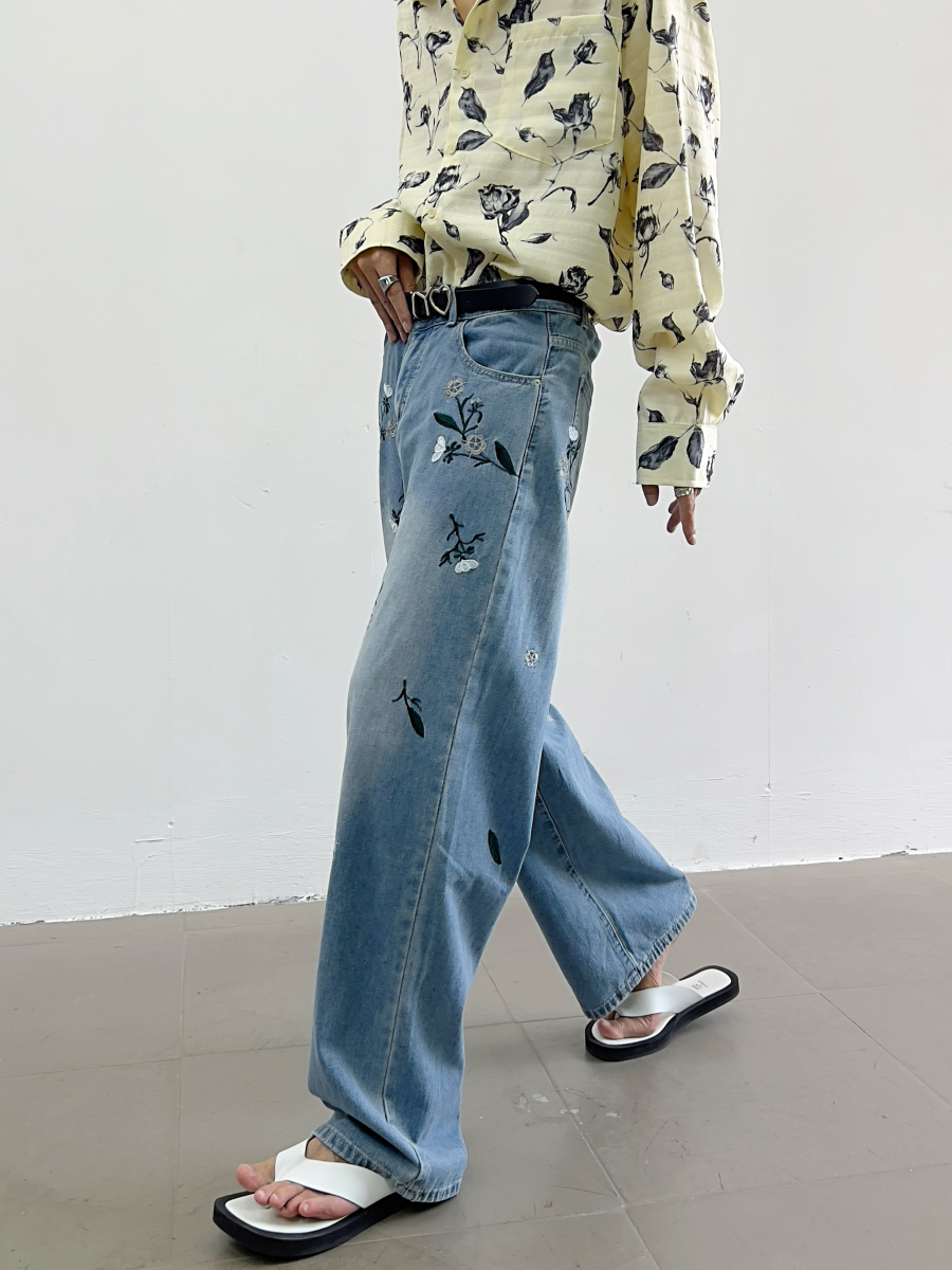 Flower Embroidery Wide-Leg Straight Denim Jeans WN7362