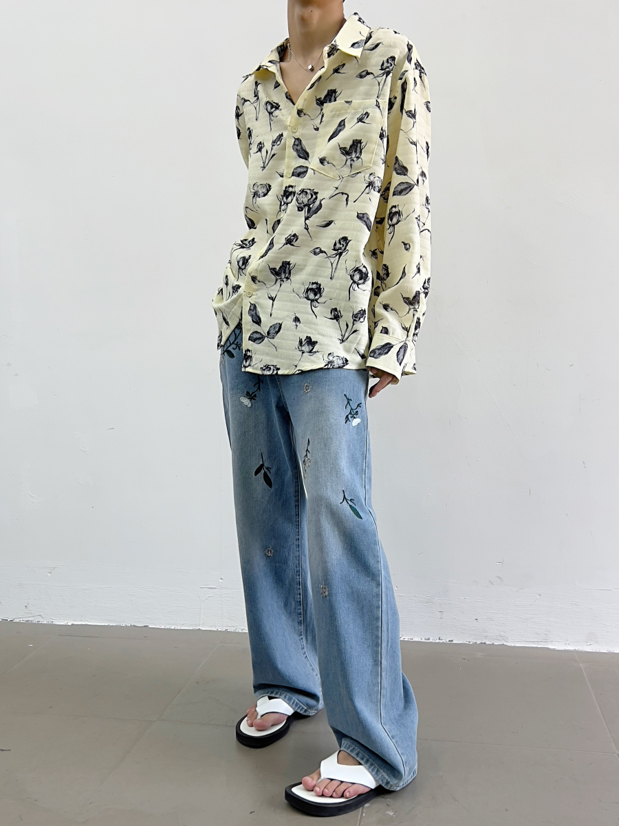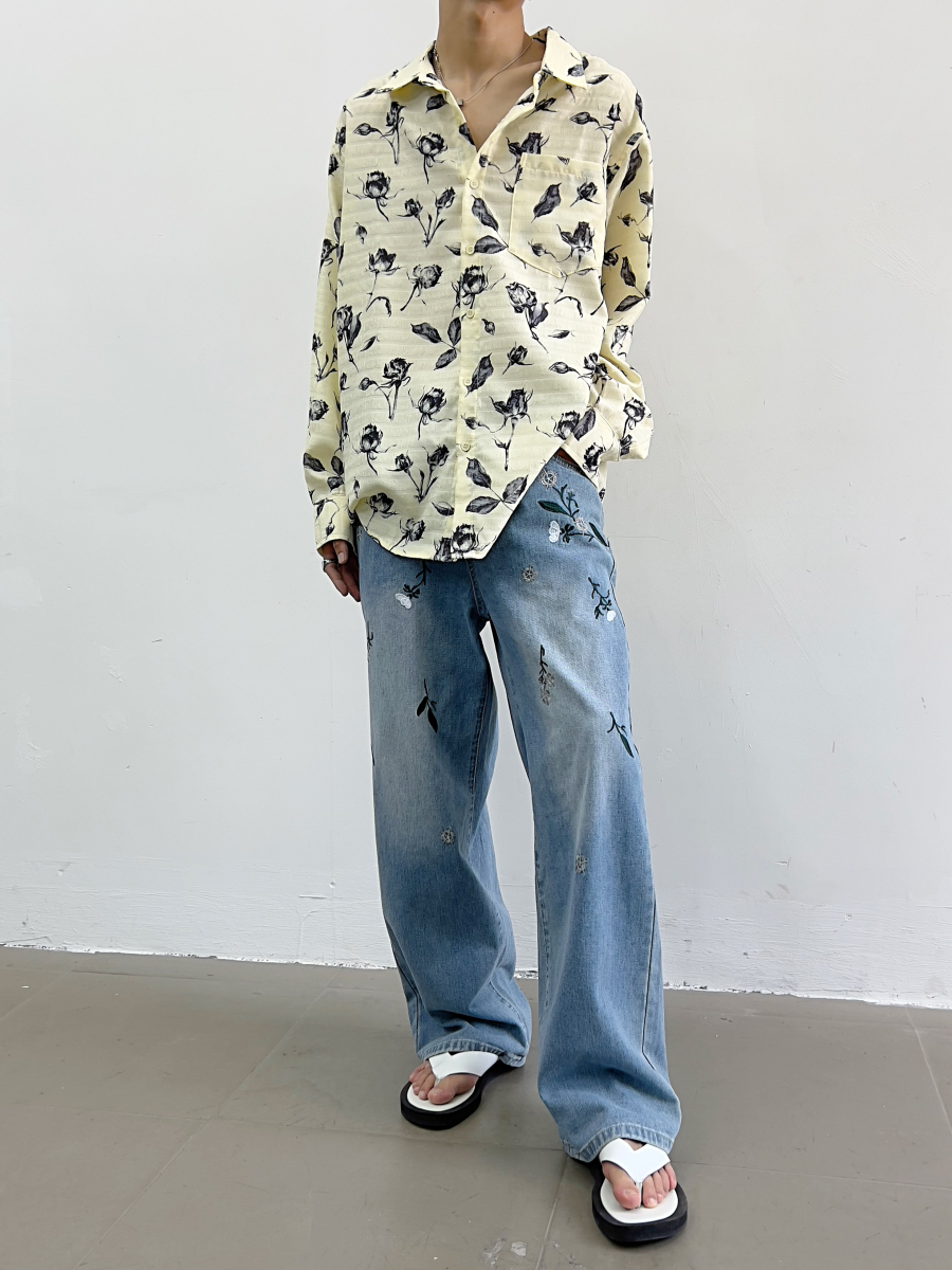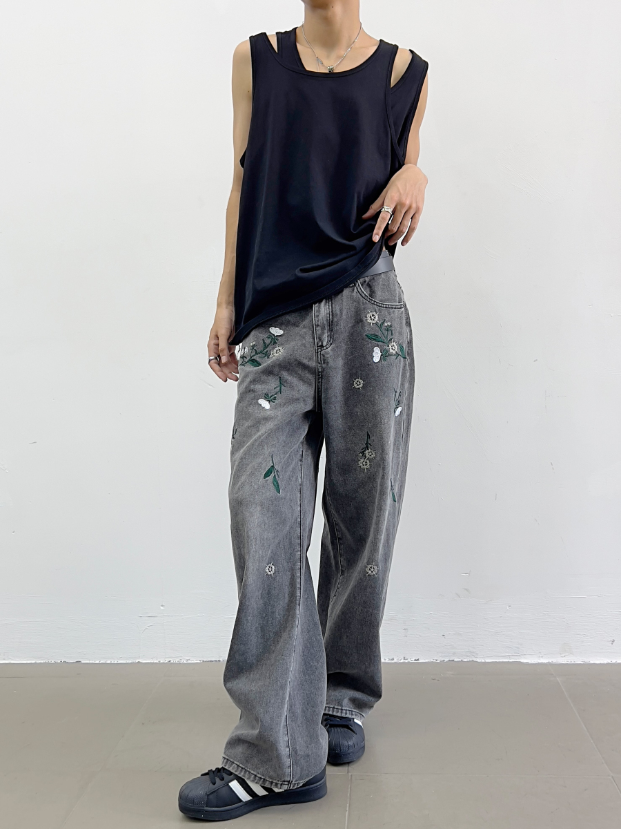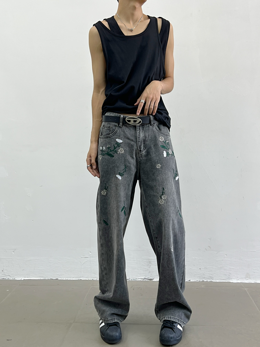 Flower Embroidery Wide-Leg Straight Denim Jeans WN7362